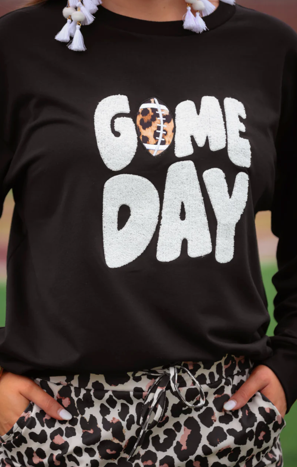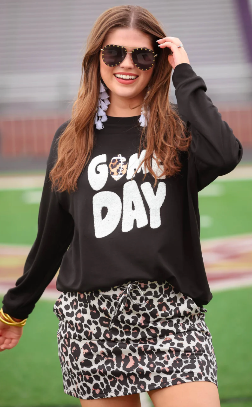 Stay cozy and stylish with our Game Day Approved Sweatshirt. With a comfortable sweatshirt material and eye-catching chenille patches, this sweatshirt is perfect for game day or any casual outing. Plus, the added touch of a leopard print football makes it a must-have for any sports fan.