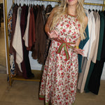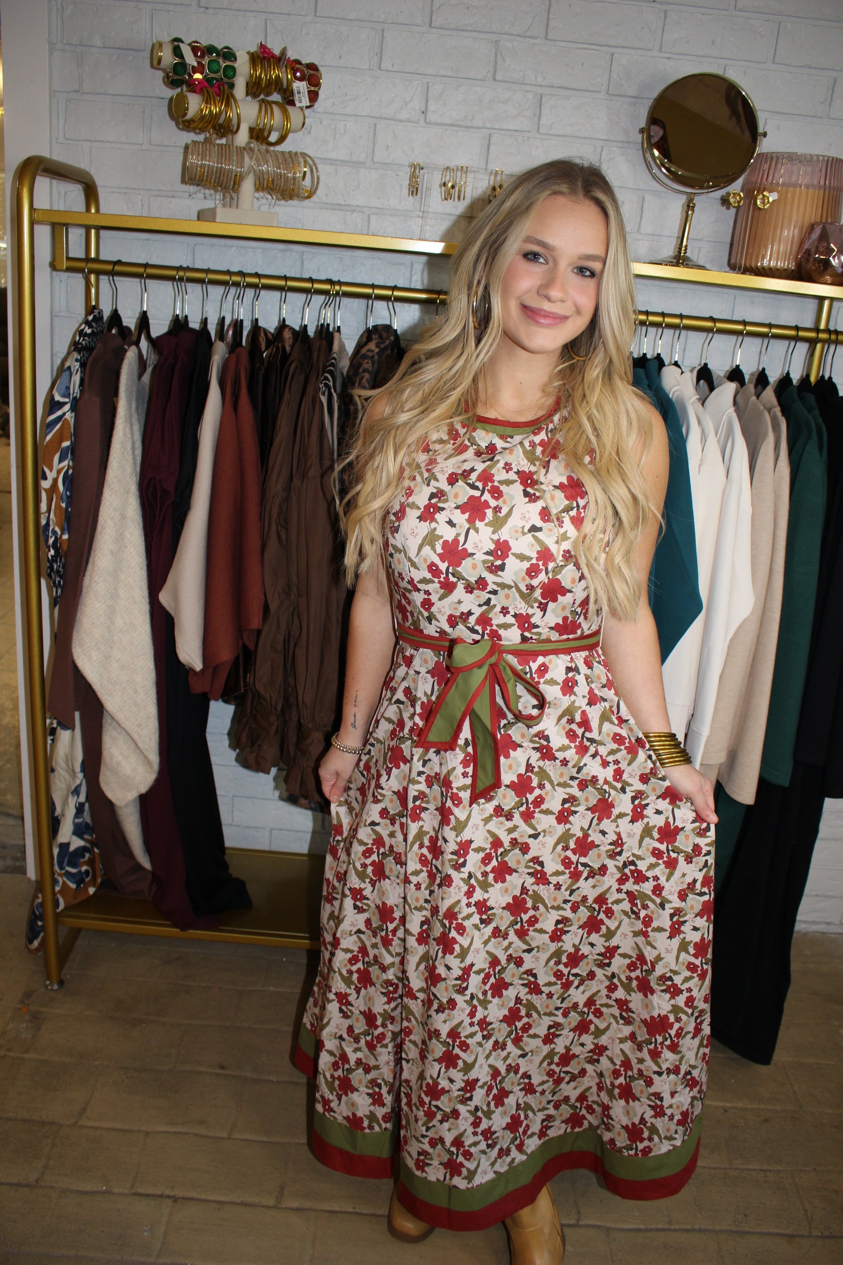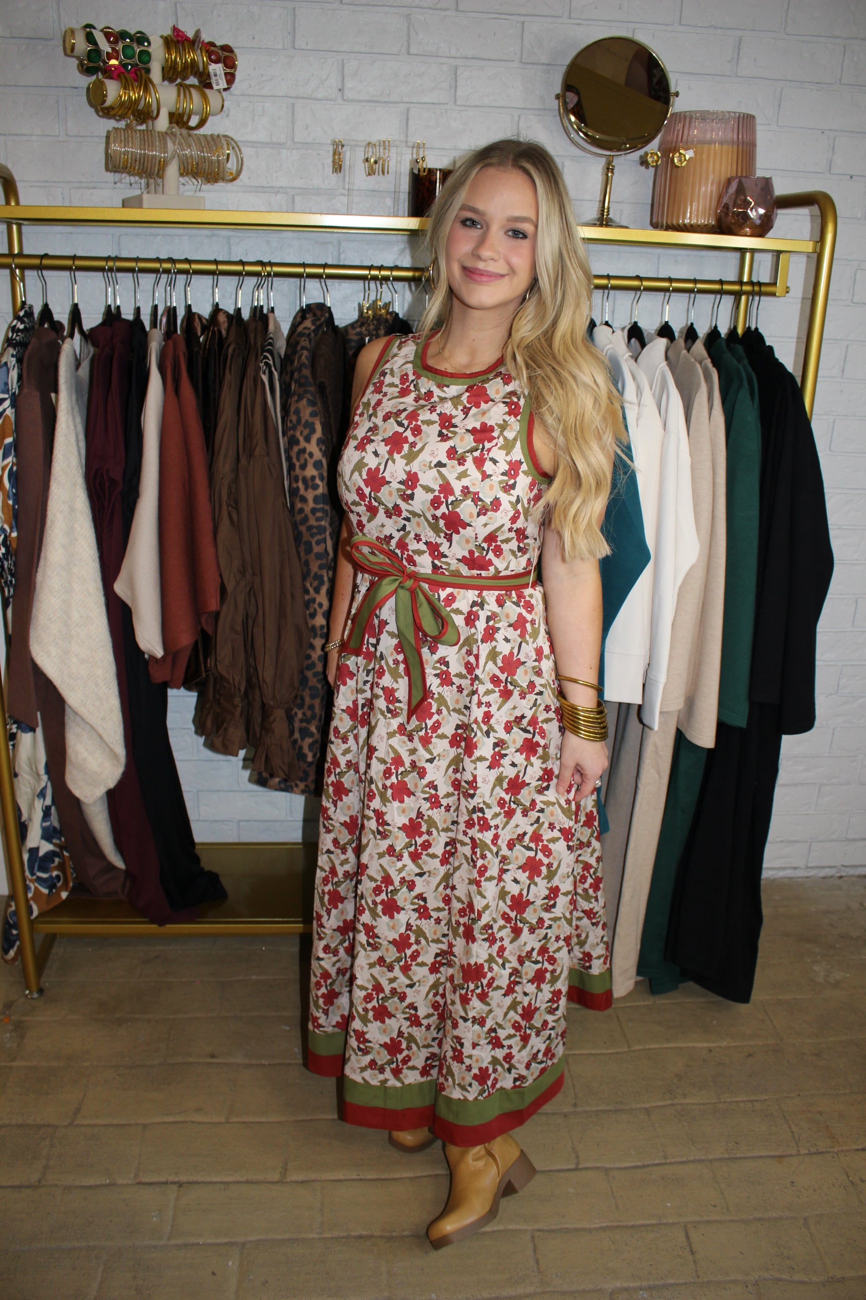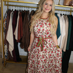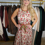 Floral print sleeveless midi dress featuring multicolor band finish midi dress. Zippper closure at back and removable belt. Side pockets. Lined. Woven. Non-sheer. Lightweight.
