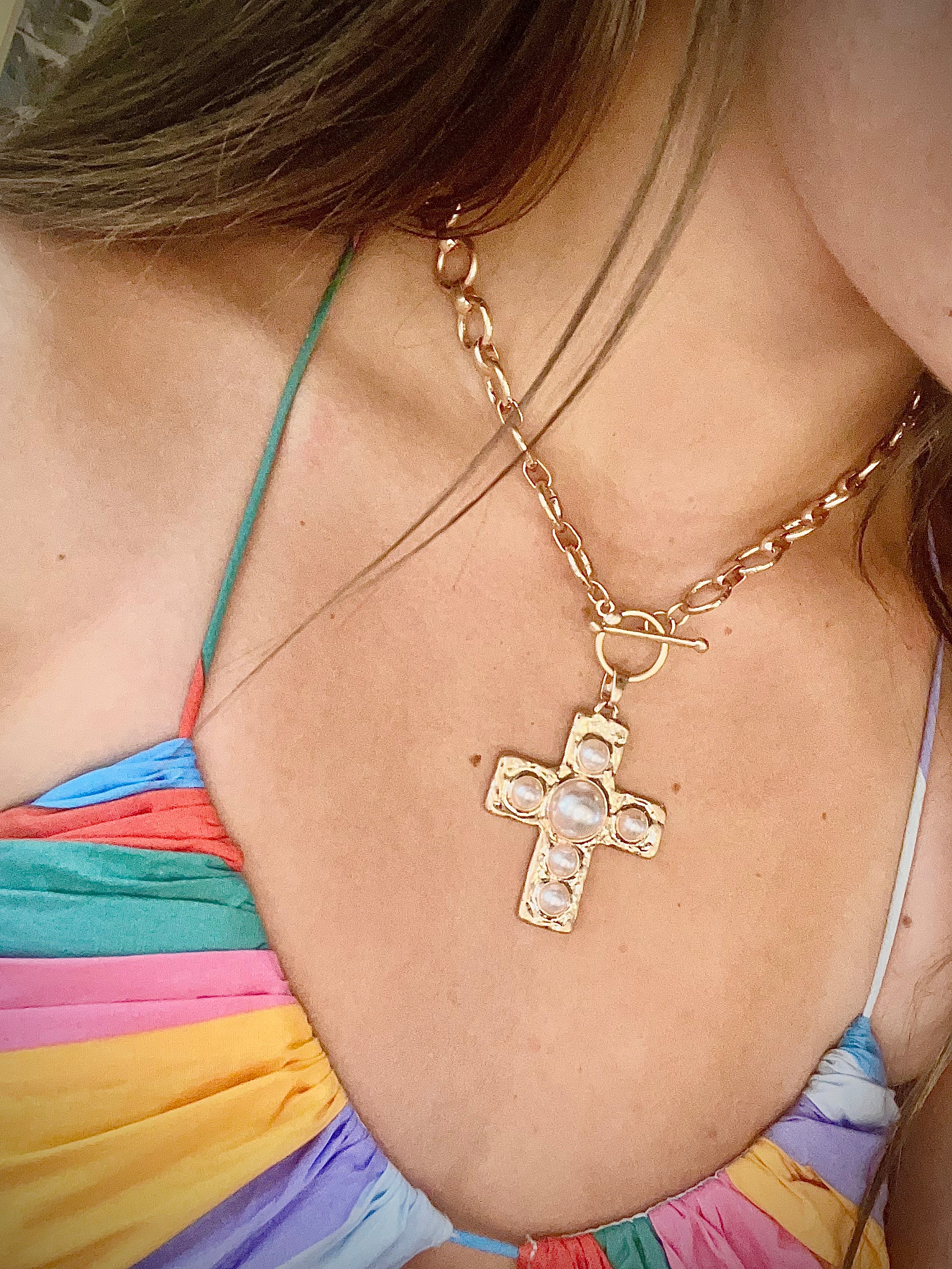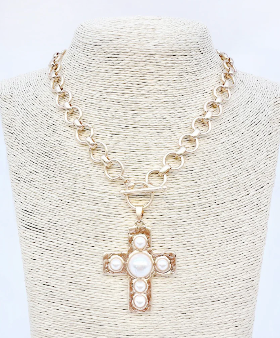 Gold 1.75" Pearl Cross Circle Chain Necklace - Final Sale