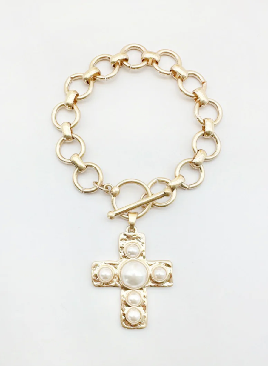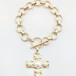 Gold Hammered Pearl Cross Stretch Chain Bracelet - Final Sale