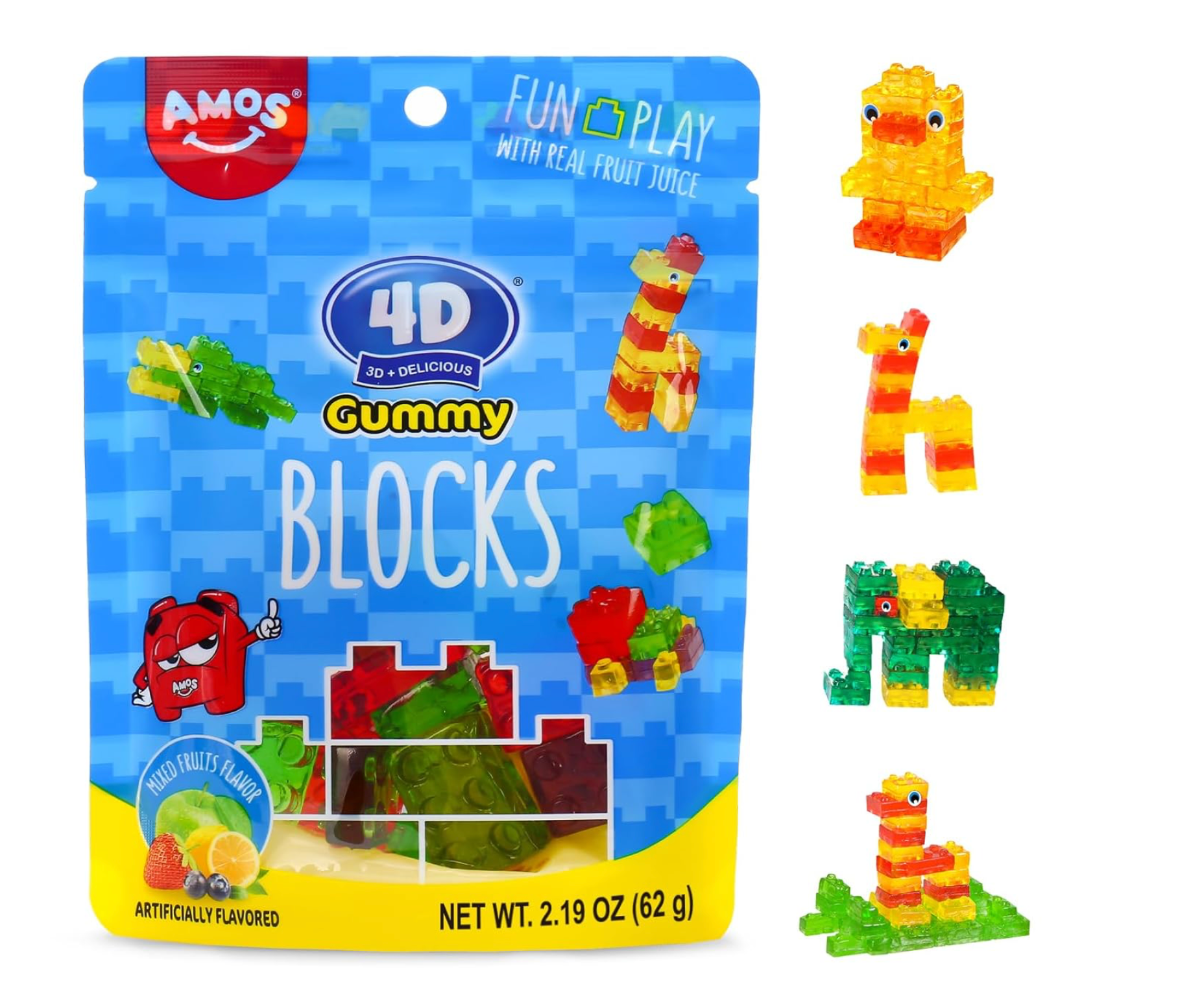 - BUILD YUMMY FUN: Amos gummy candy blocks bring creativity to life with three distinct shapes and four vibrant colors. Enjoy precious family time while relishing these delightful gummies.