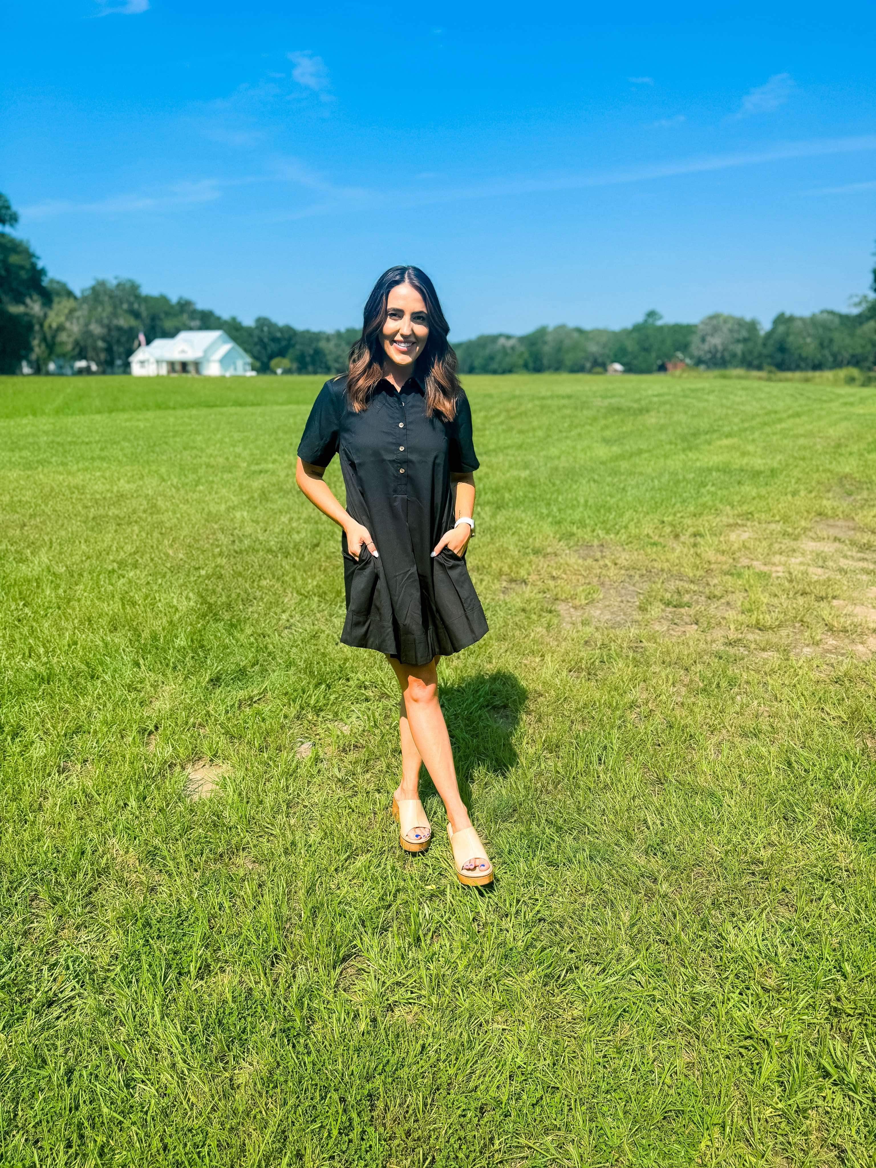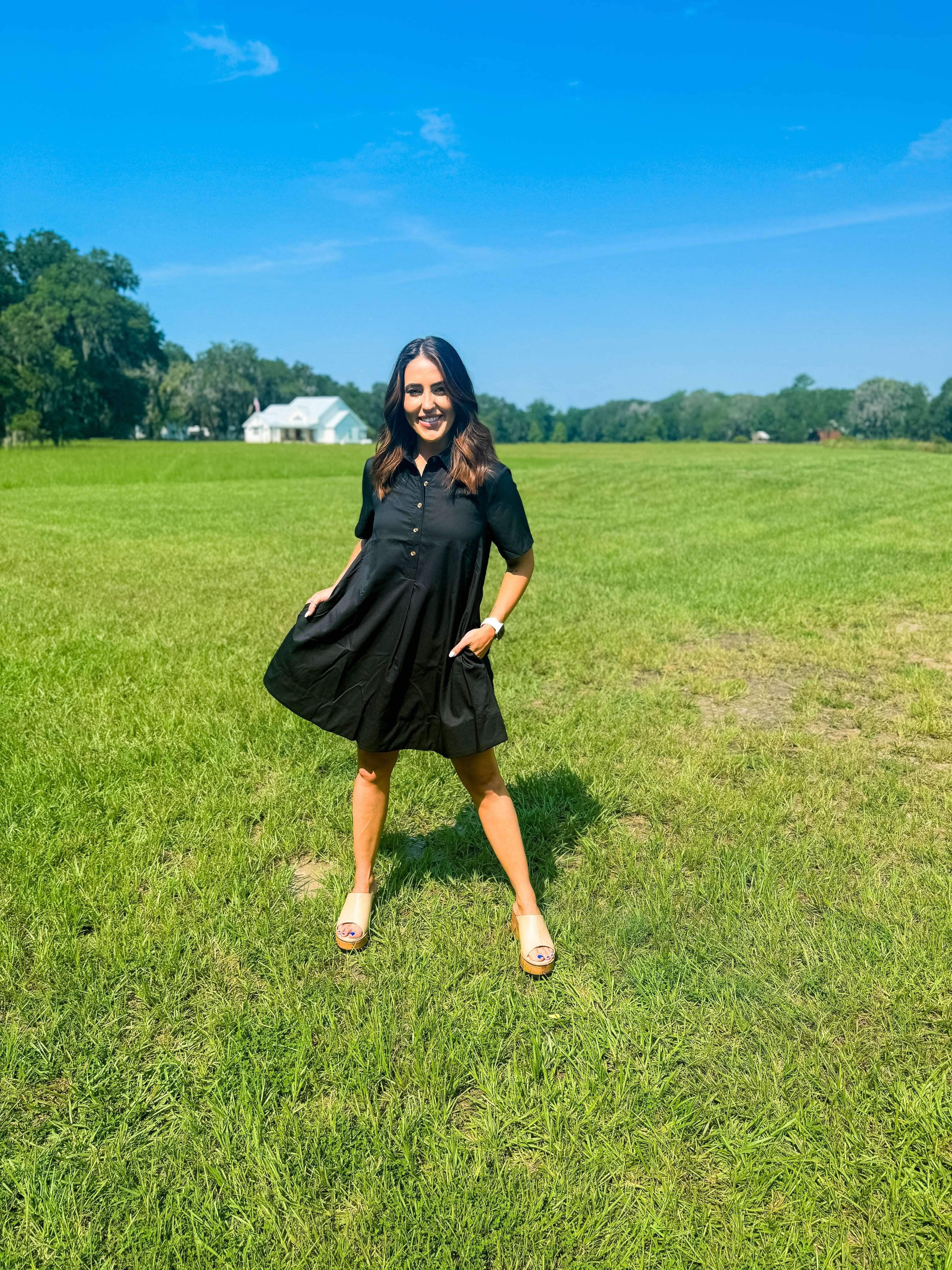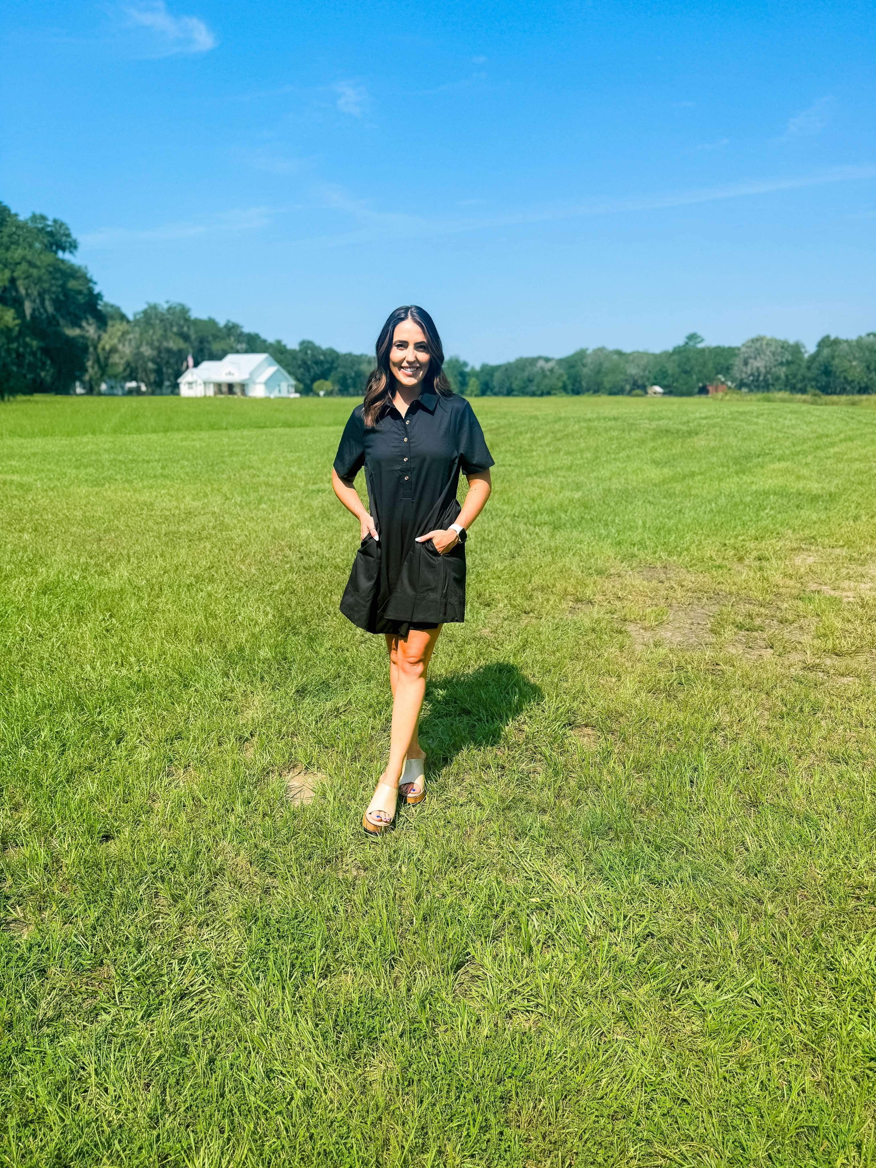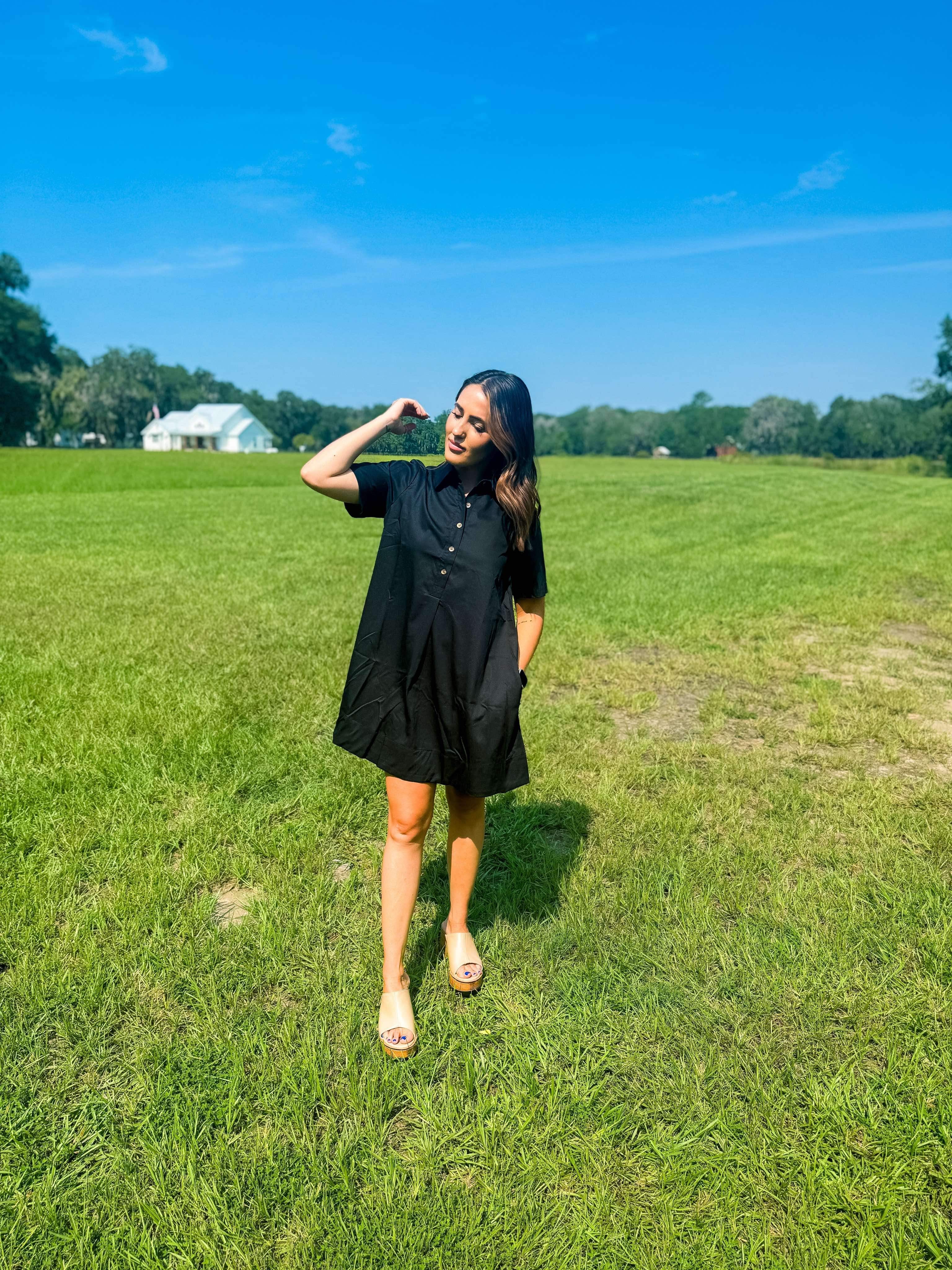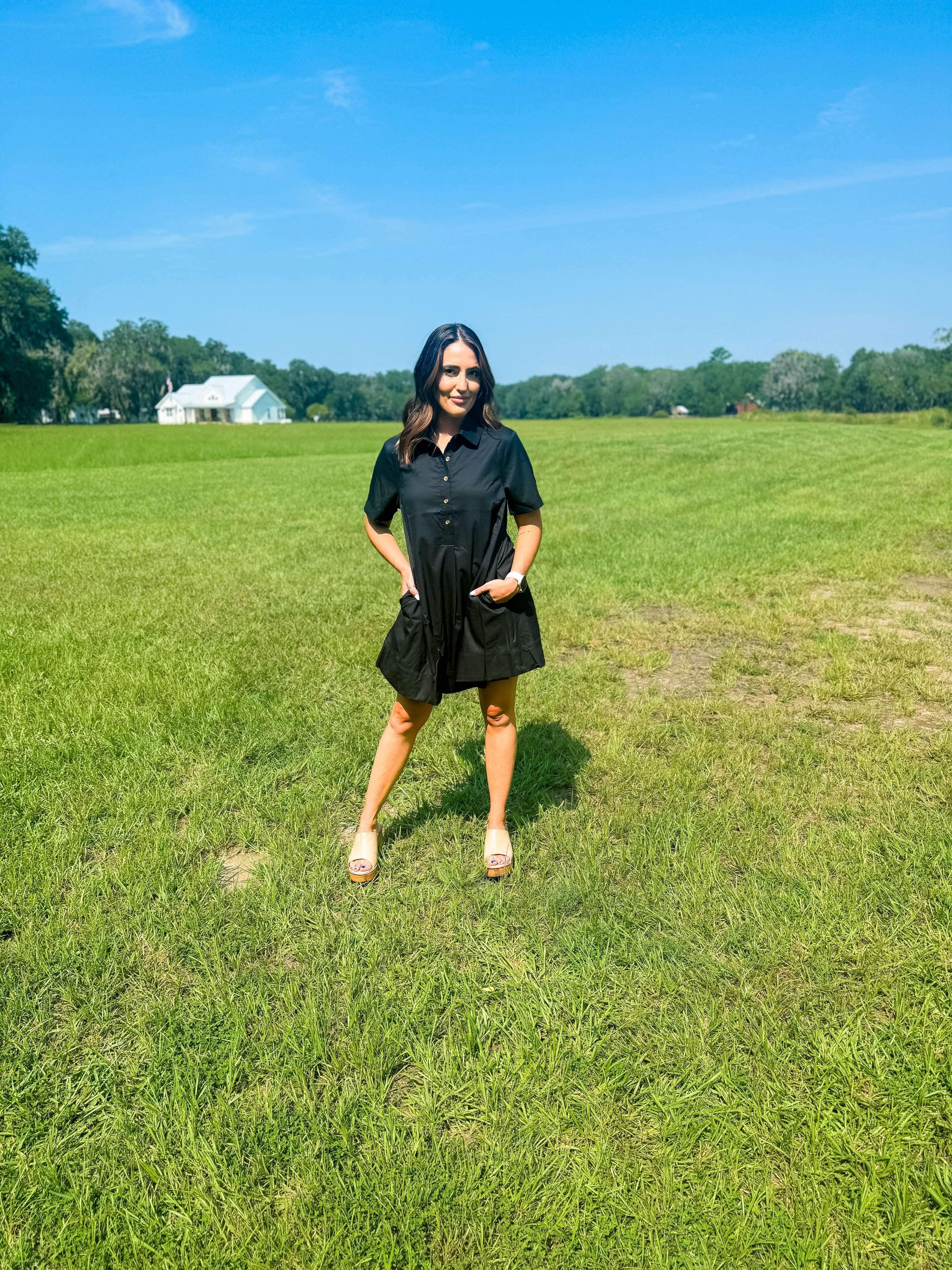 Solid short sleeve collared mini dress featuring button detail at front. Pocket at sides. Lined. Woven. Non-sheer. Lightweight.