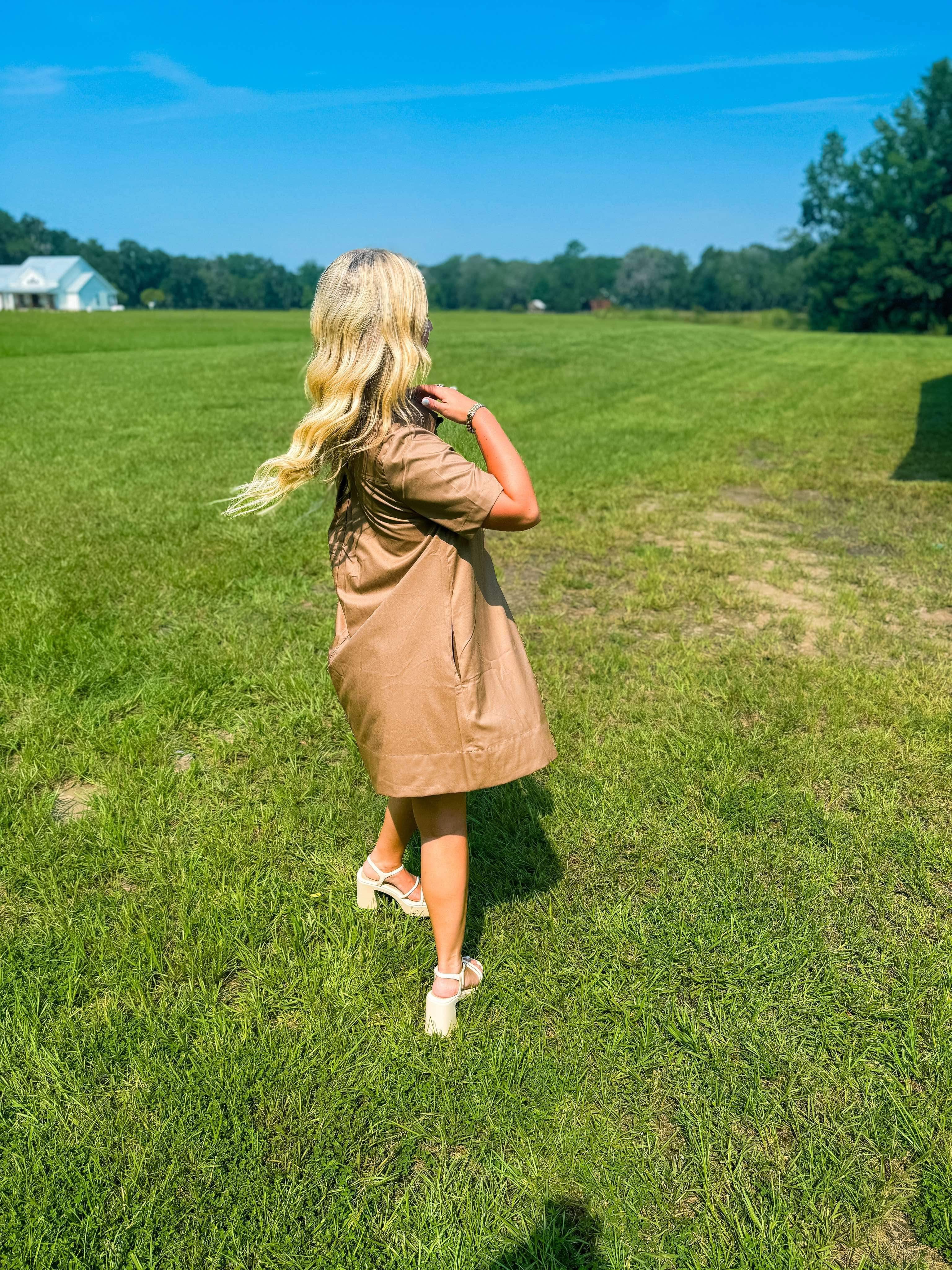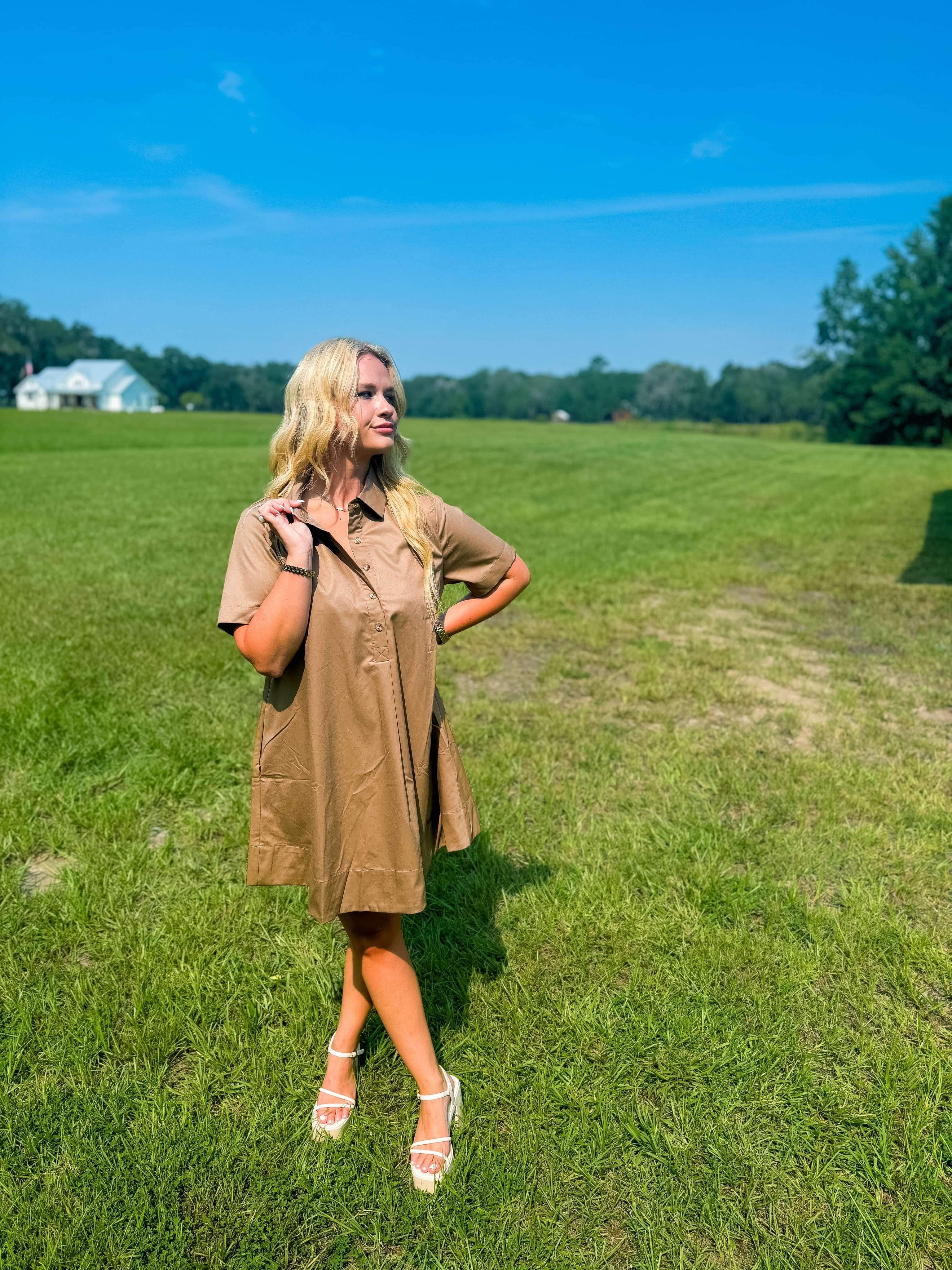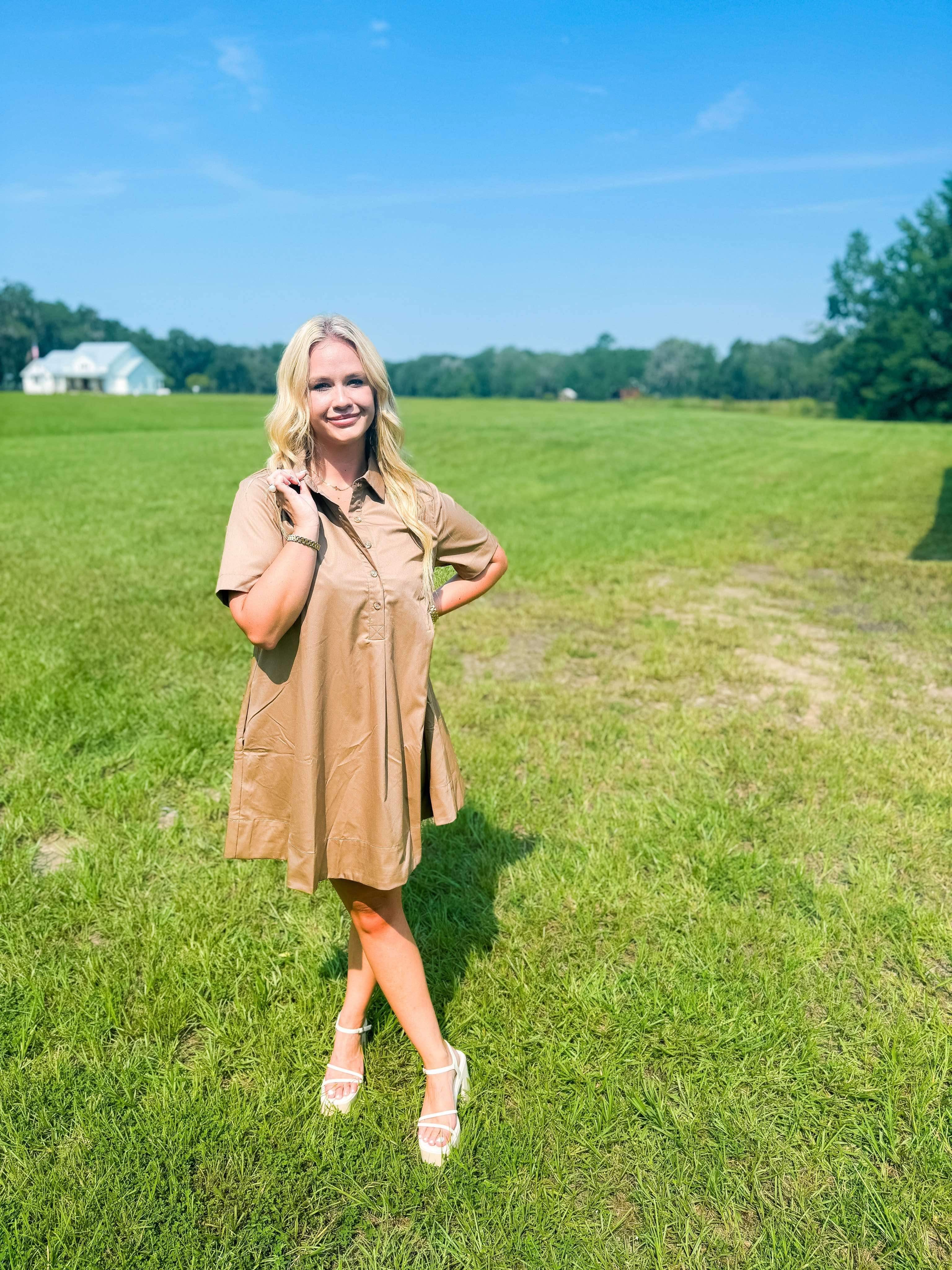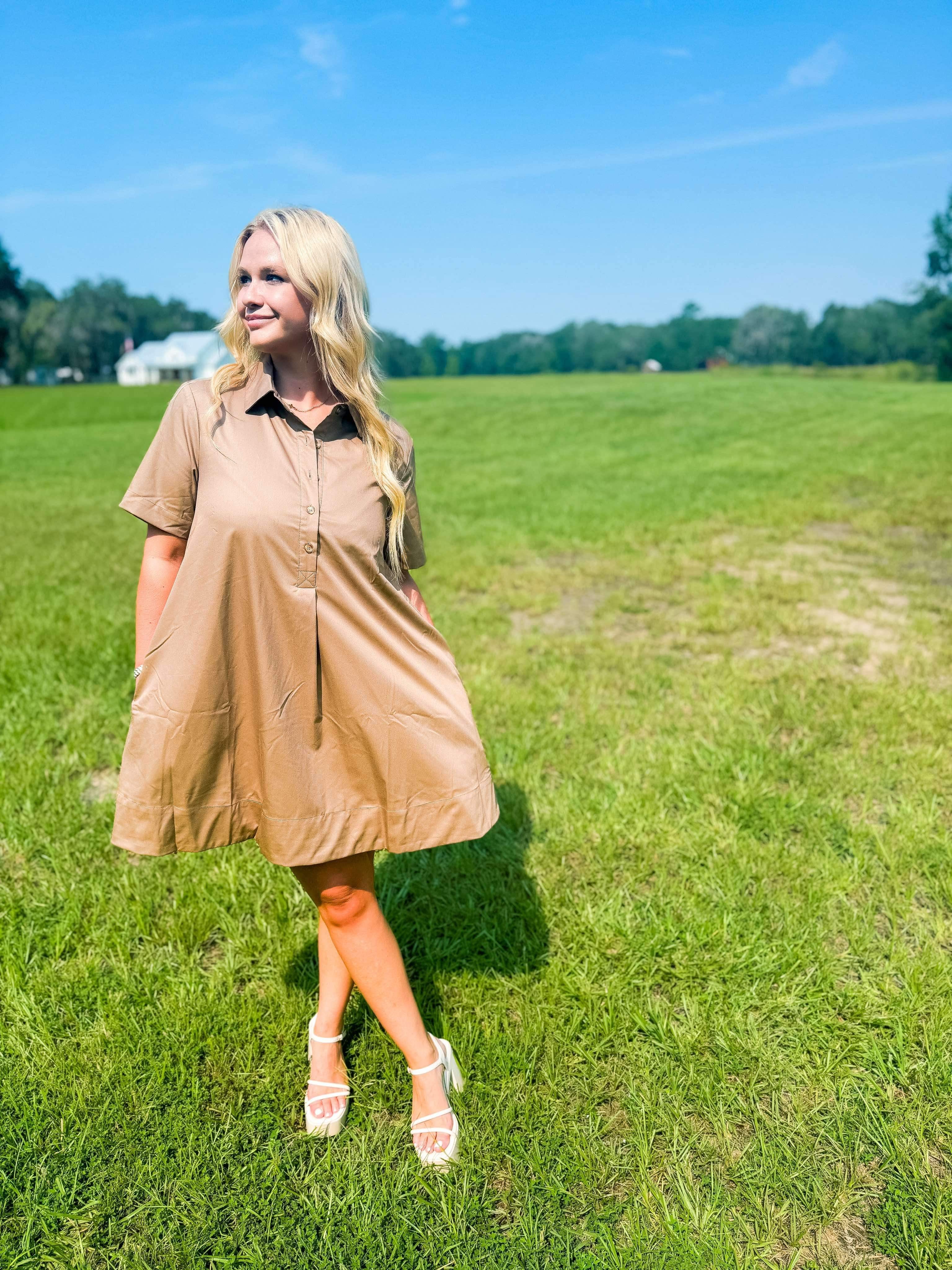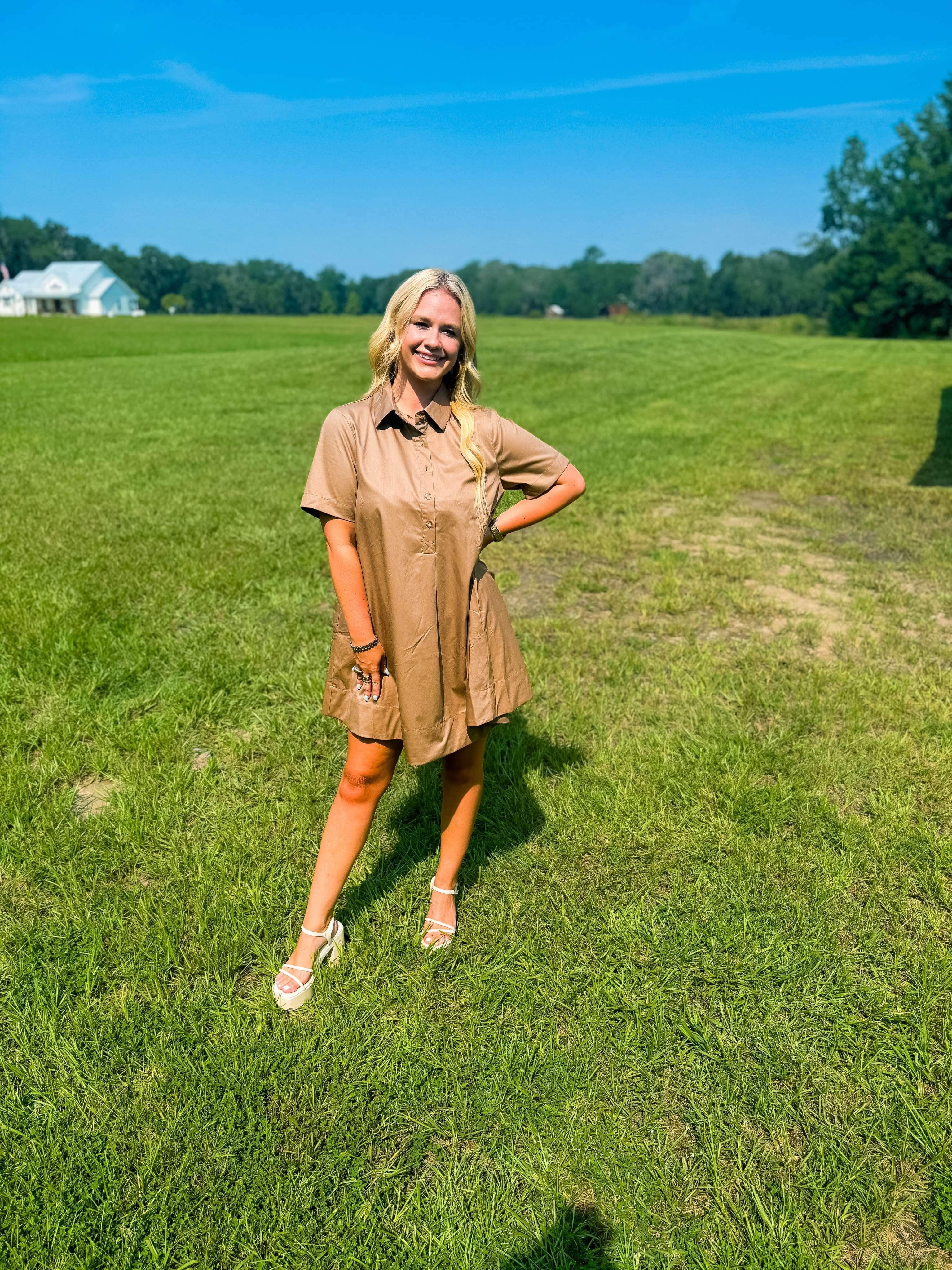Solid short sleeve collared mini dress featuring button detail at front. Pocket at sides. Lined. Woven. Non-sheer. Lightweight.