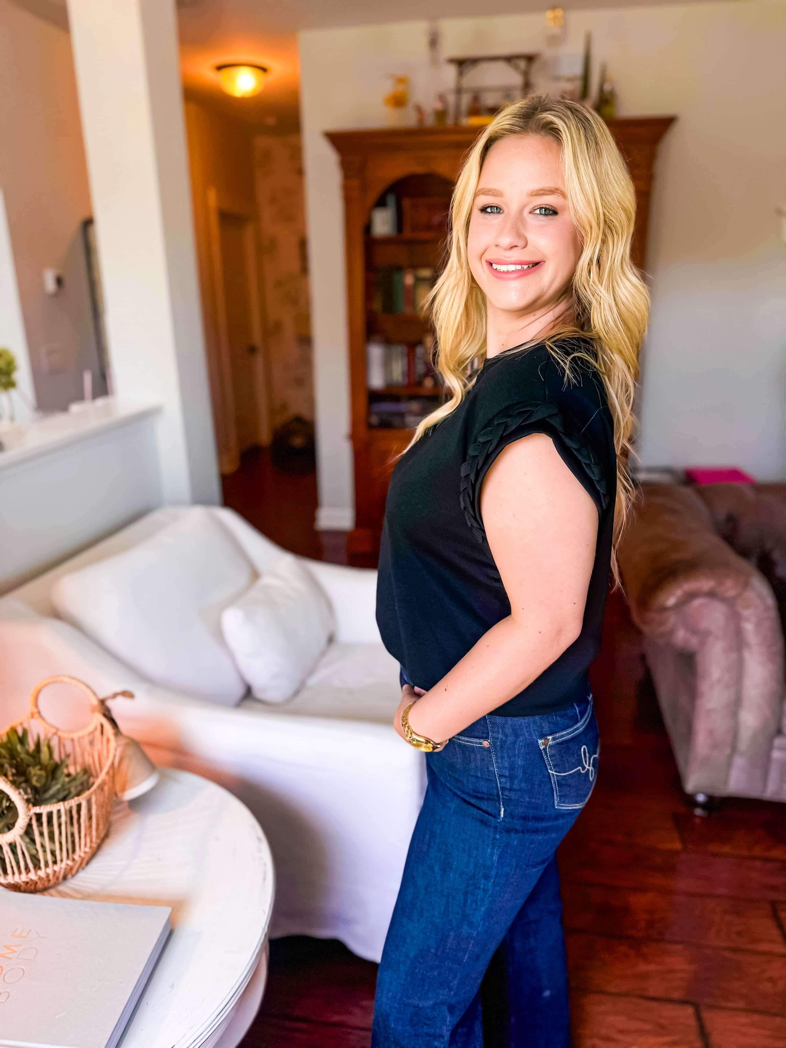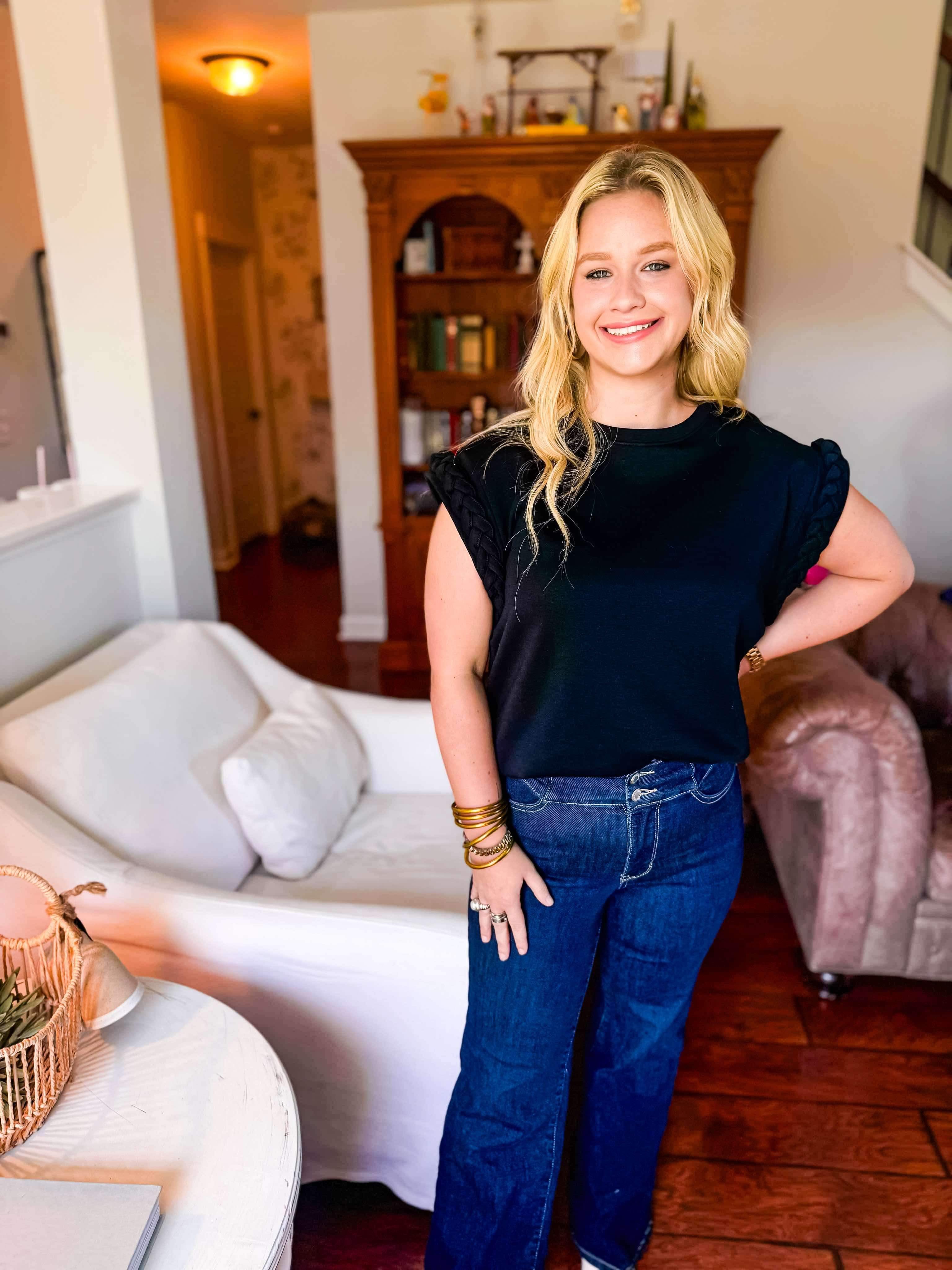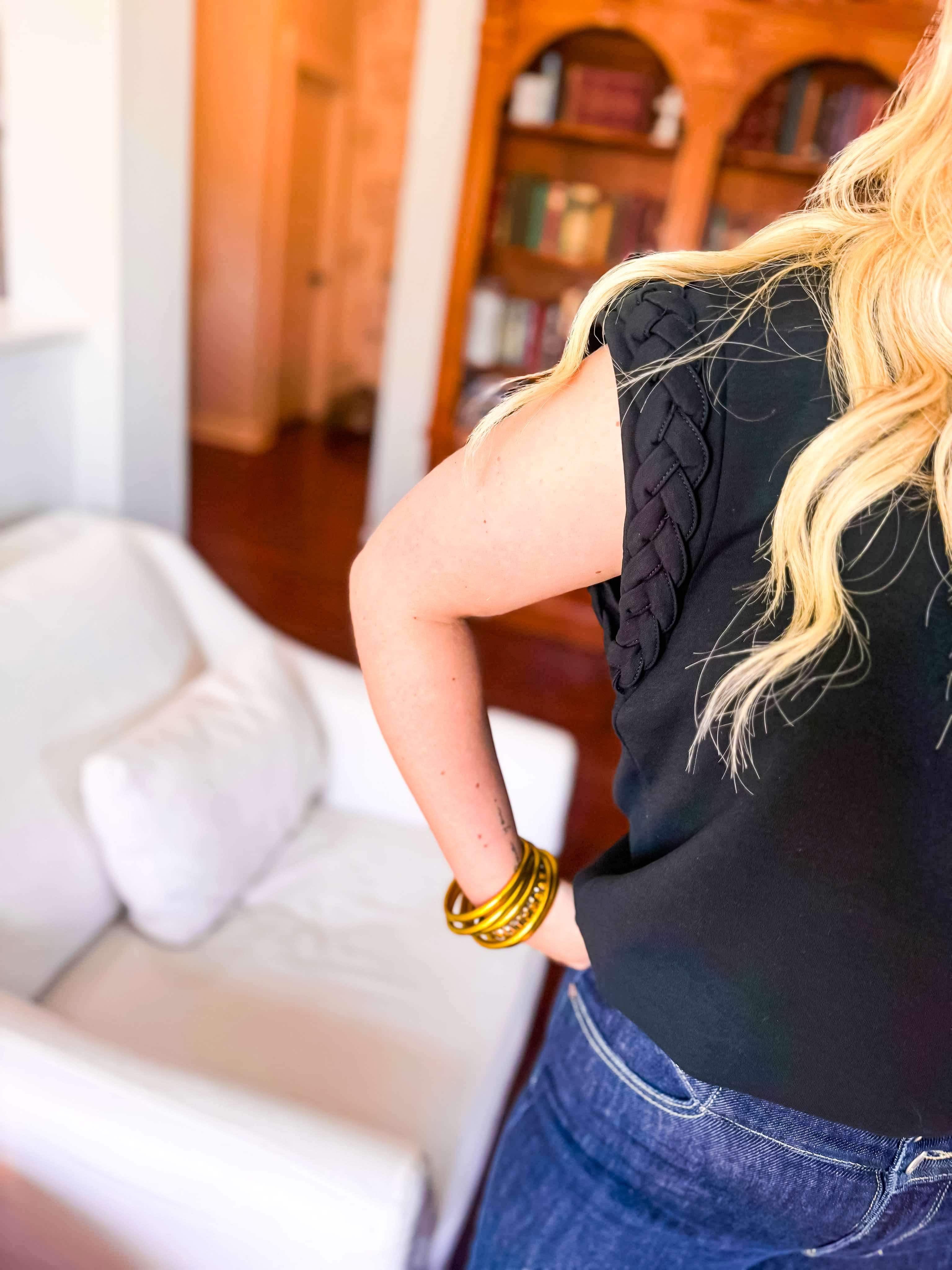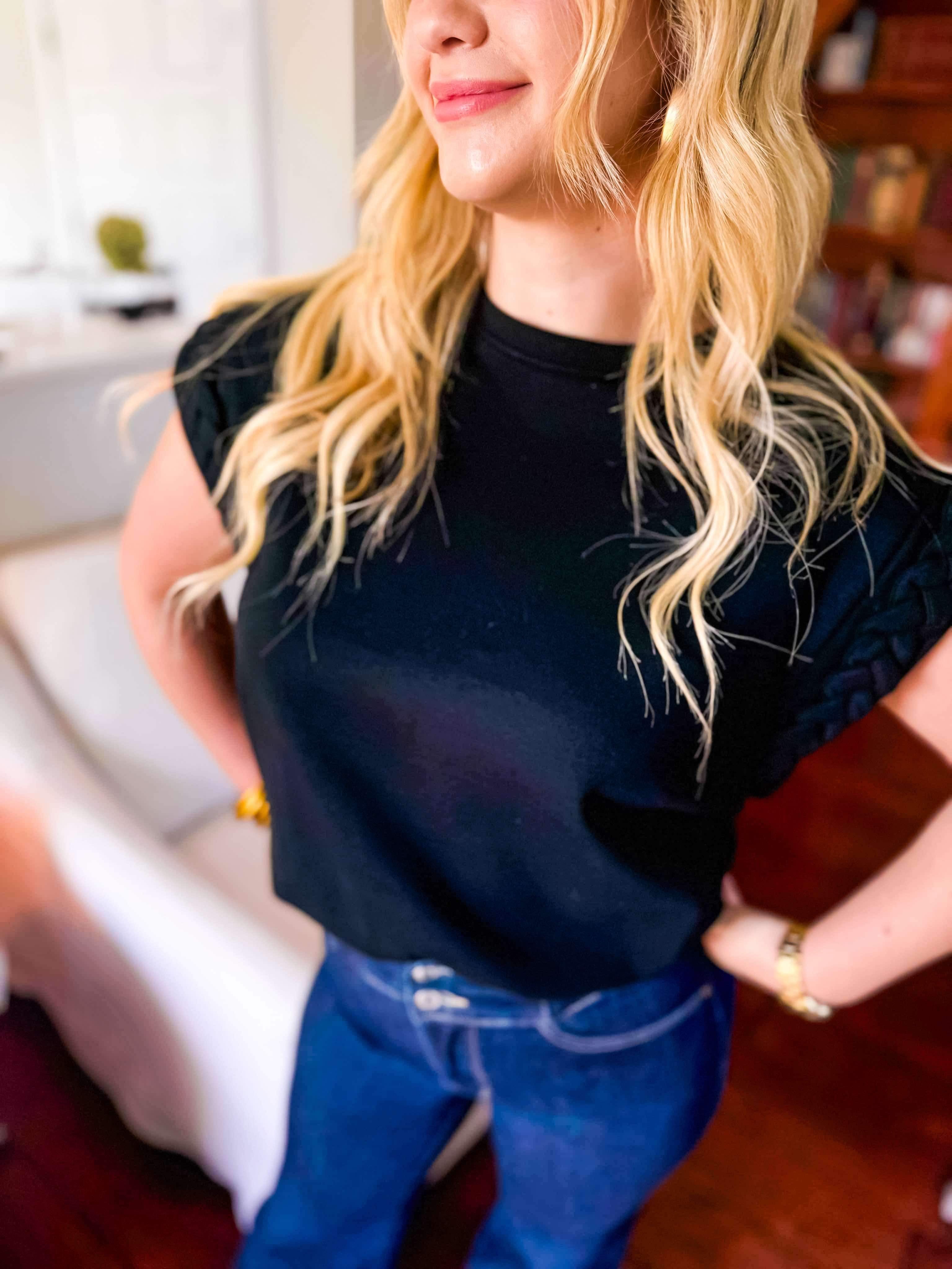 Solid round neck cap sleeve top featuring braided detail at cuff.