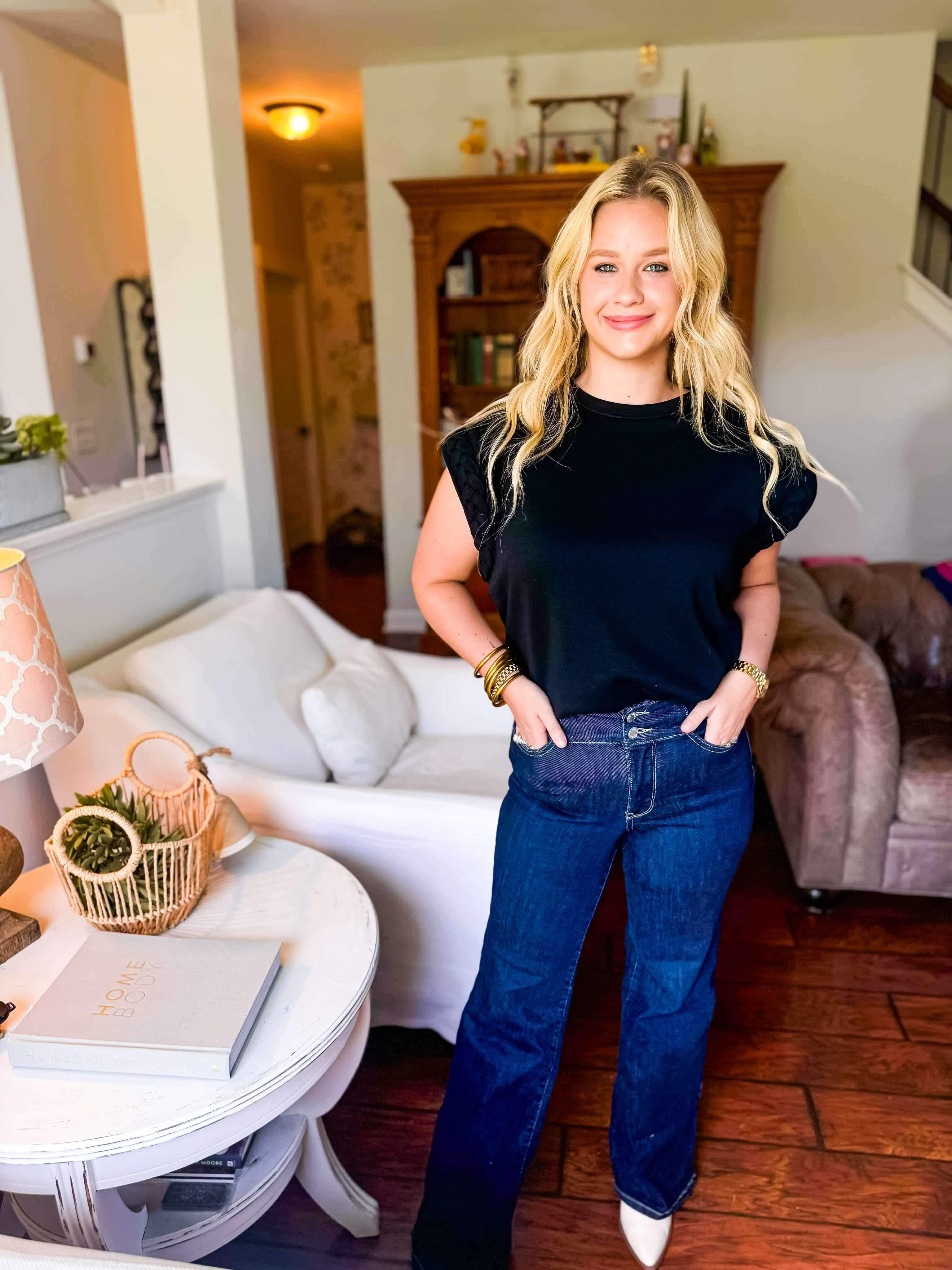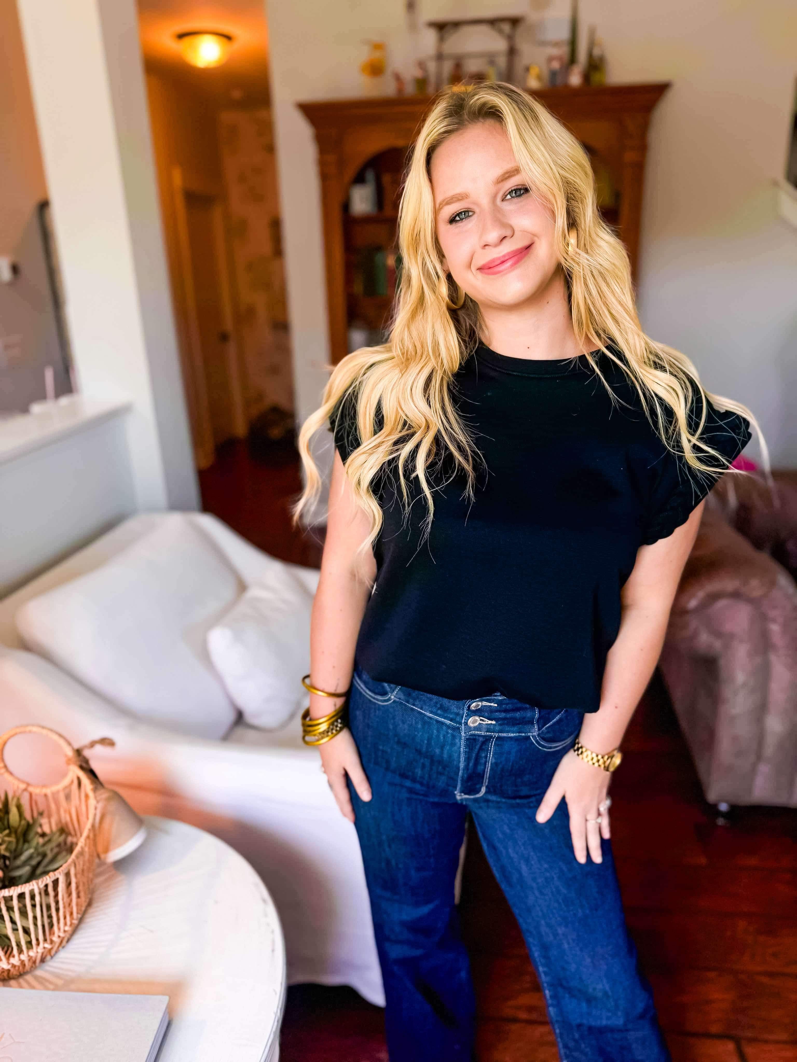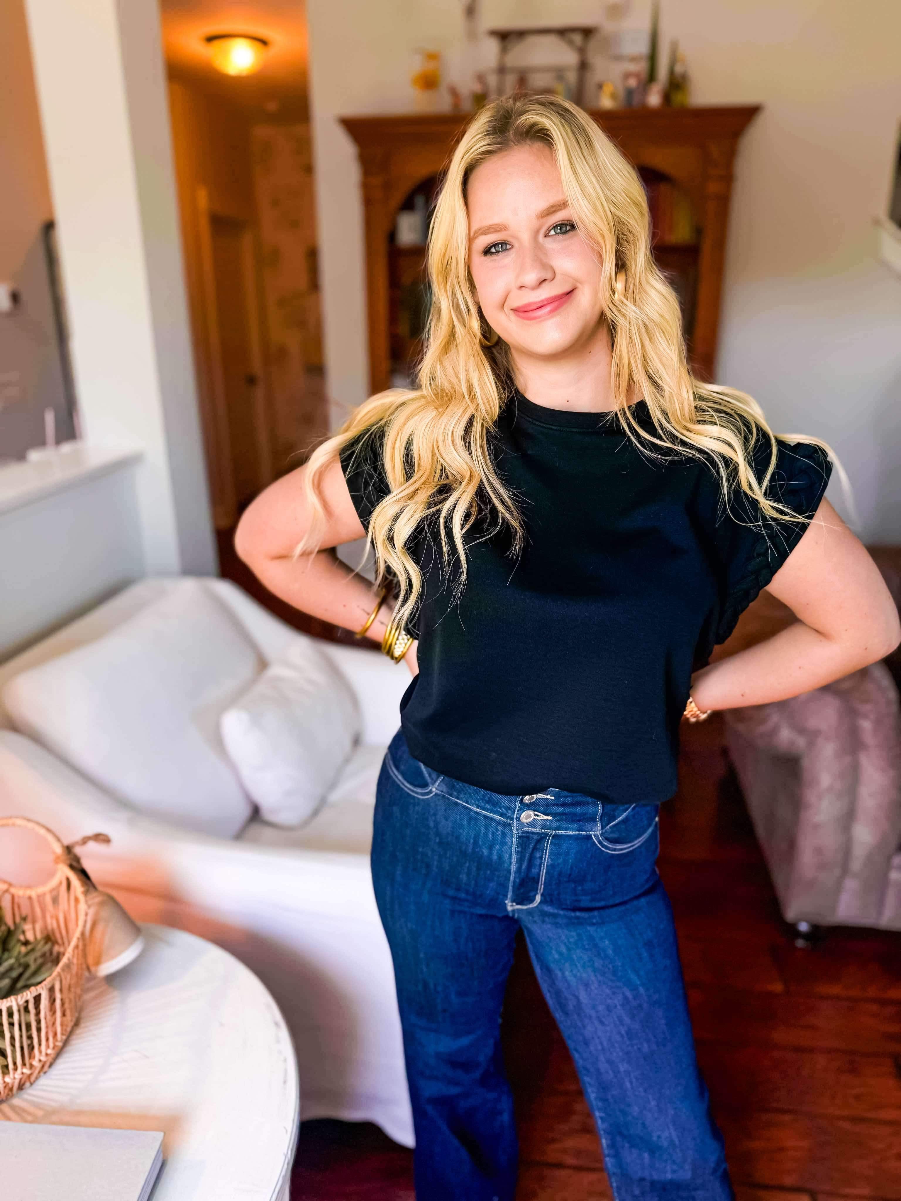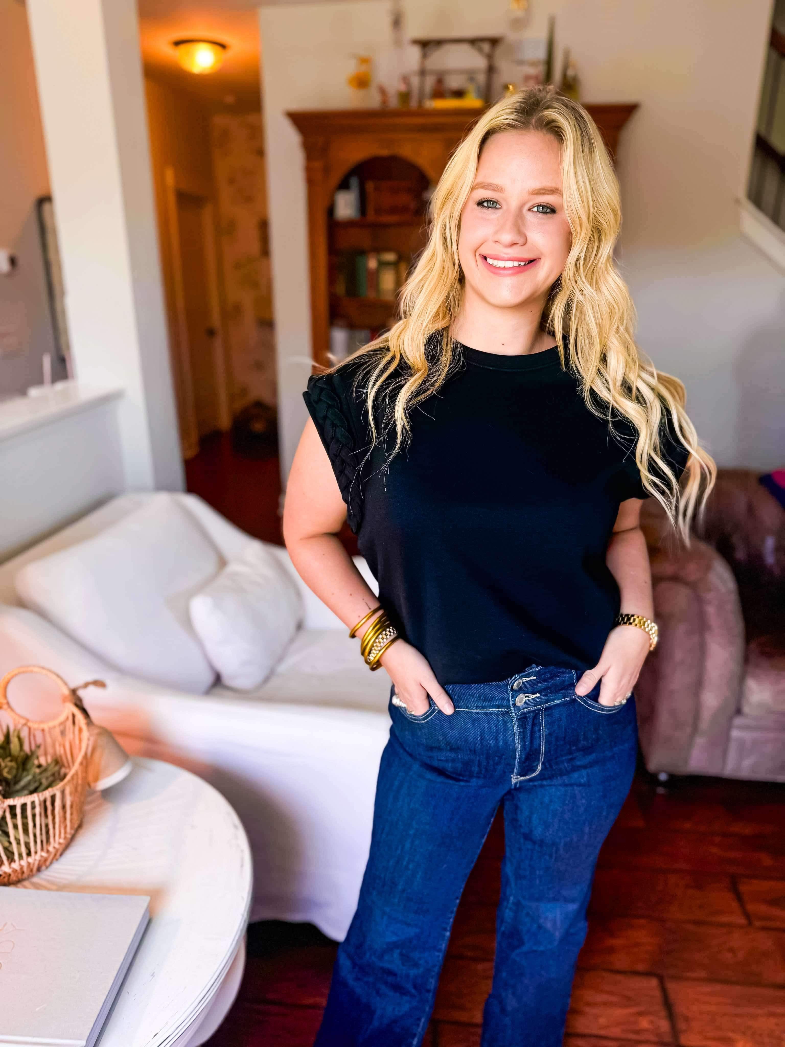 Solid round neck cap sleeve top featuring braided detail at cuff.