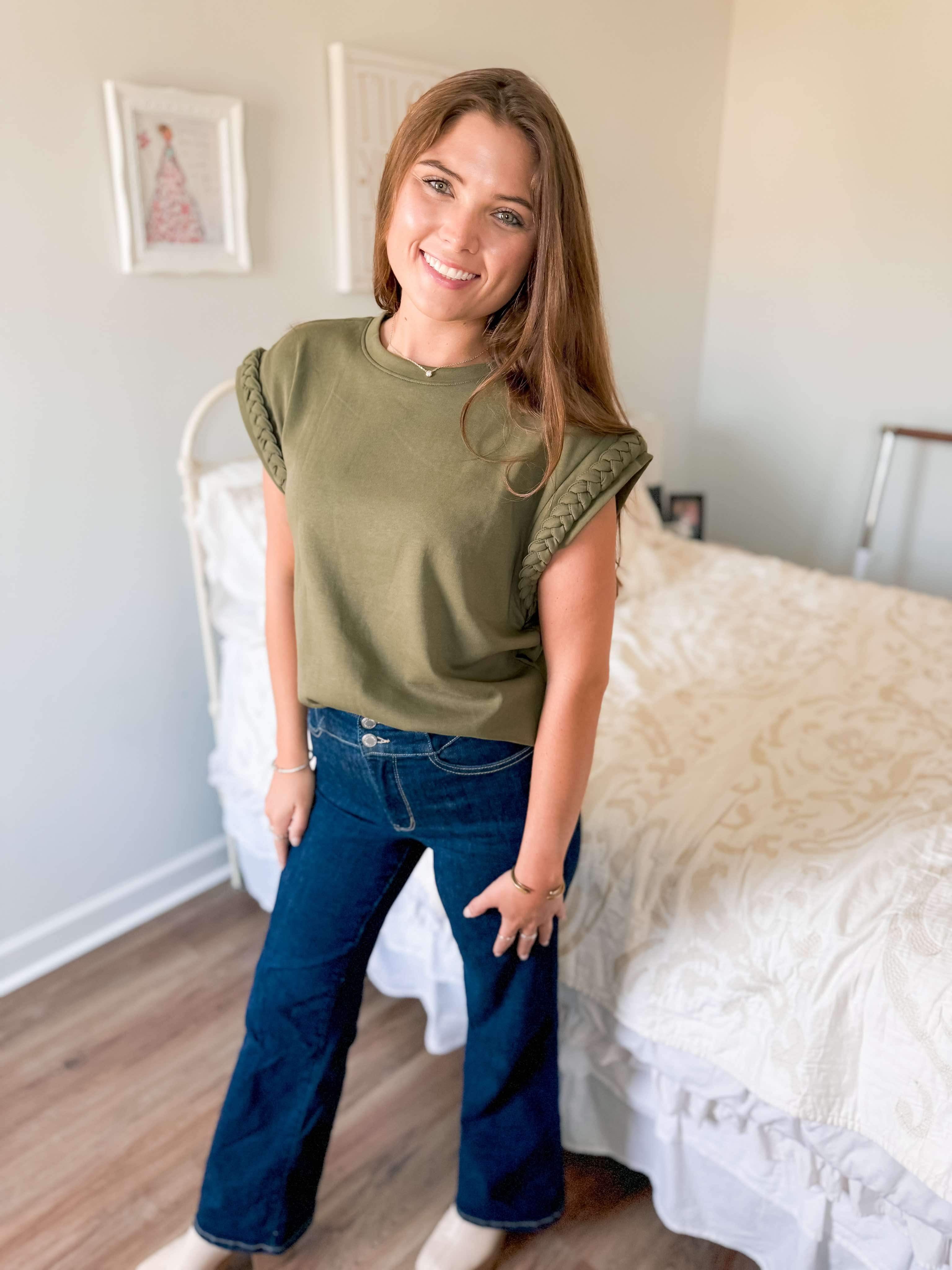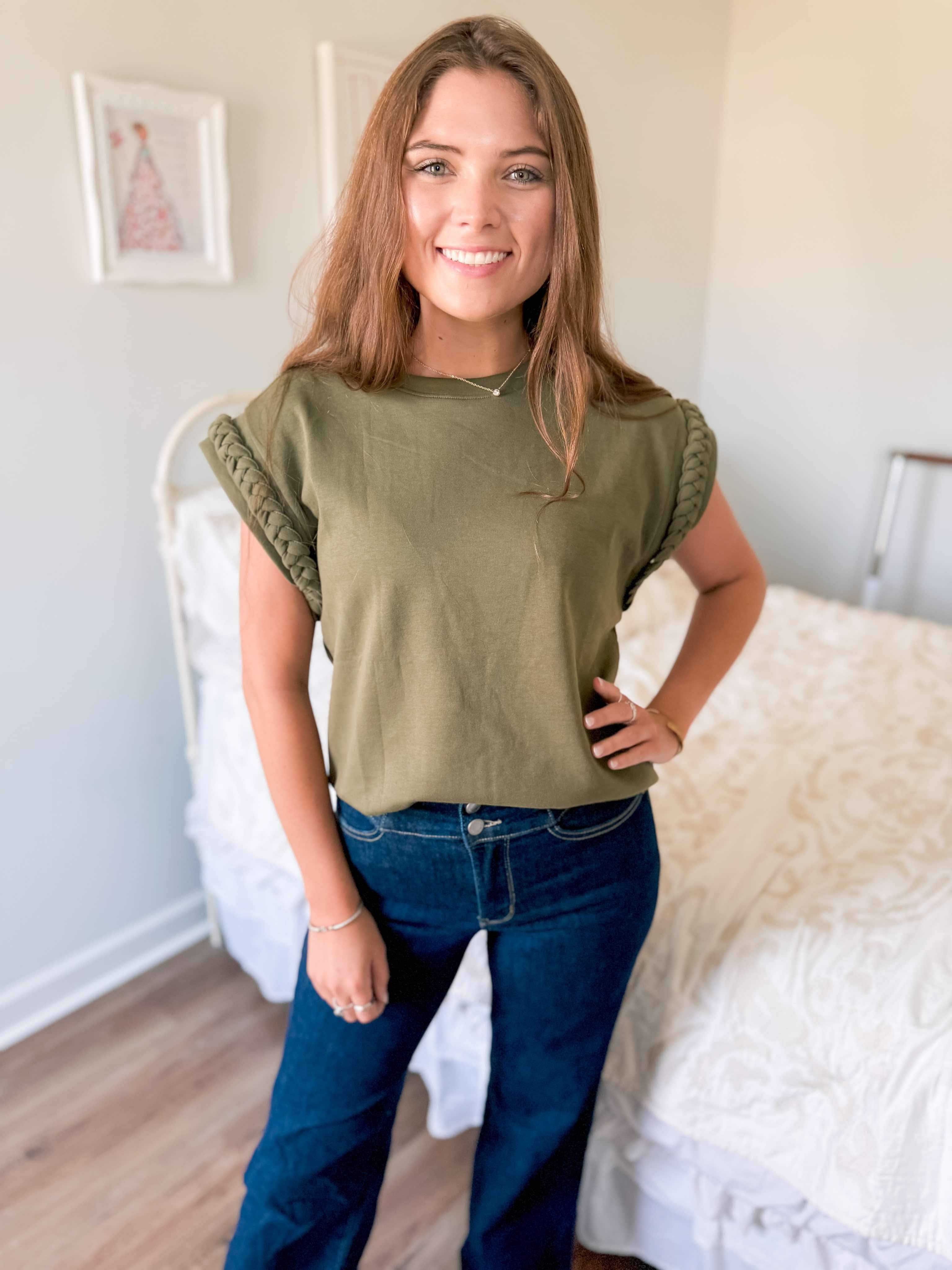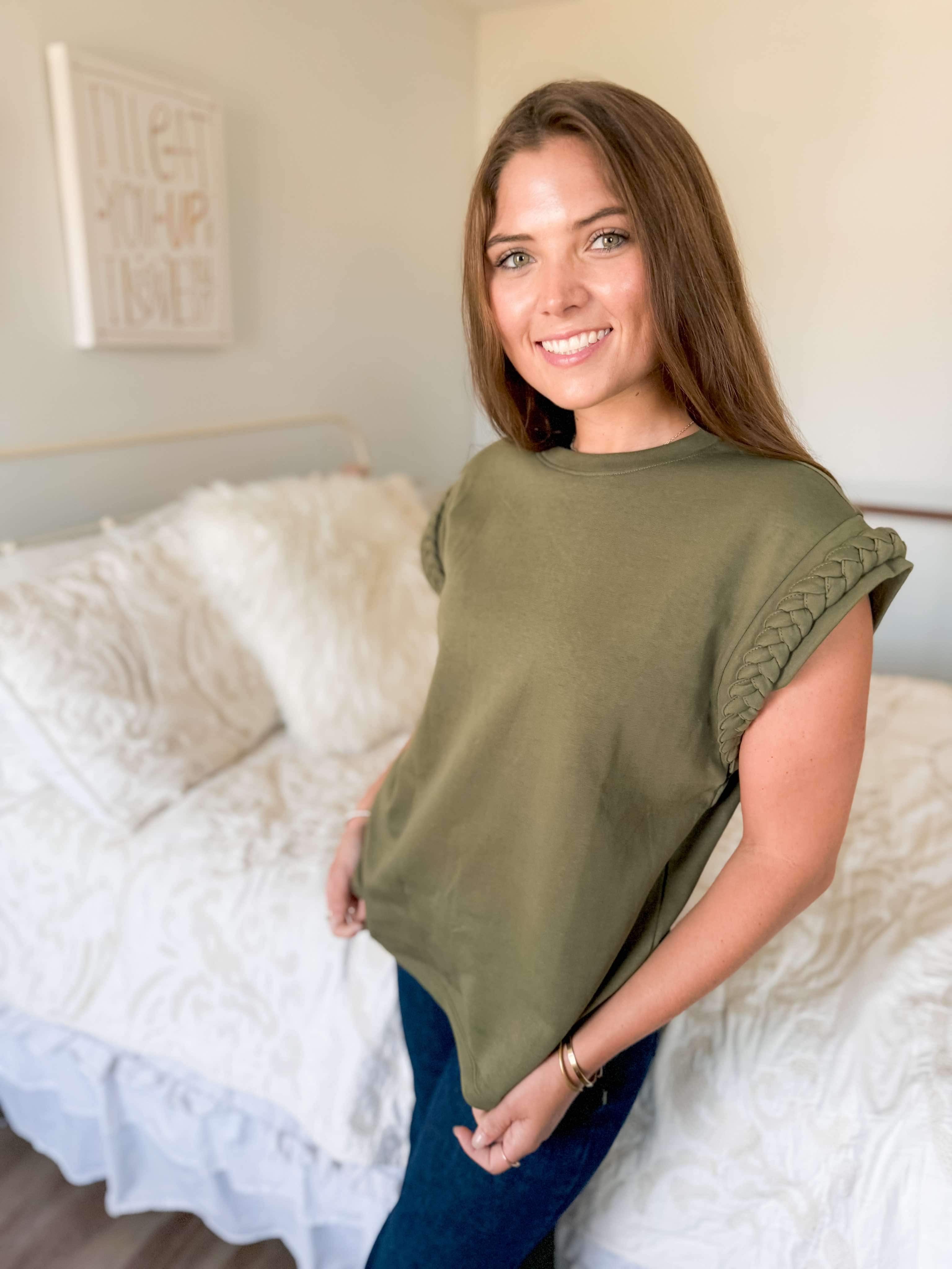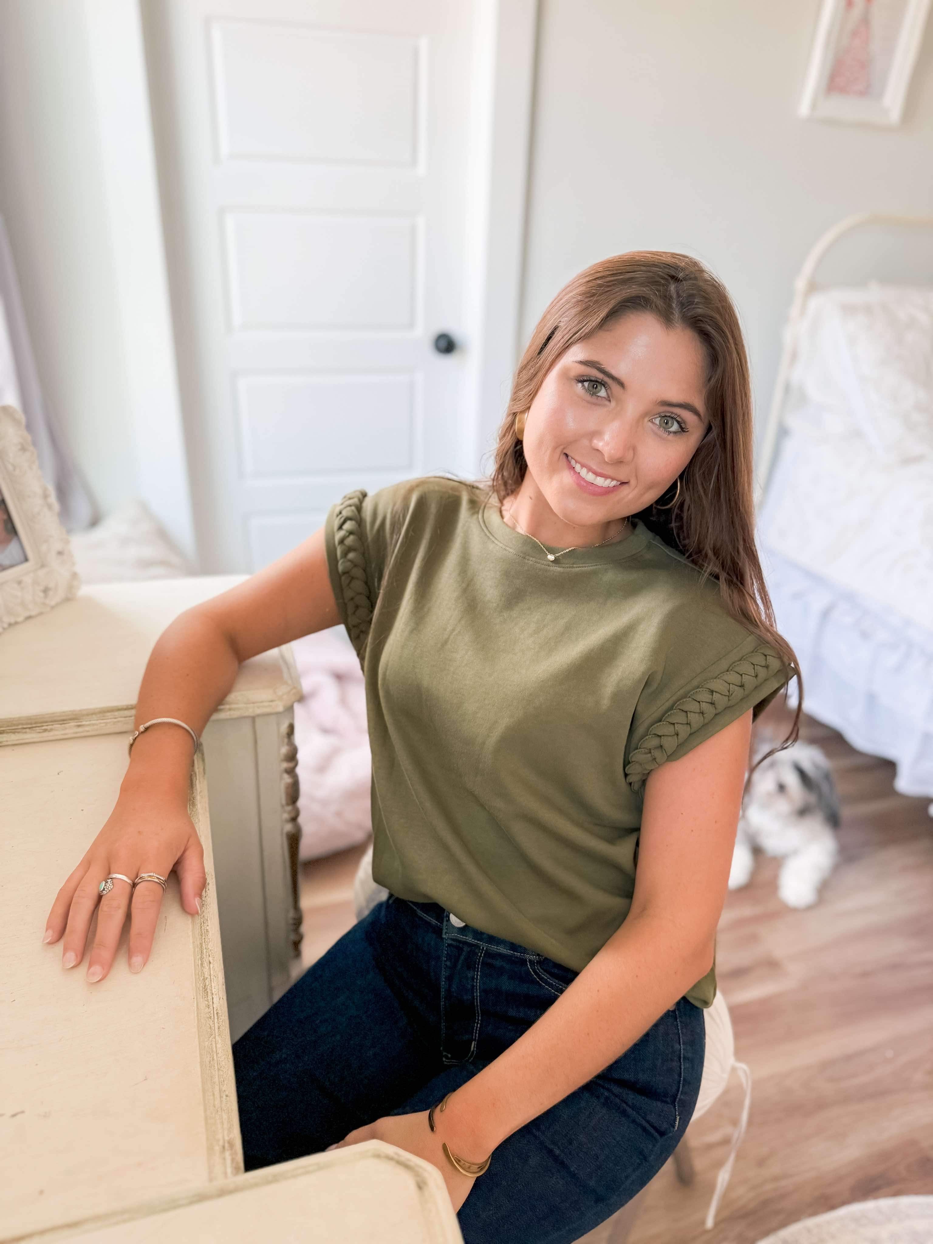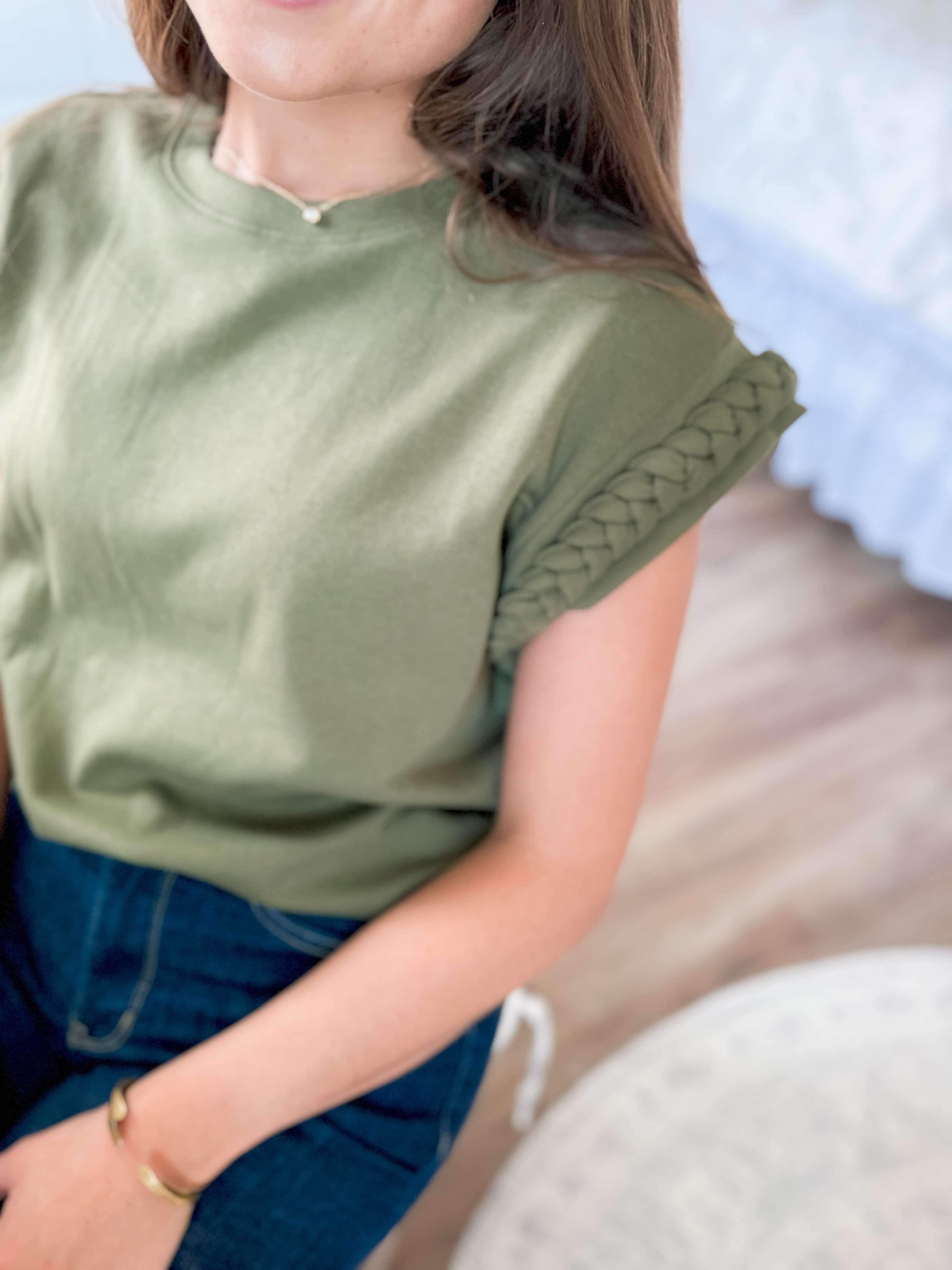 Solid round neck cap sleeve top featuring braided detail at cuff.