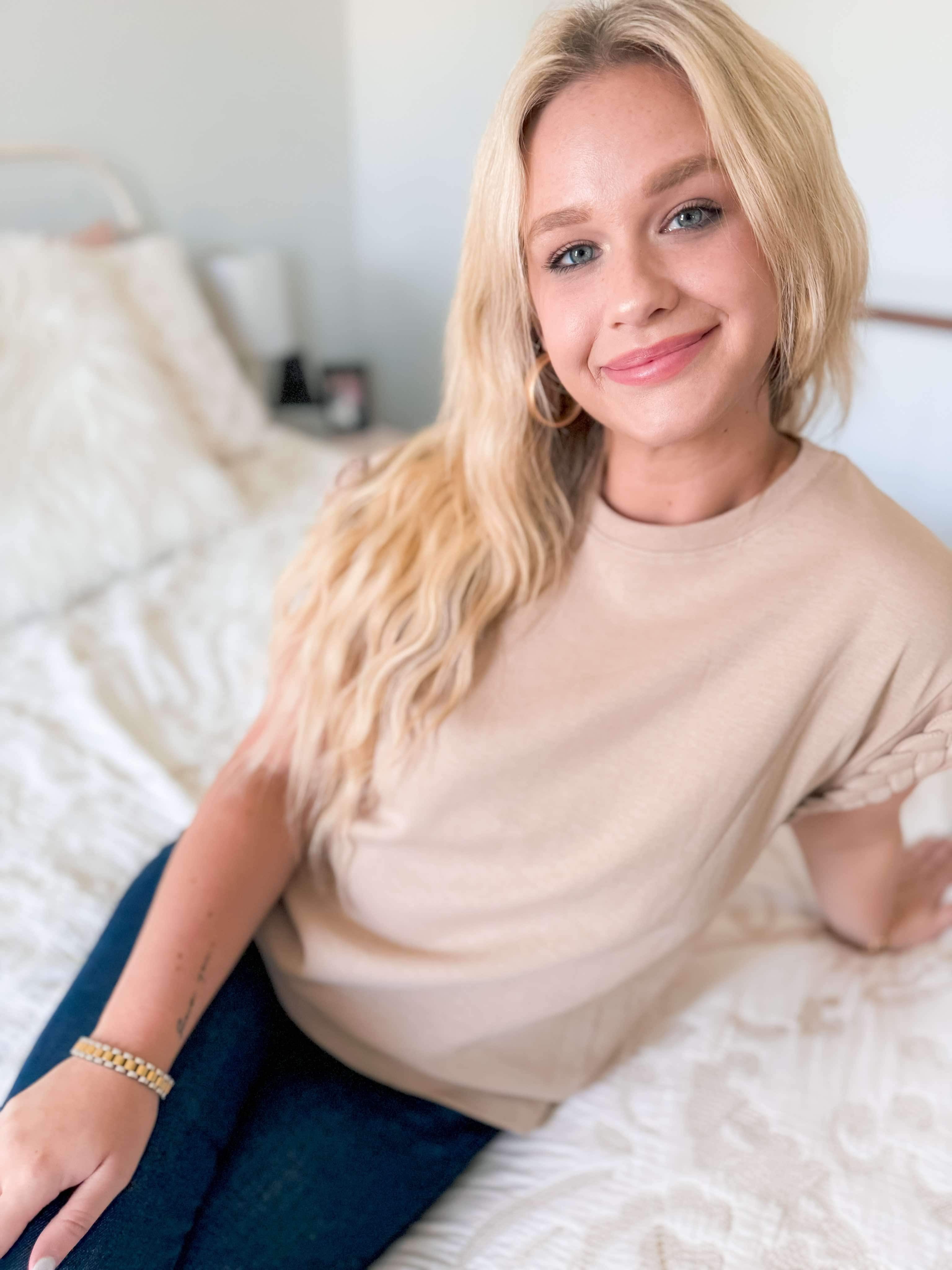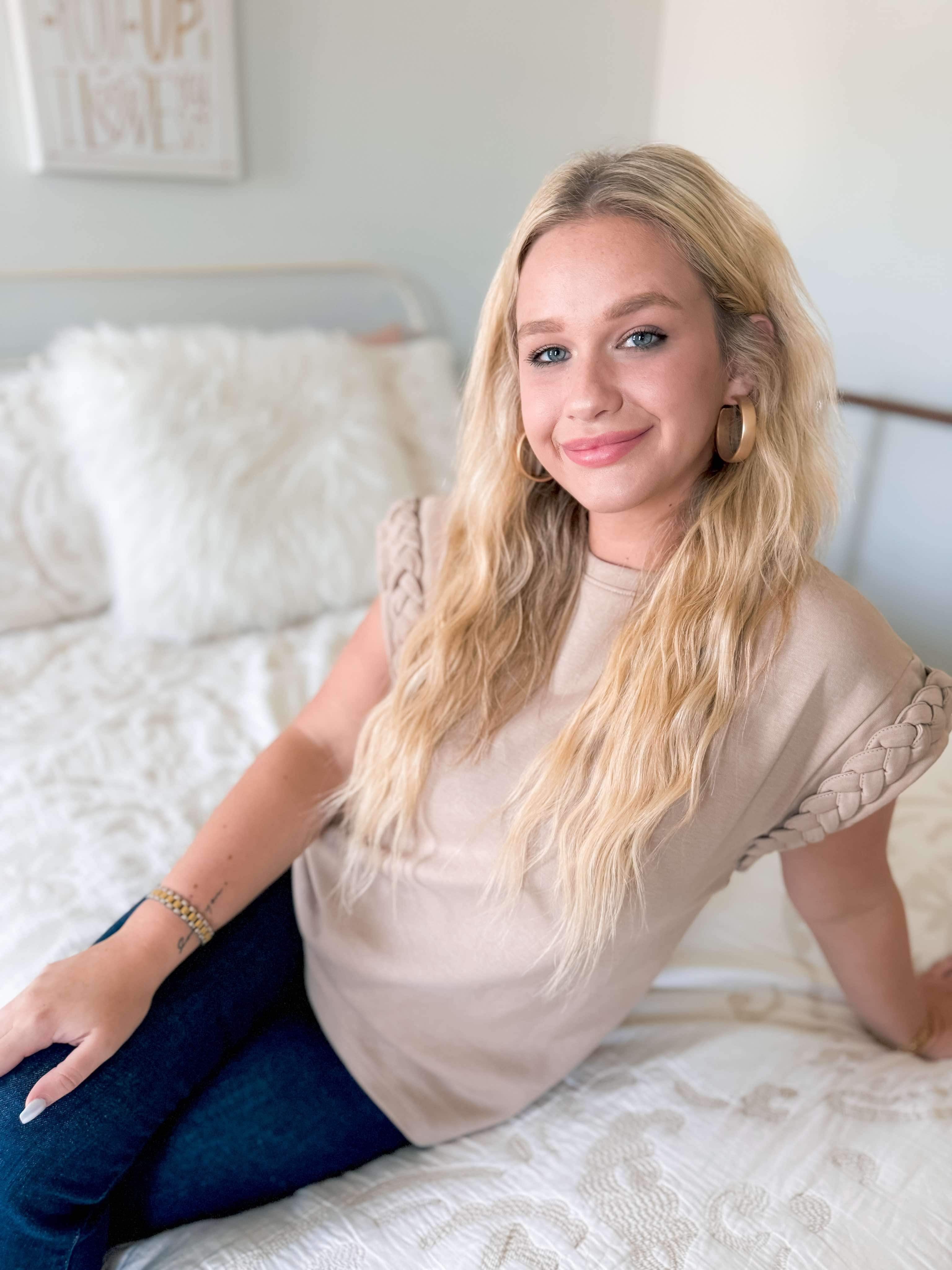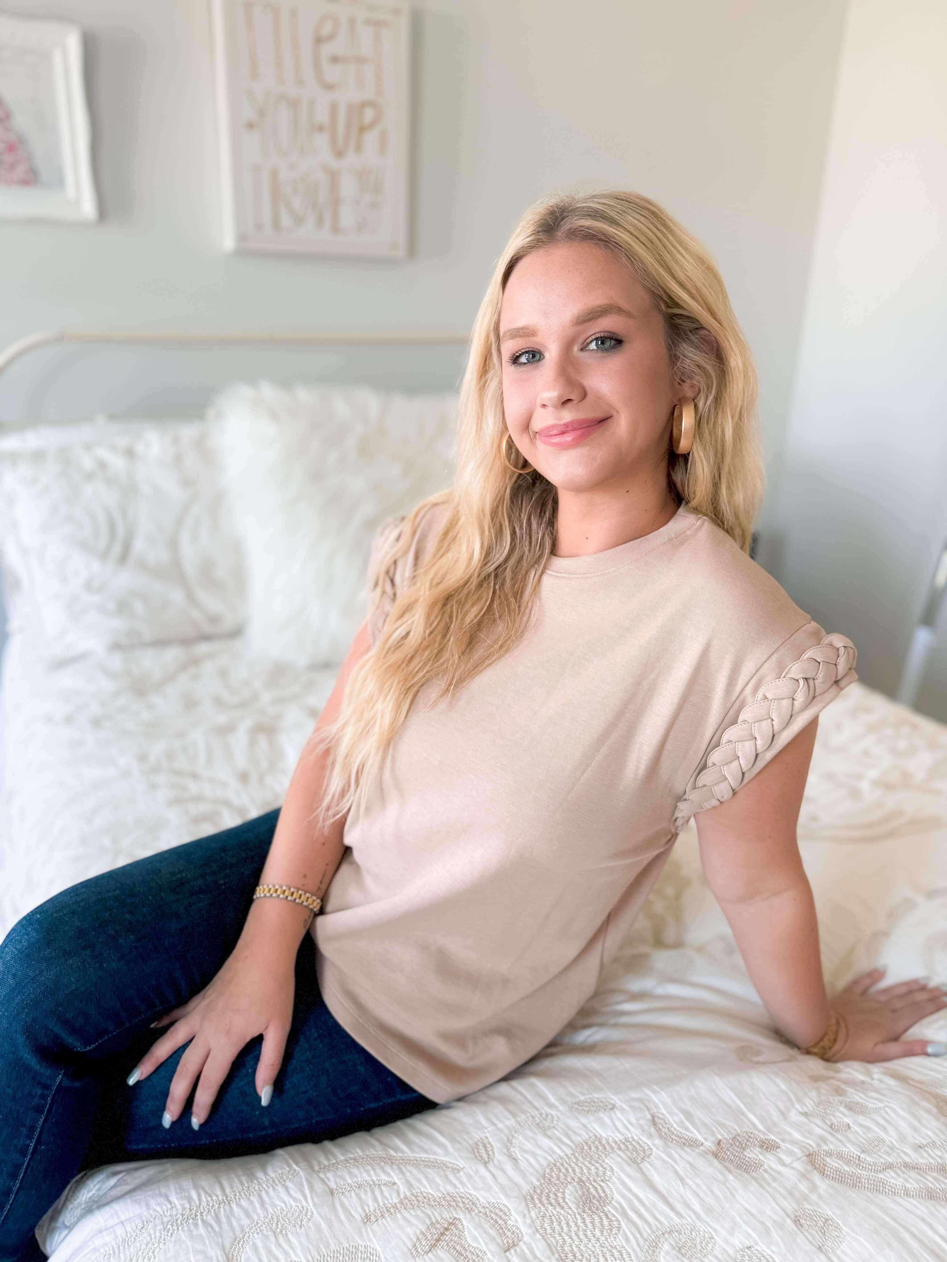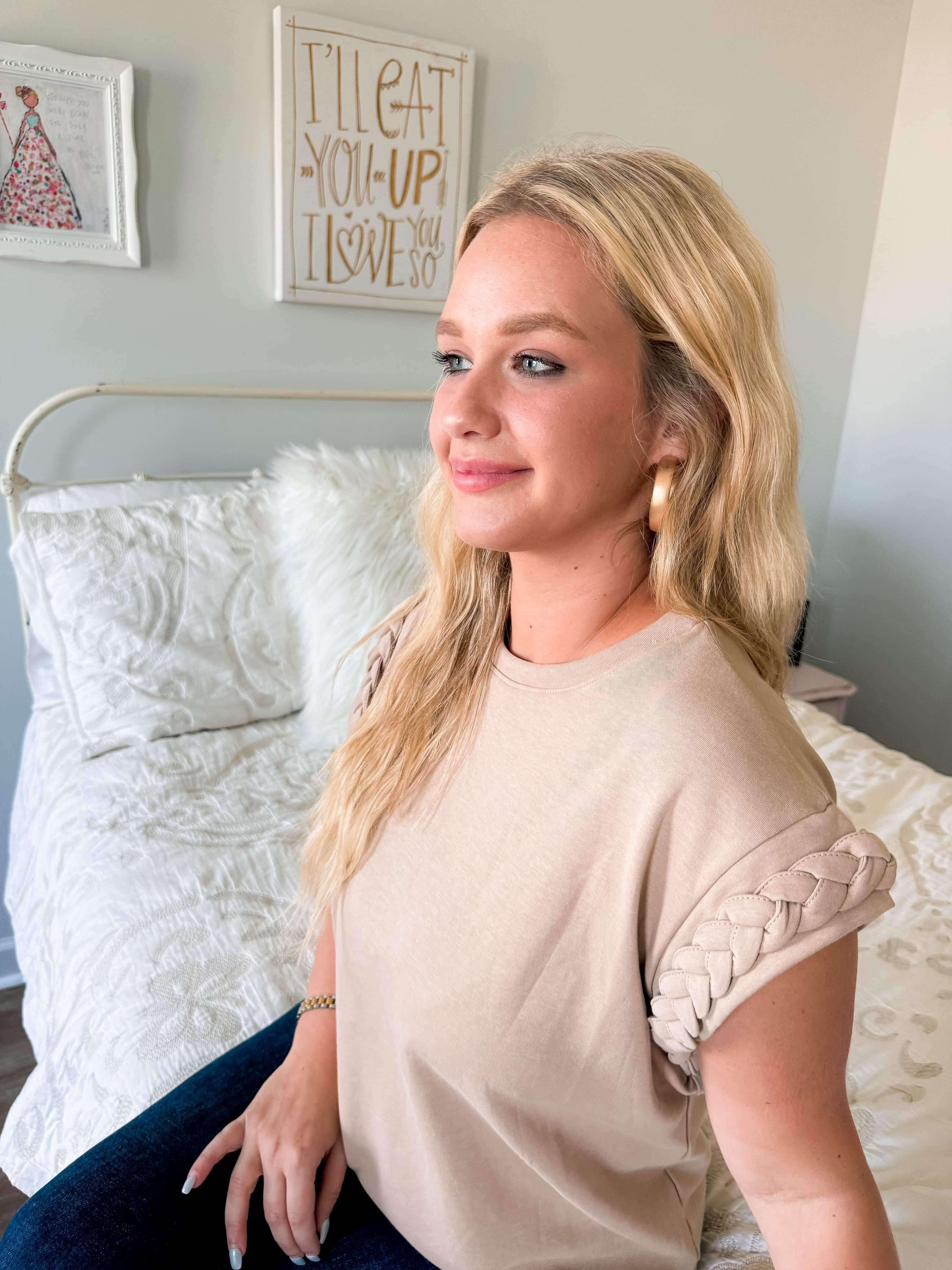 Solid round neck cap sleeve top featuring braided detail at cuff.
