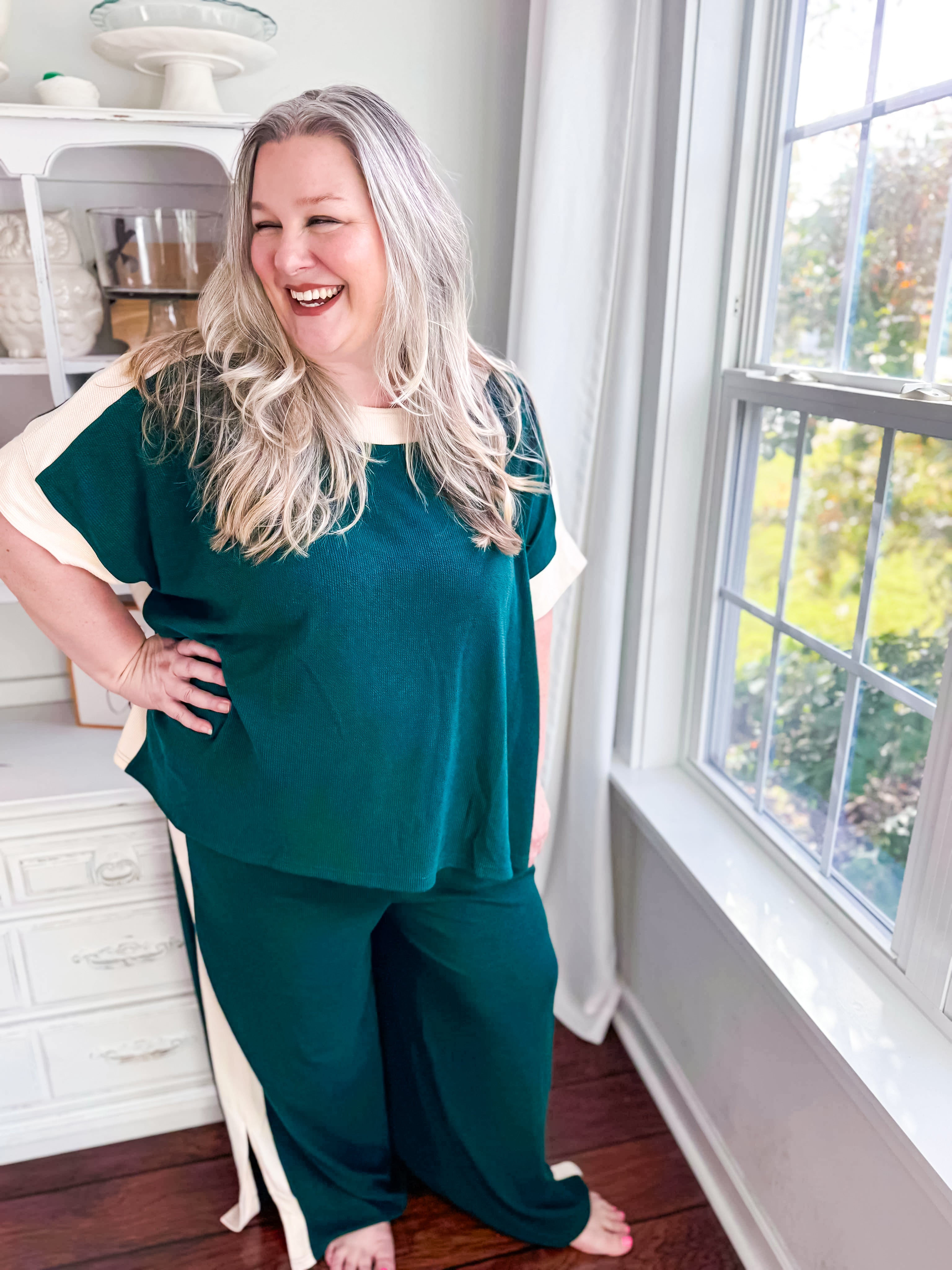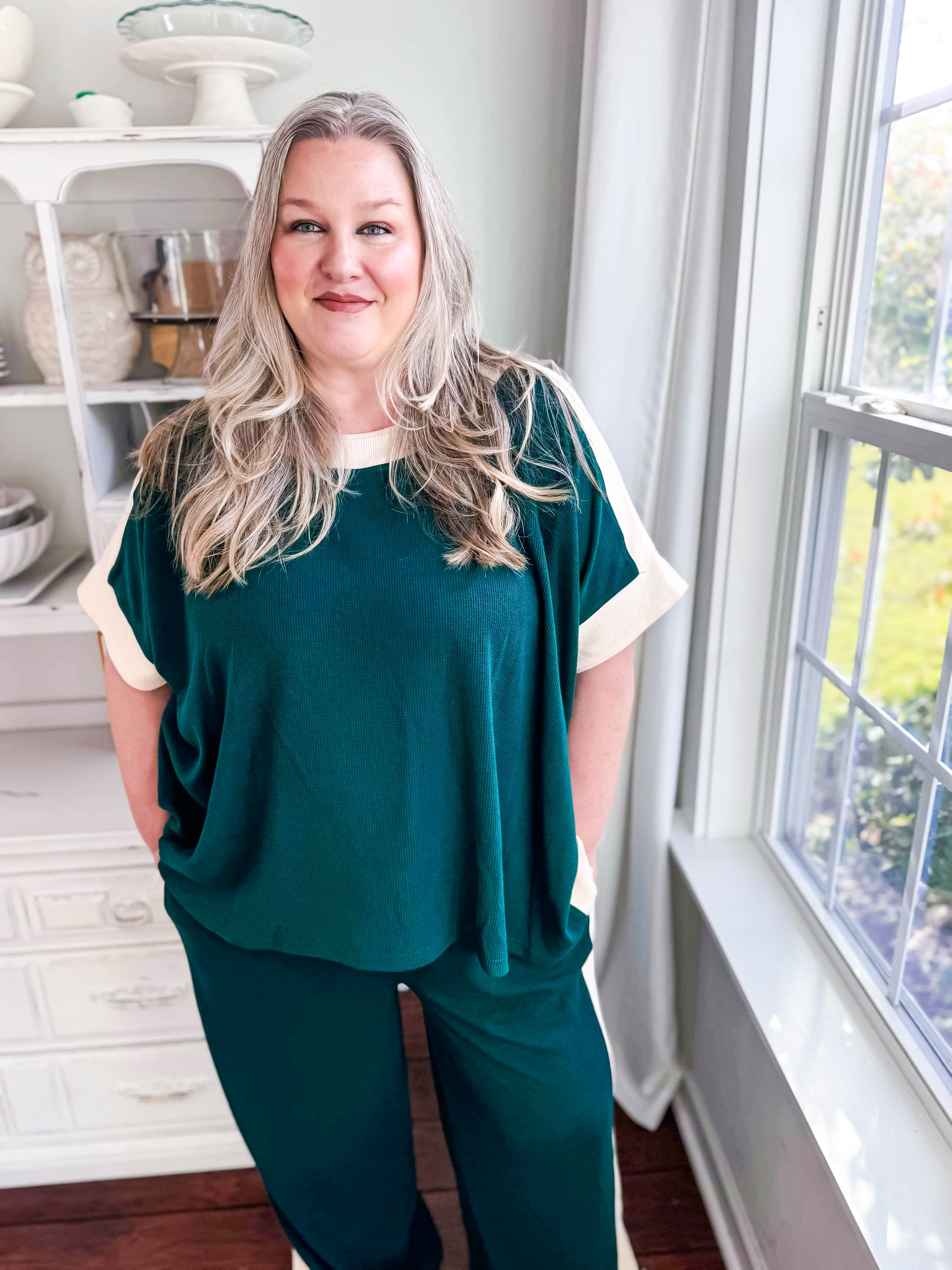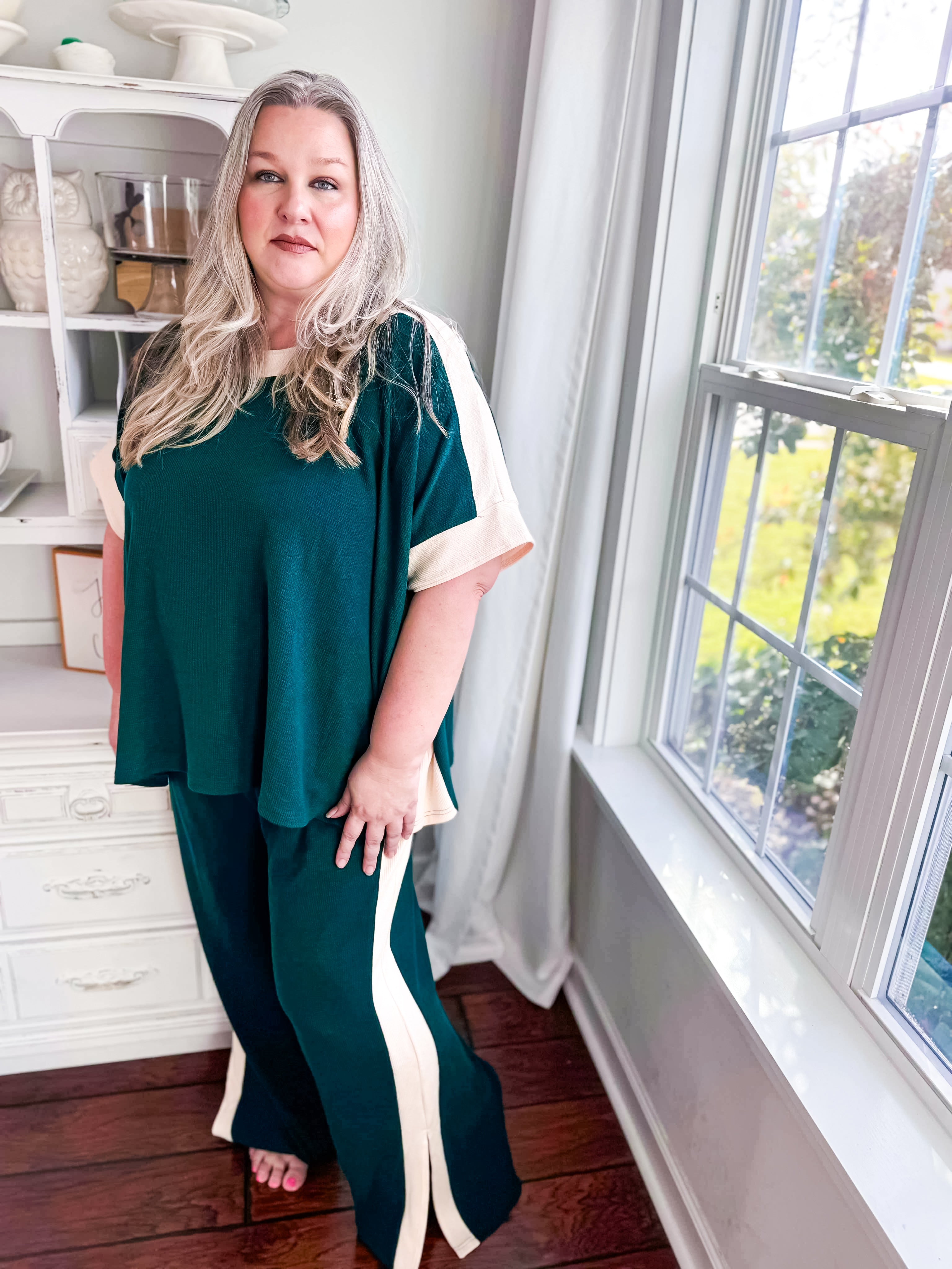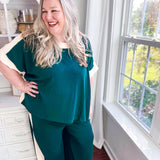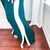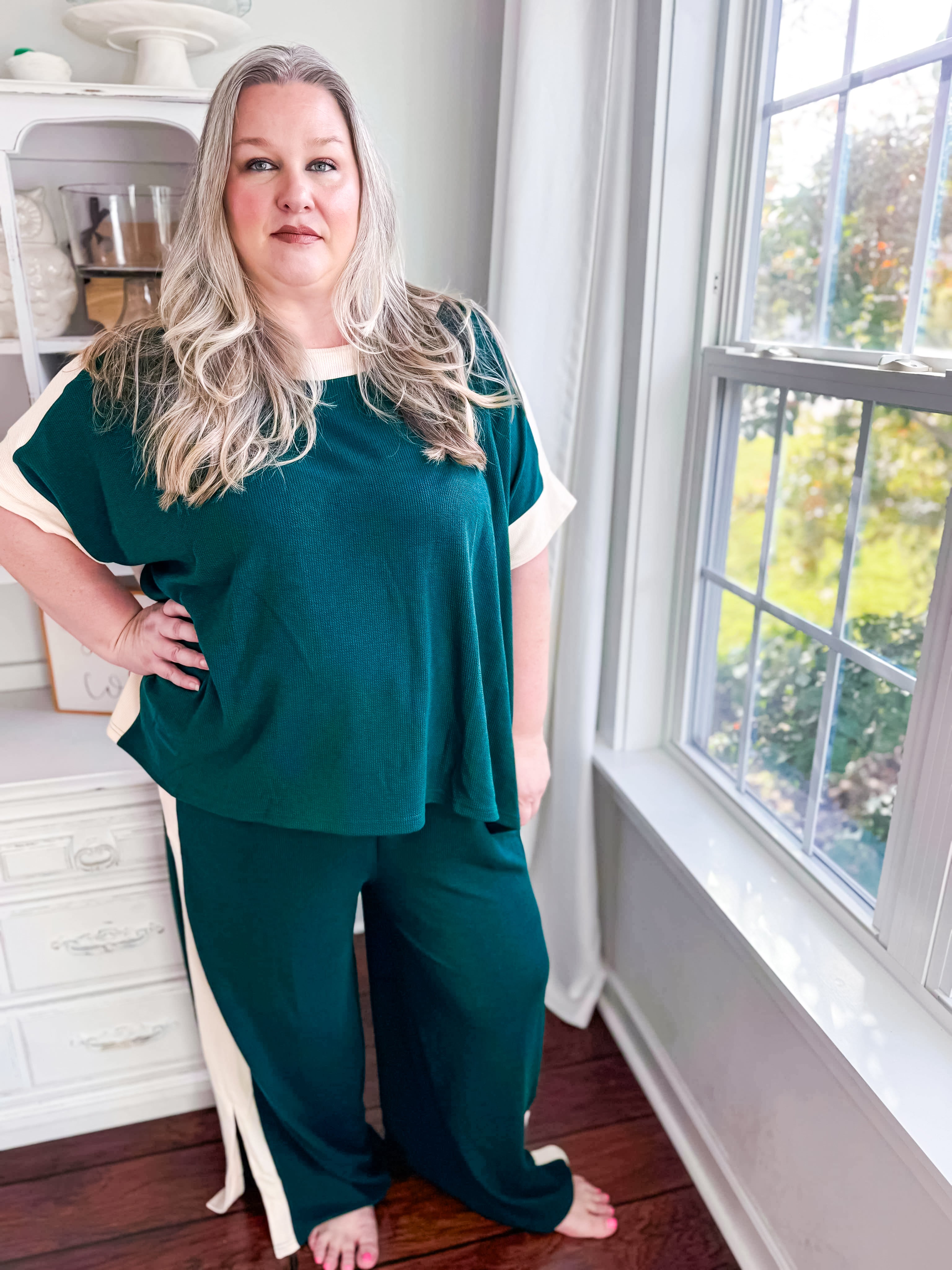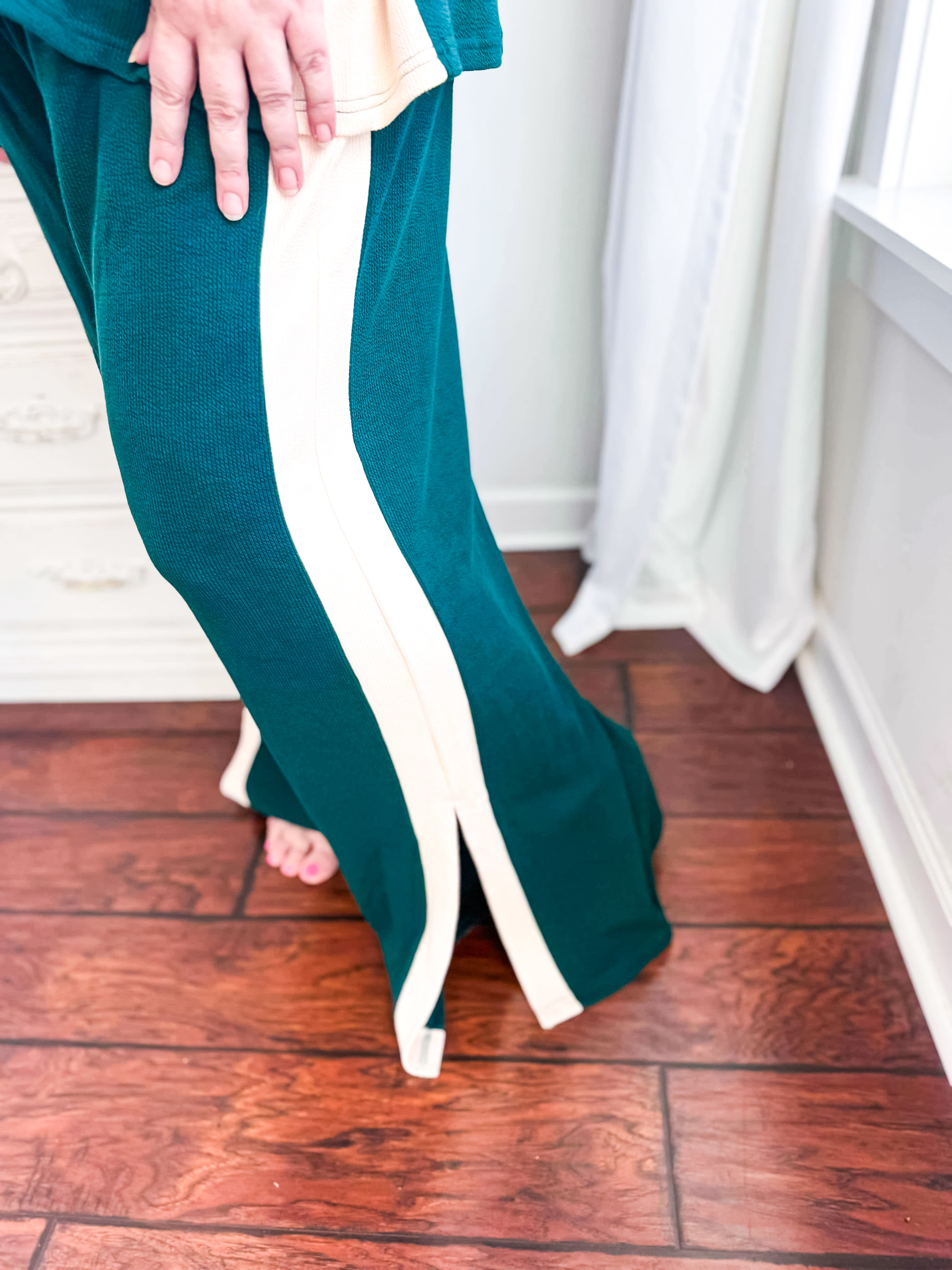 Solid ribbed high waisted wide leg pants featuring slit at sides.