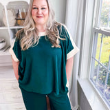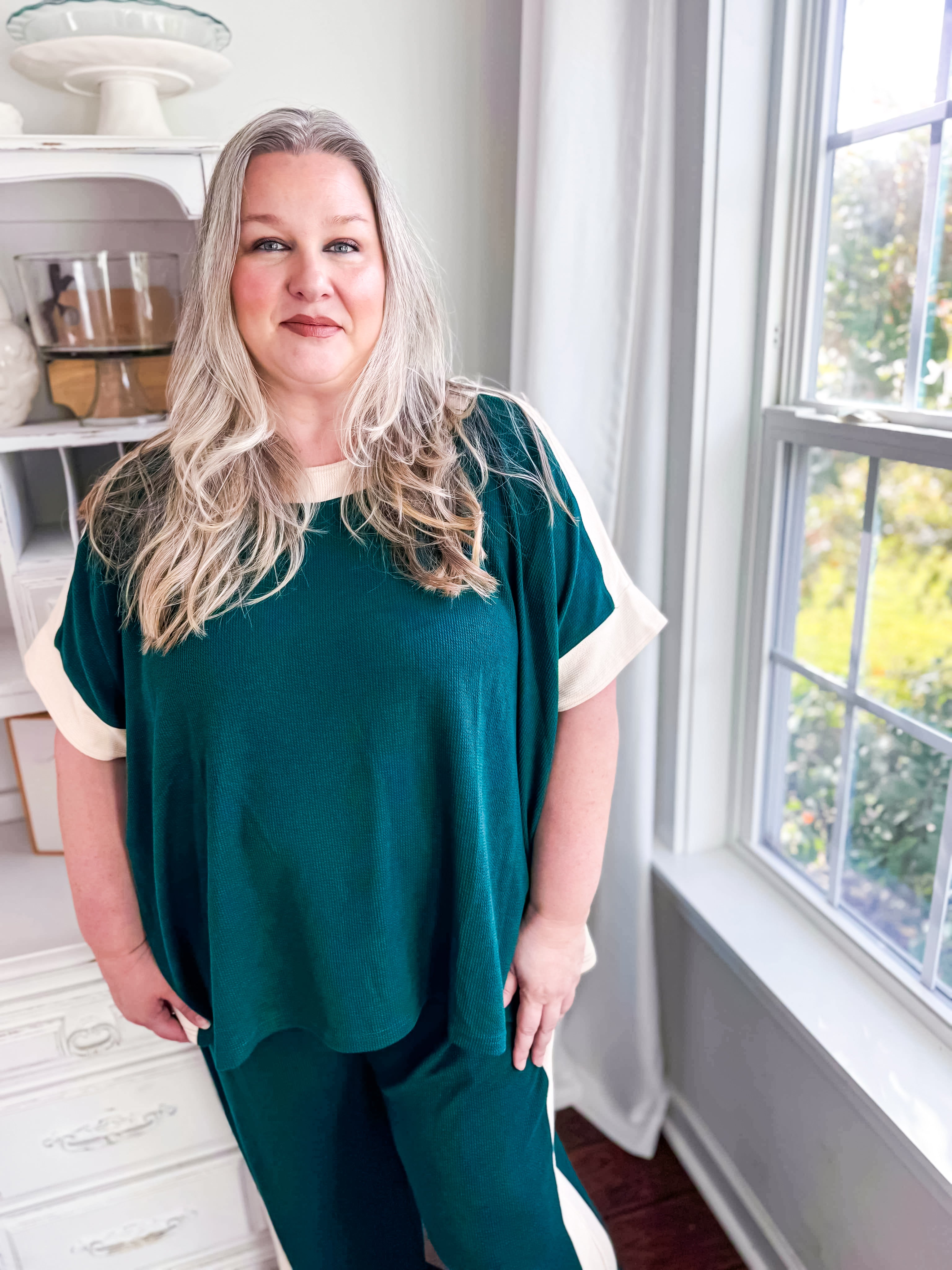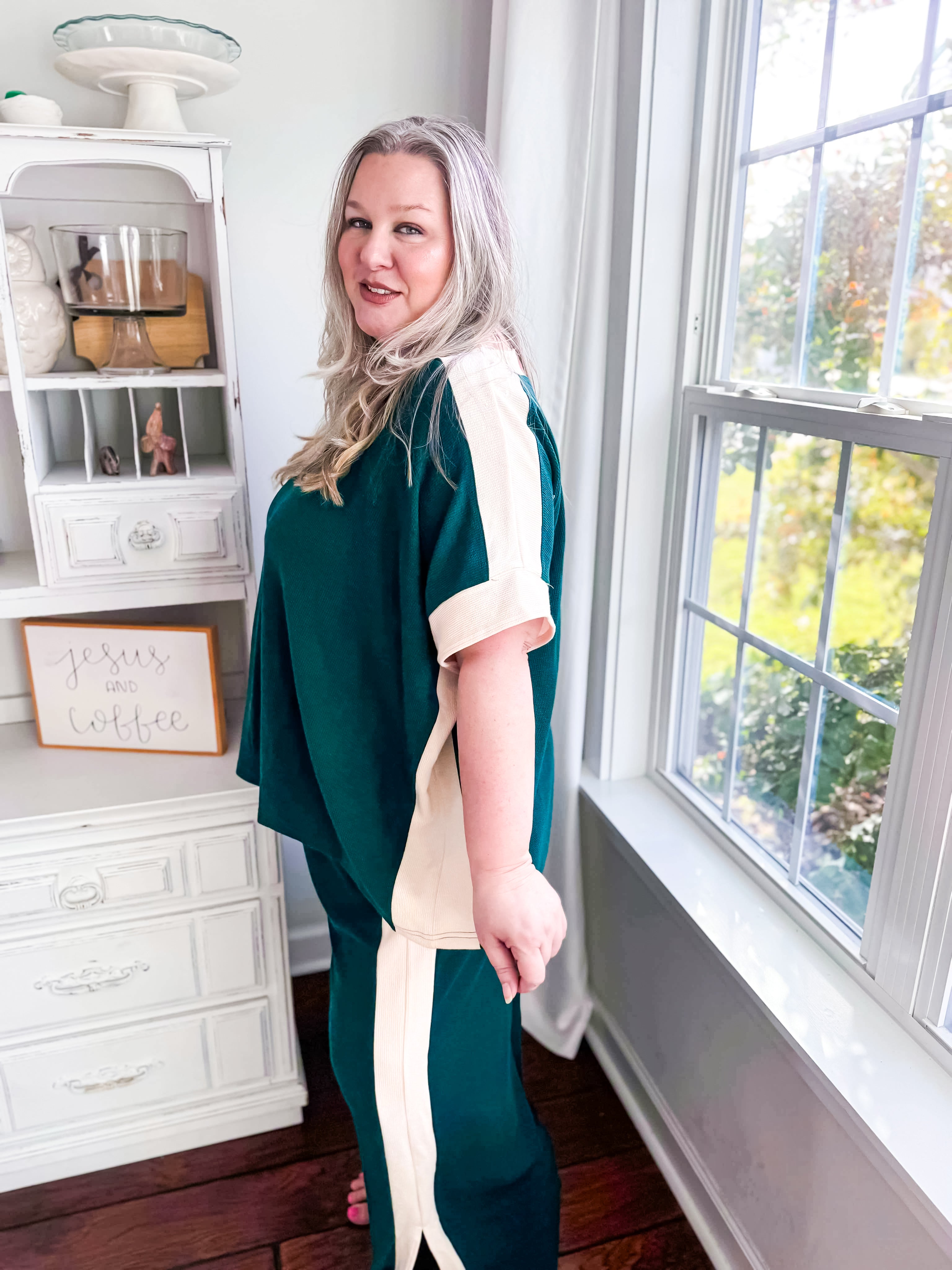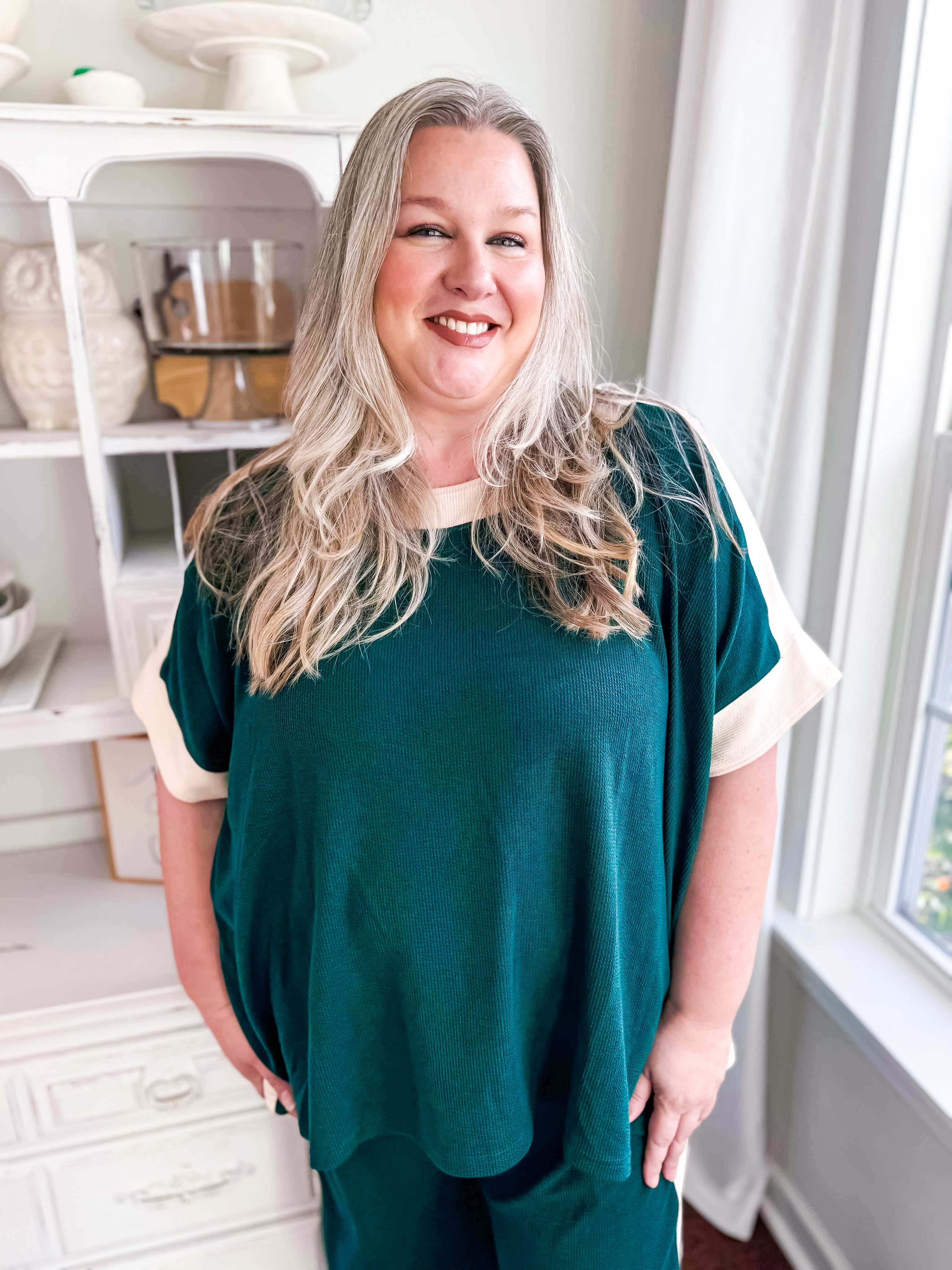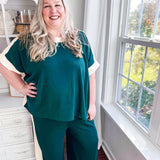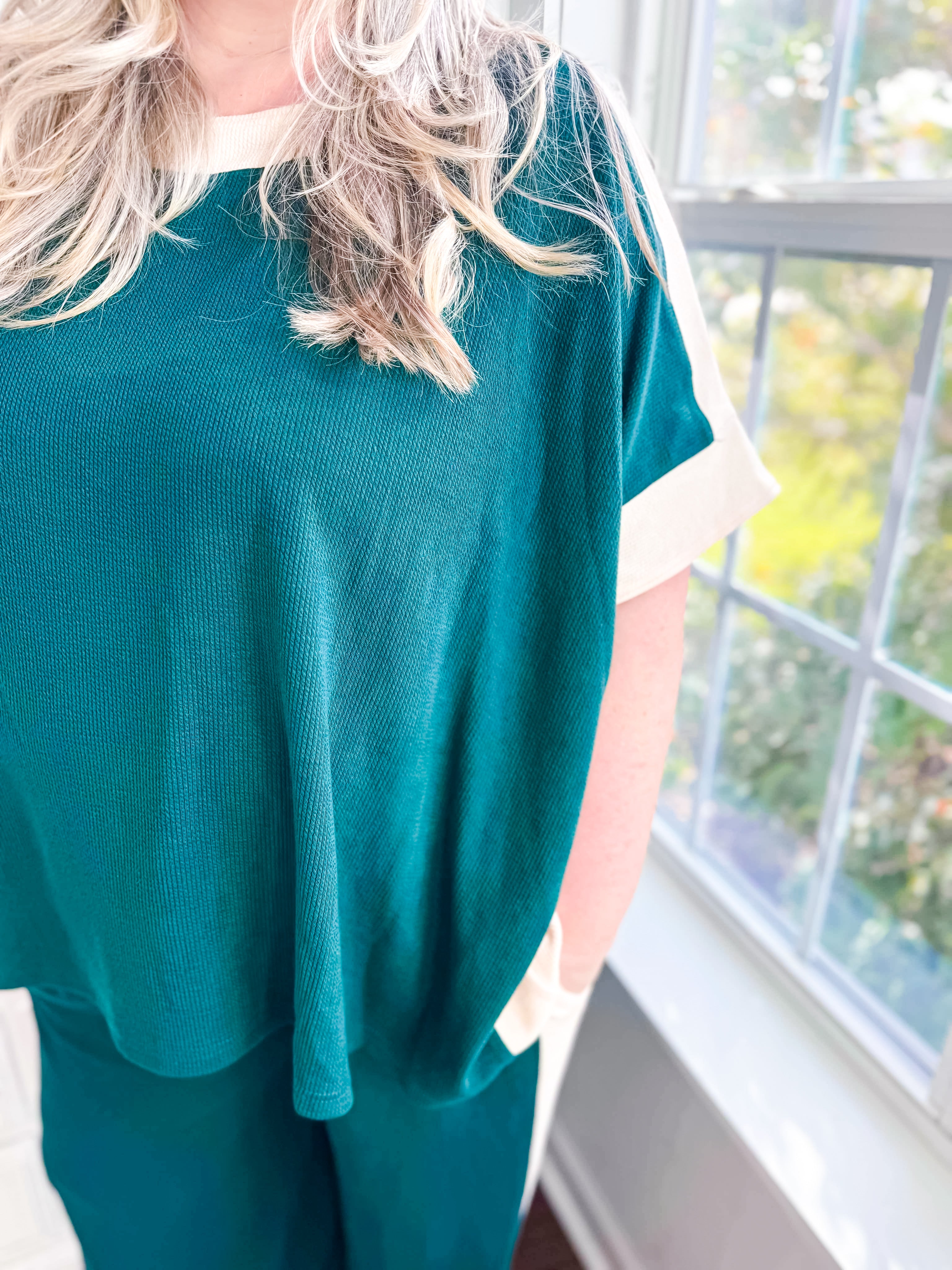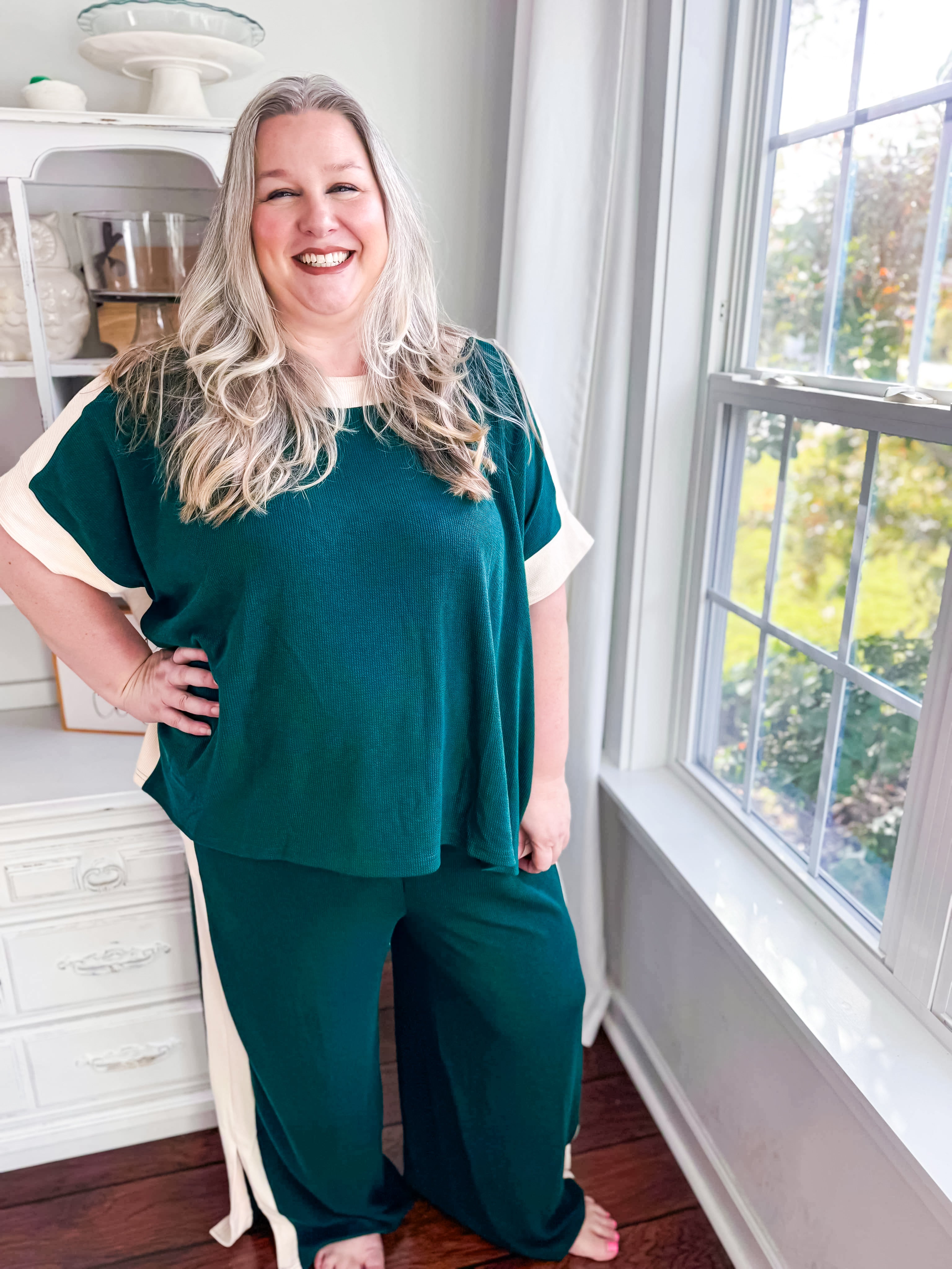 Solid ribbed high waisted wide leg pants featuring slit at sides.