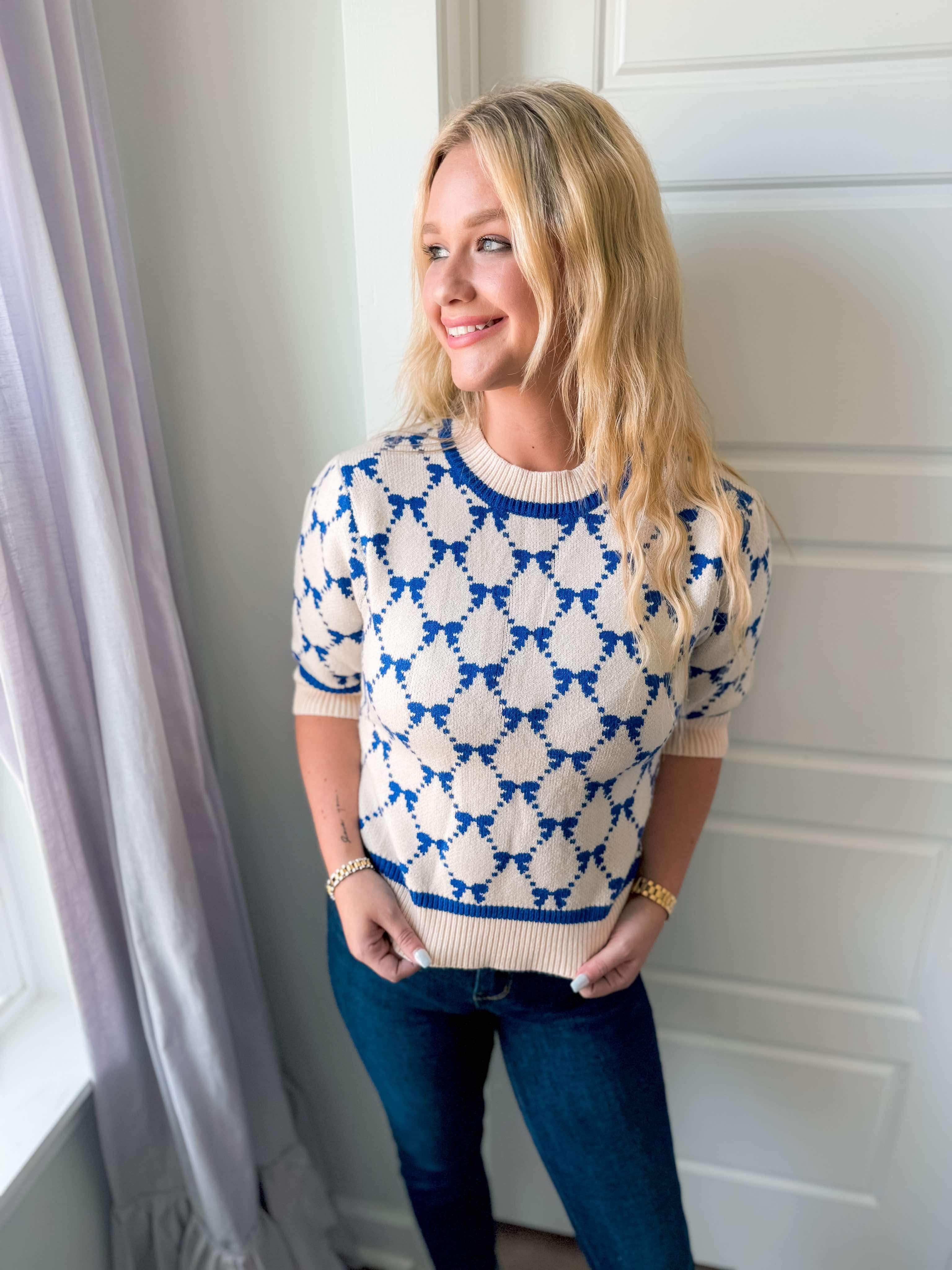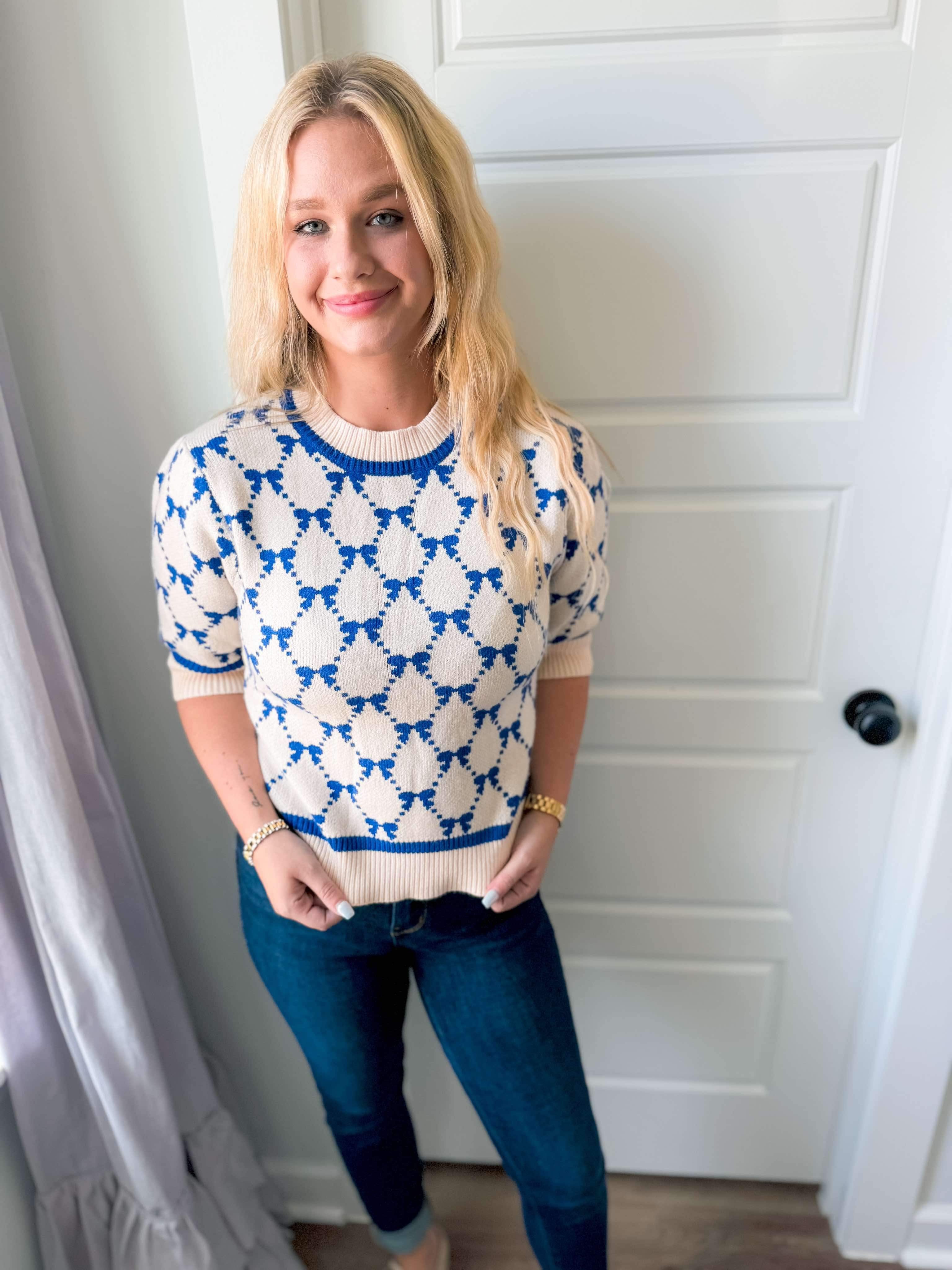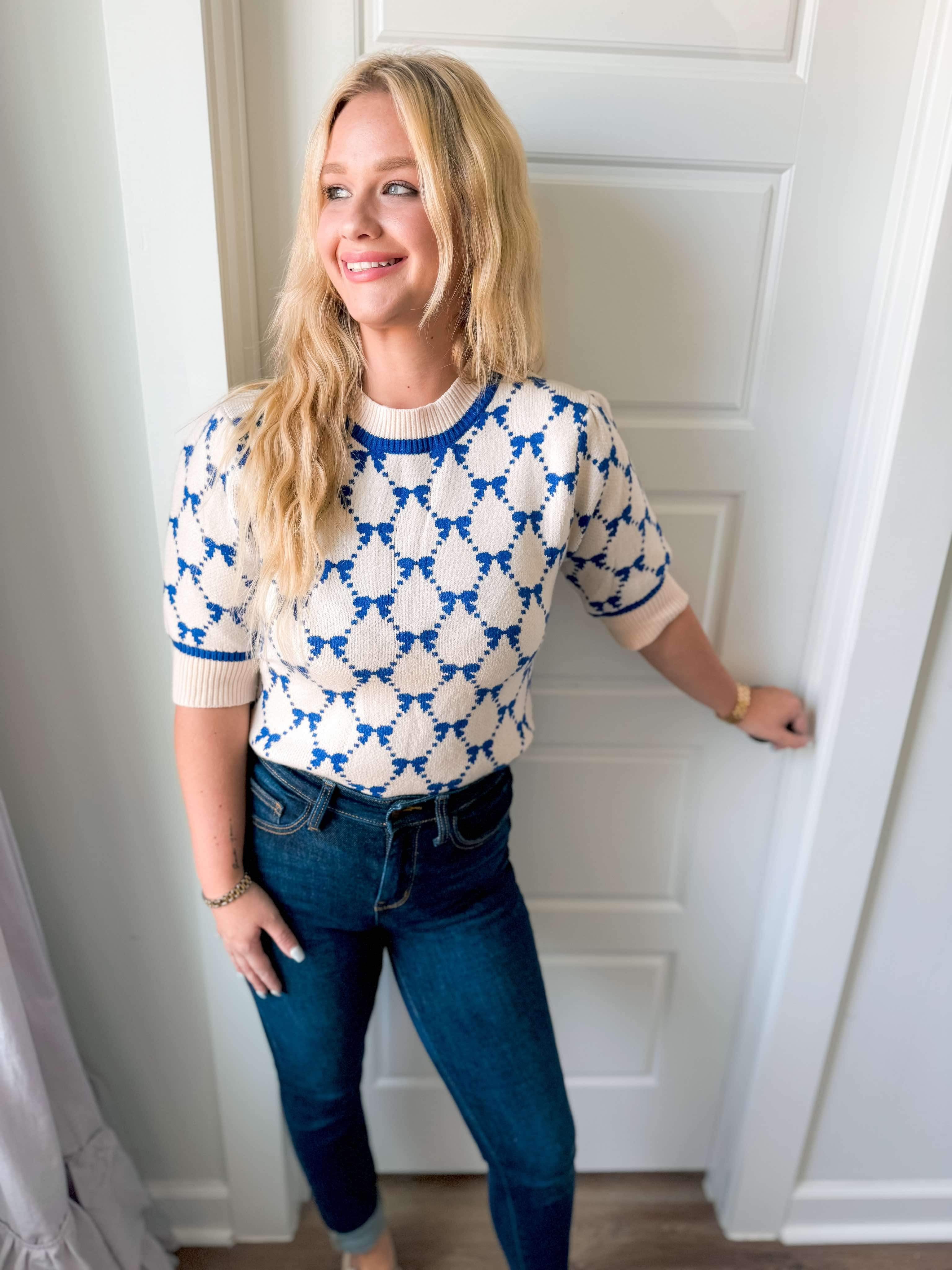 Introducing our Hidden Bow Knit Top in Cream. We are loving the cream base with the navy pattern of this top. Gives us a subtle transition into fall - still bright, but still neutral. There are bows throughout the pattern that are kind of hidden - hence the name <3 It features a ribbed material around the neckline, bottom of the shirt and the sleeves. It is a knitted material, but is still lightweight!