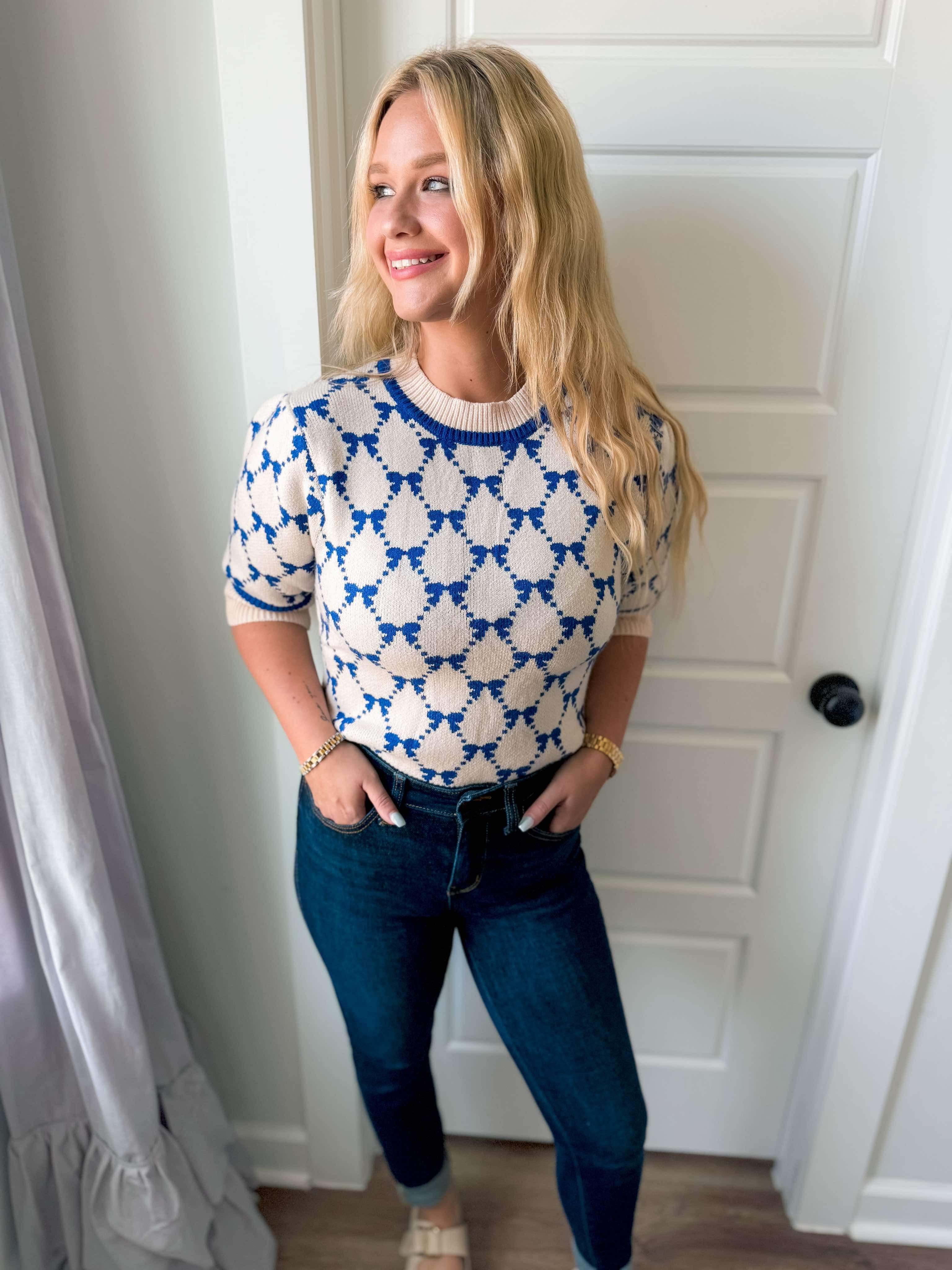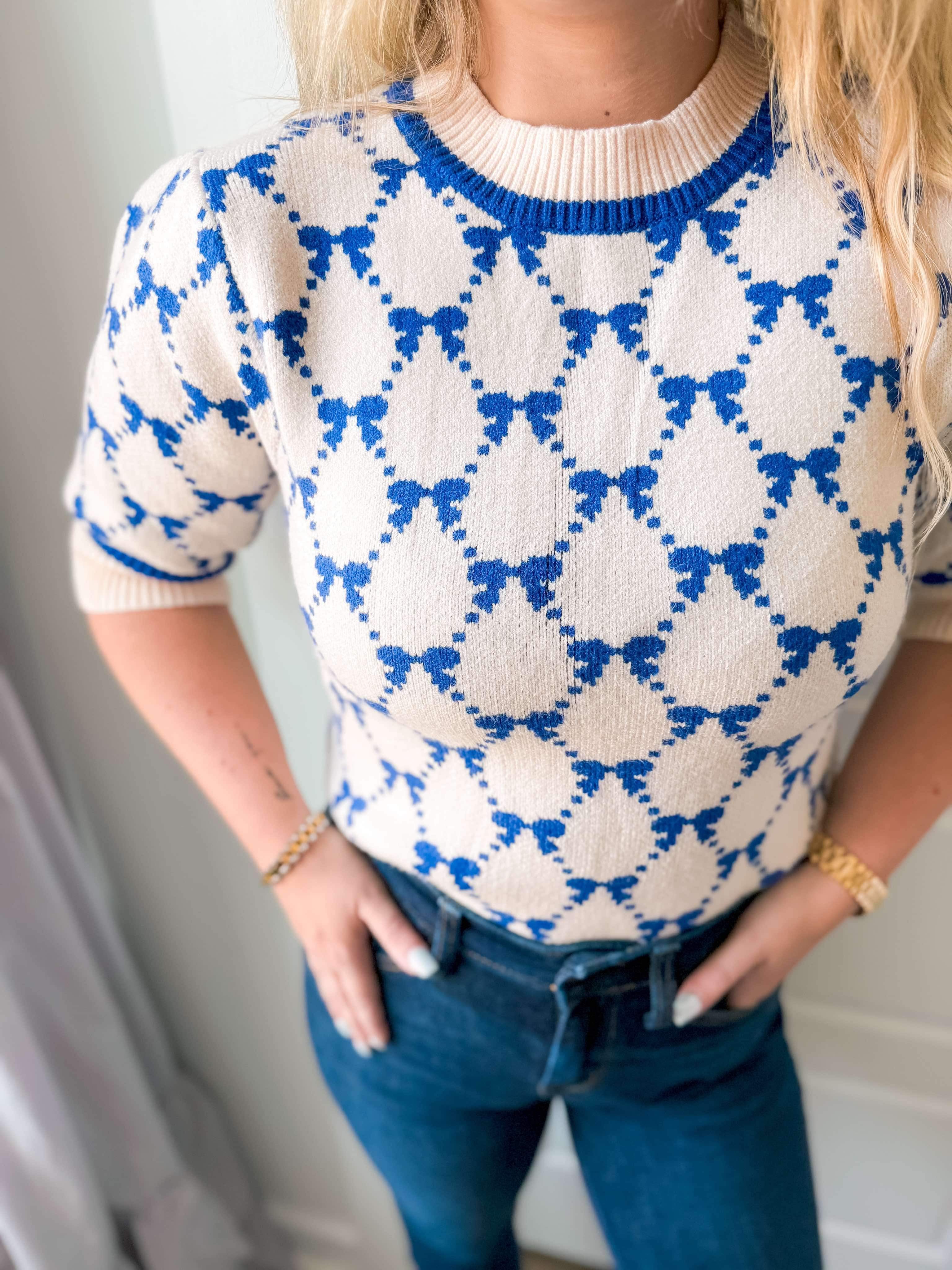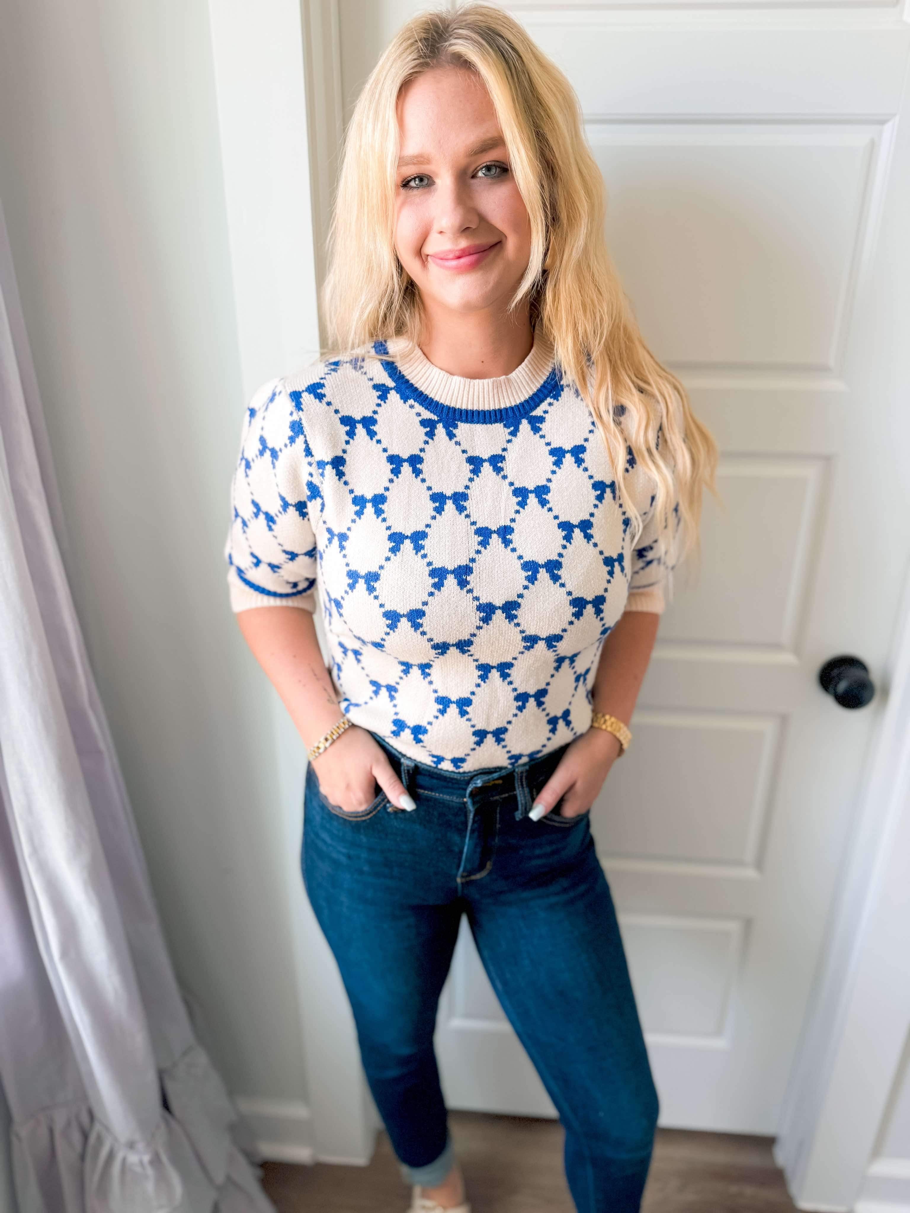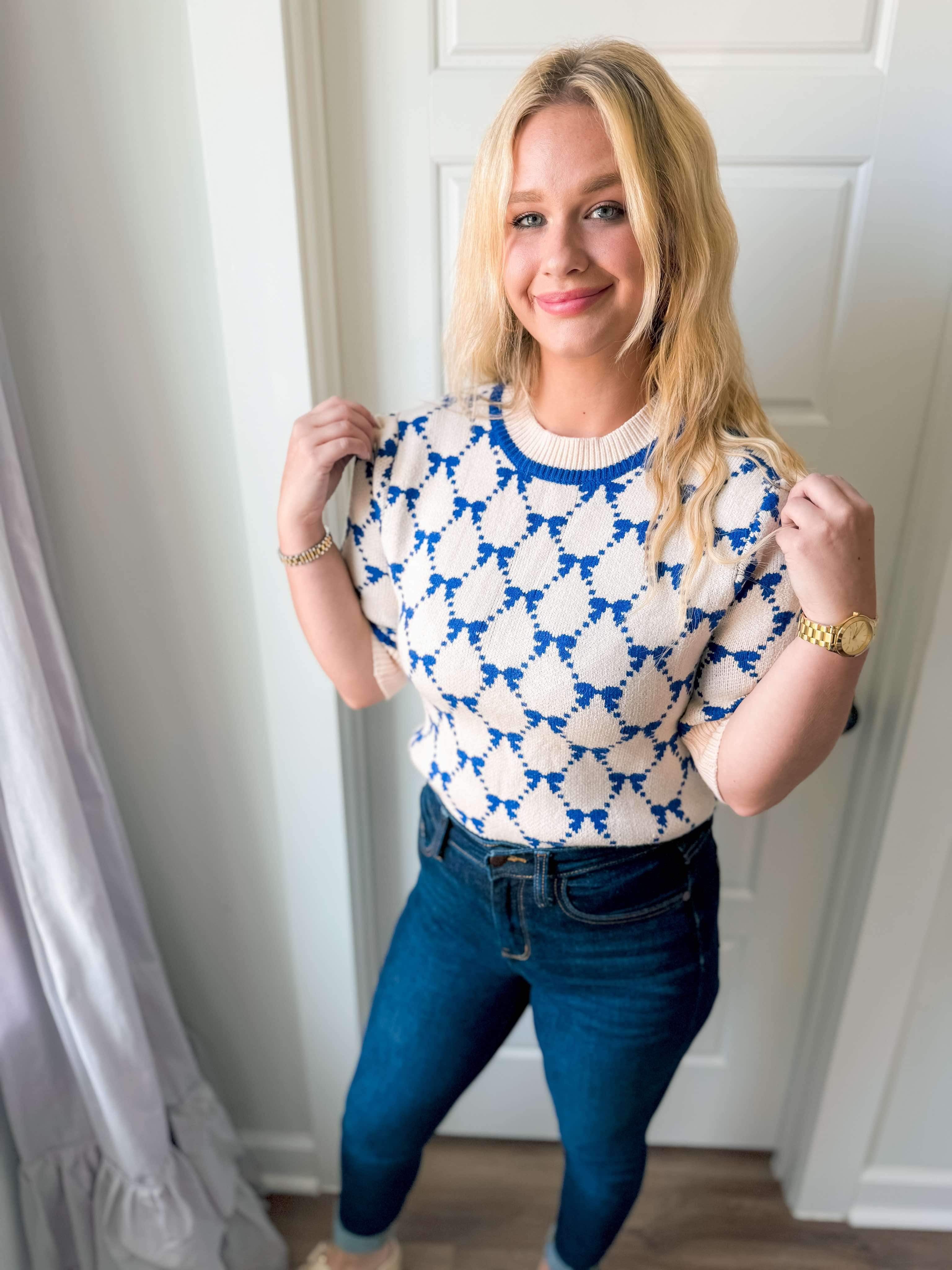Introducing our Hidden Bow Knit Top in Cream. We are loving the cream base with the navy pattern of this top. Gives us a subtle transition into fall - still bright, but still neutral. There are bows throughout the pattern that are kind of hidden - hence the name <3 It features a ribbed material around the neckline, bottom of the shirt and the sleeves. It is a knitted material, but is still lightweight!