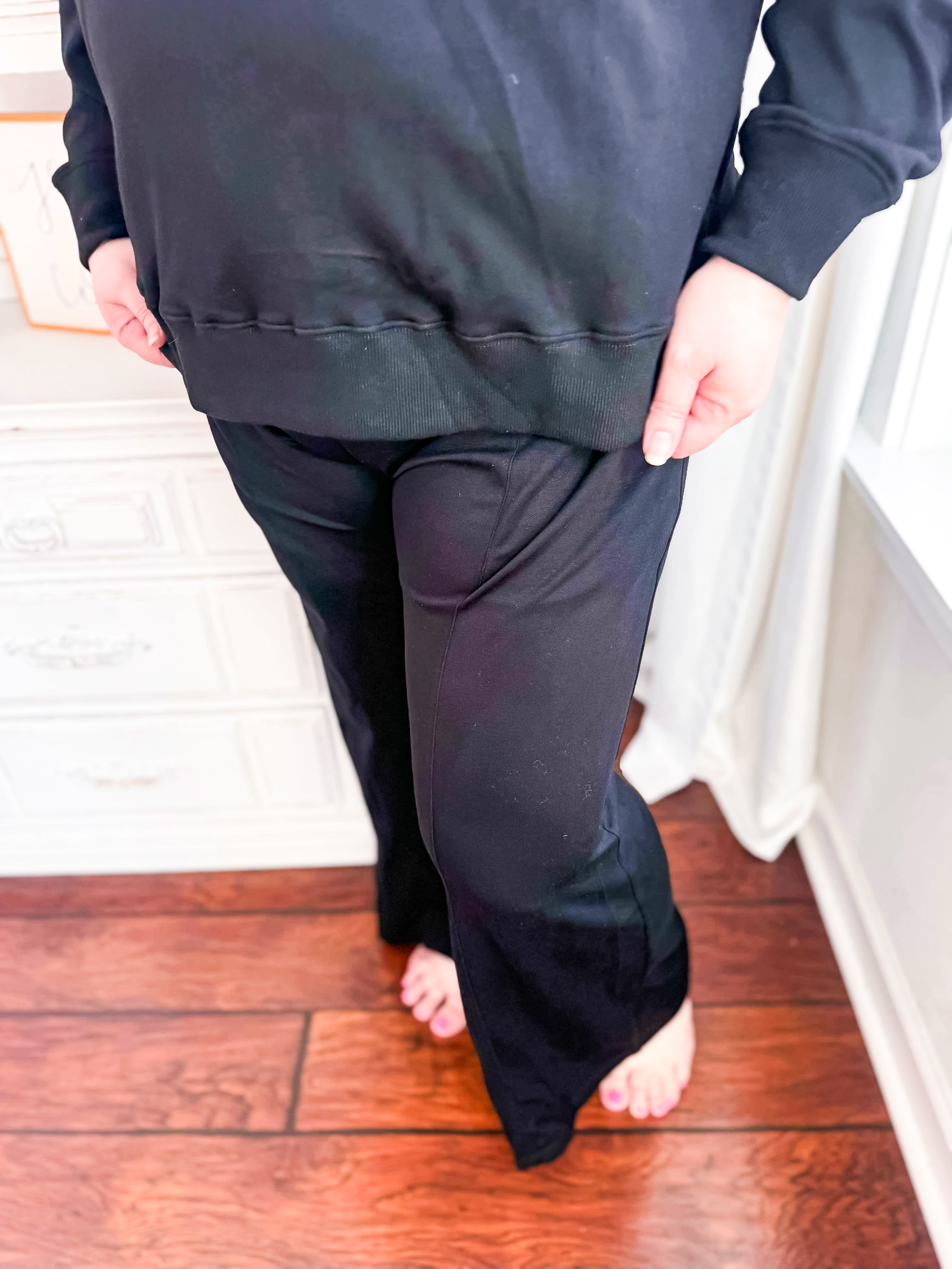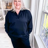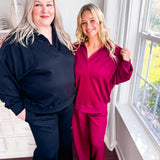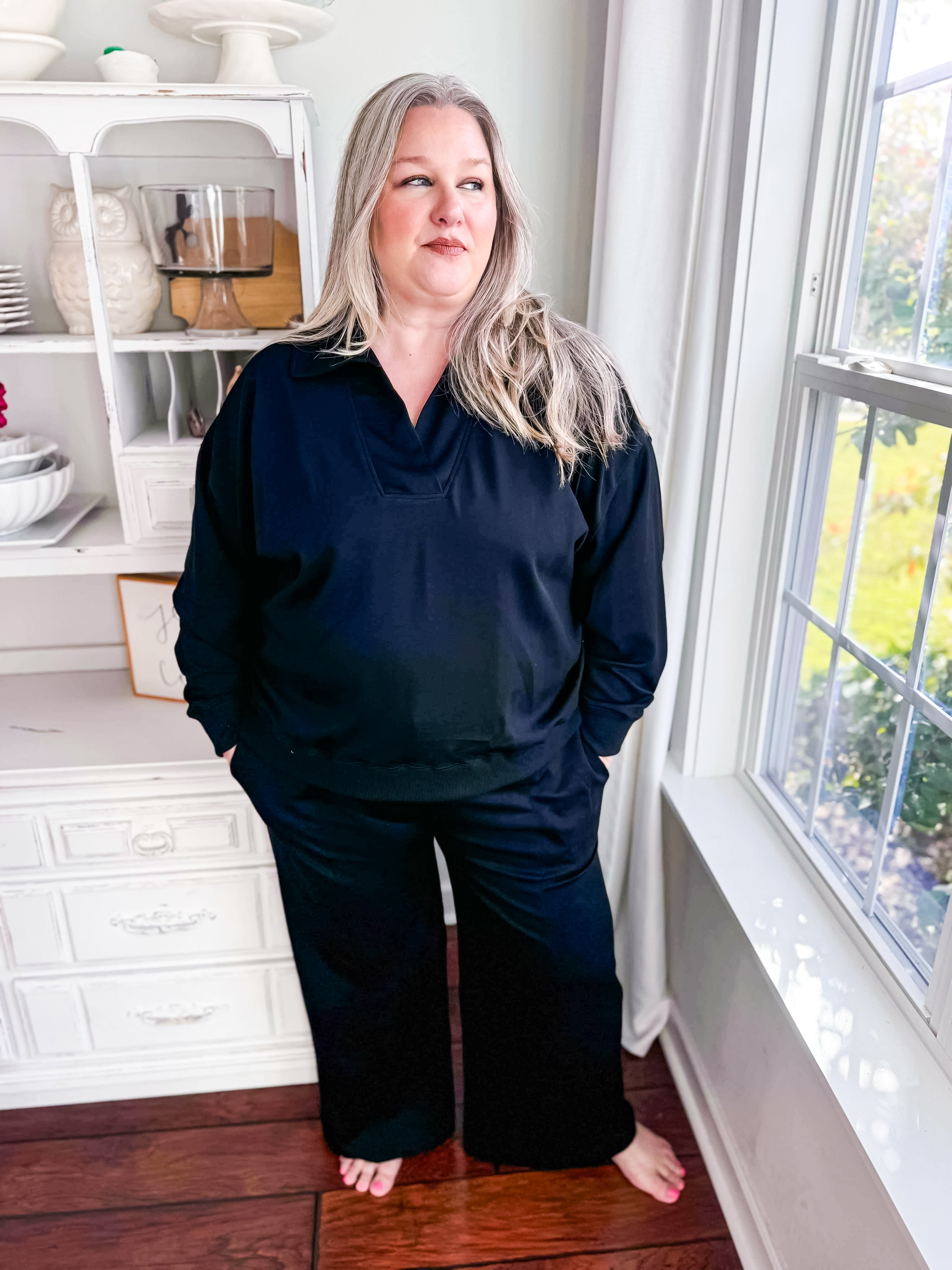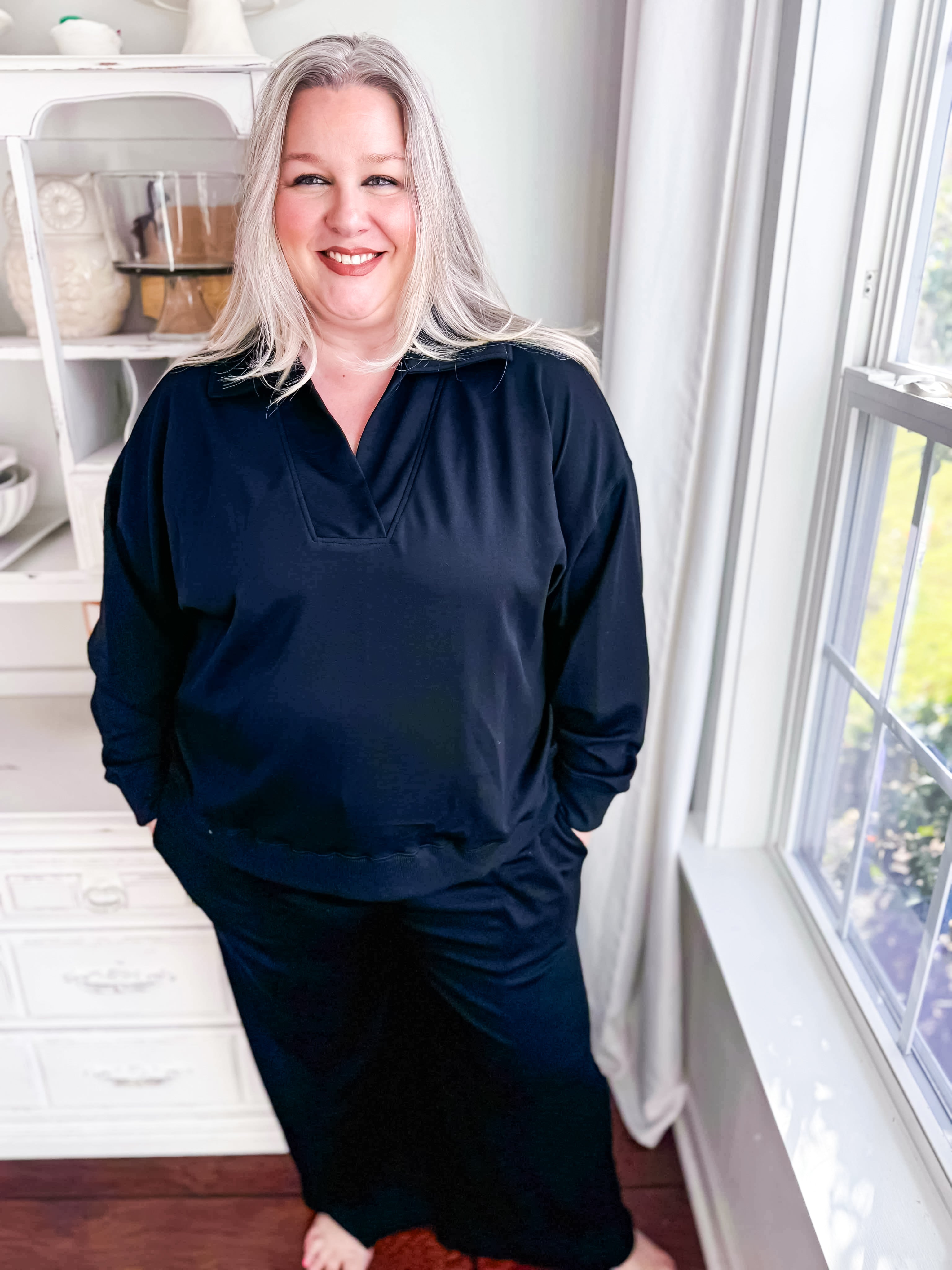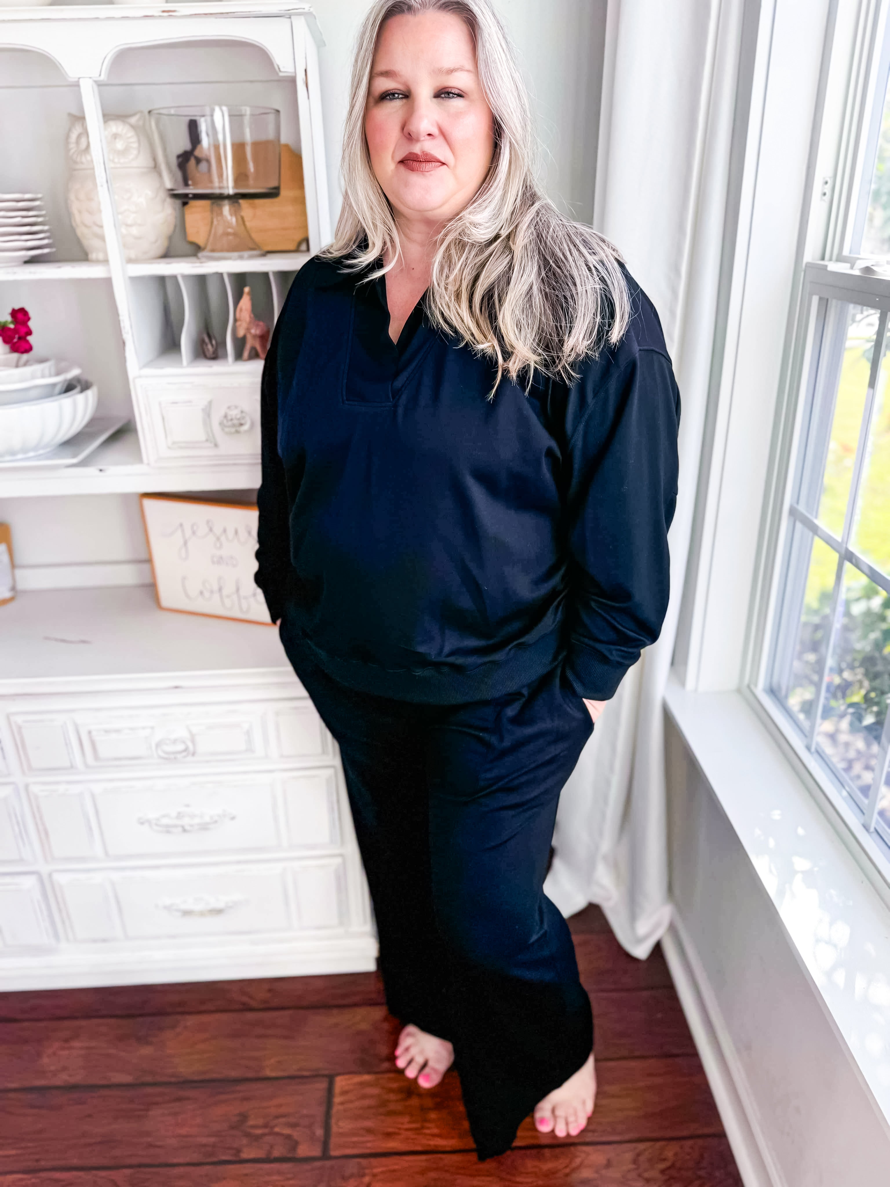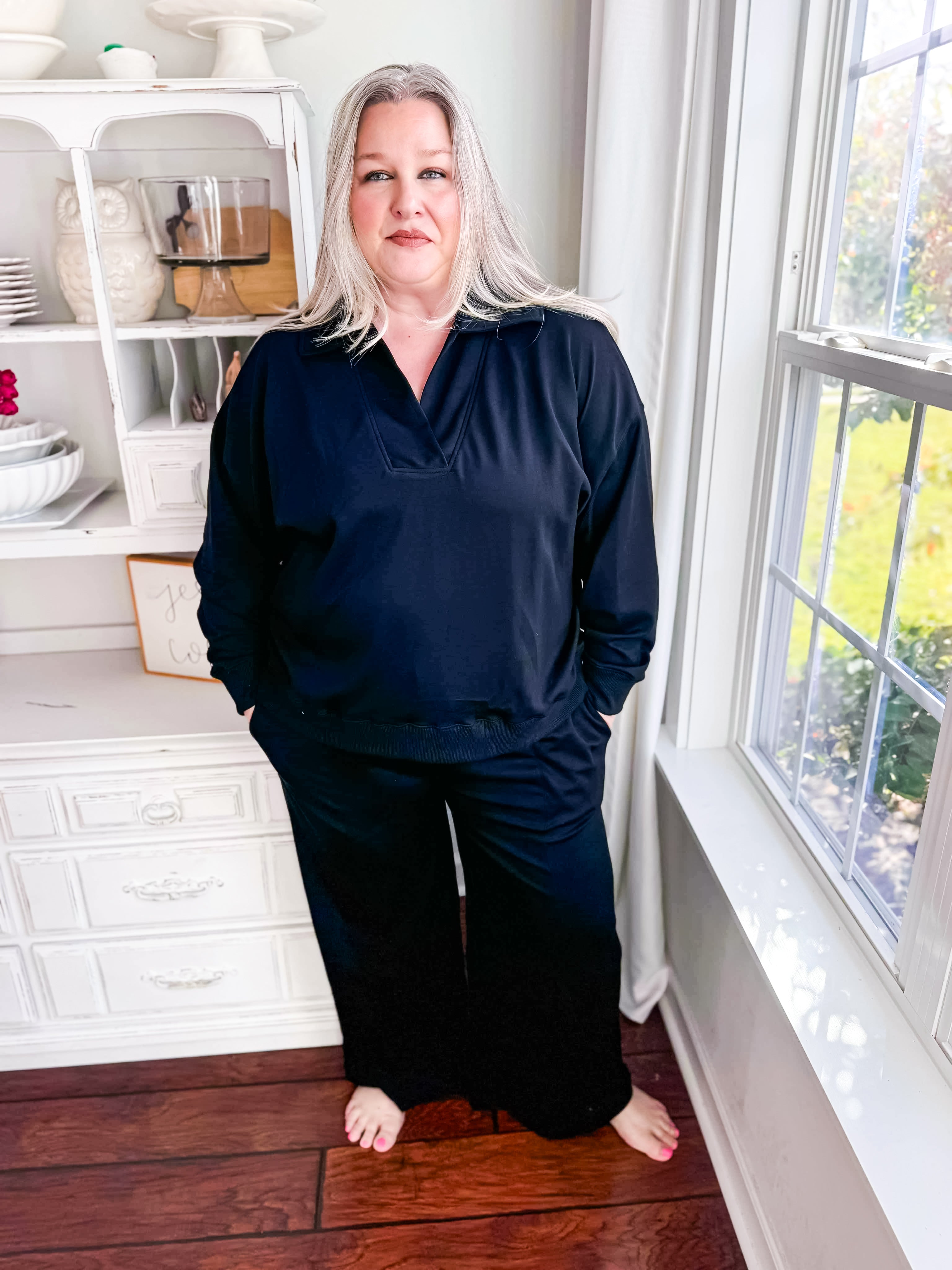 This set is everything you have been looking for. Buttery soft, insanely cute, perfect for those cozy nights. BUT - if you had to hurry and run and errand - you can keep her on and put on a pair of sneakers or sandals and run to wherever it is you have to go. It features a collar detailing to give it that dress up option. It is sold as a set - which is always a plus. FULL SIZE RUN! The pants are full length and the top is full length as well.