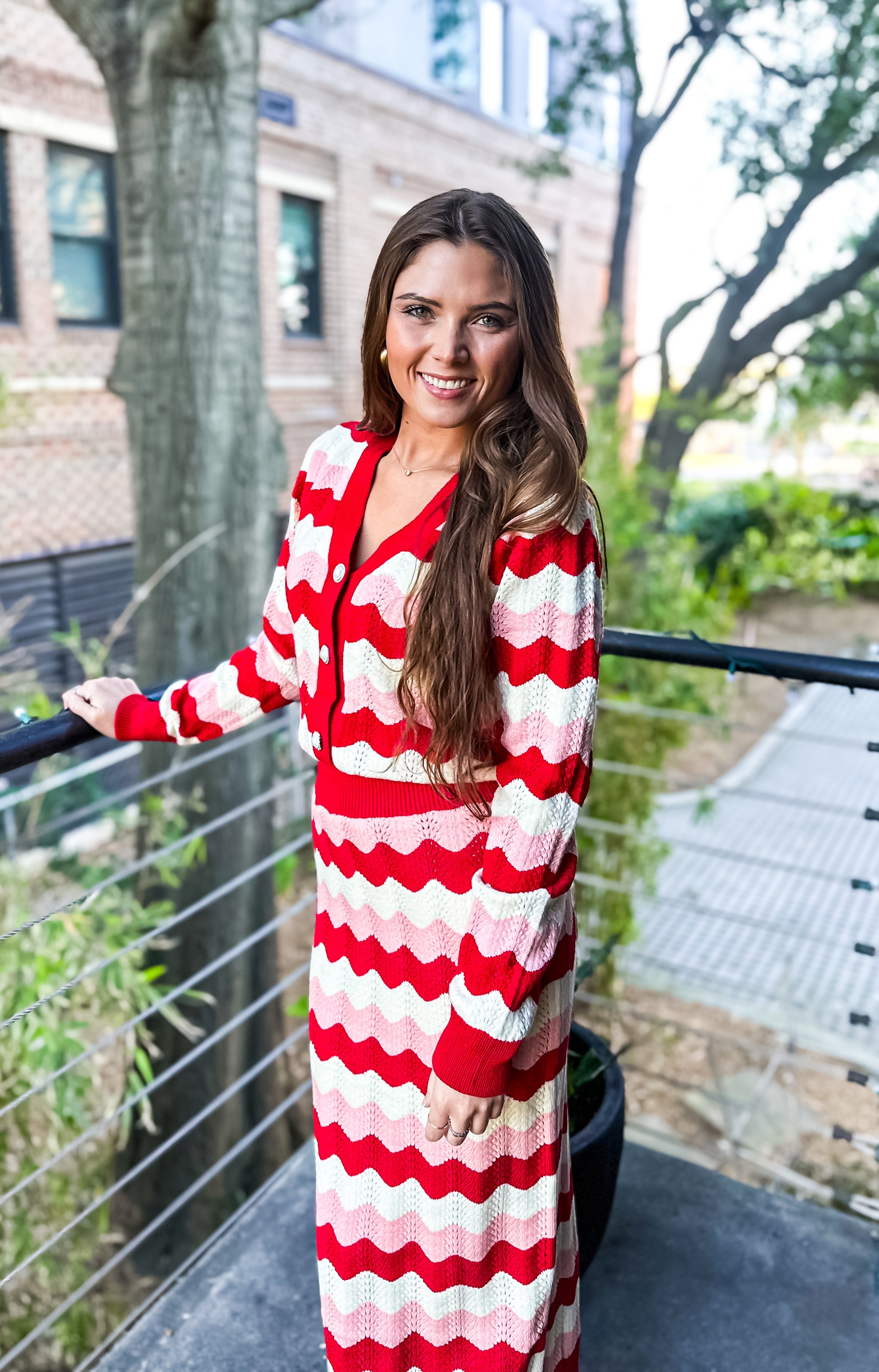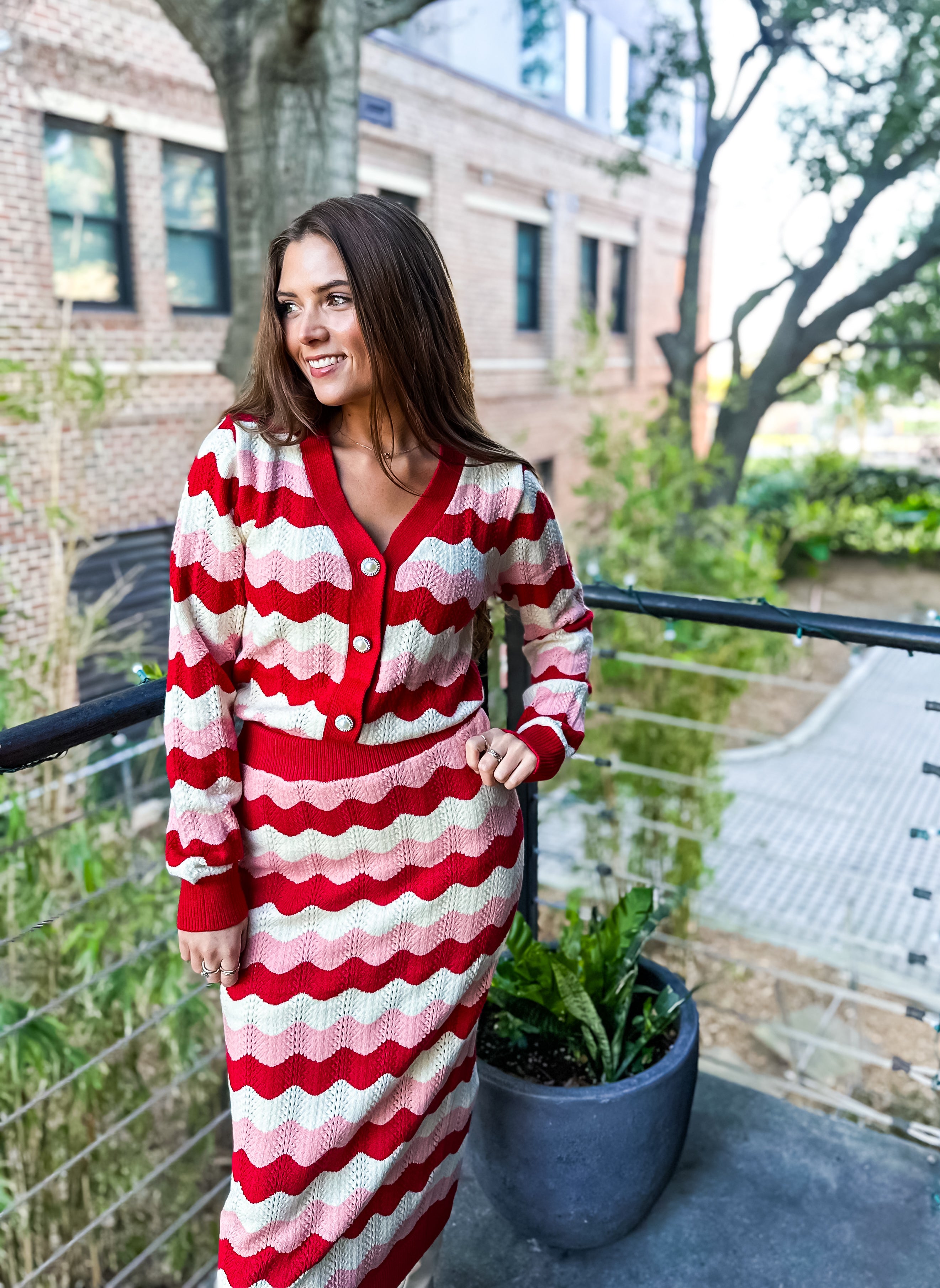 Ric Rac Stripe Sweater Knit Cropped Cardigan + Midi Skirt! We are loving this cardigan set with the midi skirt. It is a knitted material and lightweight. Perfect fit for through out the year - but definitely for the Holidays!
