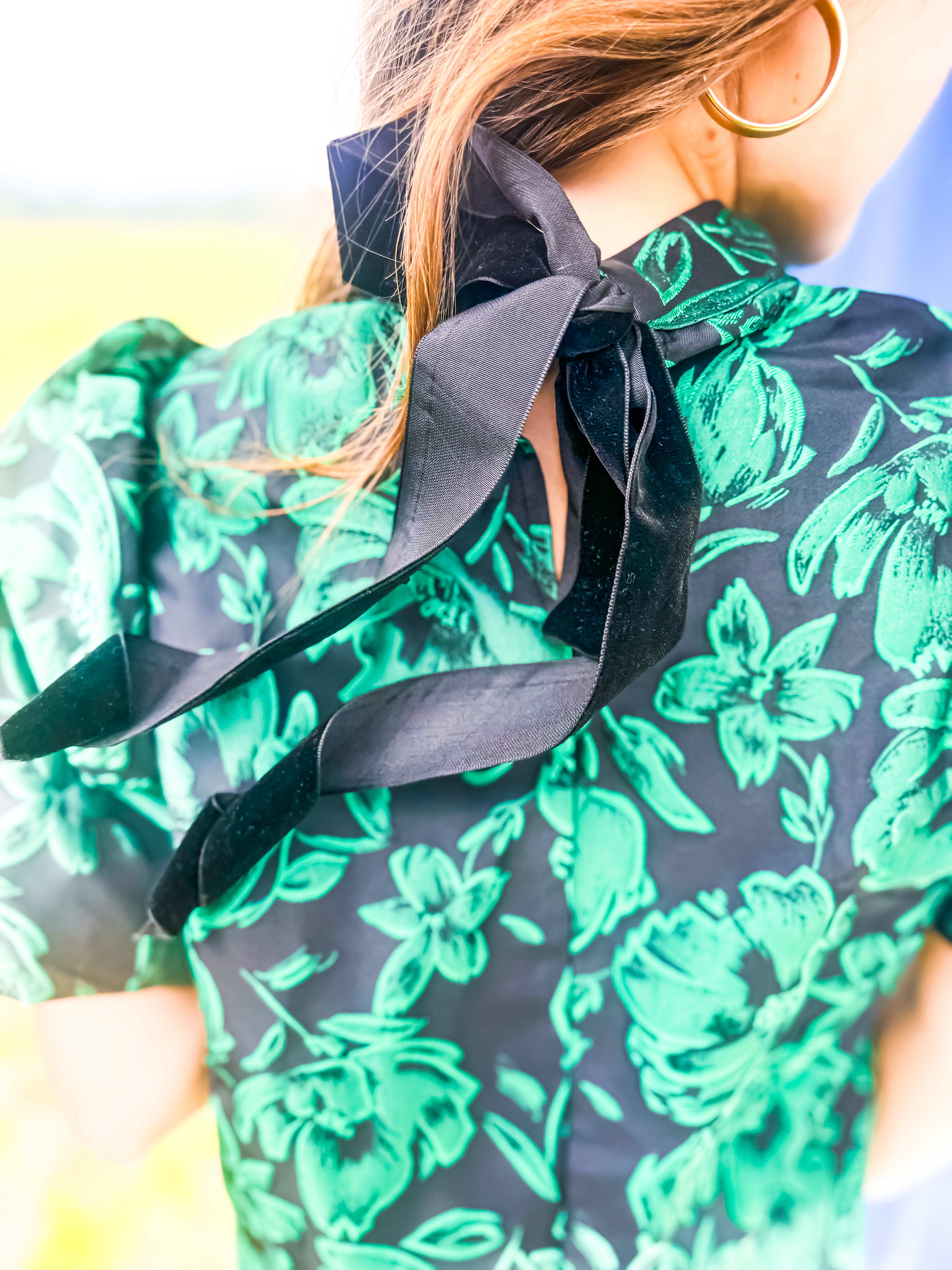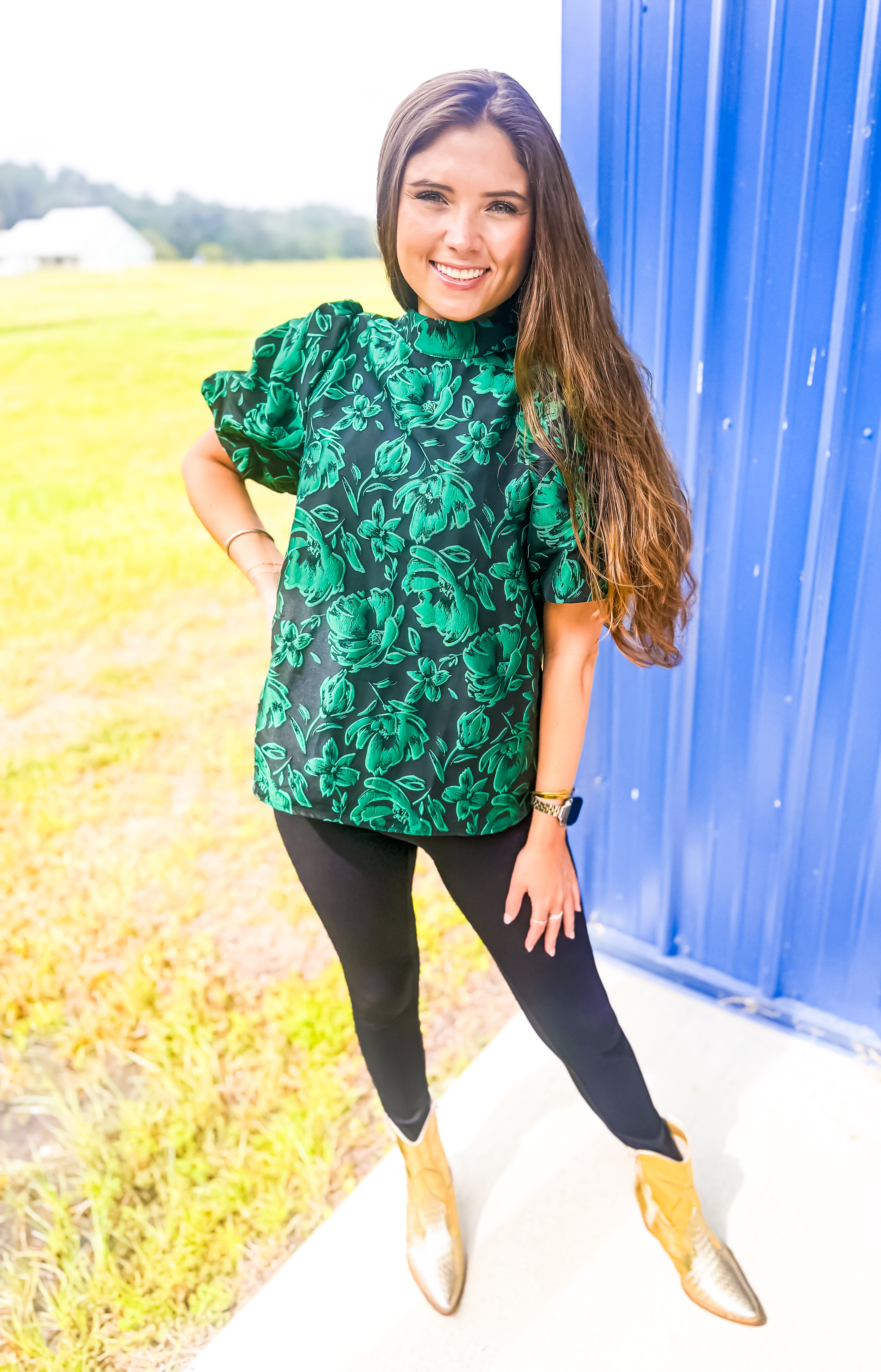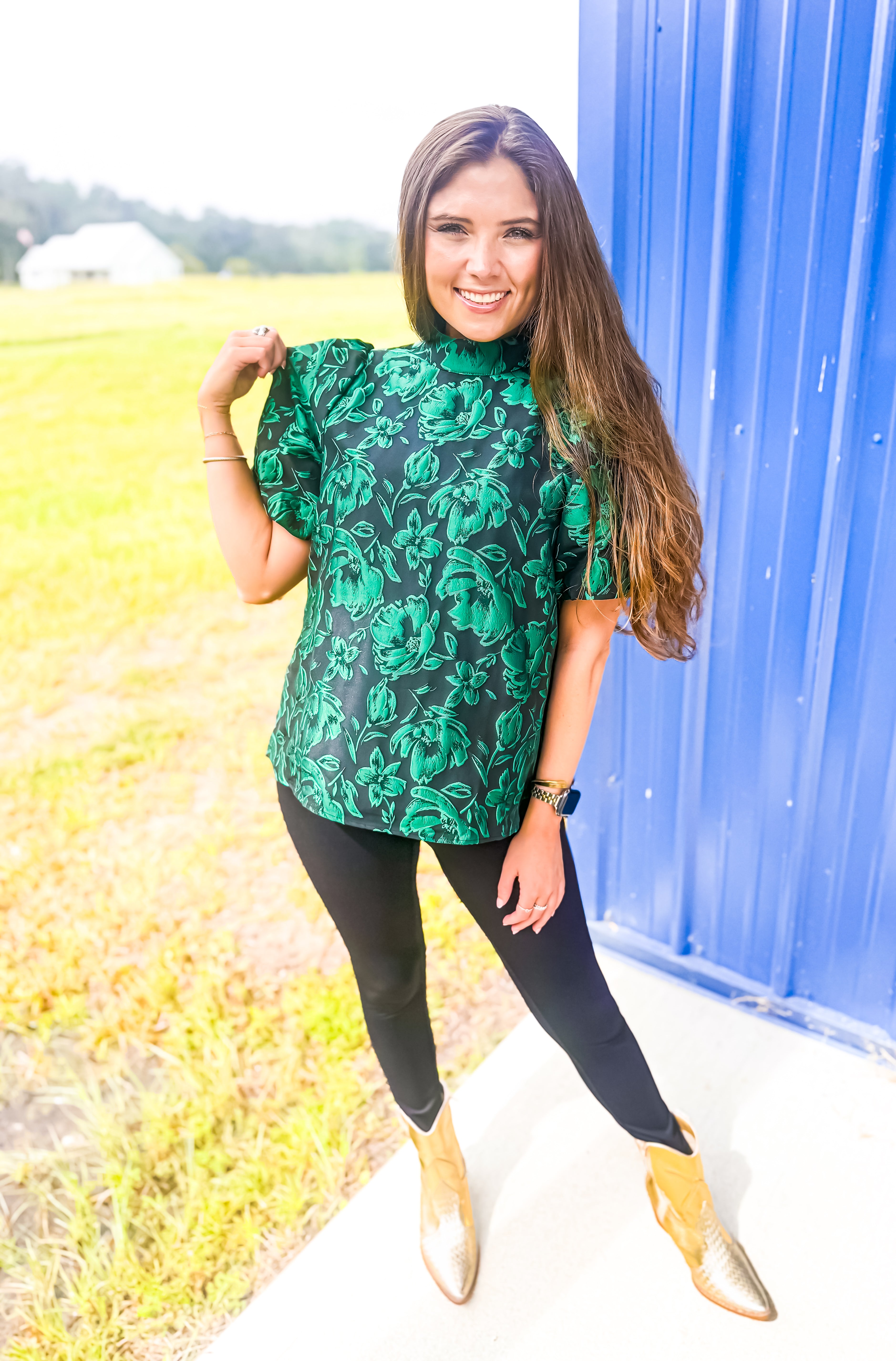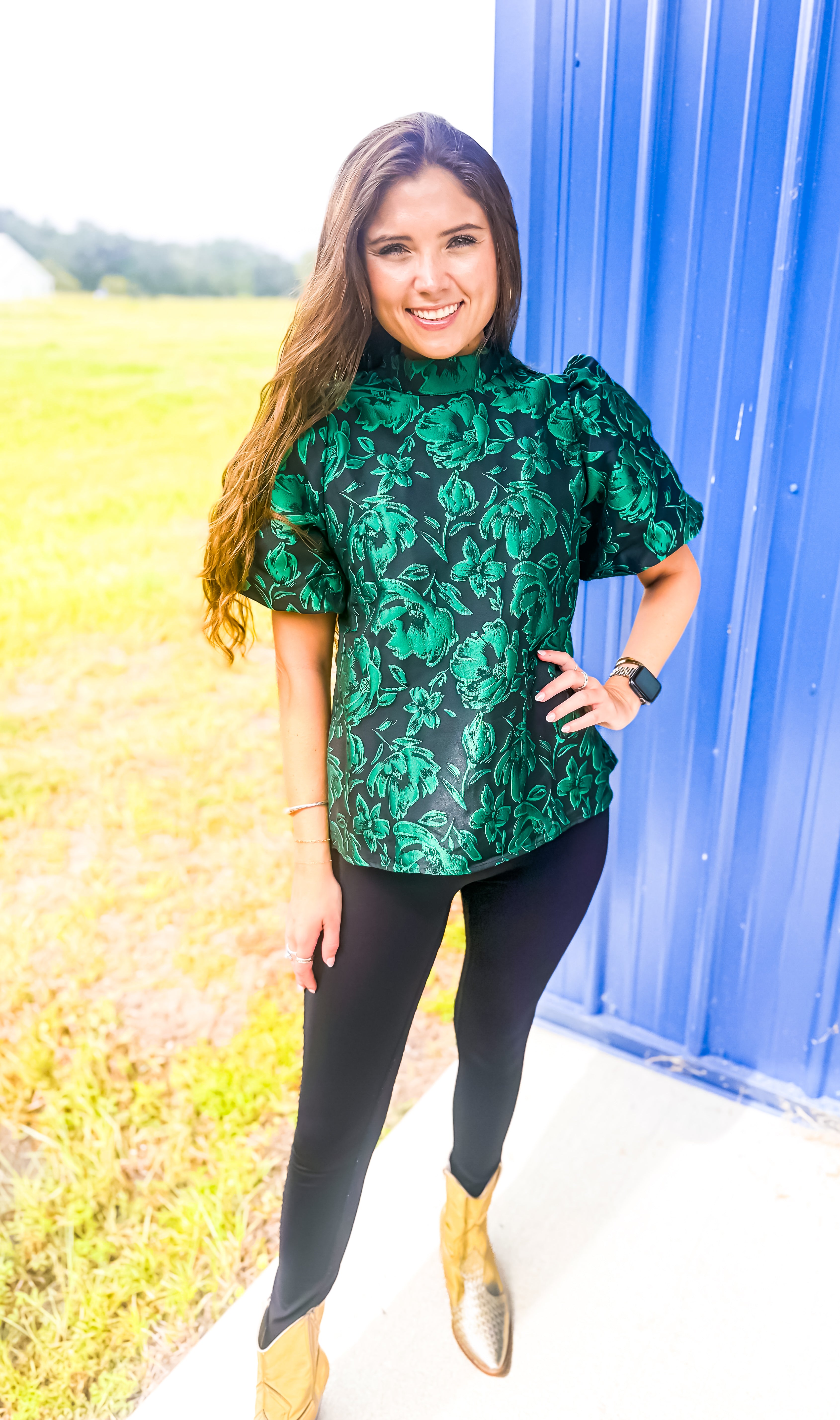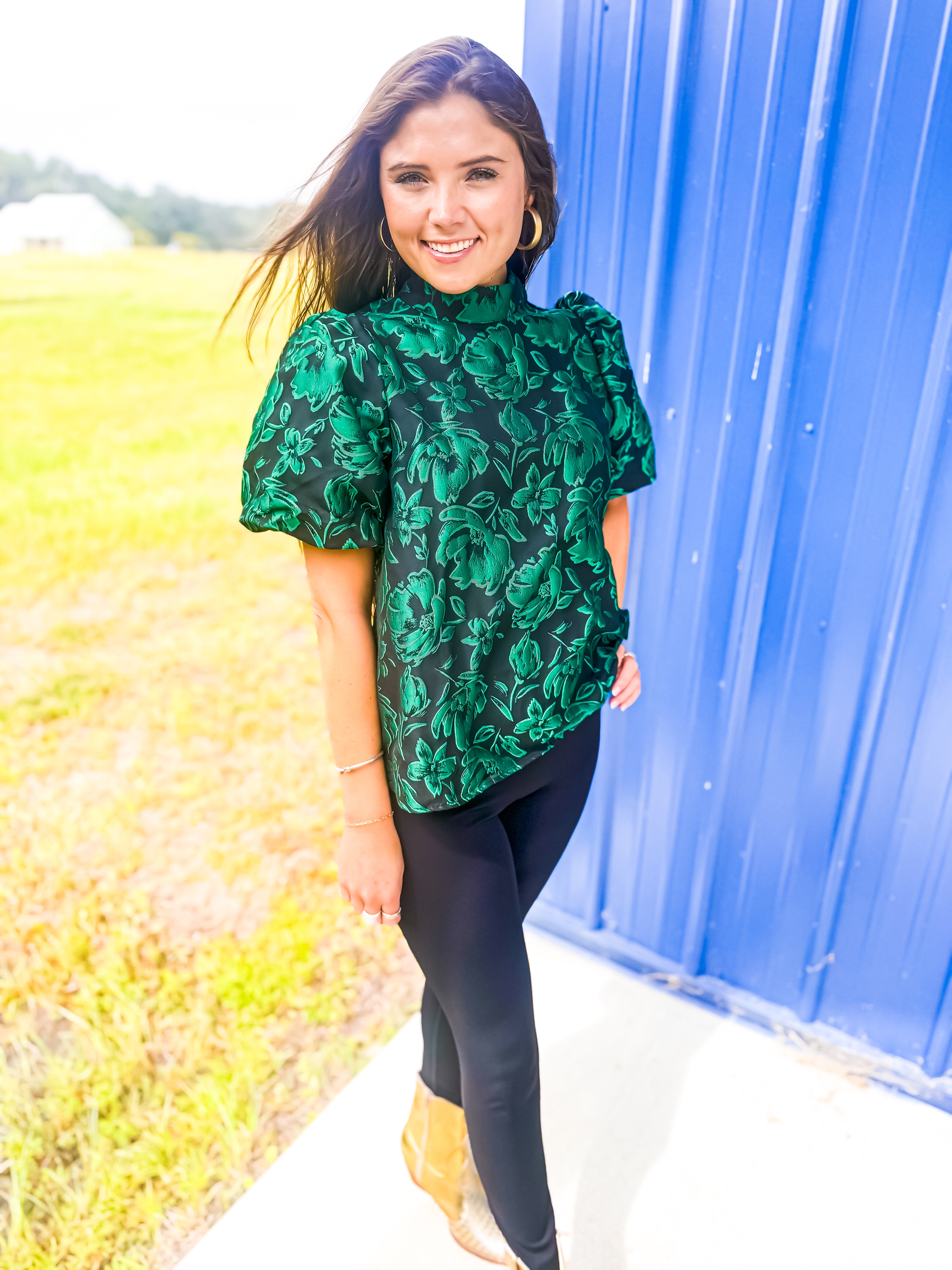 Make a statement this holiday season with our stunning Home For The Holidays Top in Green. Featuring a luxurious, almost embossed floral print in rich emerald hues against a sleek black base, this top exudes elegance. The higher neckline adds a touch of sophistication, while the delicate tie-back detail offers a unique, eye-catching finish. Lightweight and unlined, this top is perfect for layering or wearing on its own. With its true length, it’s an effortlessly chic choice for holiday parties and special occasions.