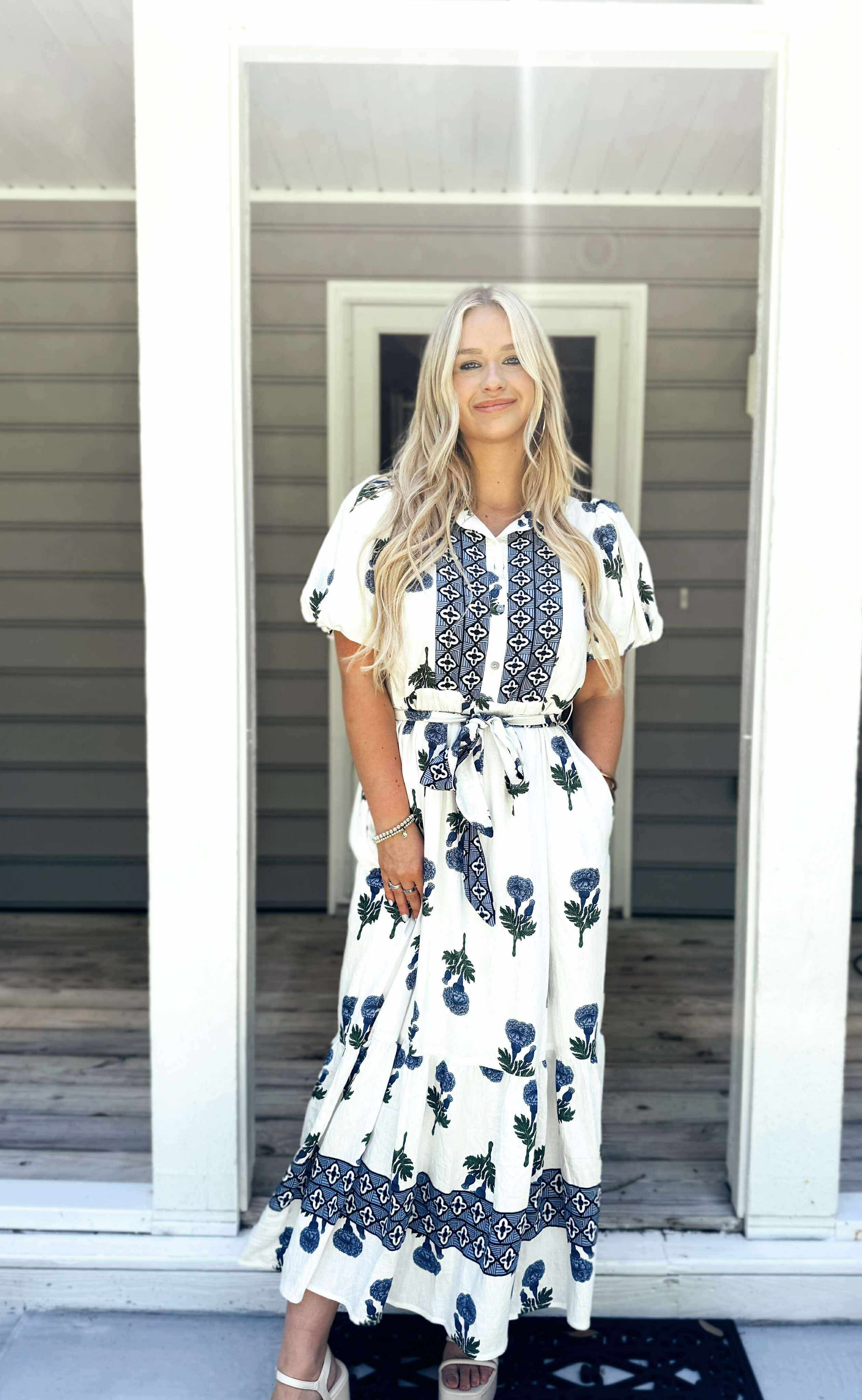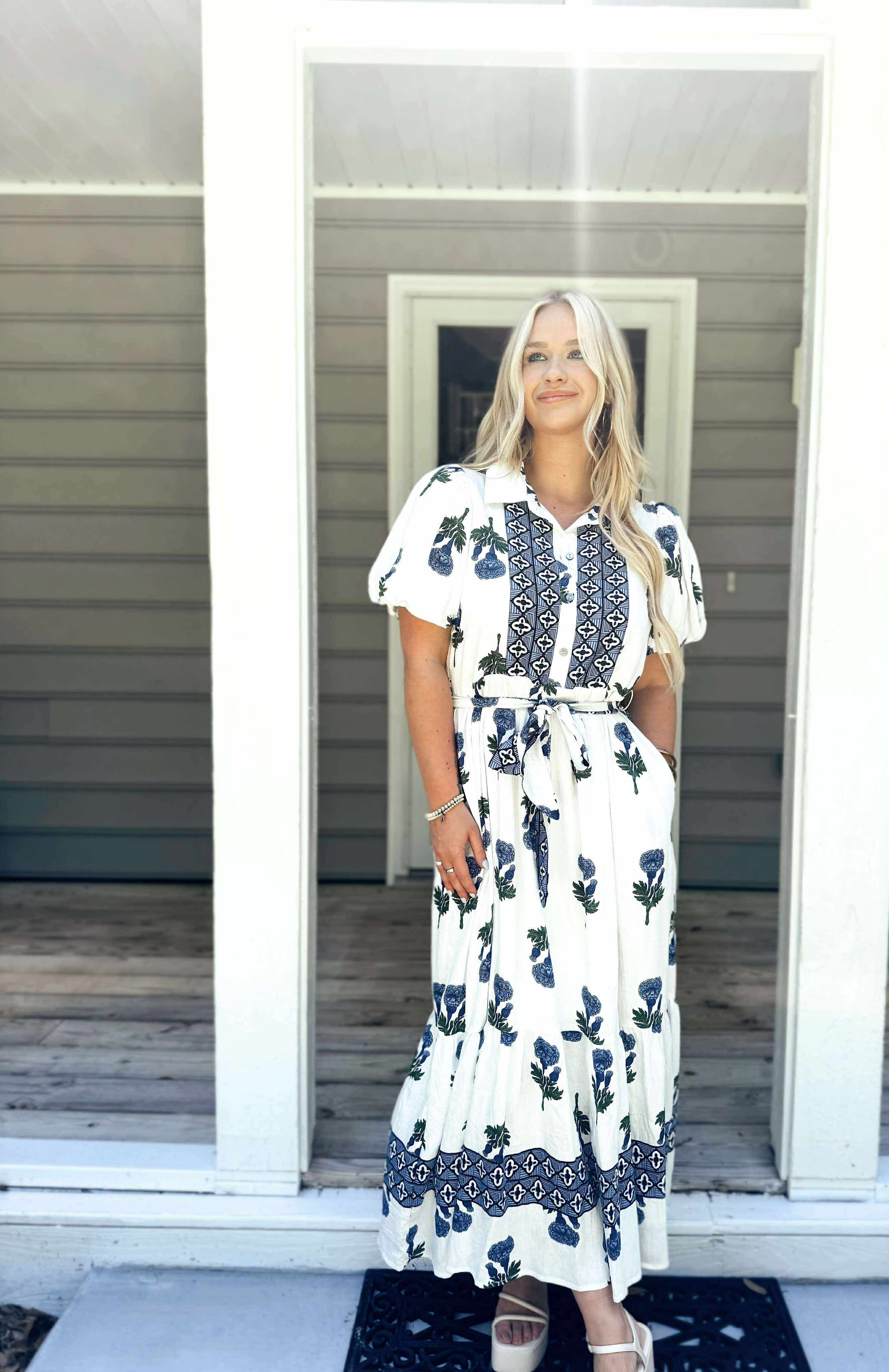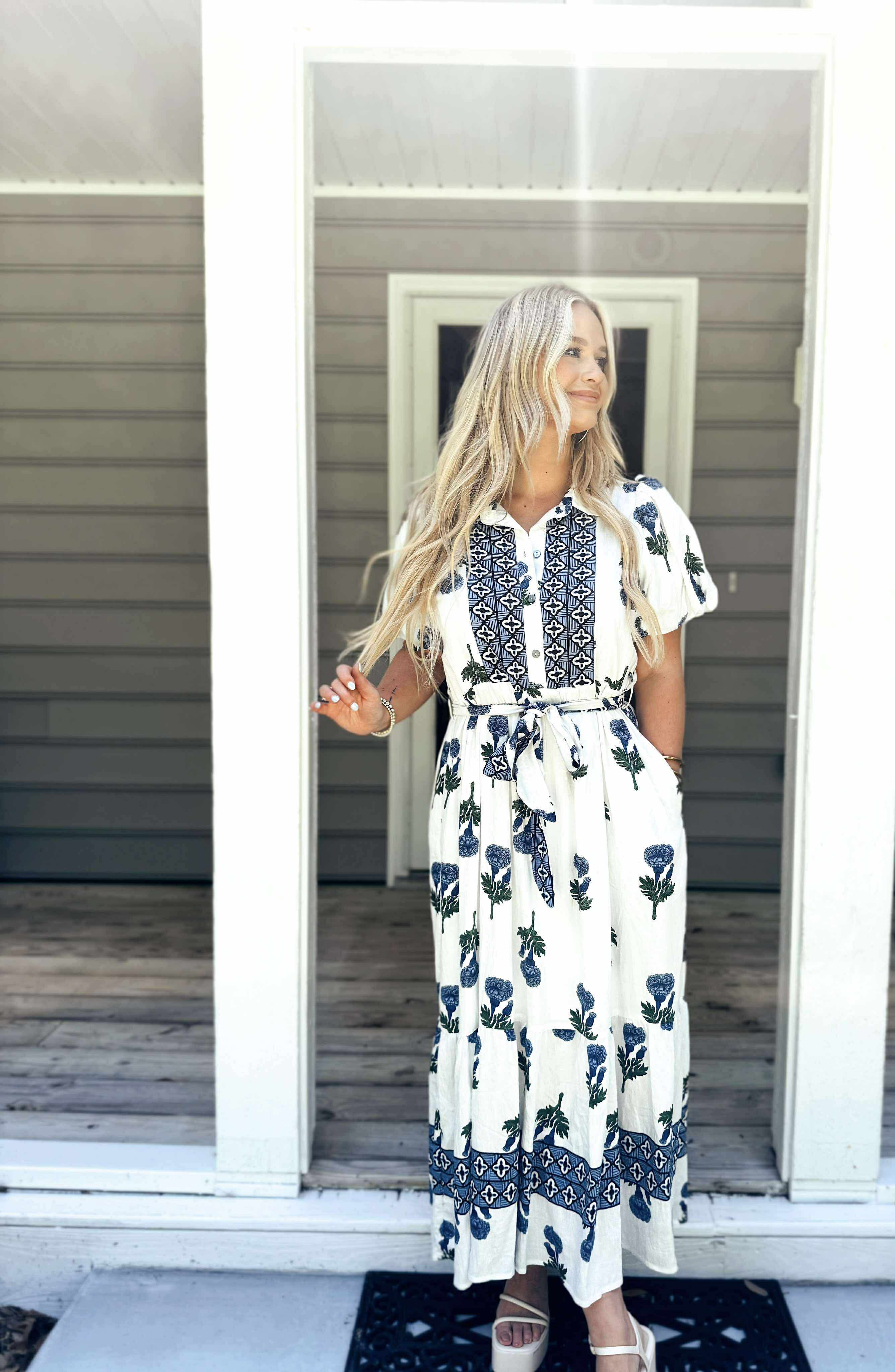 poof sleeve, hydrangea print, tie belt, pockets, lined, lightweight, button collar detail.