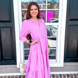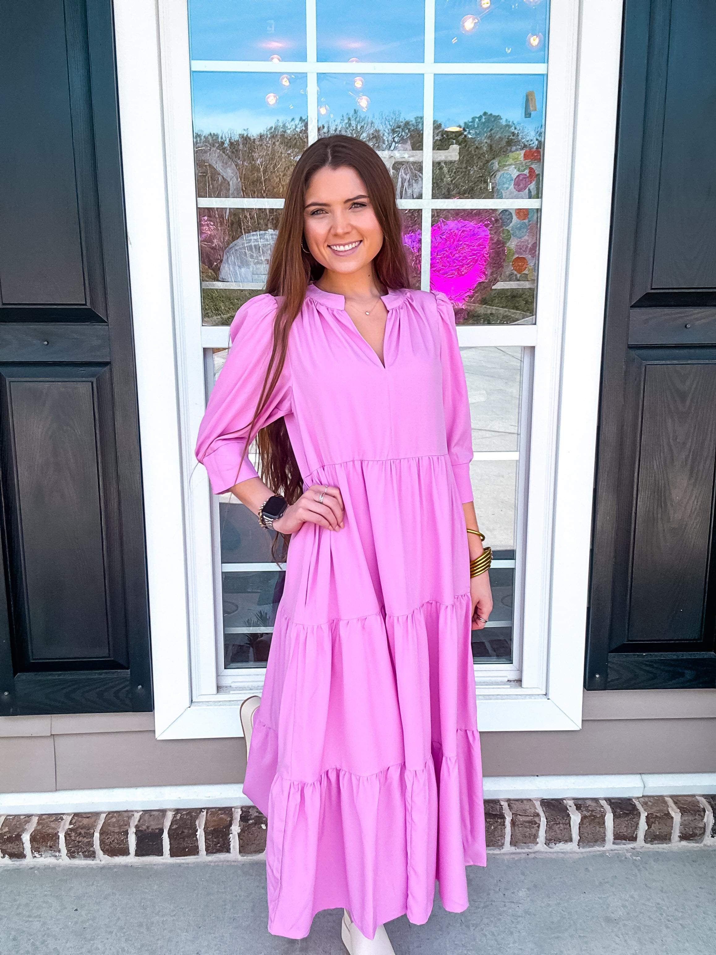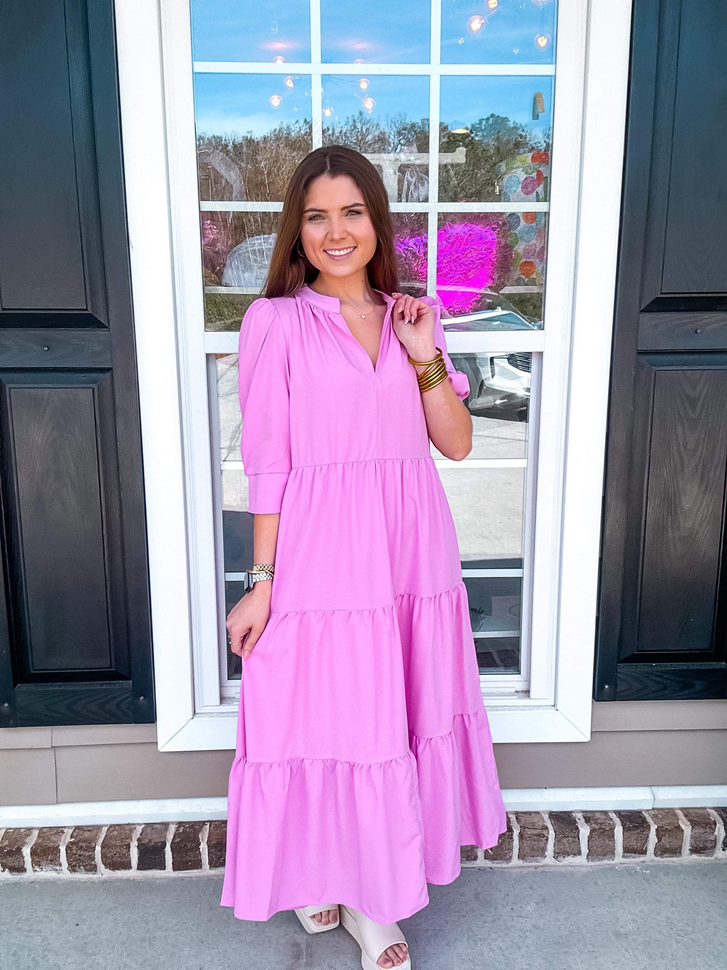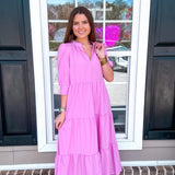 Solid v-neck 3/4 sleeve tiered midi dress featuring pockets at side. Lined. Woven. Non-sheer. Lightweight.