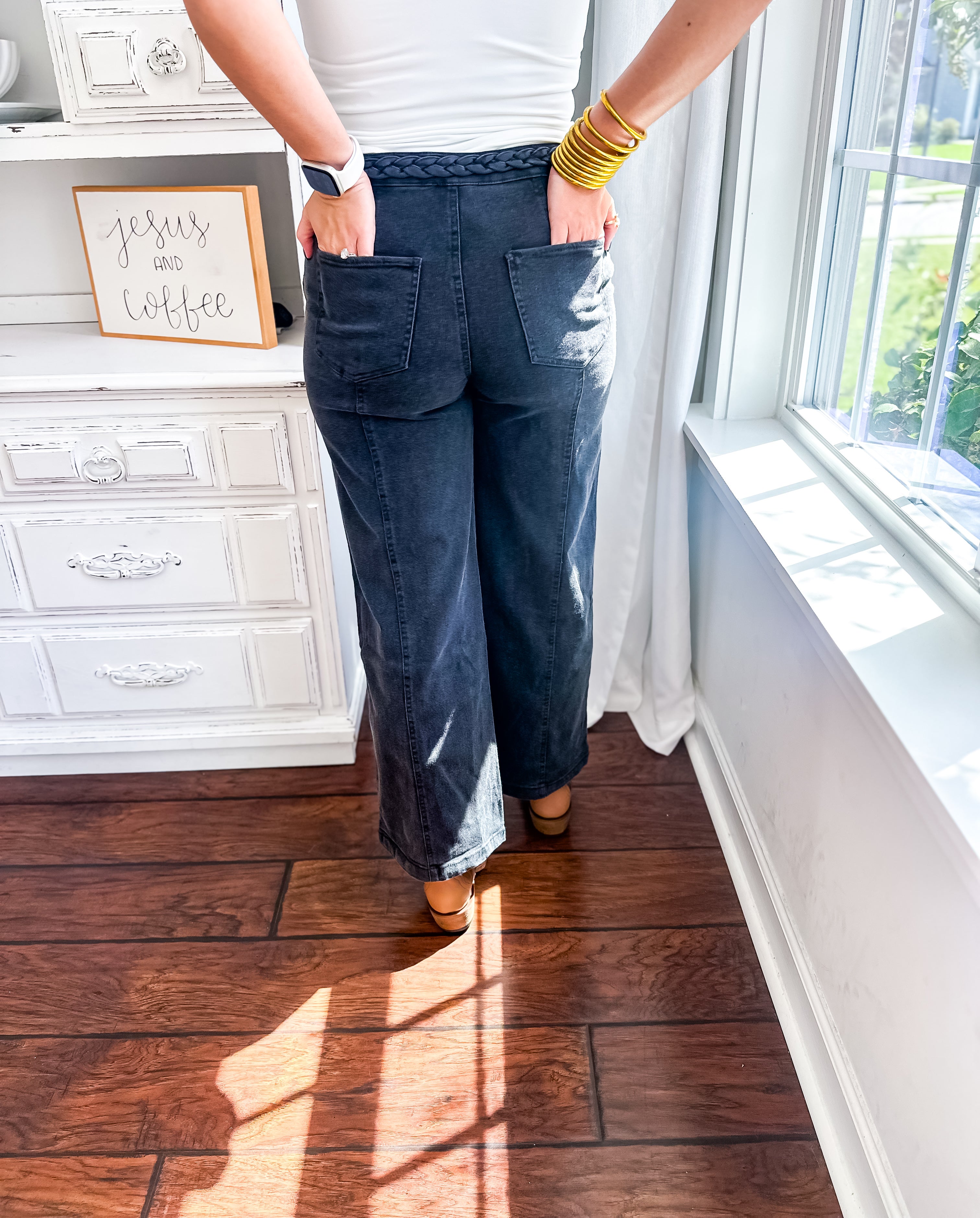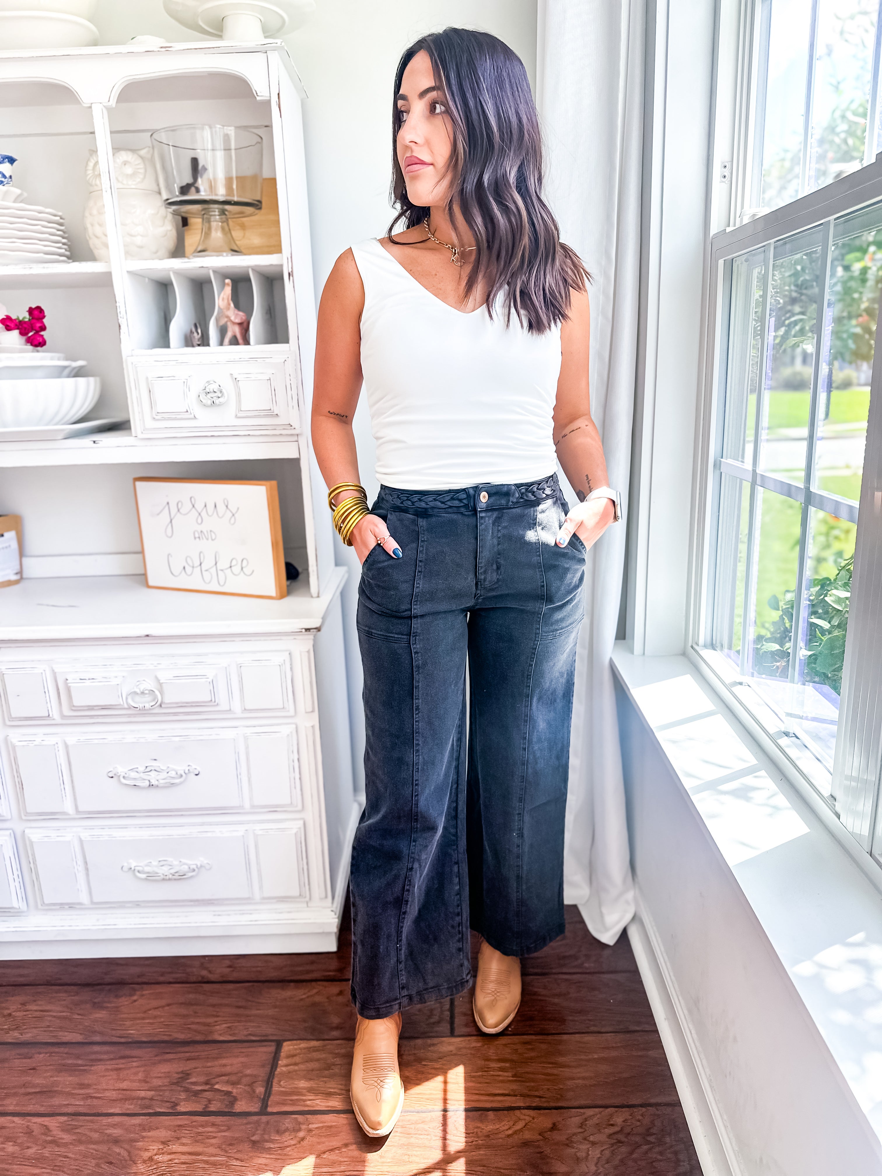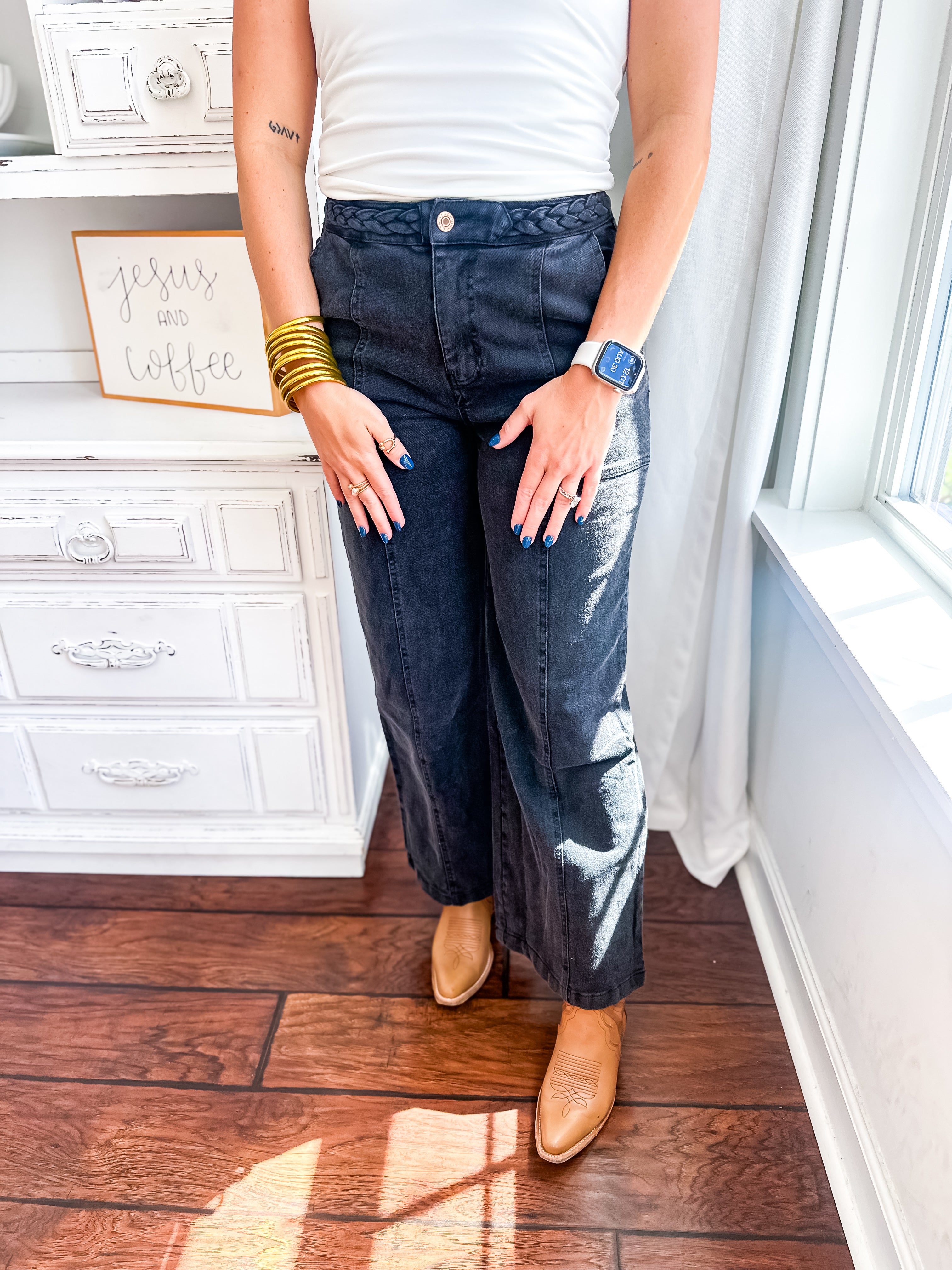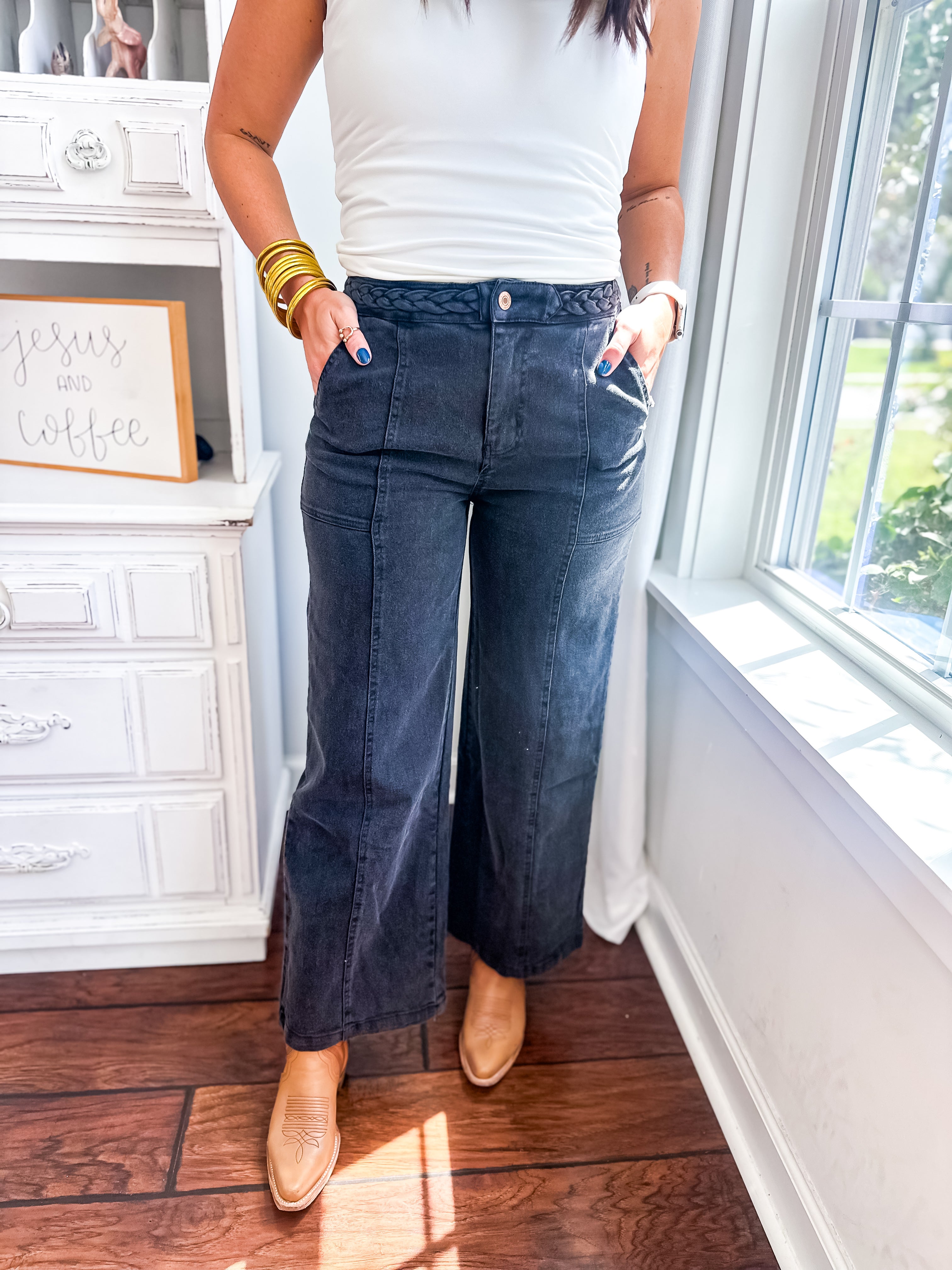 Solid high waisted wide leg bottoms featuring braided detail at waist. Button and zippper closure. Unlined. Woven. Non-sheer. Lightweight.