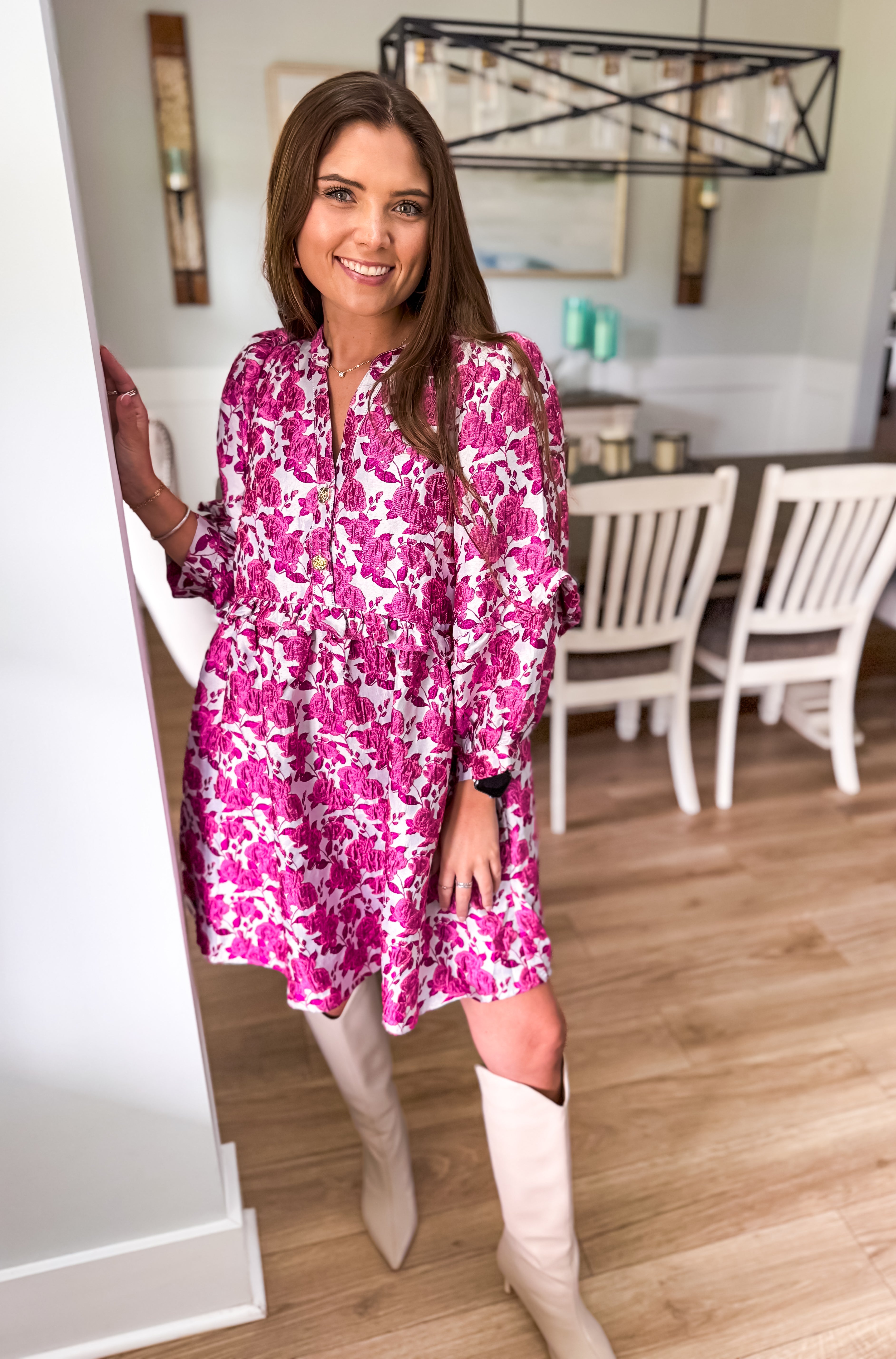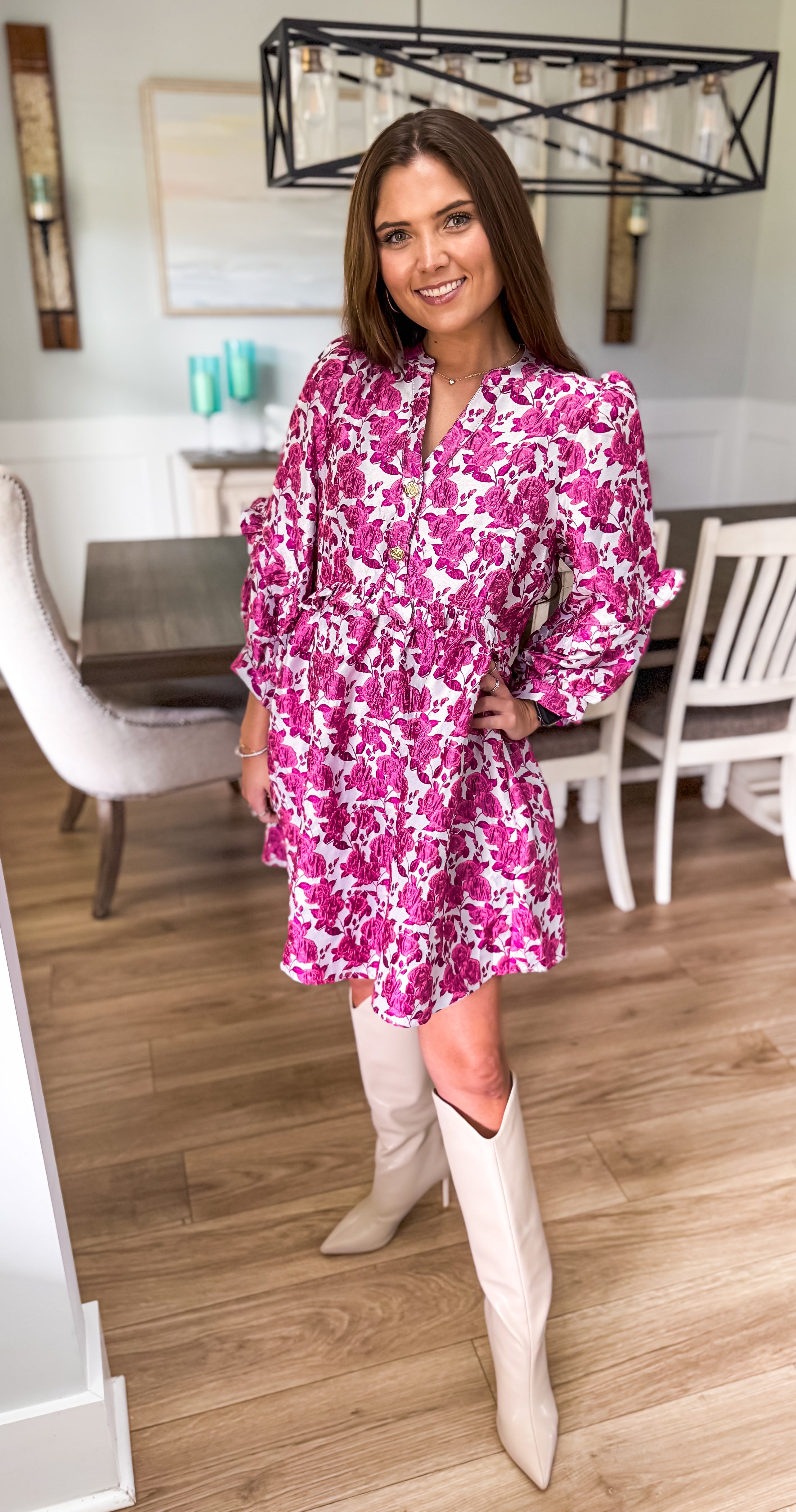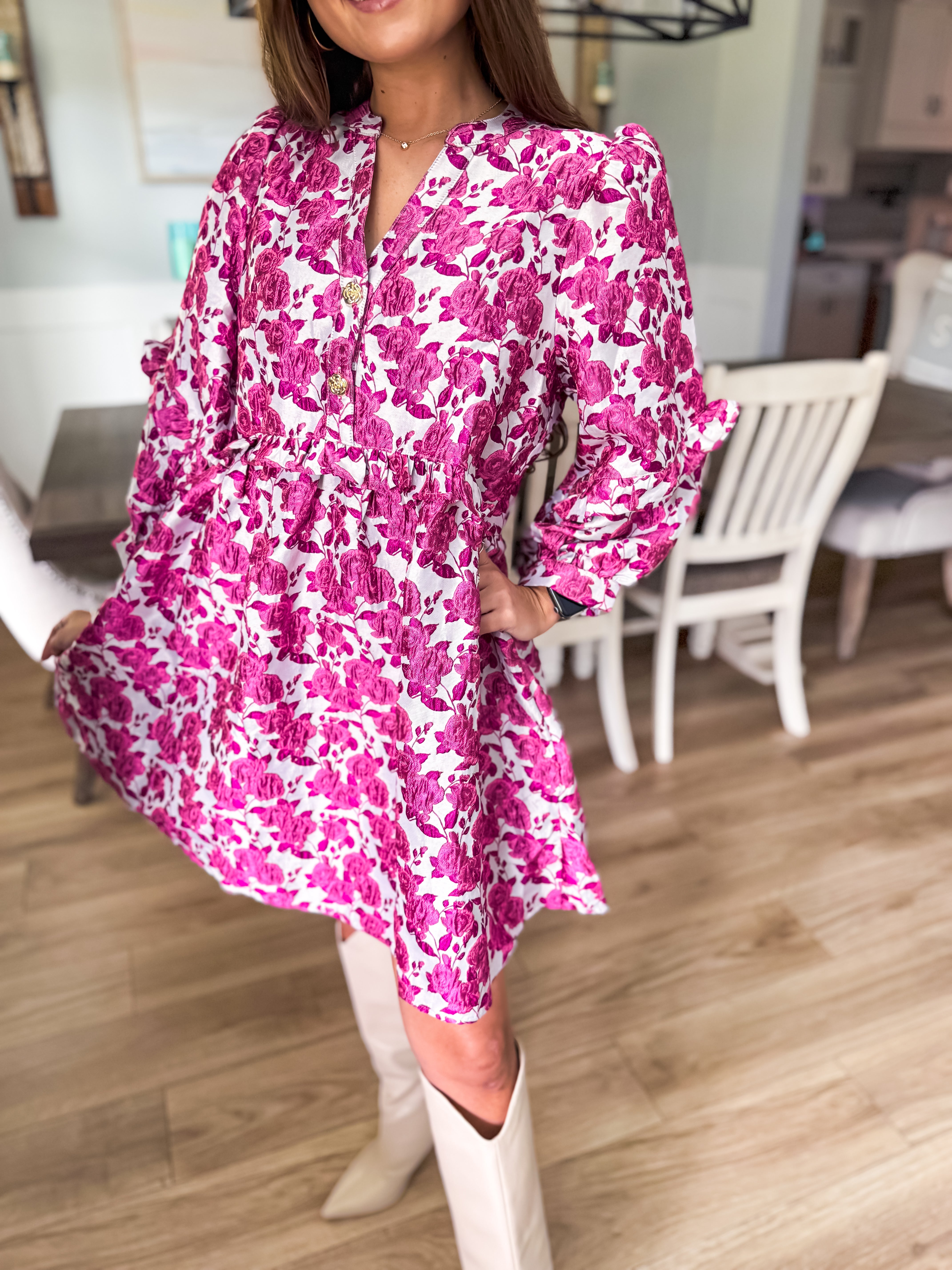Floral jacquard pullover mini dress featuring ruffle inset 3/4 sleeve button closure cuff. Half button front closure detailed with embellished floral buttons. Pockets at side. Unlined. Woven. Non-sheer. Midweight.