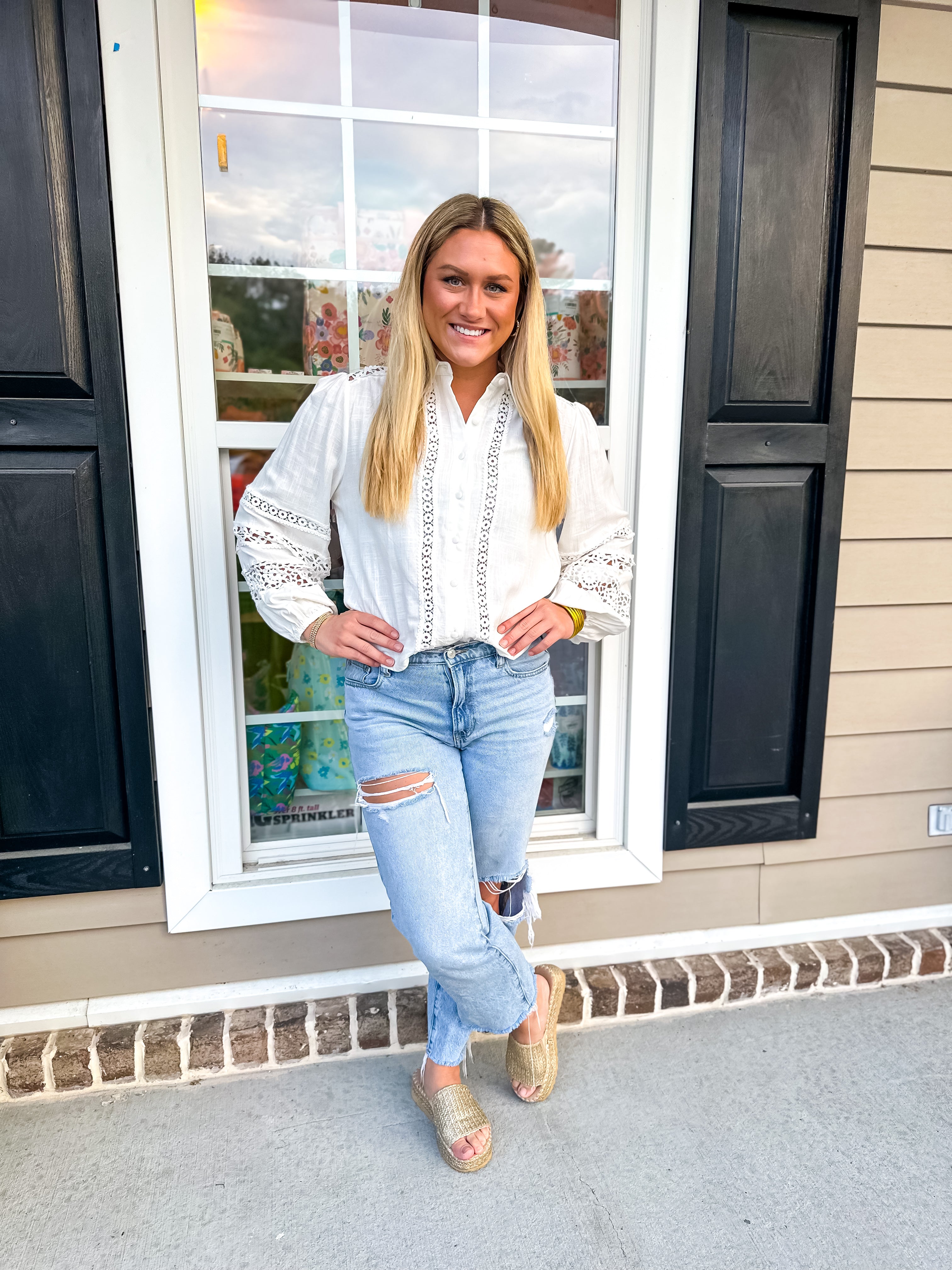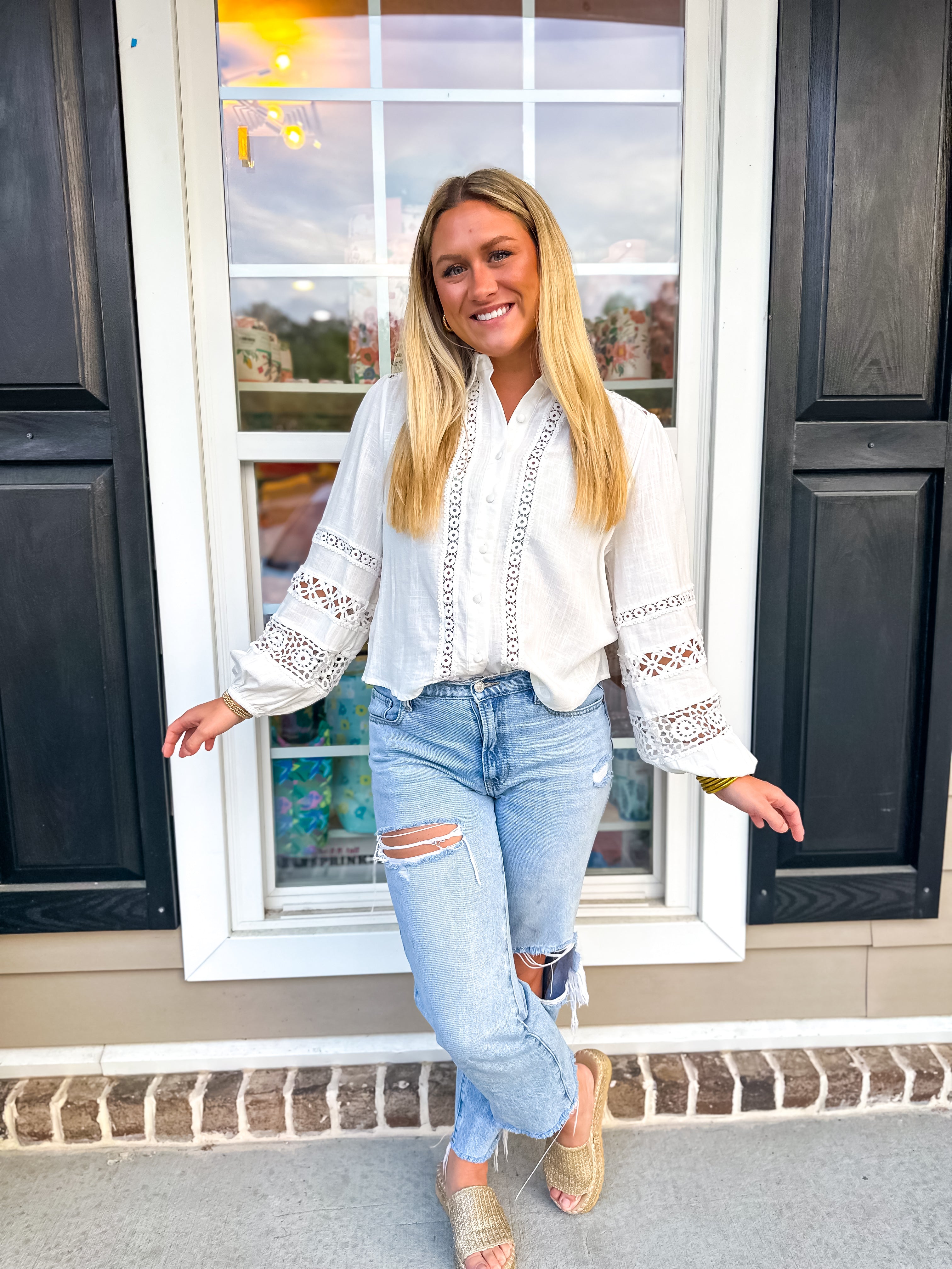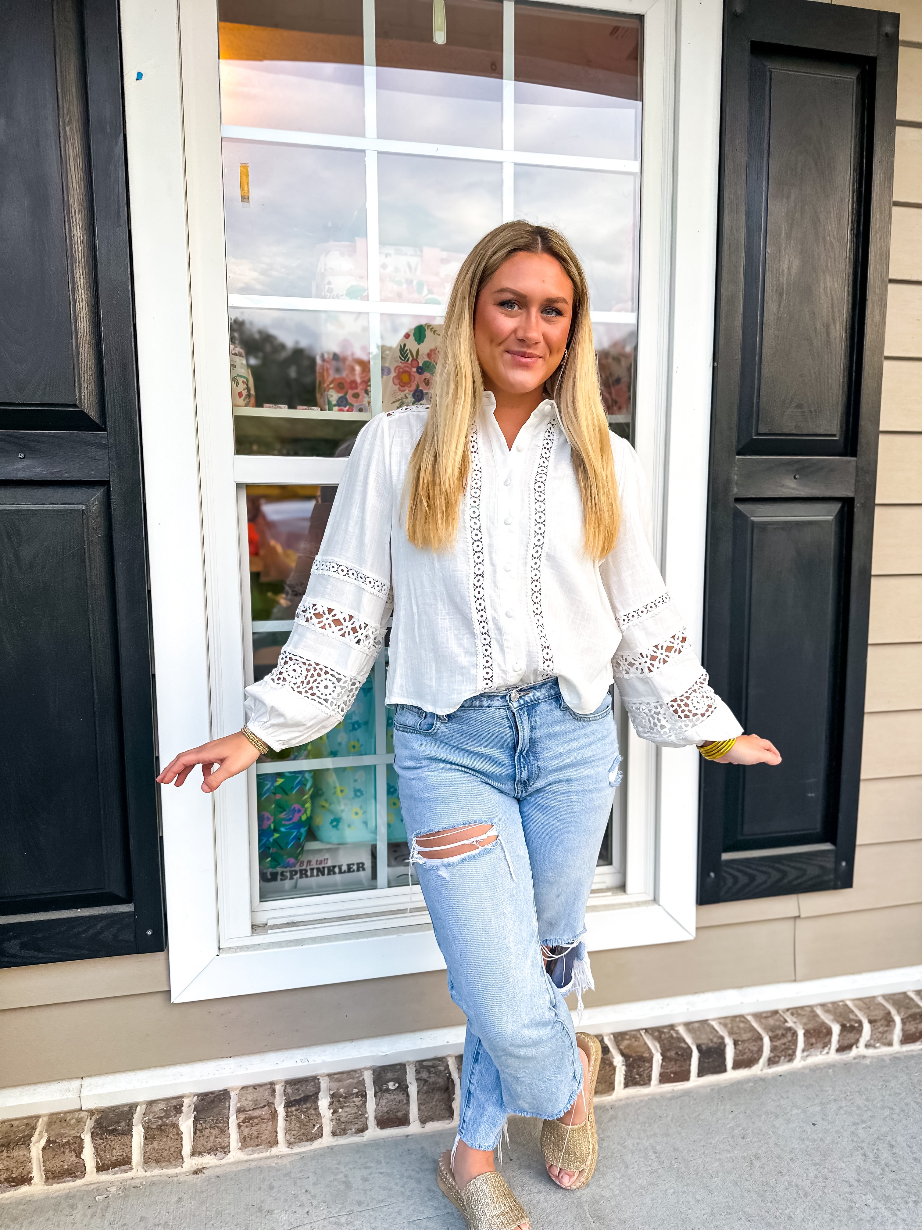 See-through crochet trim button-down collared shirt with elasticated balloon sleeves.