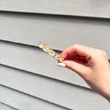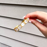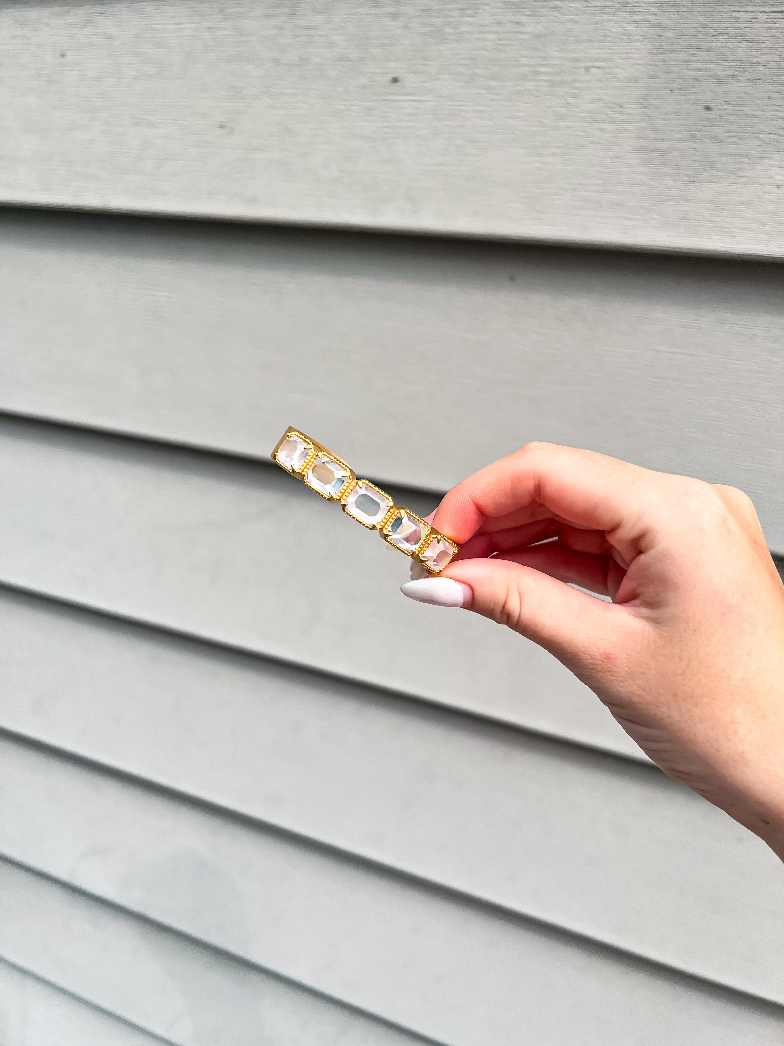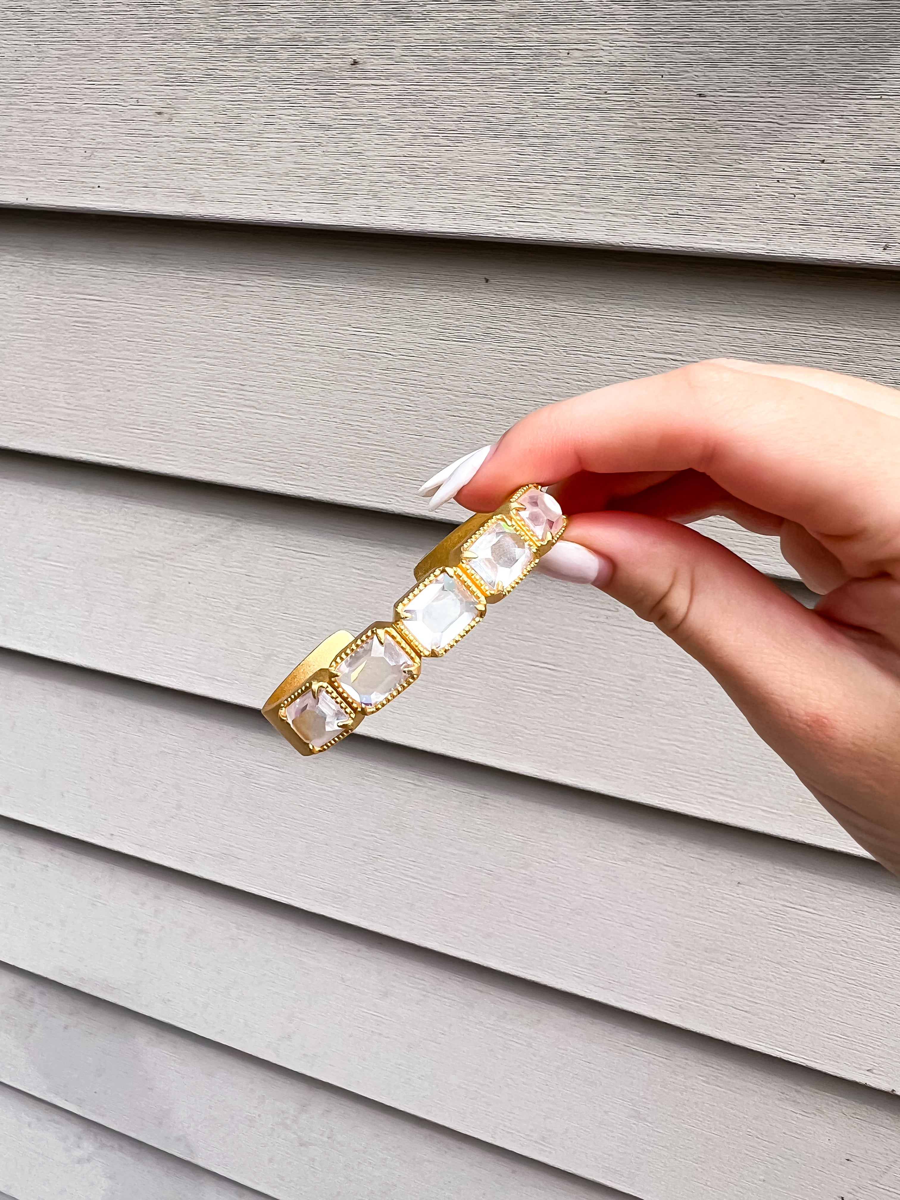 We are obsessed with this new cuff! It features 5 stones available in. It is beautiful to wear alone, or you can stack it with our new larger Millie Cuff.