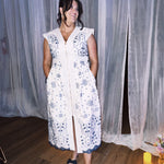 Embroidered cap sleeve midi dress featuring front zipper closure and pintuck detail at neckline and waist. Side pockets. Lined. Woven. Non-sheer. Lightweight.