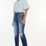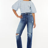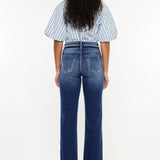 These high-rise slim straight jeans in a dark wash are designed for both style and comfort. The stretchy fabric ensures a flattering fit, while the released hem adds a trendy twist. Featuring a classic 4-pocket style and a zipper fly, these jeans are versatile enough for any occasion. Pair them with a tucked-in top for a polished look or a casual tee for a relaxed vibe.