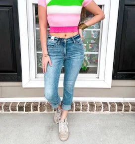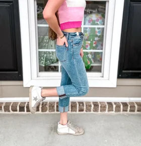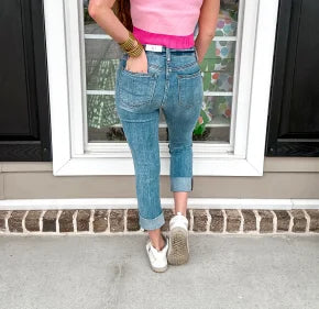 Judy Blue medium wash skinny capri jeans. These are the denim of the century and the wash of the jean is great for everyday wear. The cuff at the end can be rolled more or unrolled for a longer length.