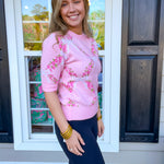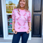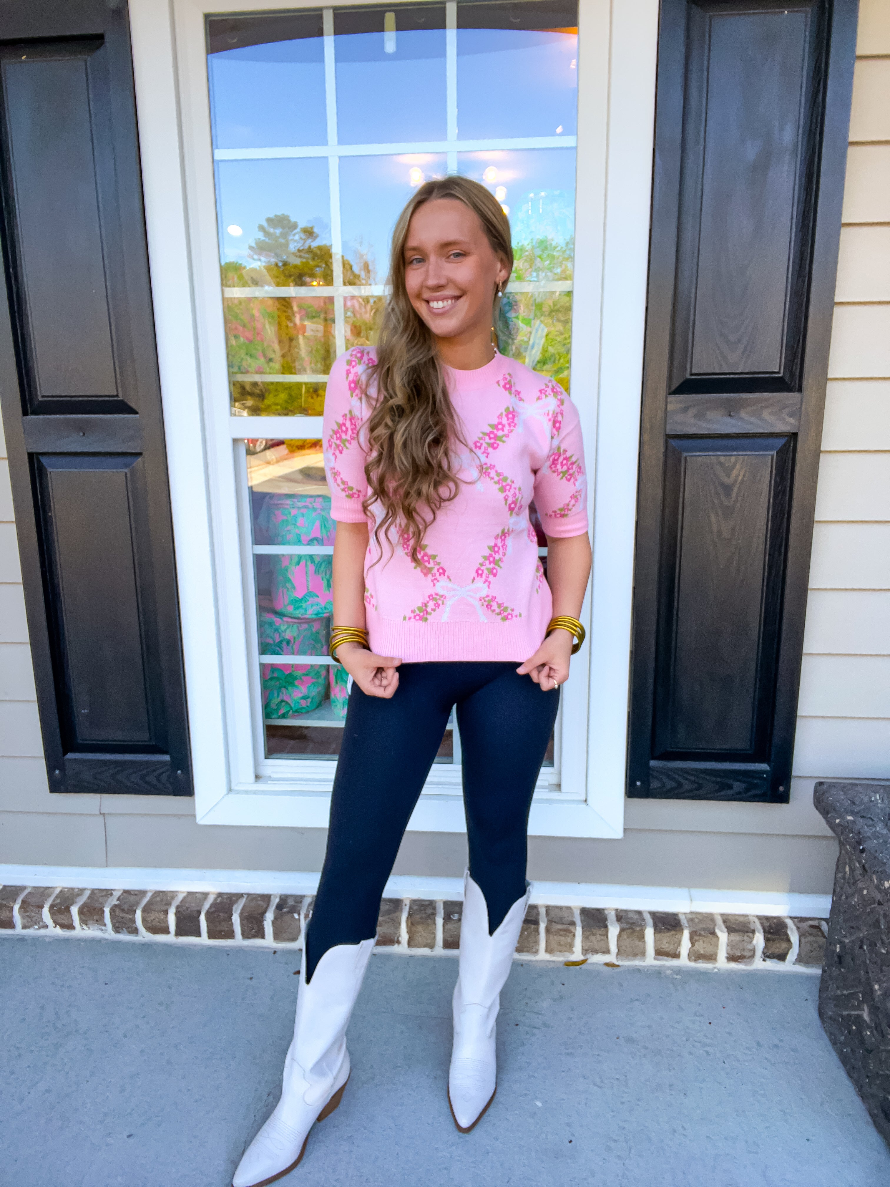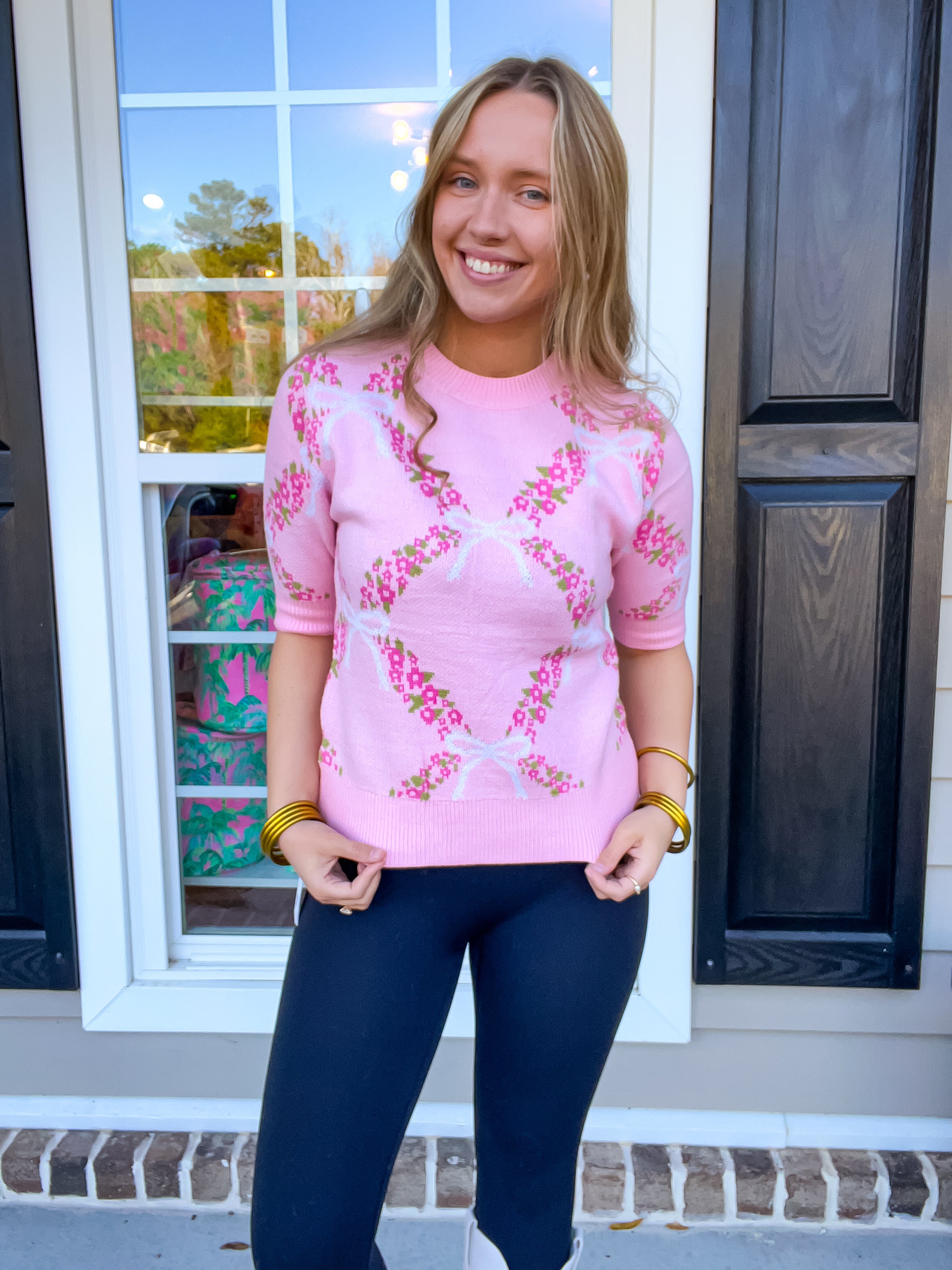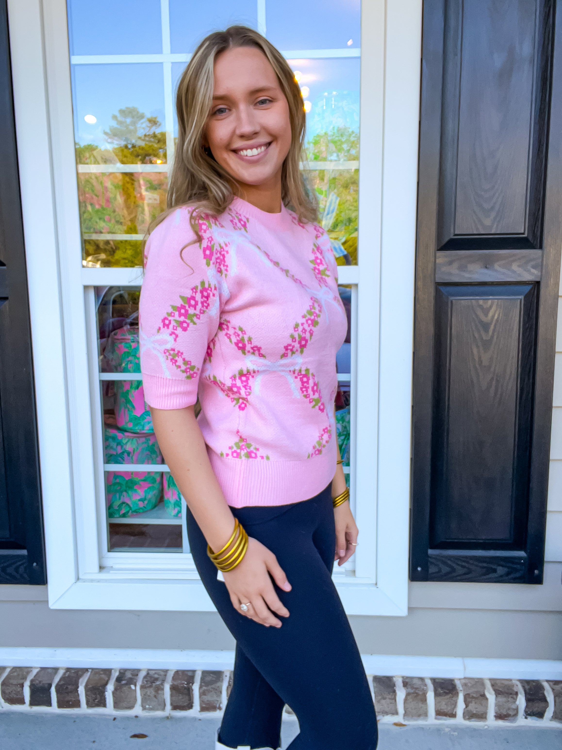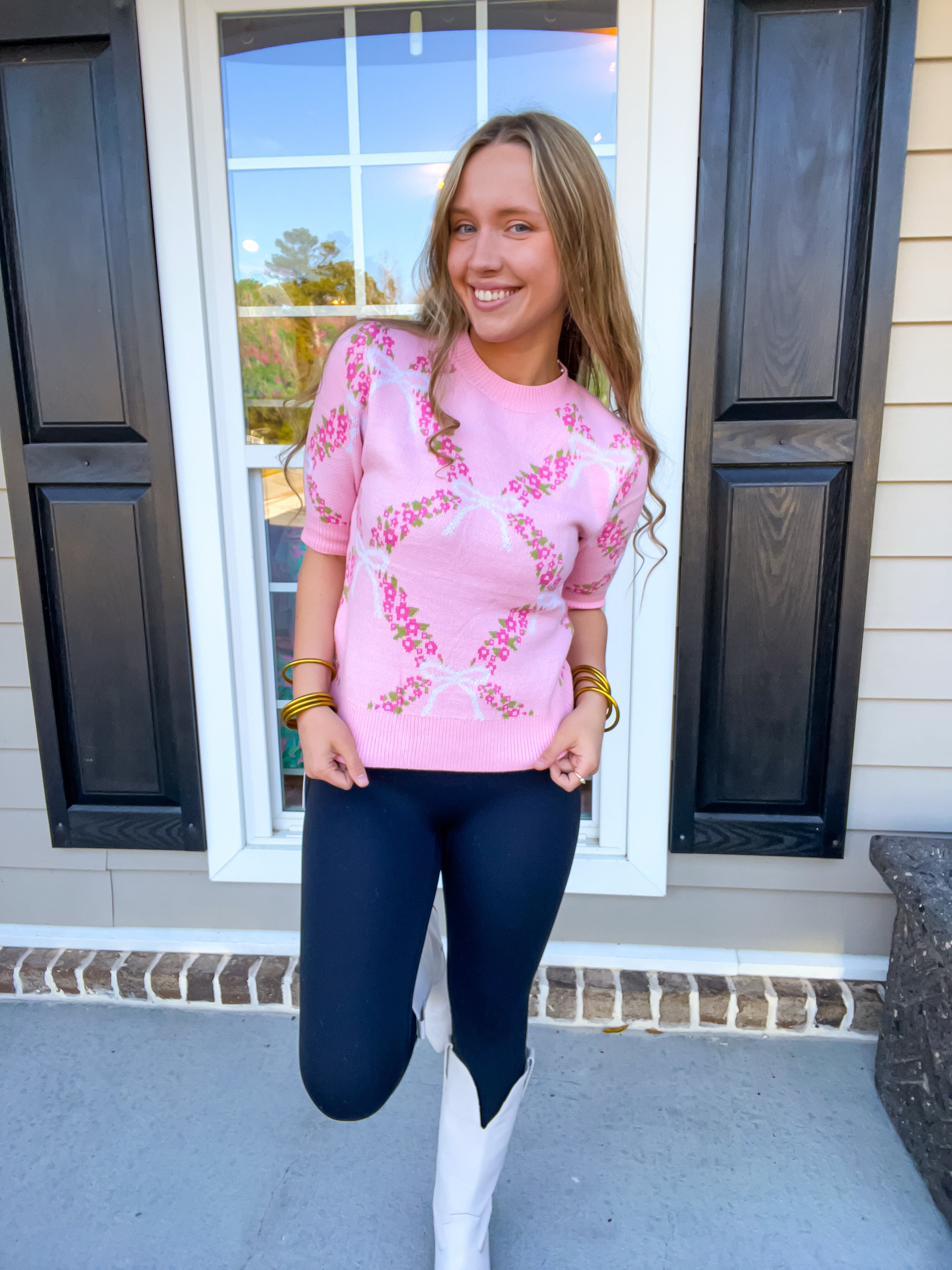 Short Sleeve Sweater Knit Top With Floral Ribbon