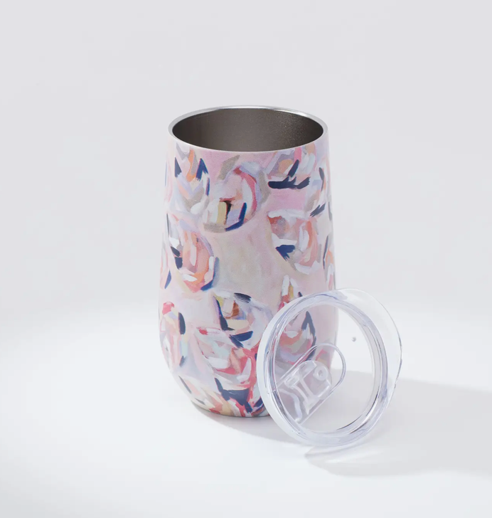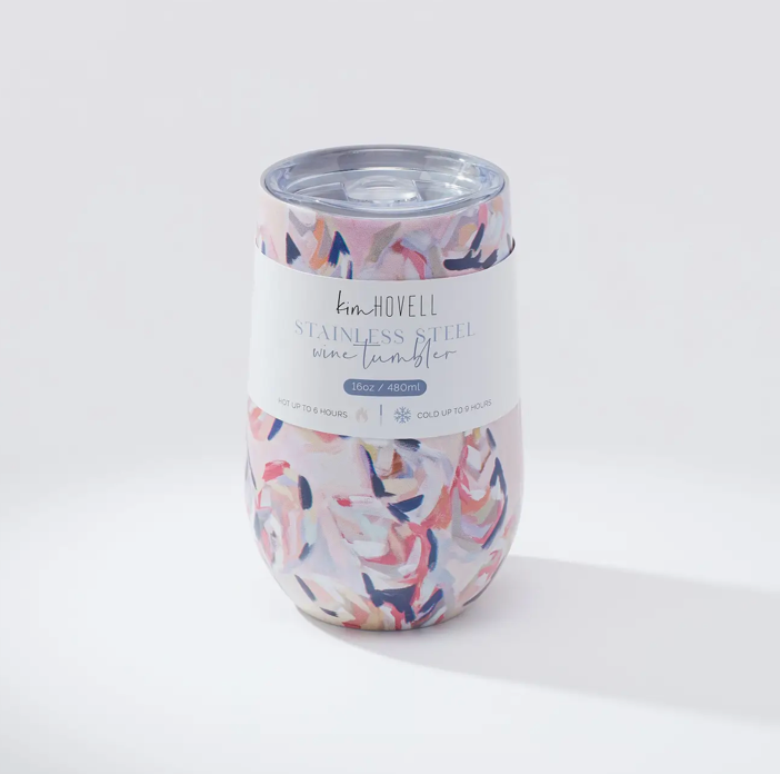 Kim Hovell Original Artwork: Peach Gems This 16oz Wine Tumbler features a stainless steel construction and sliding lid, providing durability and heat retention for your favorite beverages. Keep your drink of choice at the perfect temperature while enjoying the beautiful Peach Gems design. Perfect for all your outdoor or indoor occasions