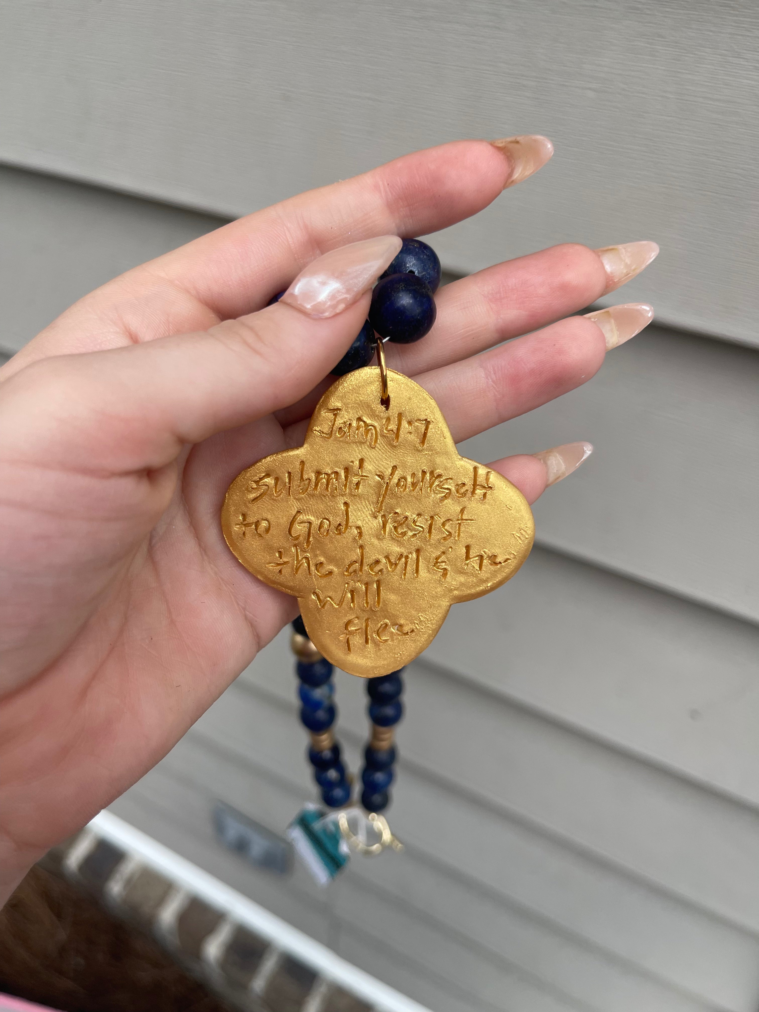 The brilliant blue of the lapis lazuli stone has been loved by all for centuries! Clothe yourself with this royal color and claim the powerful promise of God hidden on the back: Submit to God above all and resist the enemy's schemes aimed to harm your thoughts--and they must flee! Remember you are in a battle you cannot see, but with God you will be victorious!