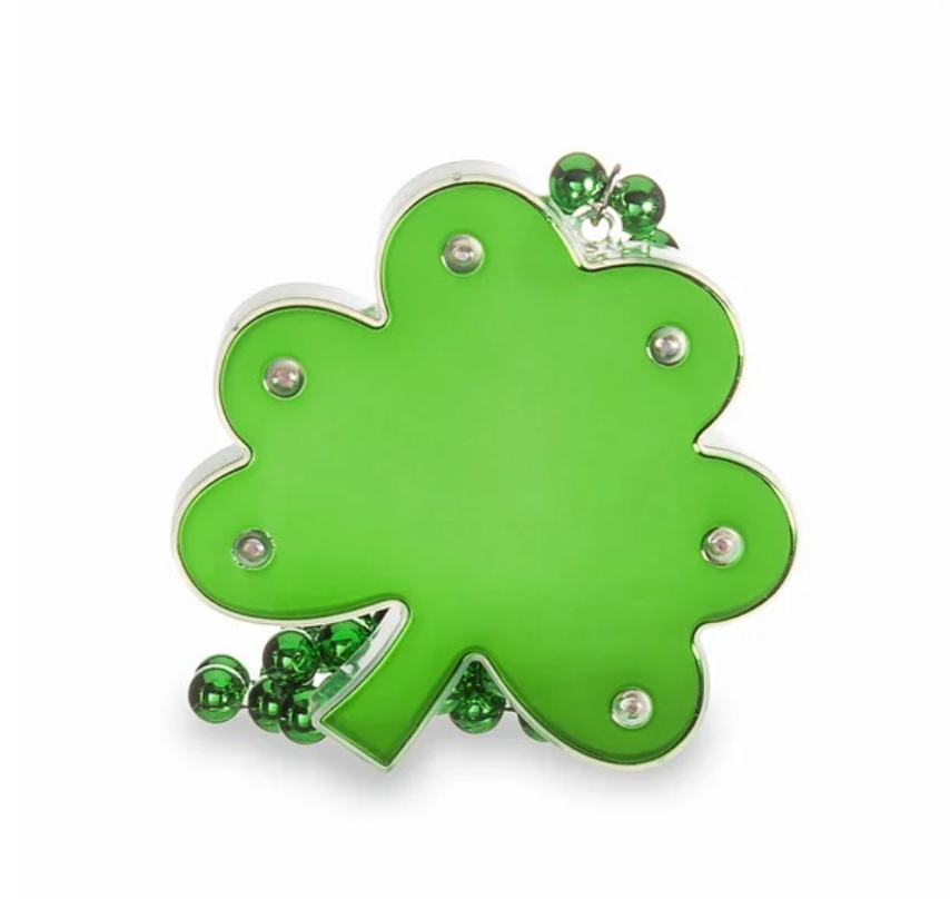 You will have the luck of the Irish wearing this light-up, oversized LED Shamrock Bead Necklace. Bright green LED lights dance on the reflective metallic green surface of the giant, surprisingly thick shamrock medallion. Have fun with four (4) distinct light modes (off/on, steady flash, fast flash, and slow flash) with the simple push of a button on the back. Each enormous 4.5" x 4.75" green light-up shamrock comes hanging from a 33" long string of green plastic party beads, and (3) replaceable AG13 batteries are conveniently included and installed. This costume jewelry accessory is perfect for pub crawls on St. Patrick's Day, celebrating Irish pride, theme parties, and if you just want to exude luck.