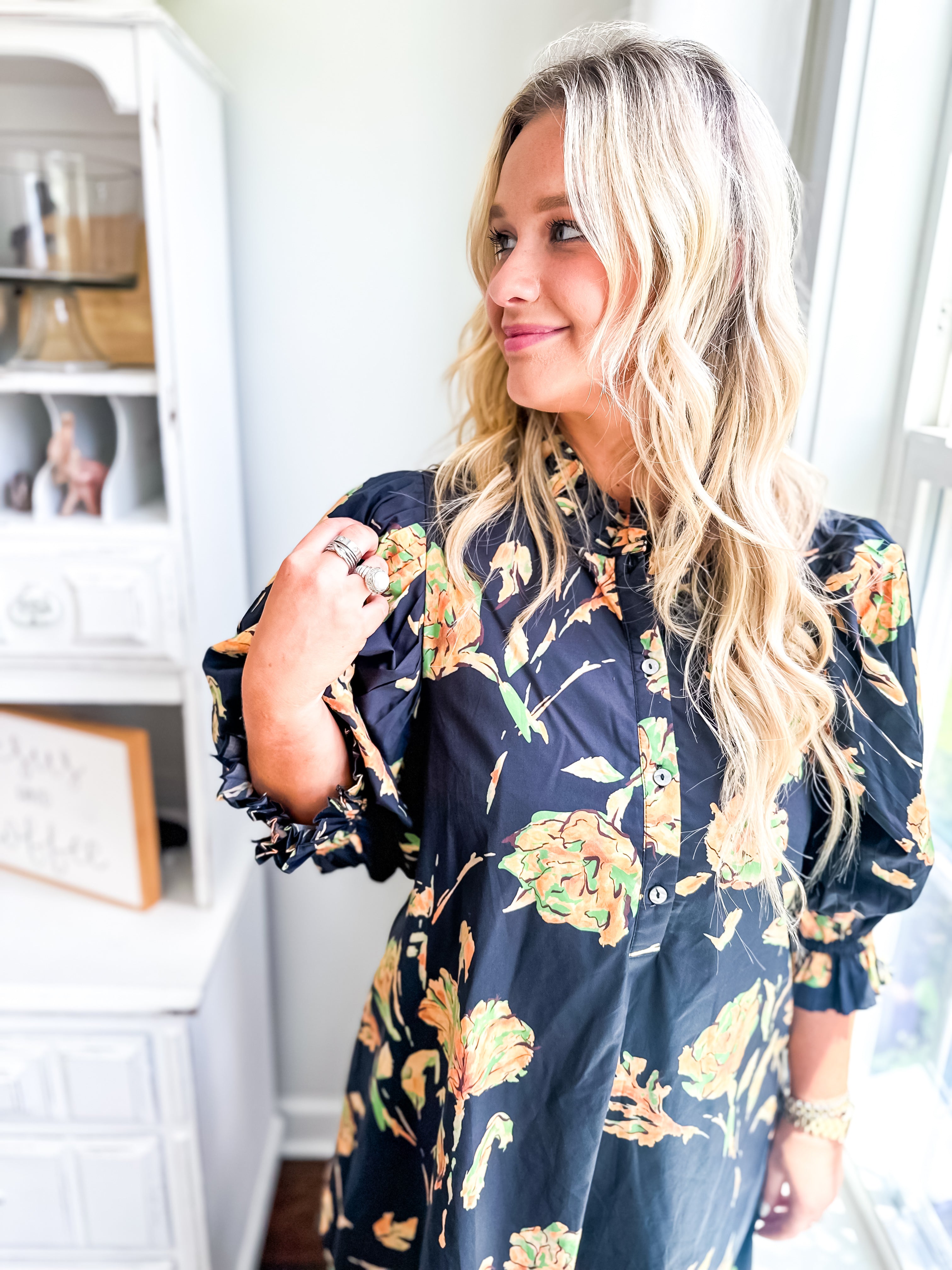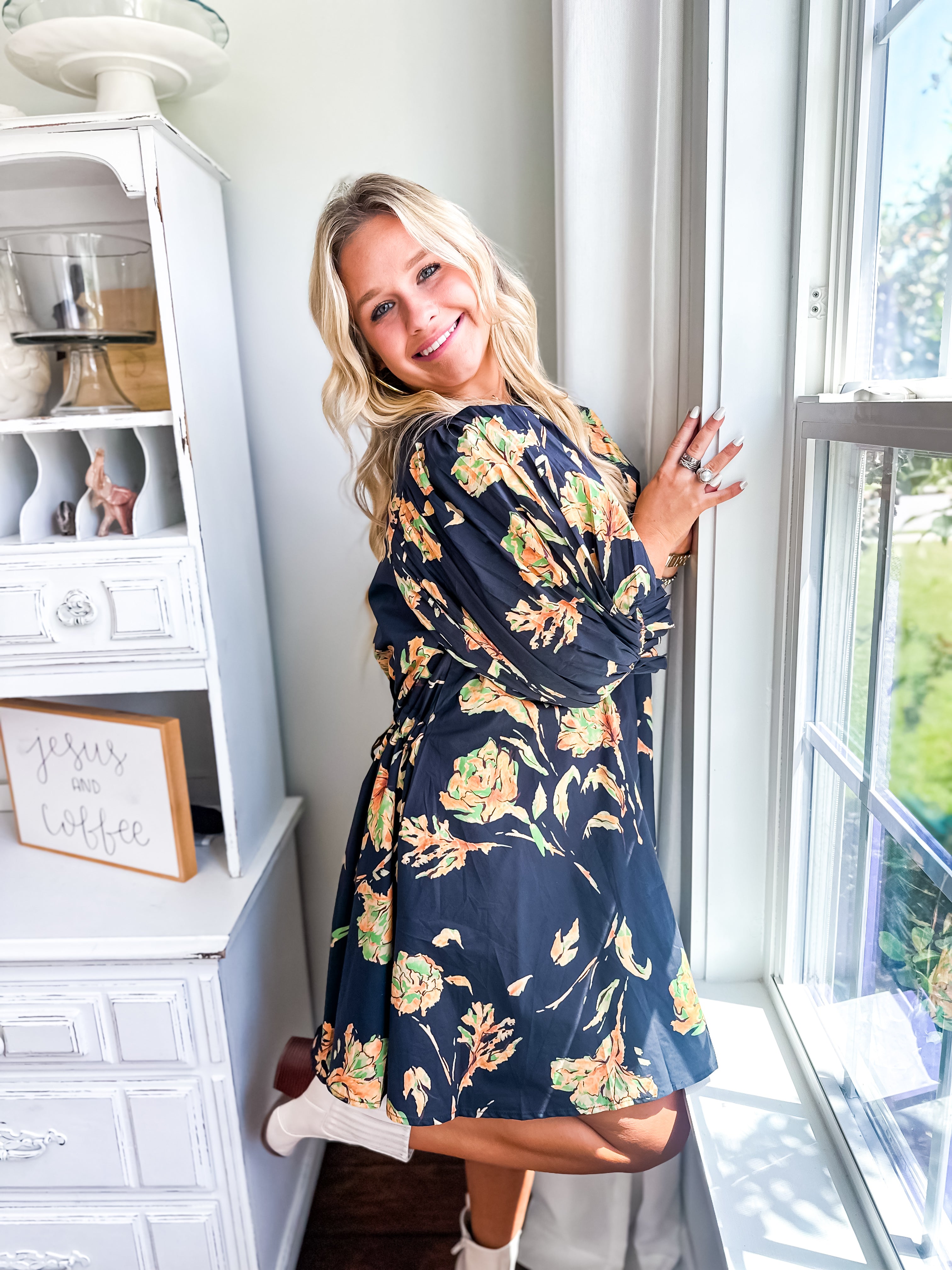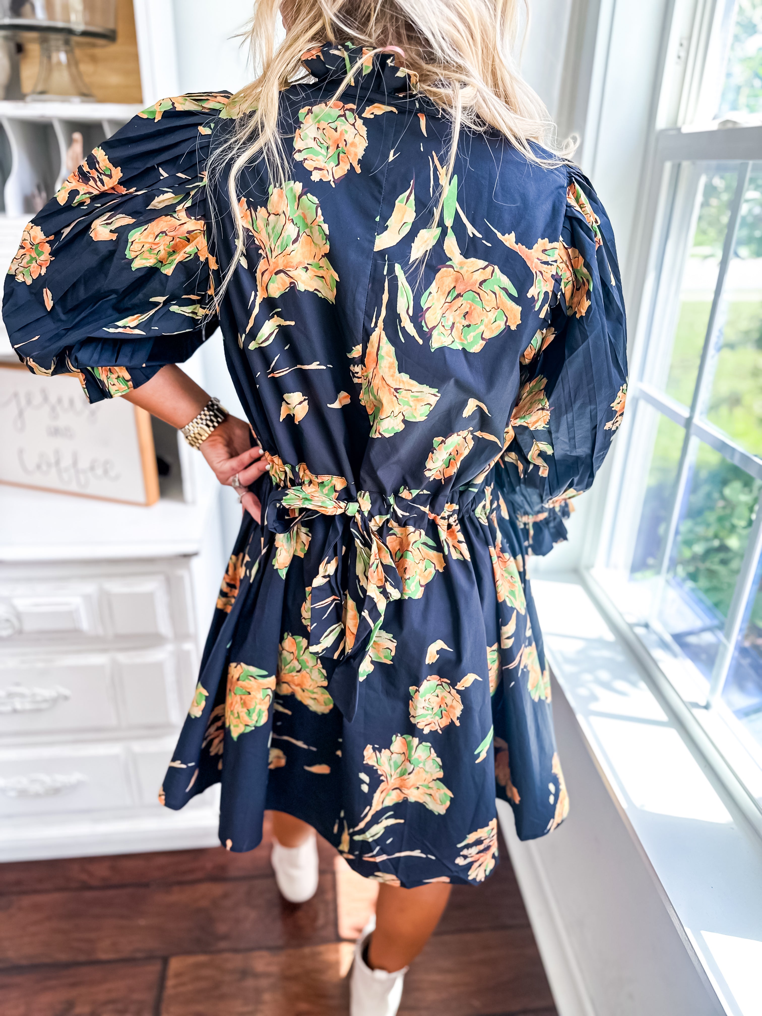 Floral print puff sleeve mini dress featuring adjustable self tie at back. Pleat detail at sleeves and neck. Button closures at front. Elastic at cuff. Pocket at sides. Lined. Woven. Non-sheer. Lightweight.