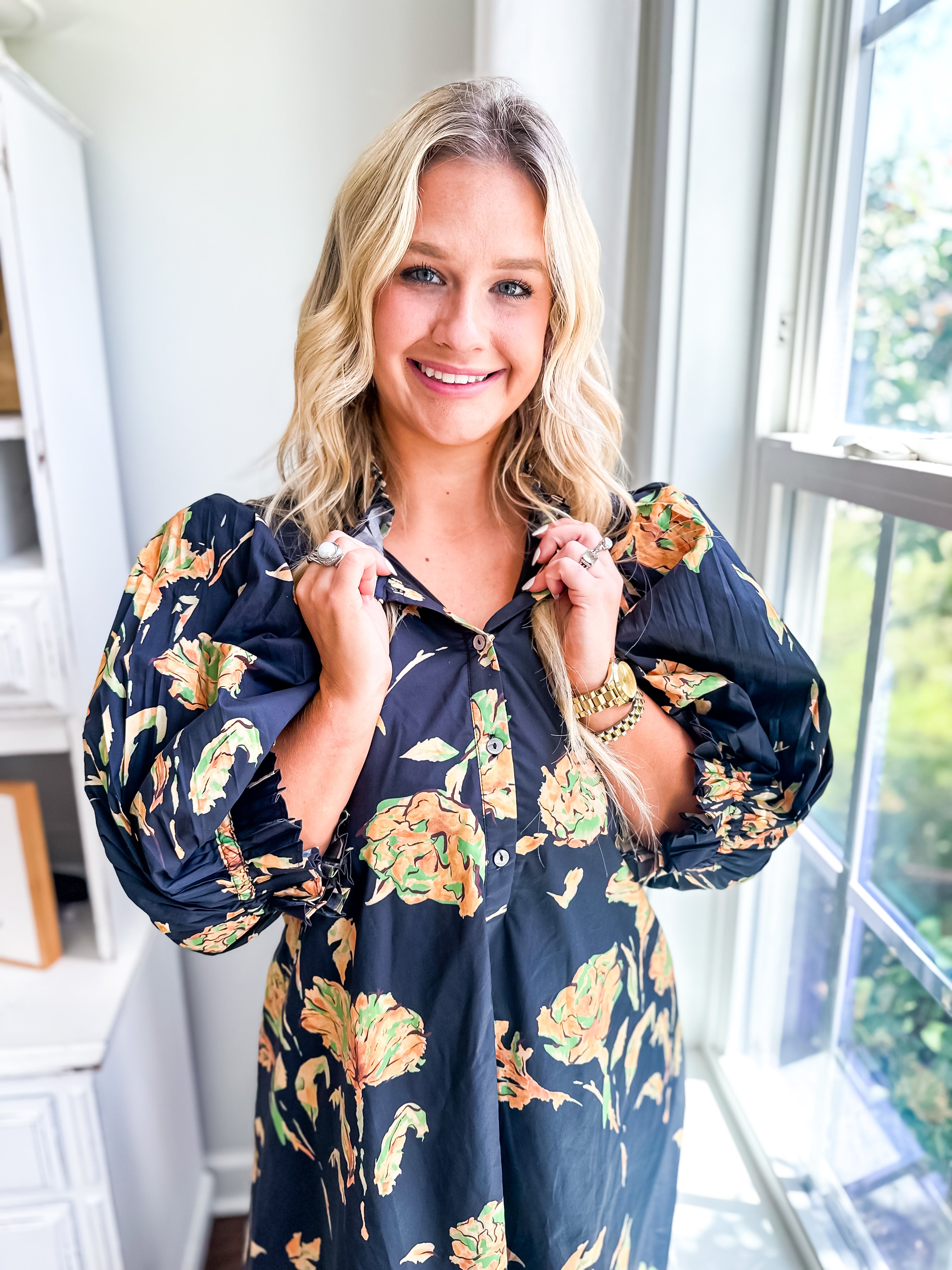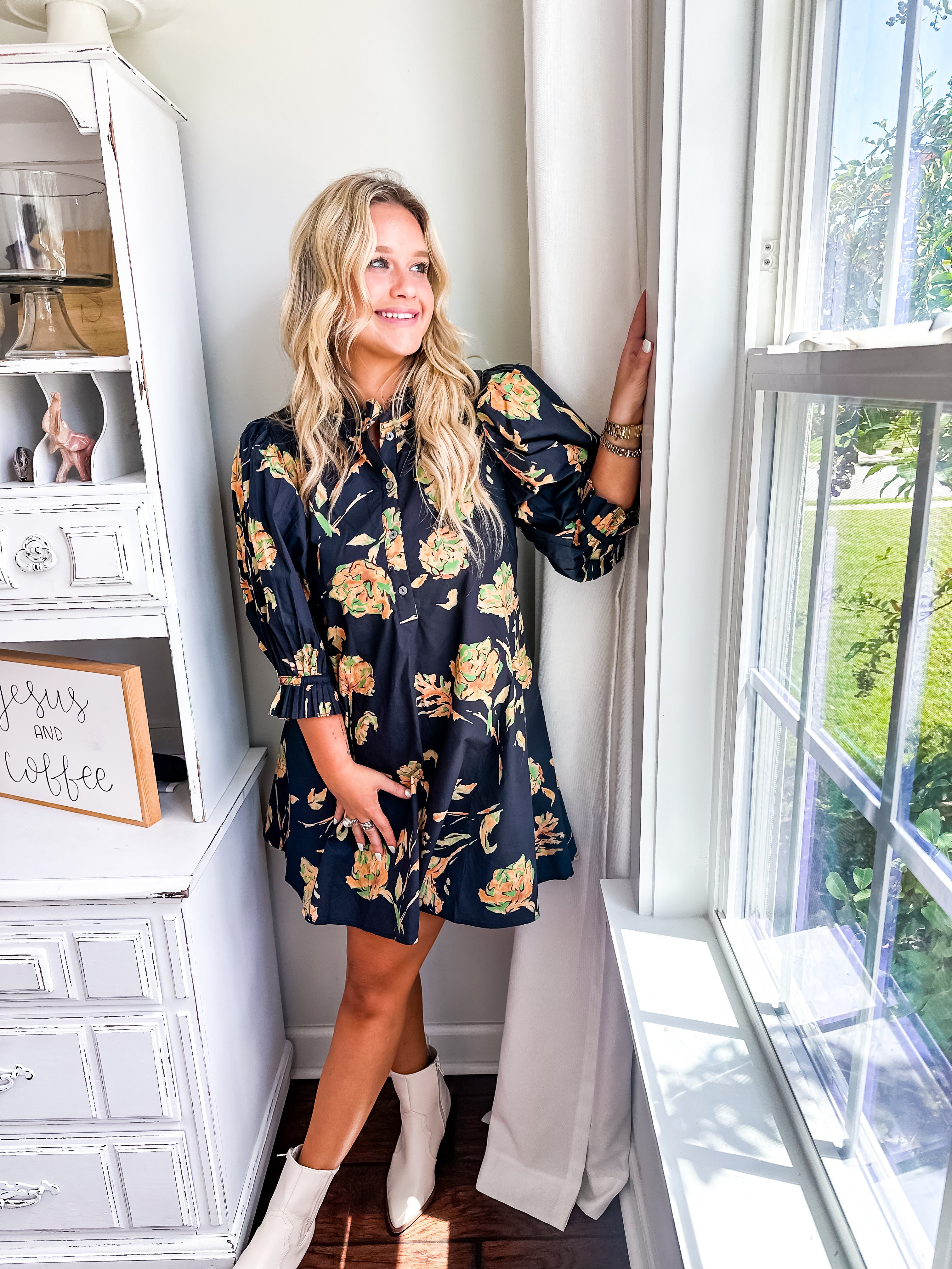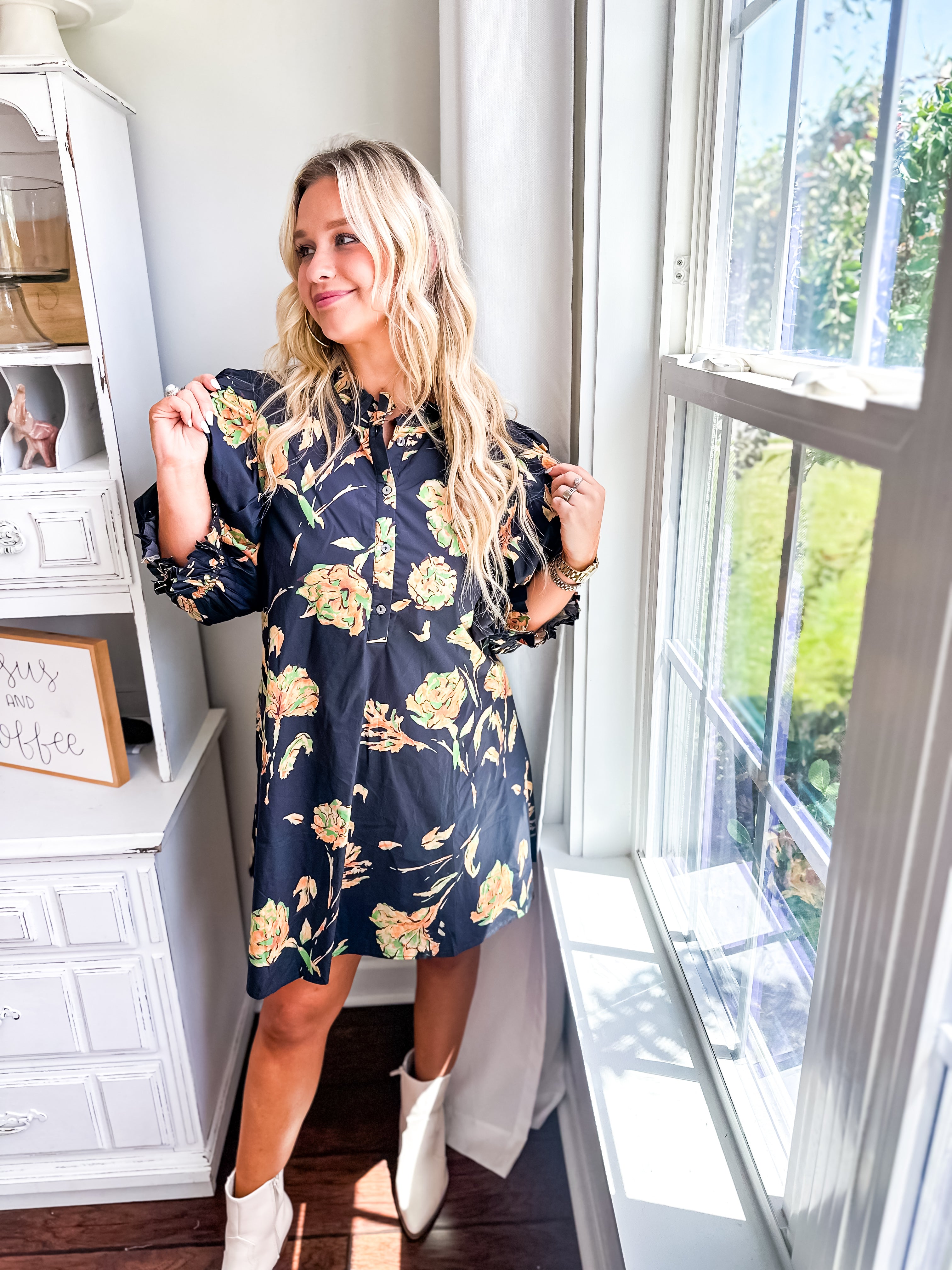Floral print puff sleeve mini dress featuring adjustable self tie at back. Pleat detail at sleeves and neck. Button closures at front. Elastic at cuff. Pocket at sides. Lined. Woven. Non-sheer. Lightweight.