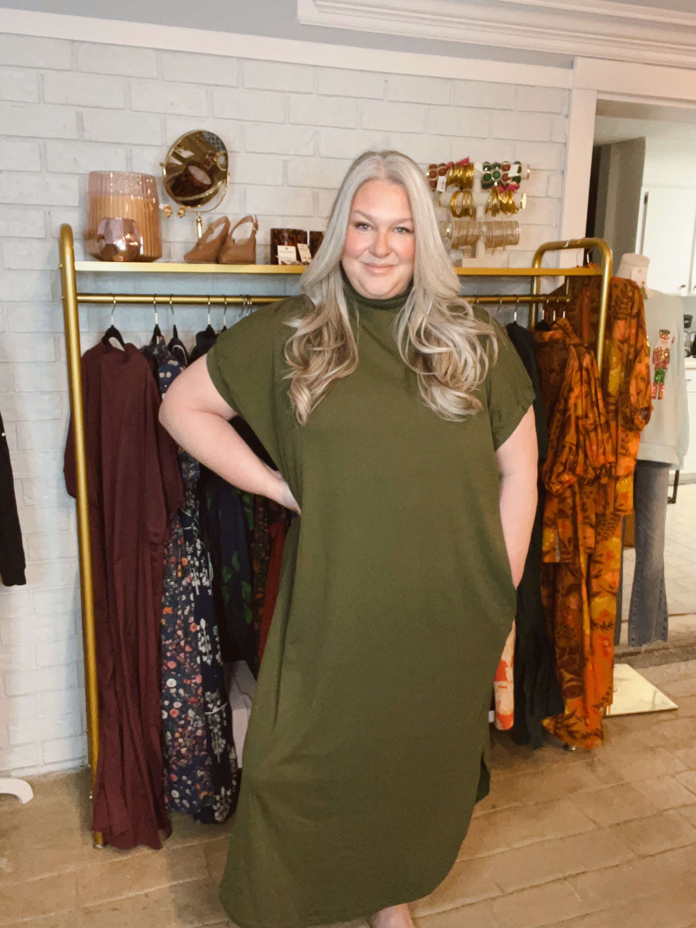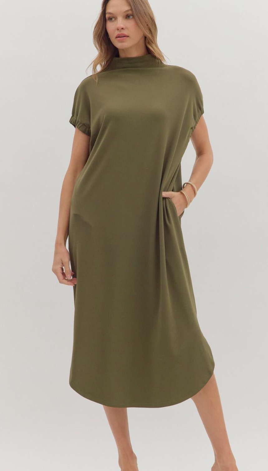 Solid short sleeve midi dress featuring high mock neck. Side pockets. Unlined. Knit. Non-sheer. Lightweight.