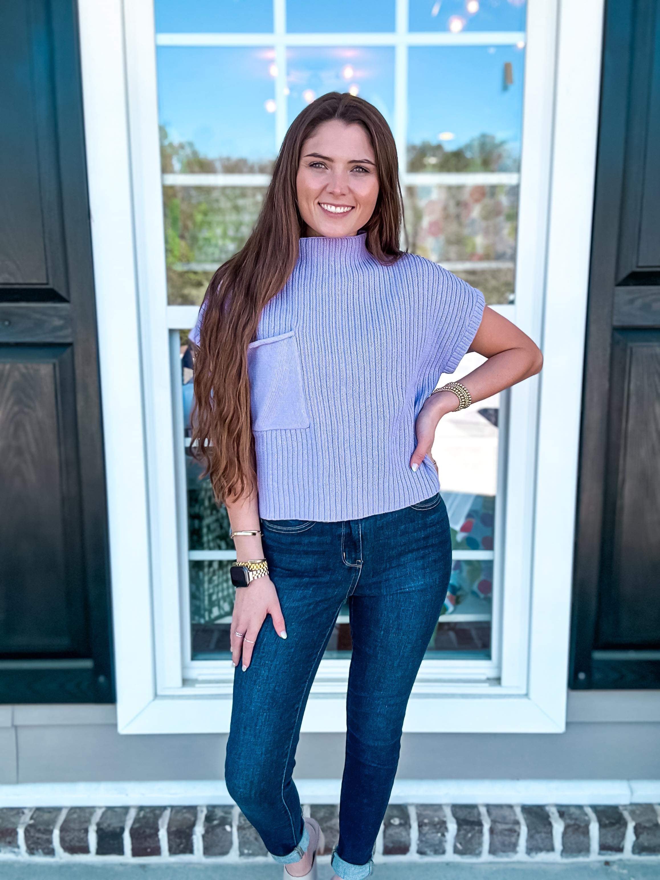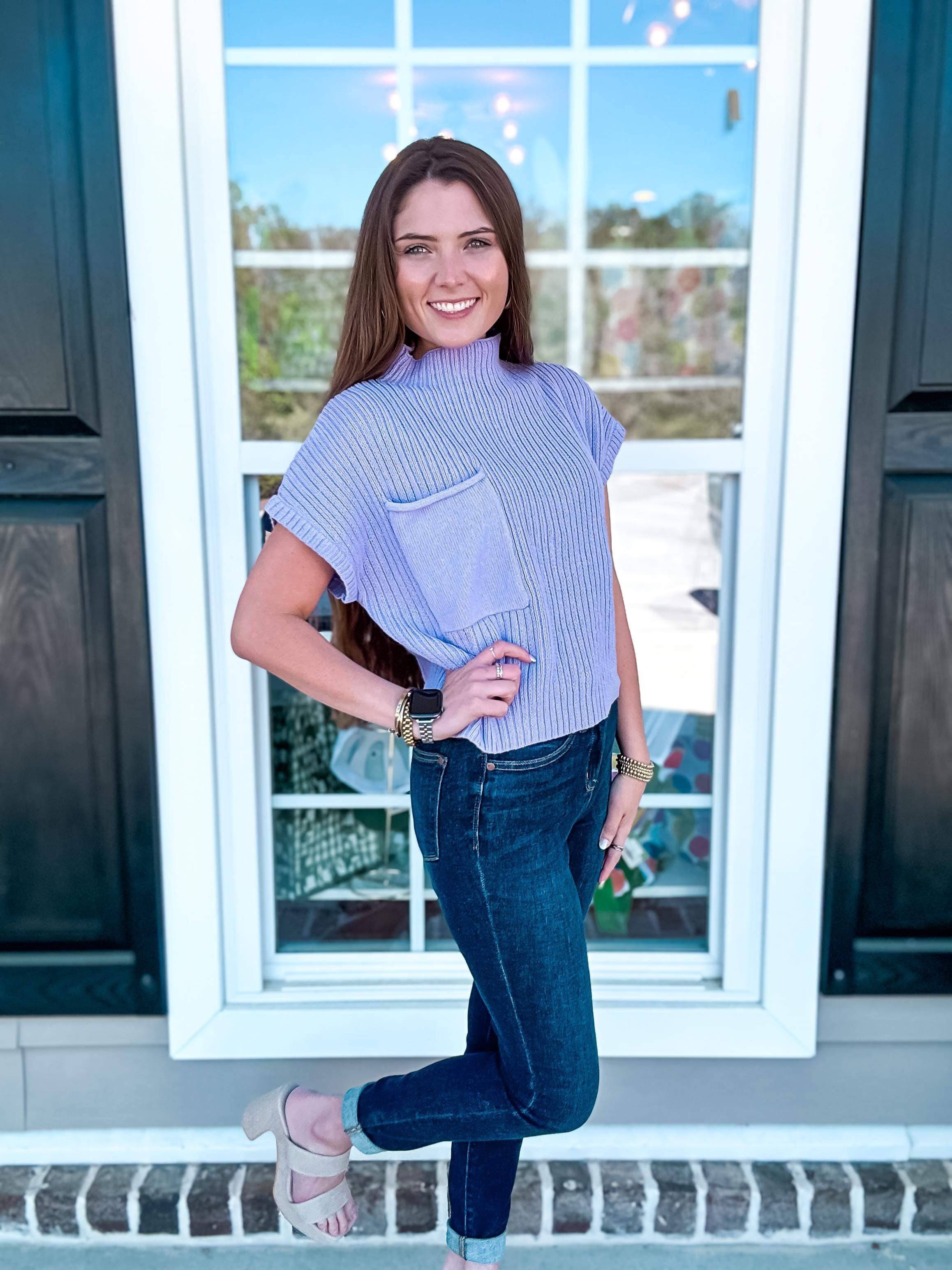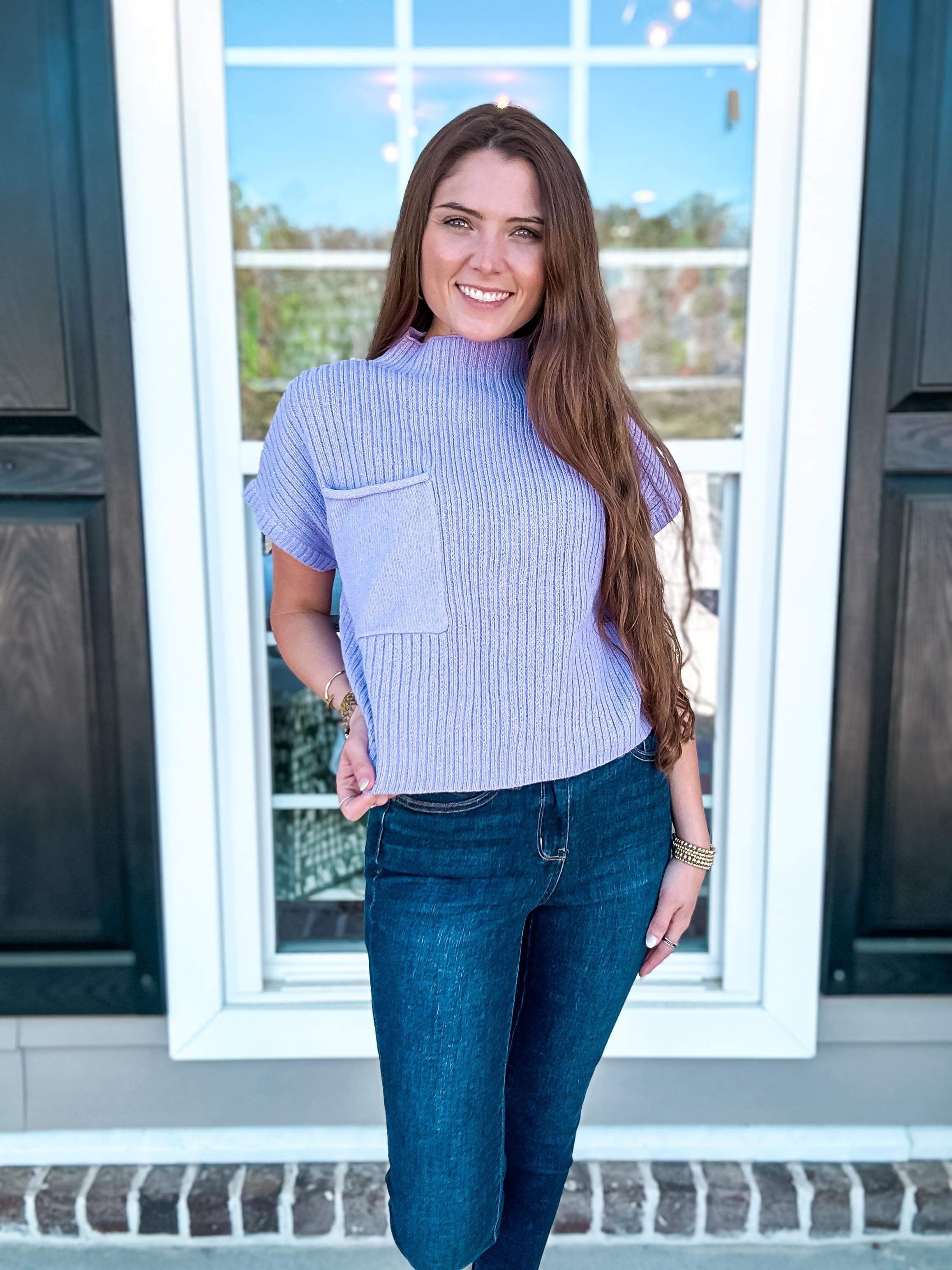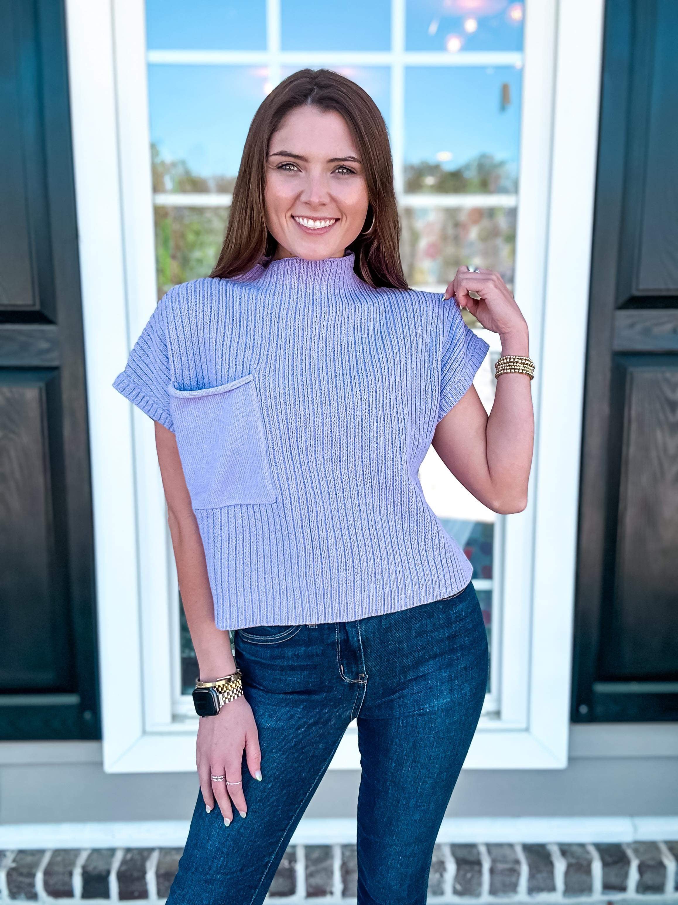 We are happy to introduce one of our best selling tops. It is considered a sweater - due to the material of the top. It is beyond lightweight and would pair nicely with any and all bottoms throughout the year. She features a higher neckline and a pocket on the chest. It is a true length. It will look fabulous on your next day at work or even going to brunch with your gals.