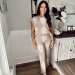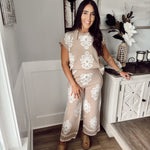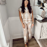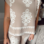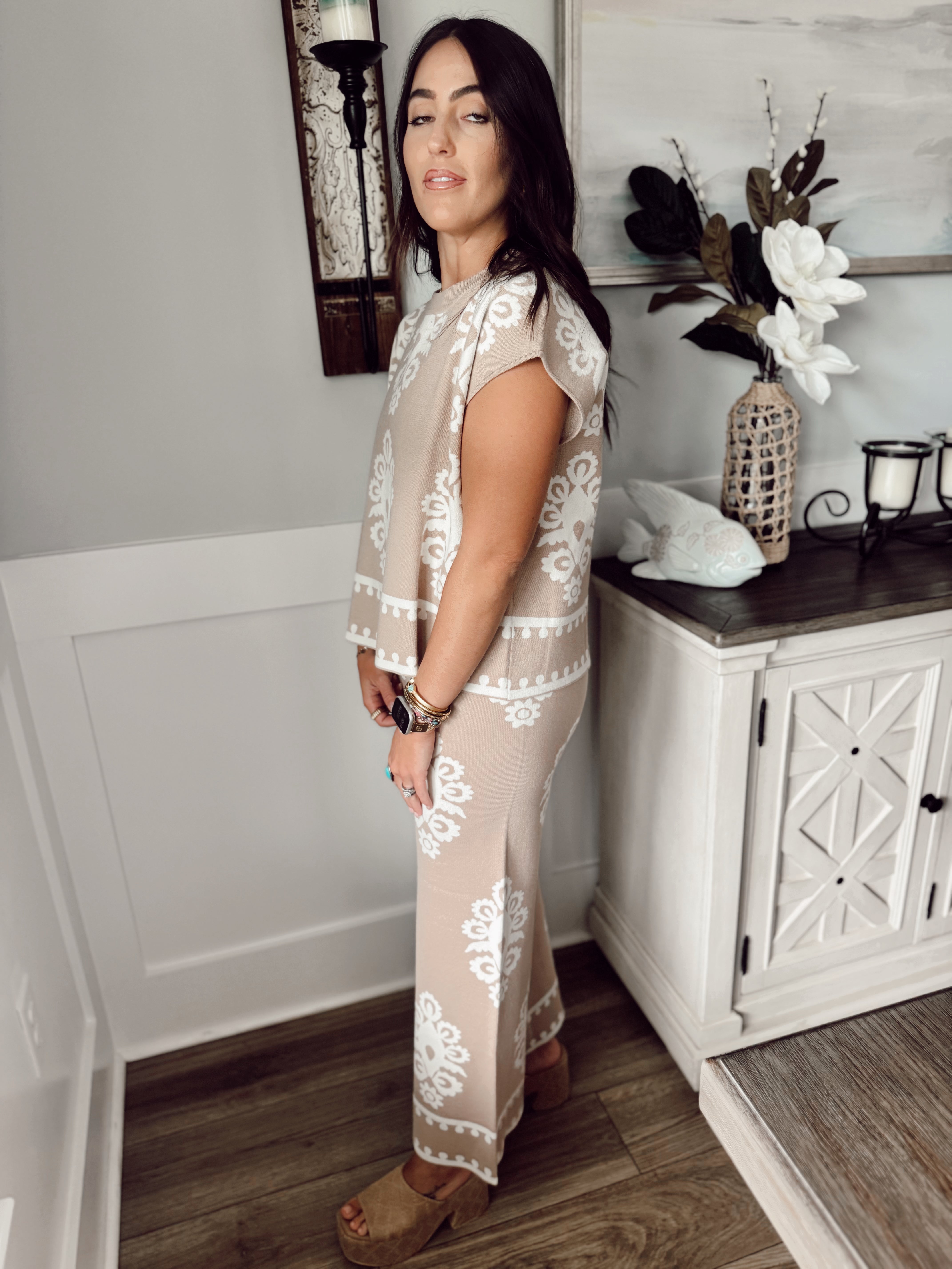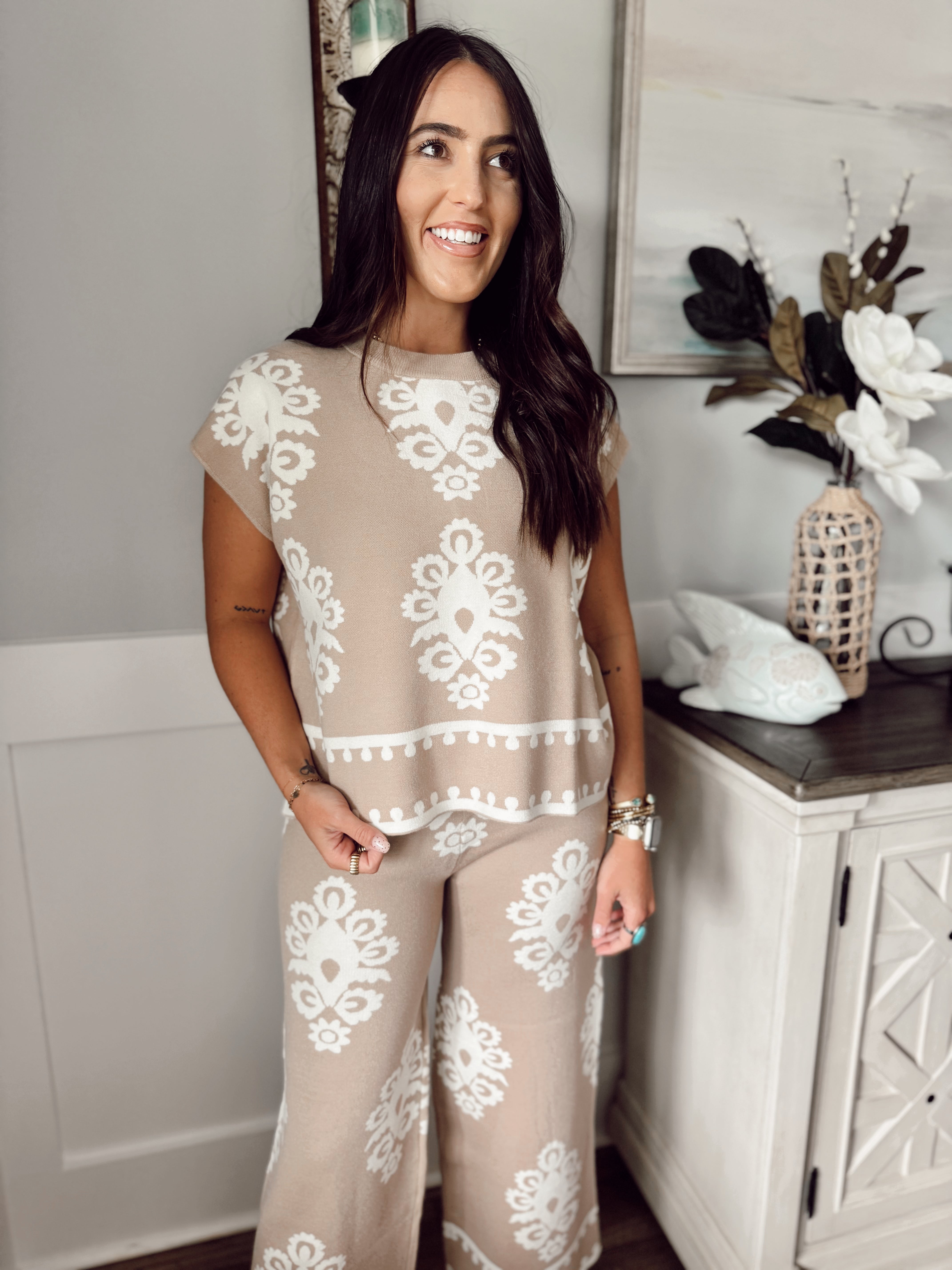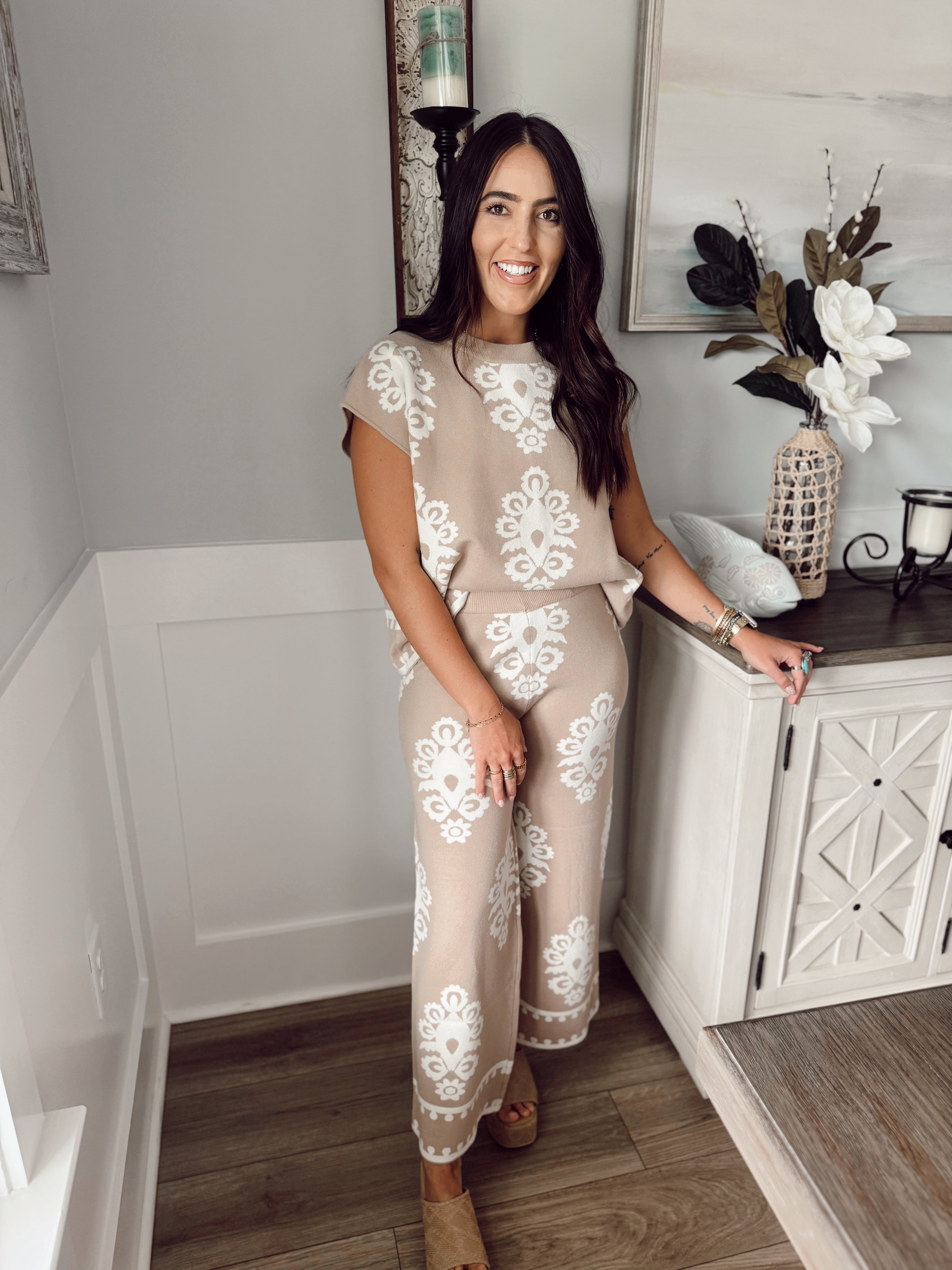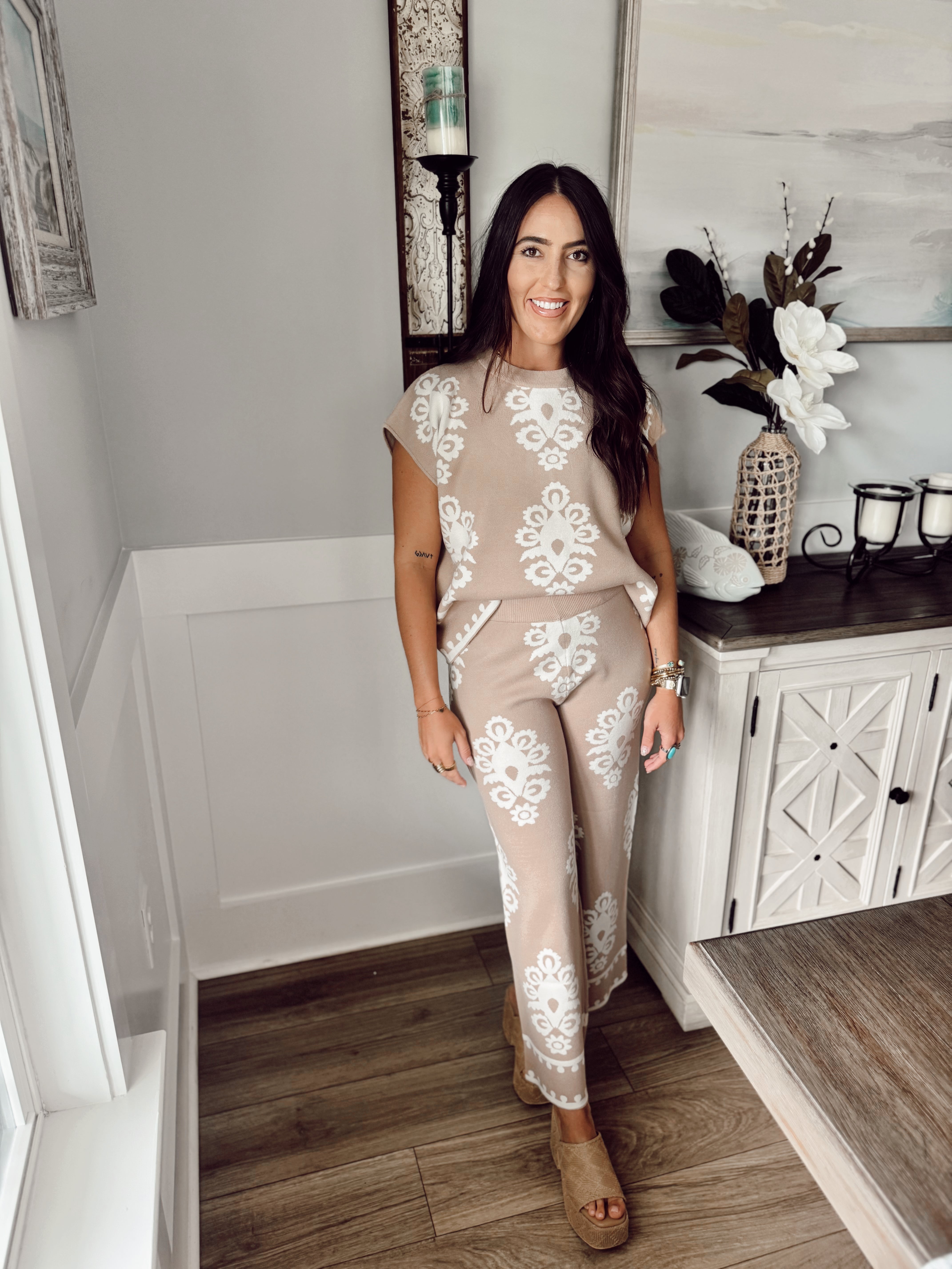 Damask pattern sweater knit pull-on pants. Unlined. Knit. Non-sheer. Lightweight.
