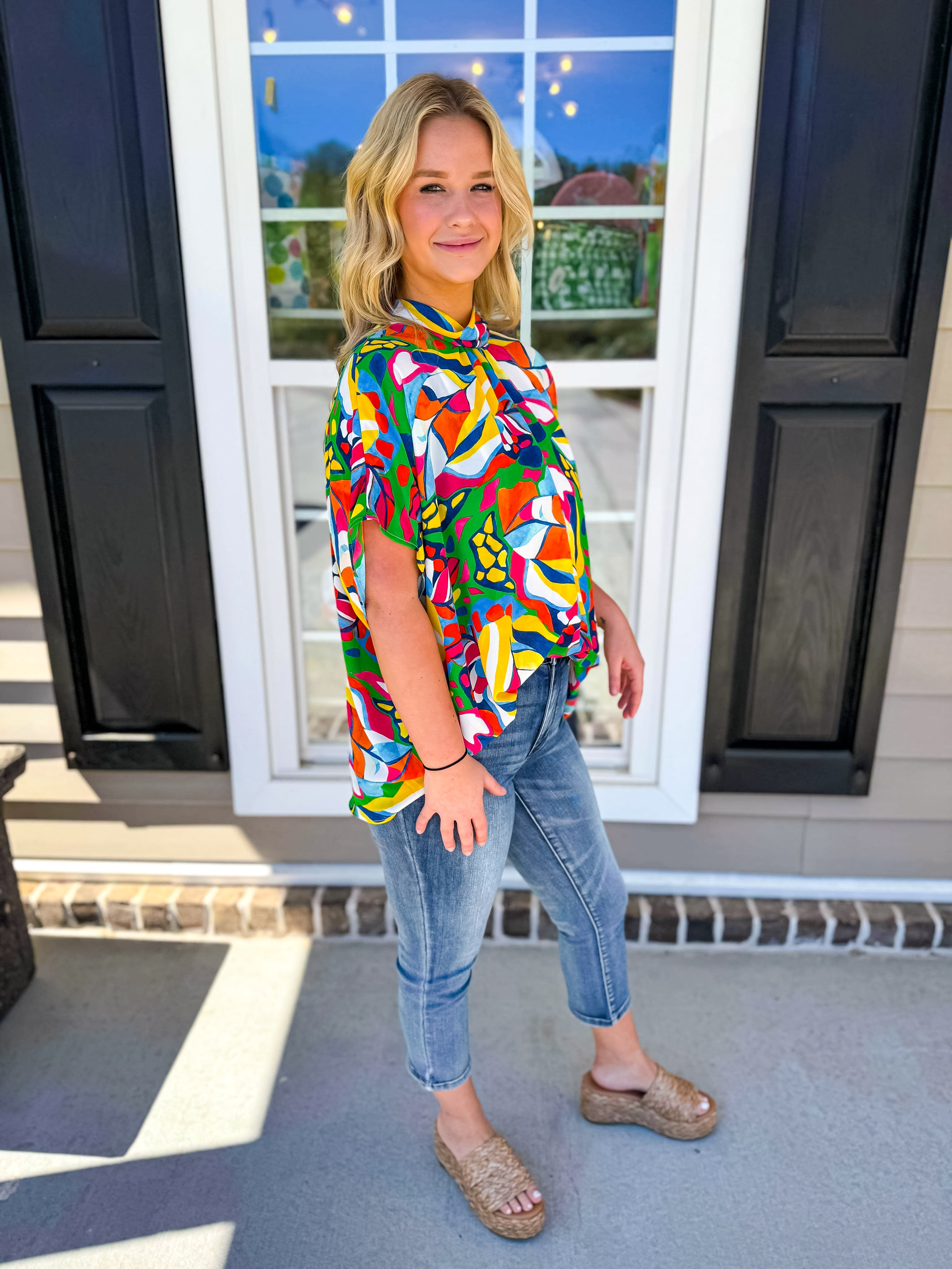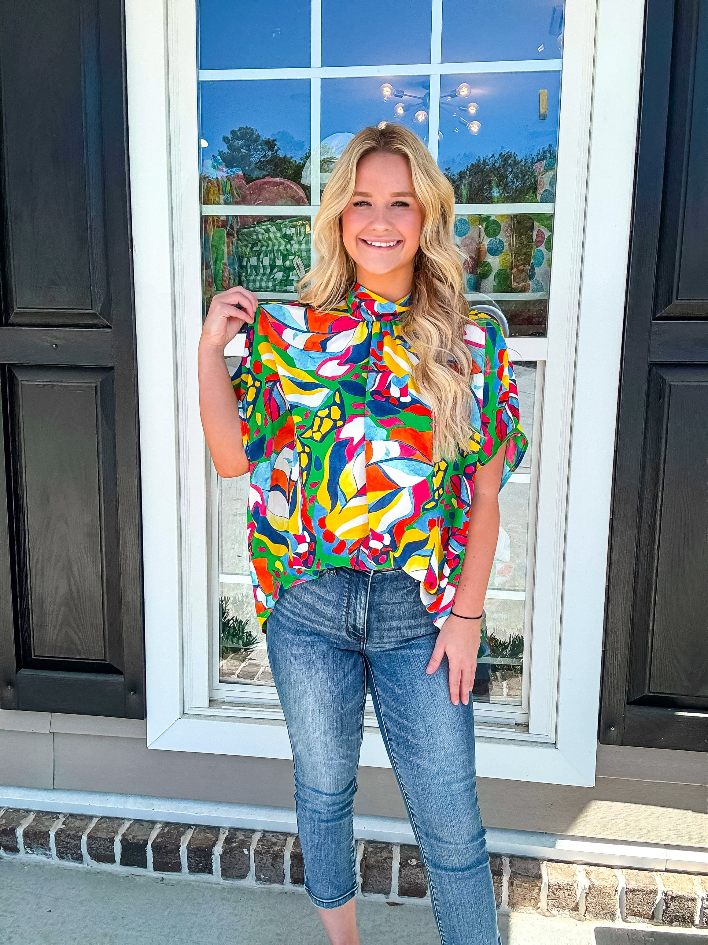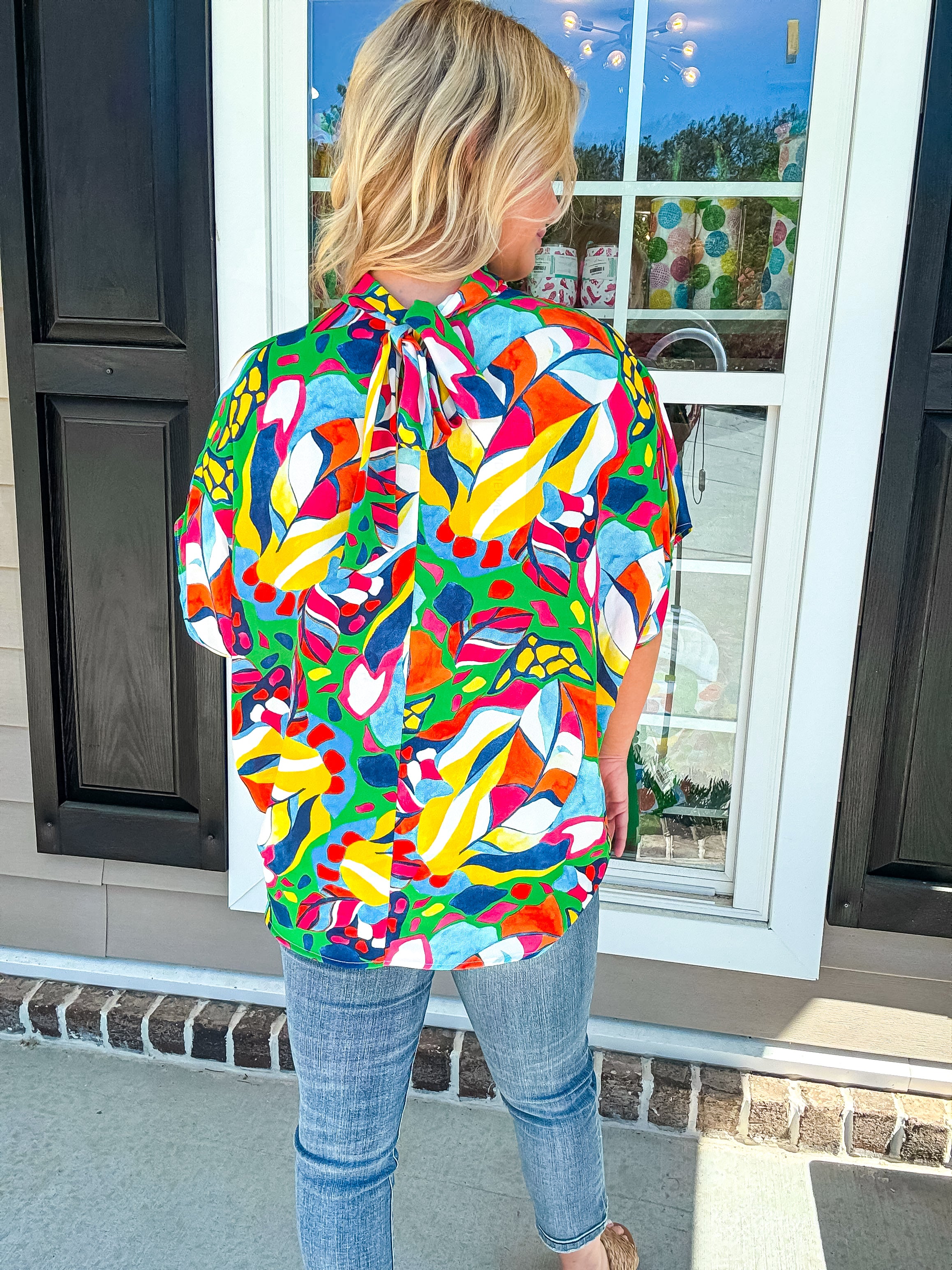 This blouse is absolutely beautiful! It features a high neckline that does have a functional tie in the back so you can adjust to your liking. It features an elastic piece at the bottom front to give you a tuck look without having to do the work of tucking. It is super lightweight and will pair nicely with your white bottoms for brunch or even dark denim with a pop of color shoe to spice it up.