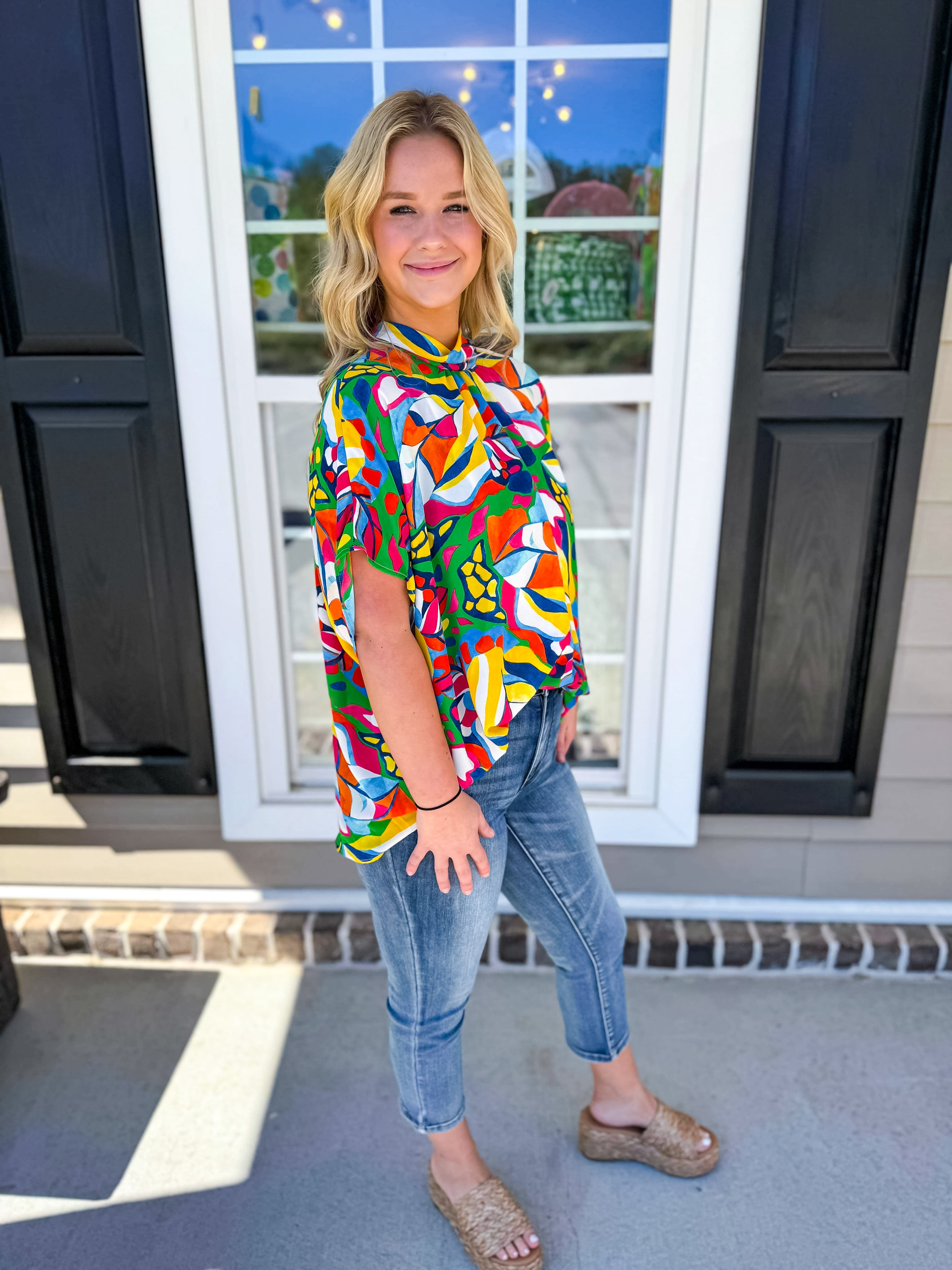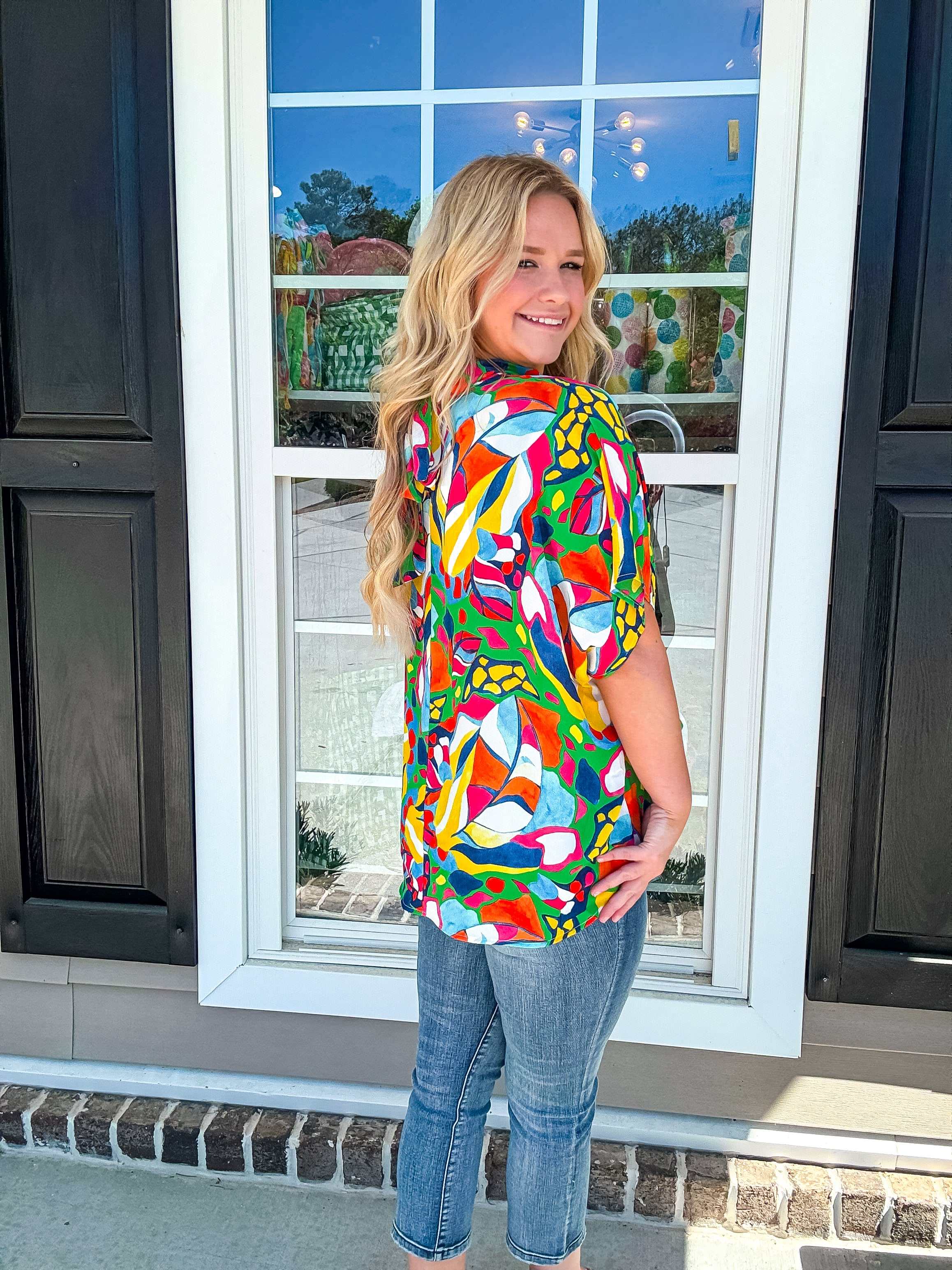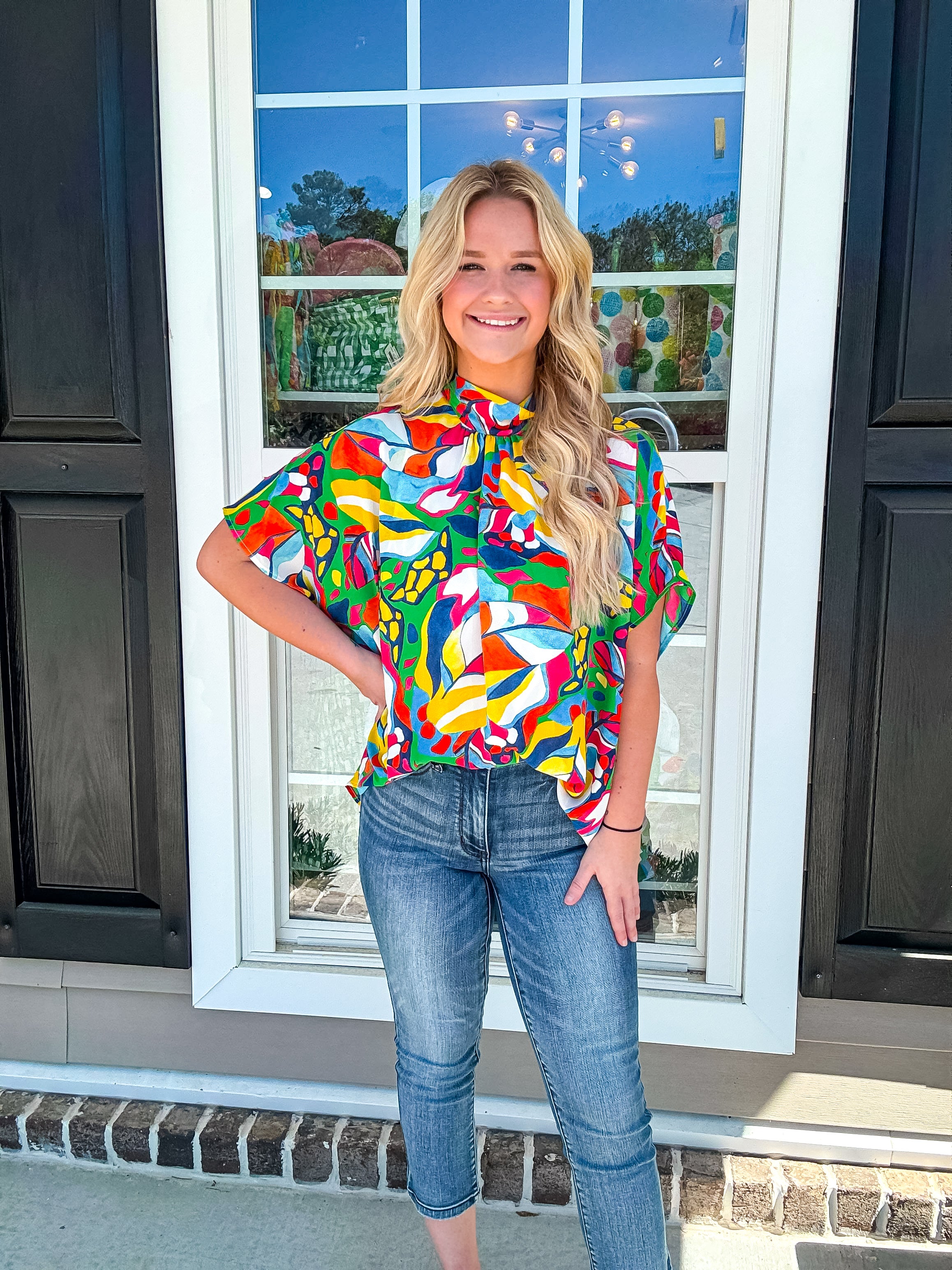This blouse is absolutely beautiful! It features a high neckline that does have a functional tie in the back so you can adjust to your liking. It features an elastic piece at the bottom front to give you a tuck look without having to do the work of tucking. It is super lightweight and will pair nicely with your white bottoms for brunch or even dark denim with a pop of color shoe to spice it up.
