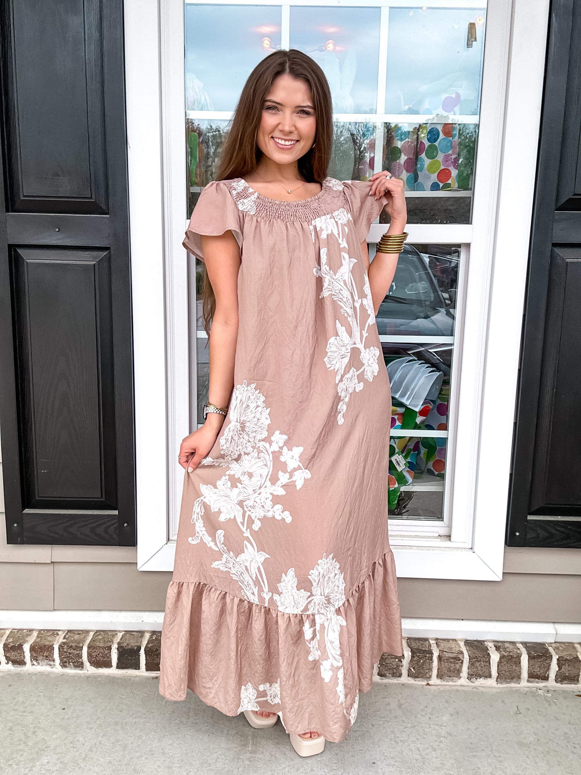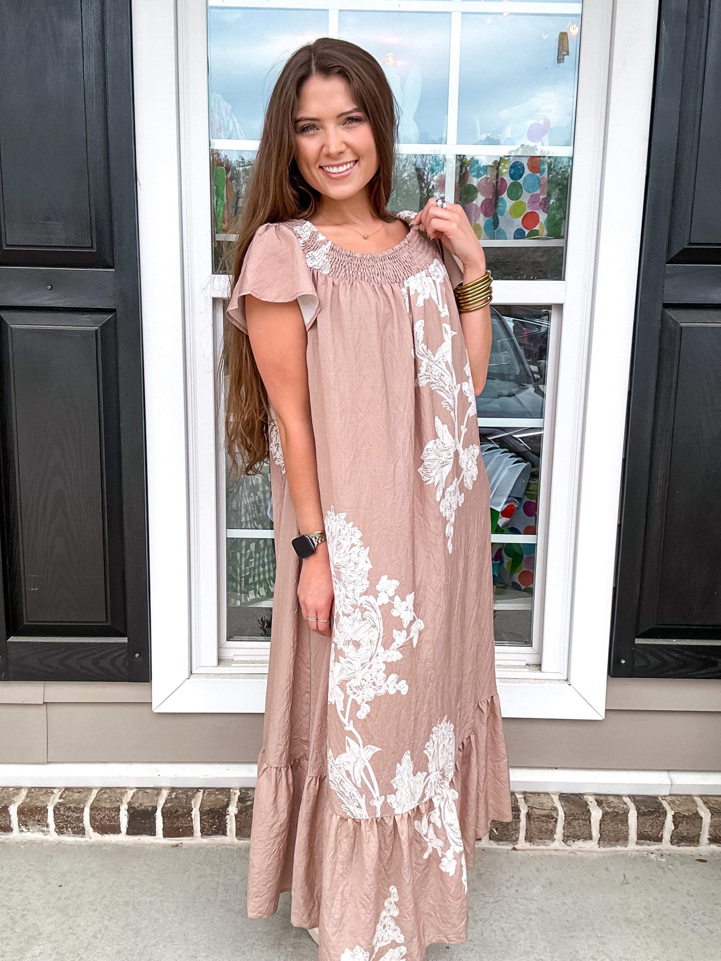 This dress is absolutely fabulous. It features smocking around the neckline for extra comfort. It features a flutter sleeve detail that make this dress exactly what you need. It is a perfect flowy fit for Spring + Summer. It has a ruffle tier at the bottom of the dress. It does have a liner for extra coverage and comfort.