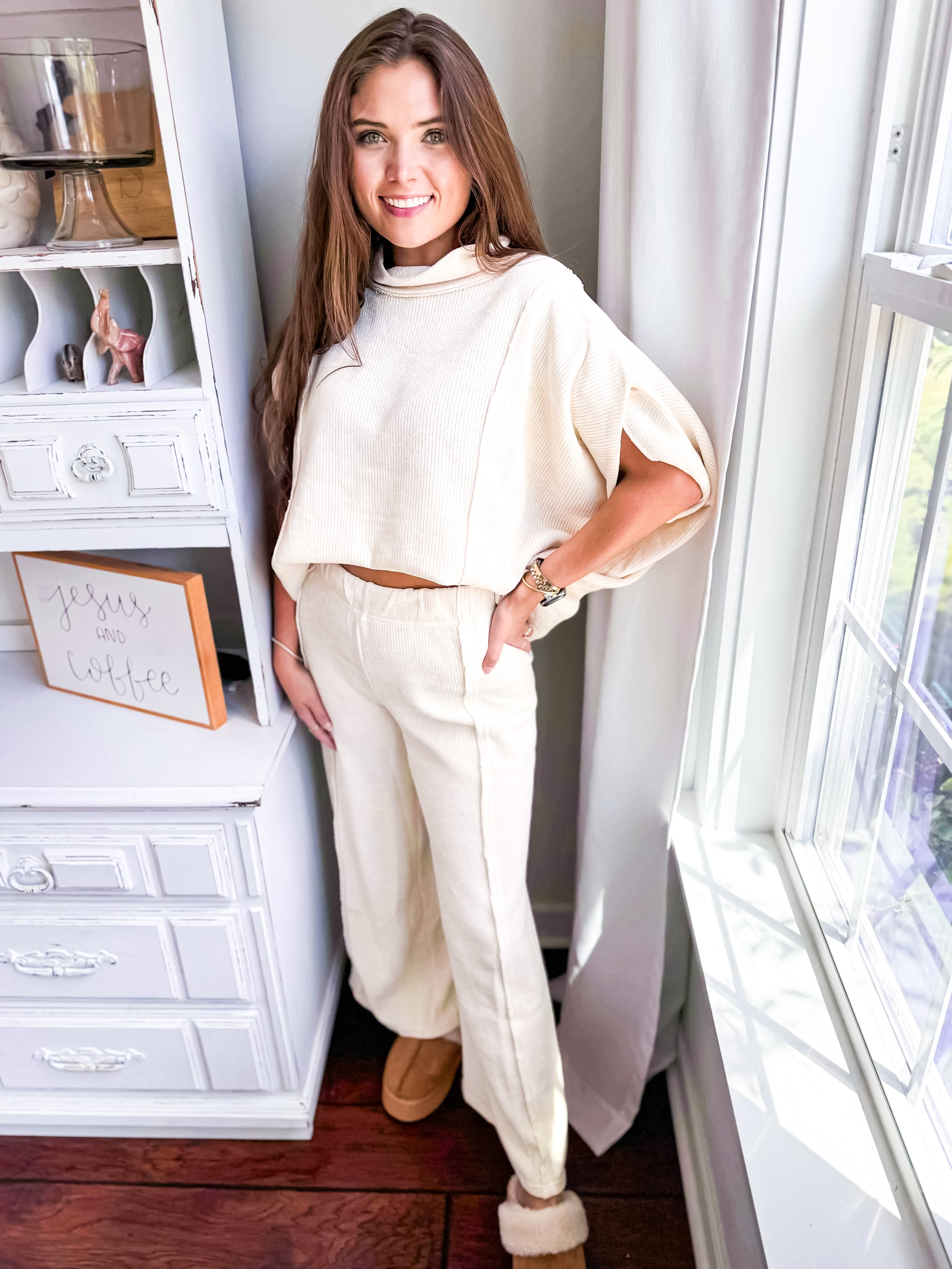 Elevate your style with the Make It Right Set, crafted from ultra-soft chenille in a beautiful cream. The top features a chic cowl neck with a poncho-inspired silhouette, adding a touch of effortless elegance to your look. Paired with matching pants that boast a slightly cropped length and unique out seam details, this set offers versatility like no other. Whether you wear them together for a coordinated ensemble or mix and match for endless outfit options, the Make It Right Set is your new go-to for comfort and style.