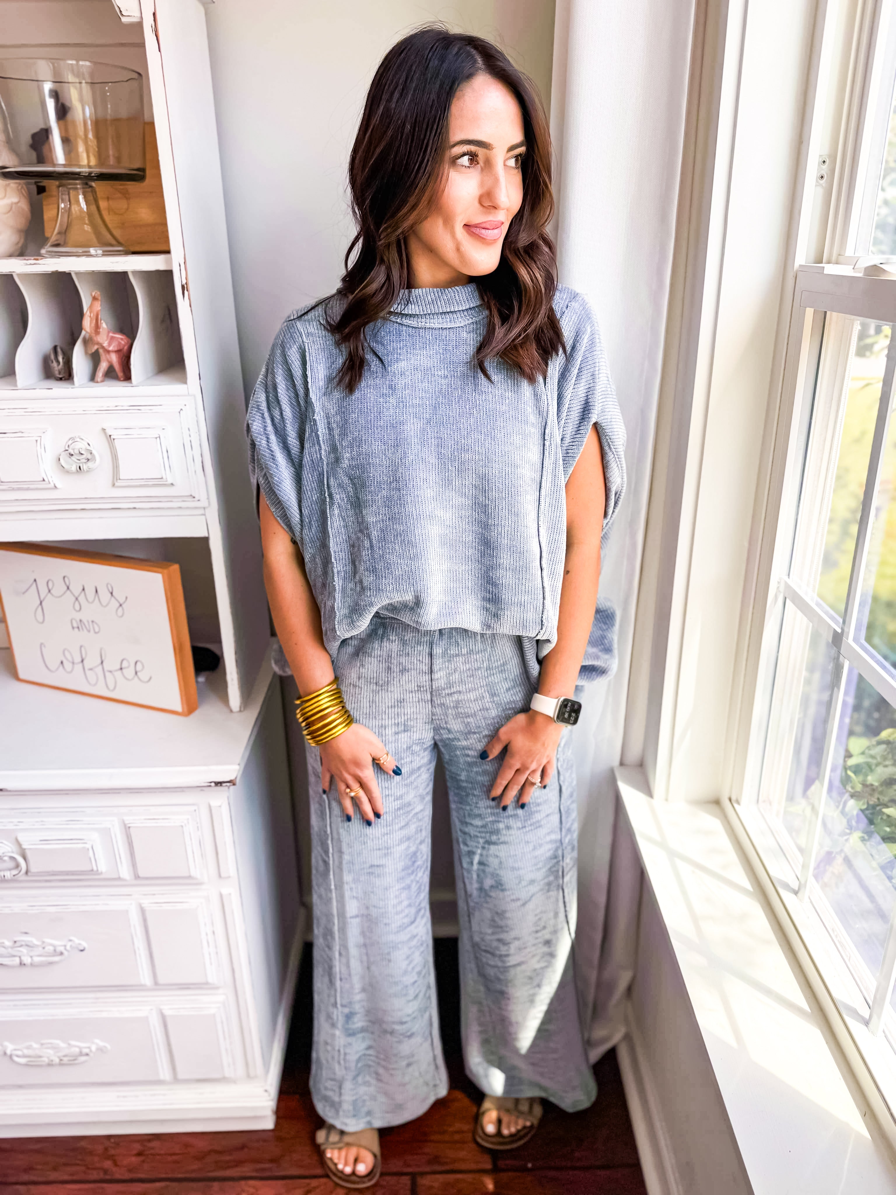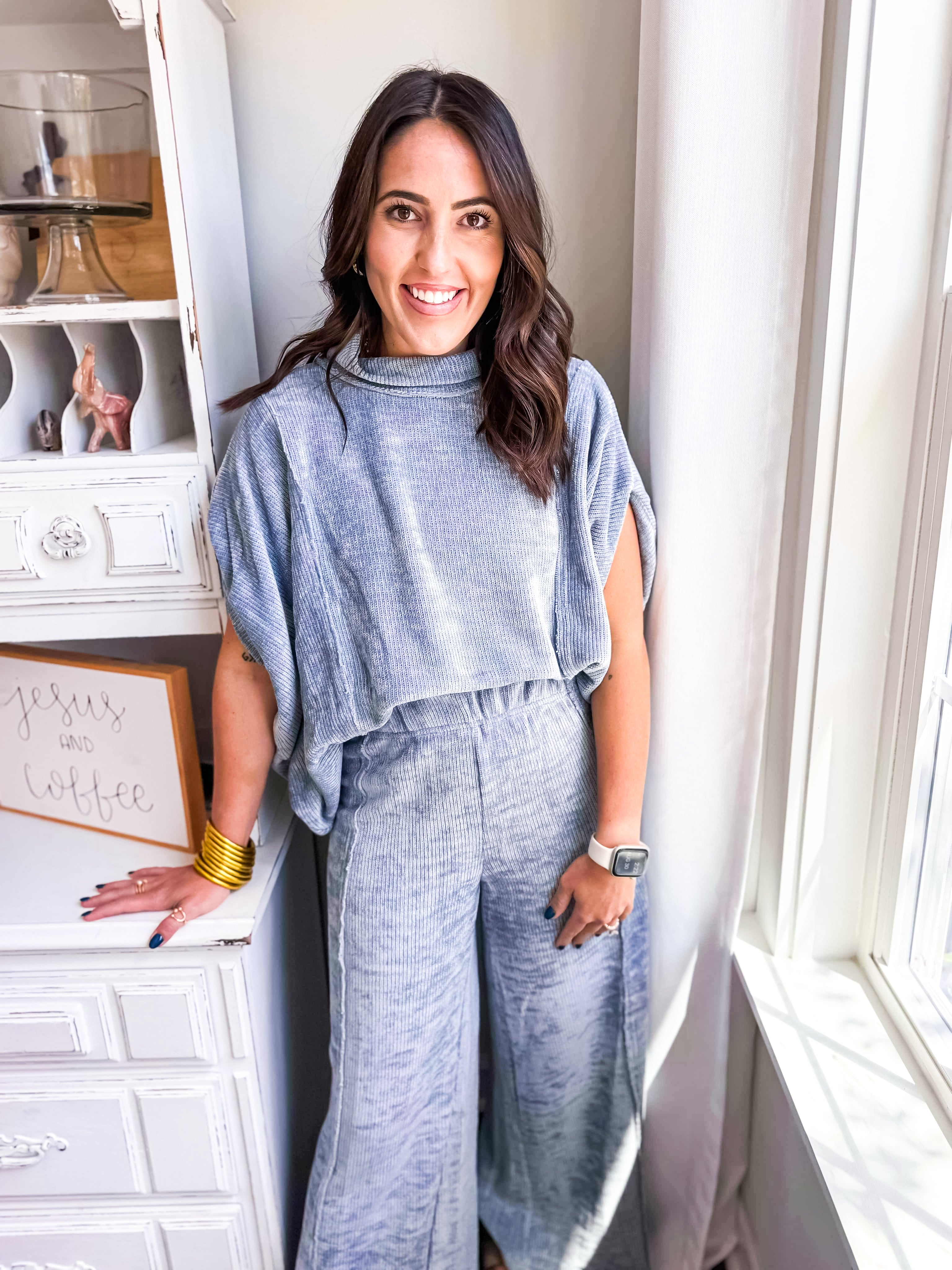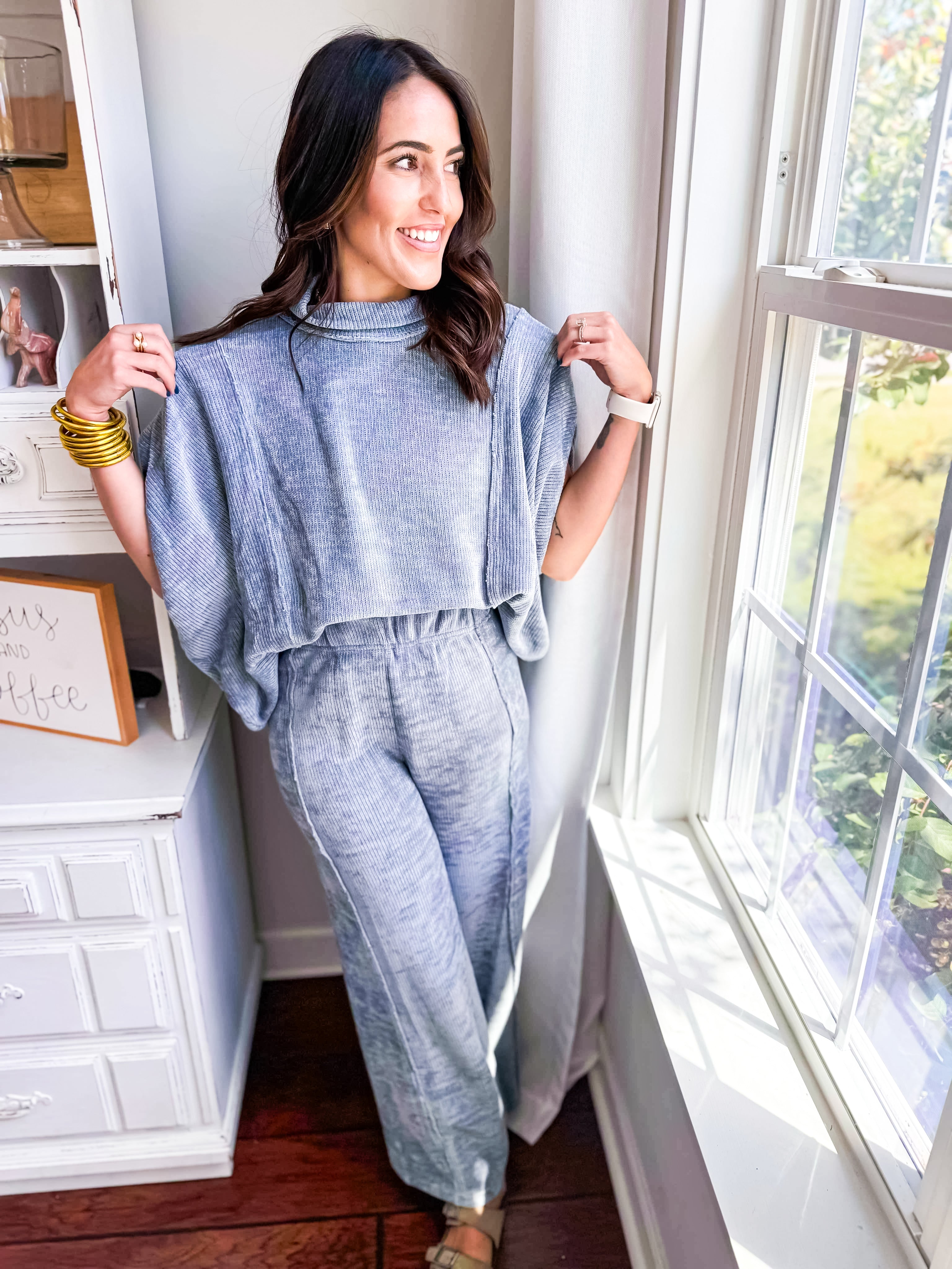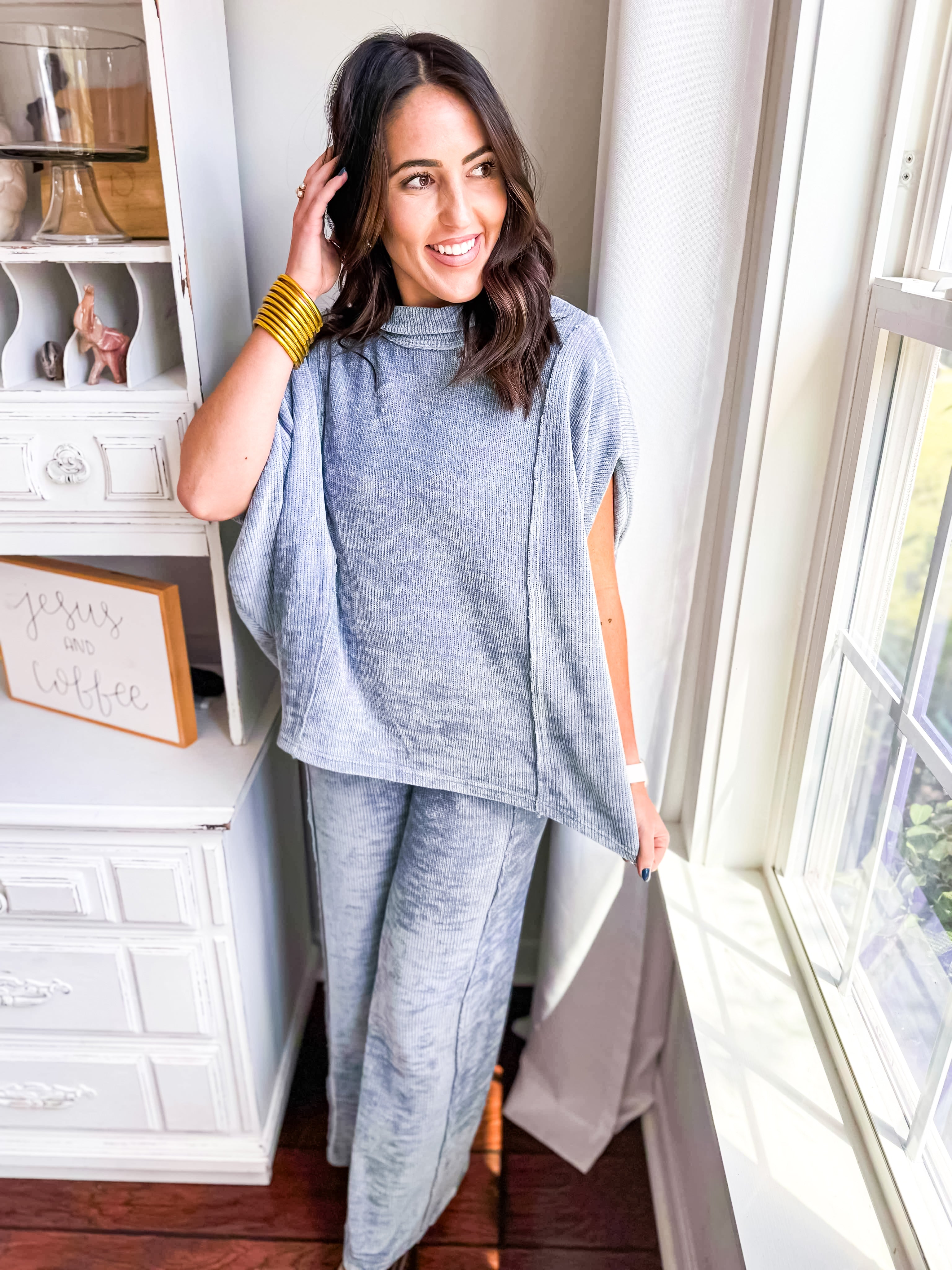 Elevate your style with the Make It Right Set, crafted from ultra-soft chenille in a muted denim blue / grey hue. The top features a chic cowl neck with a poncho-inspired silhouette, adding a touch of effortless elegance to your look. Paired with matching pants that boast a slightly cropped length and unique out seam details, this set offers versatility like no other. Whether you wear them together for a coordinated ensemble or mix and match for endless outfit options, the Make It Right Set is your new go-to for comfort and style.