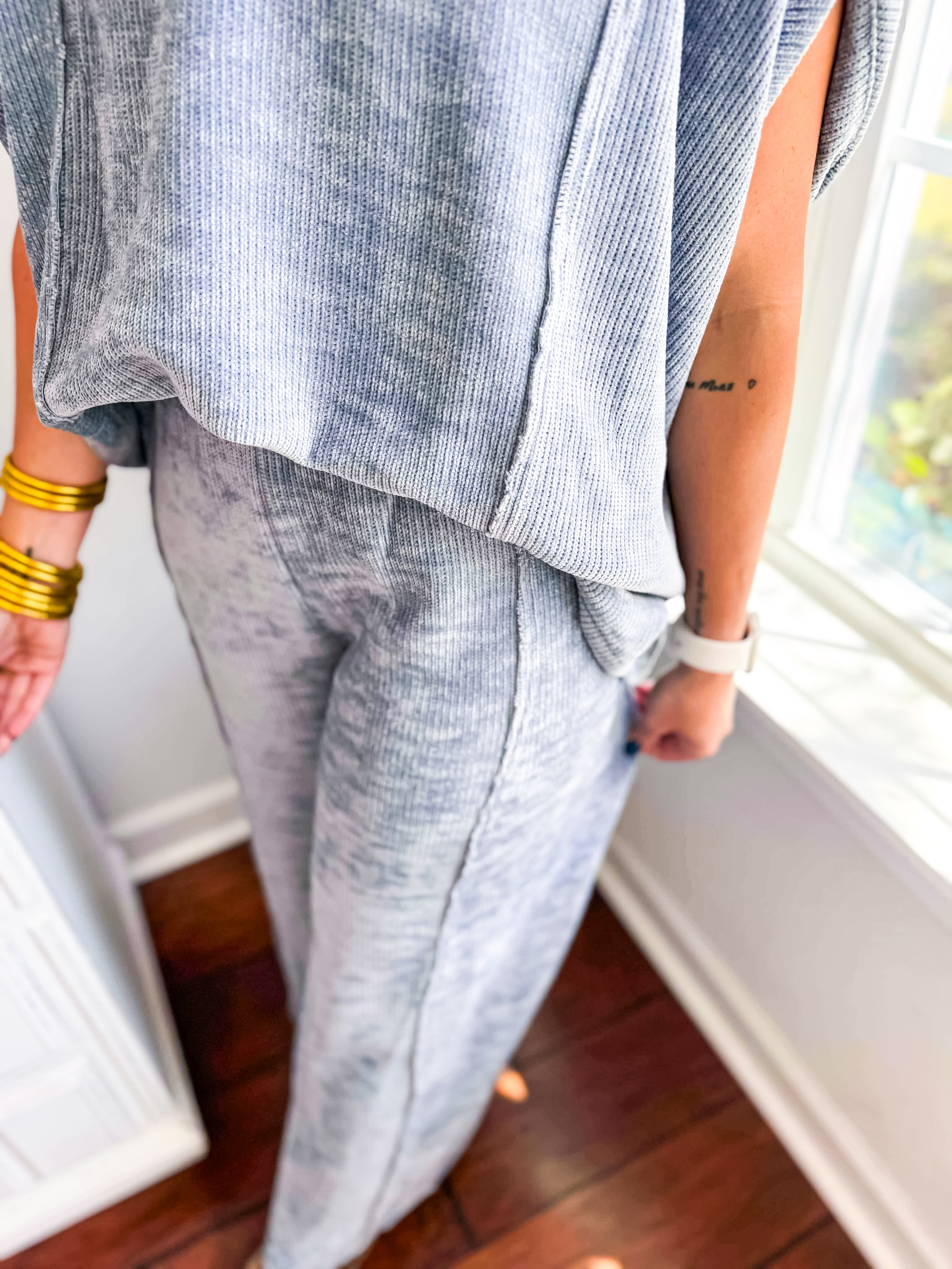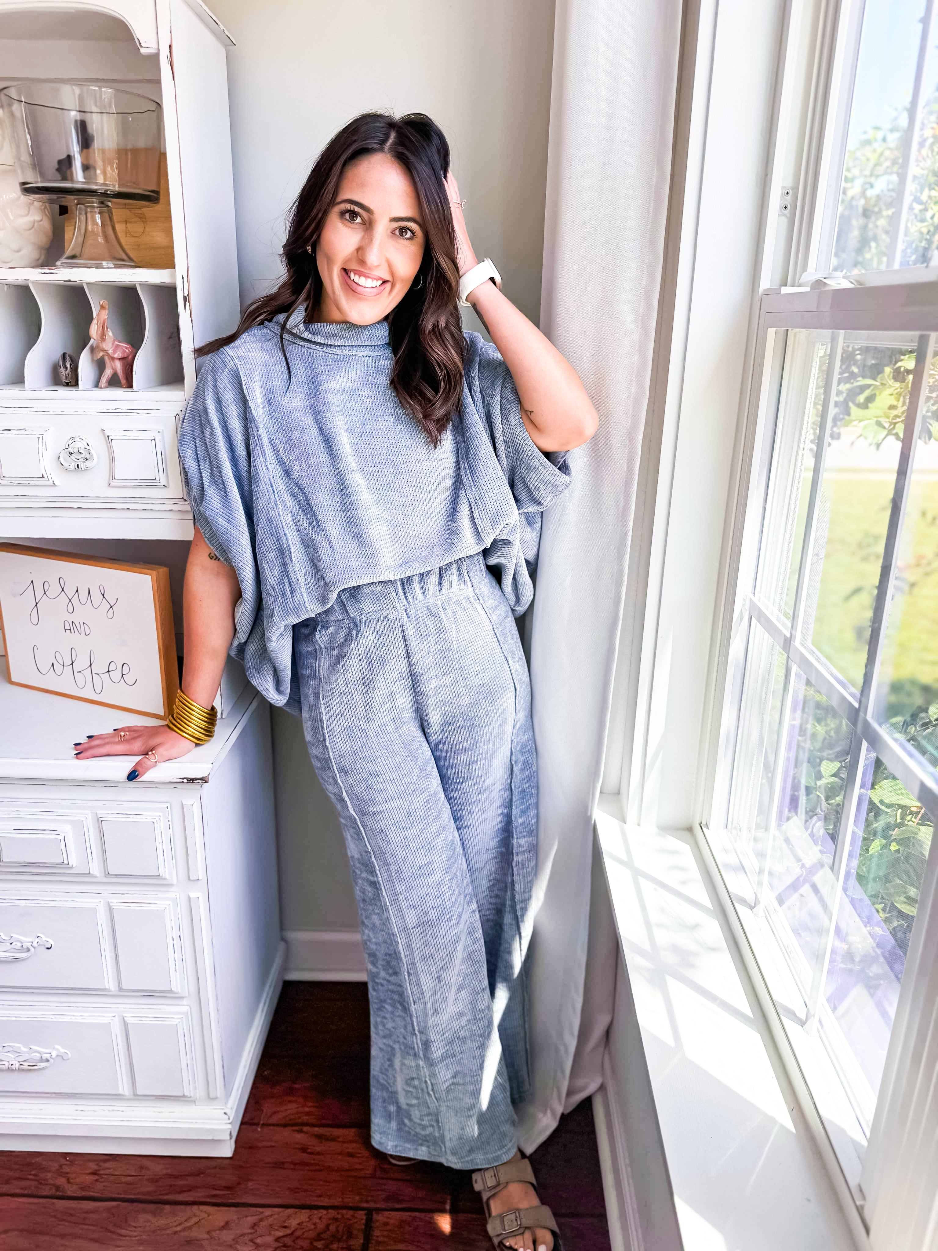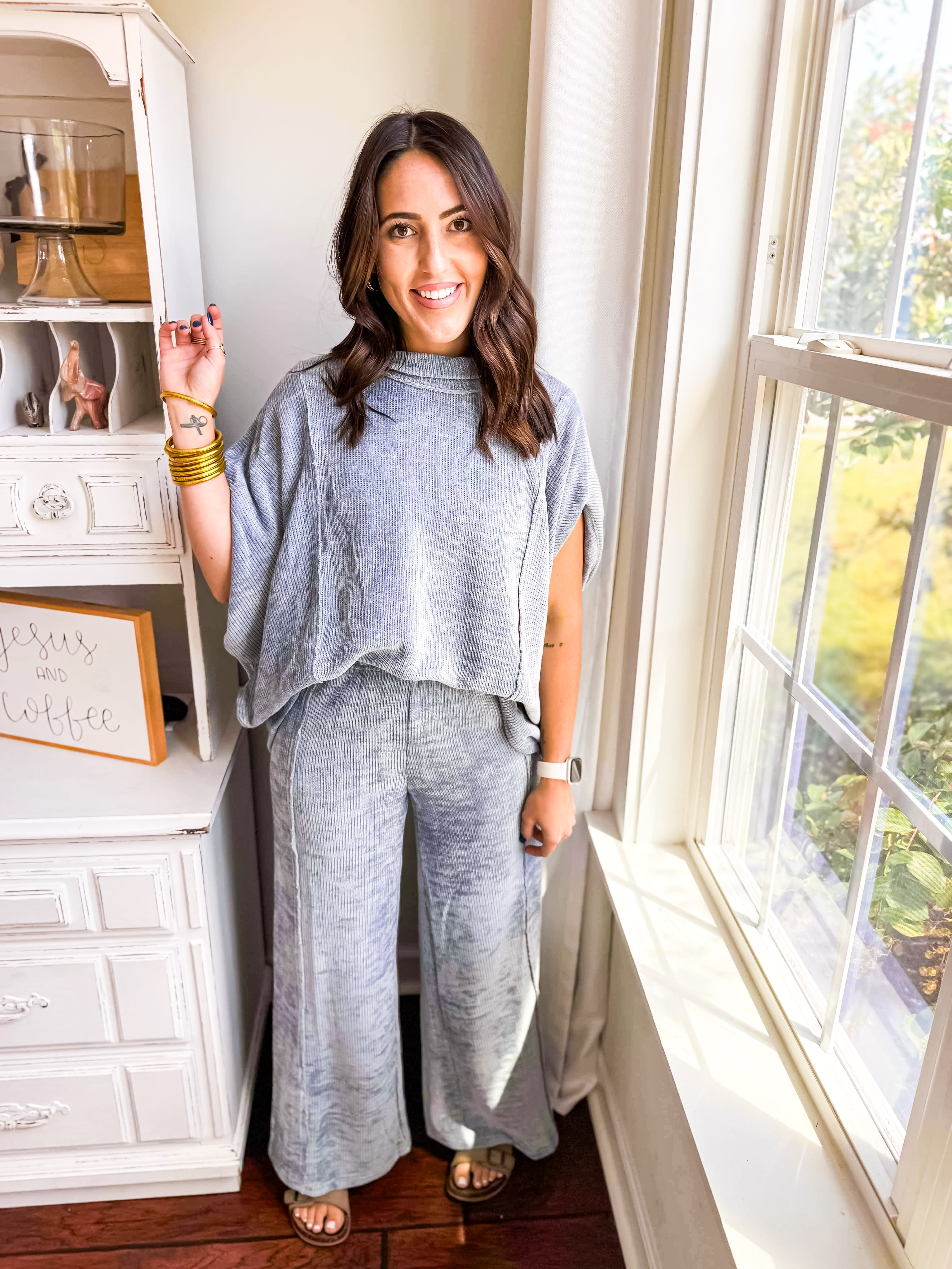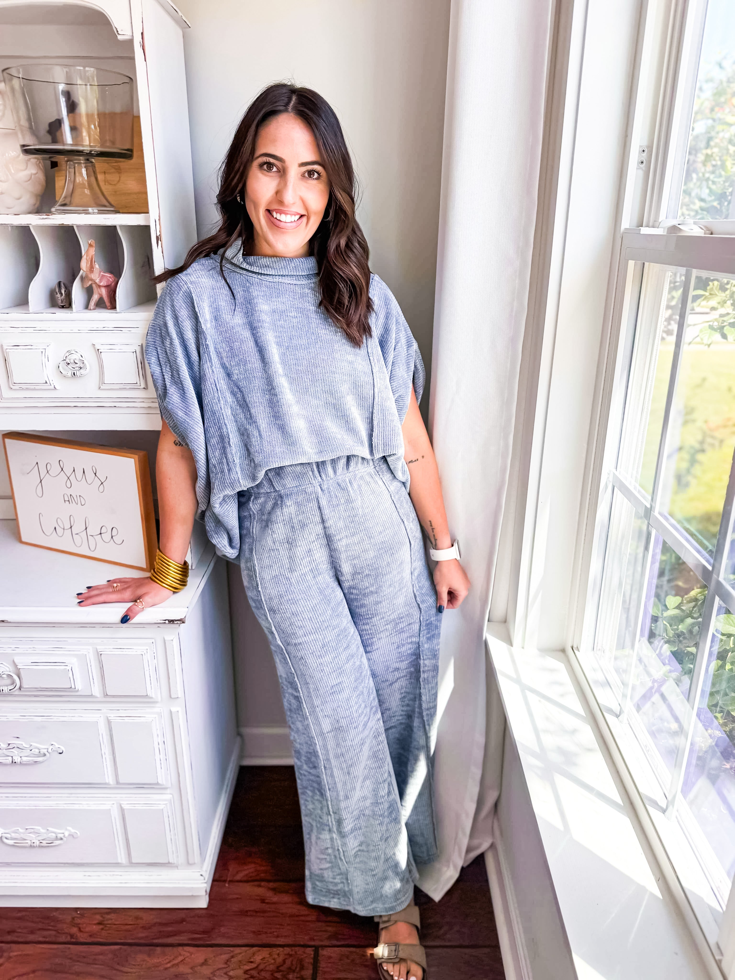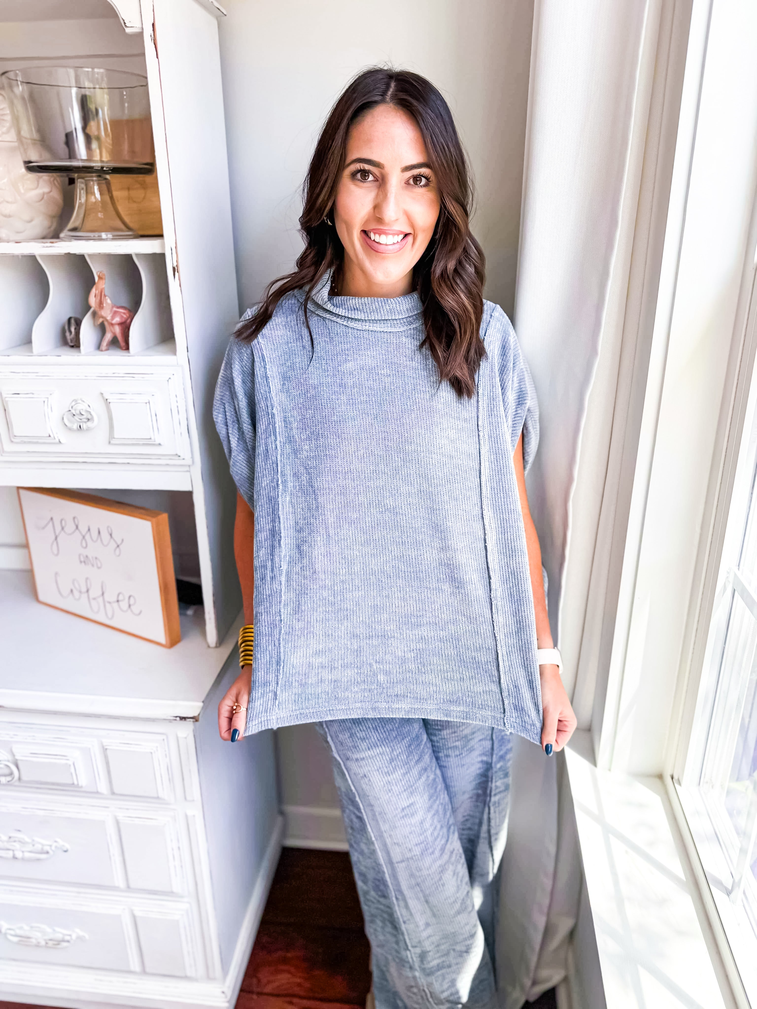 Elevate your style with the Make It Right Set, crafted from ultra-soft chenille in a muted denim blue / grey hue. The top features a chic cowl neck with a poncho-inspired silhouette, adding a touch of effortless elegance to your look. Paired with matching pants that boast a slightly cropped length and unique out seam details, this set offers versatility like no other. Whether you wear them together for a coordinated ensemble or mix and match for endless outfit options, the Make It Right Set is your new go-to for comfort and style.