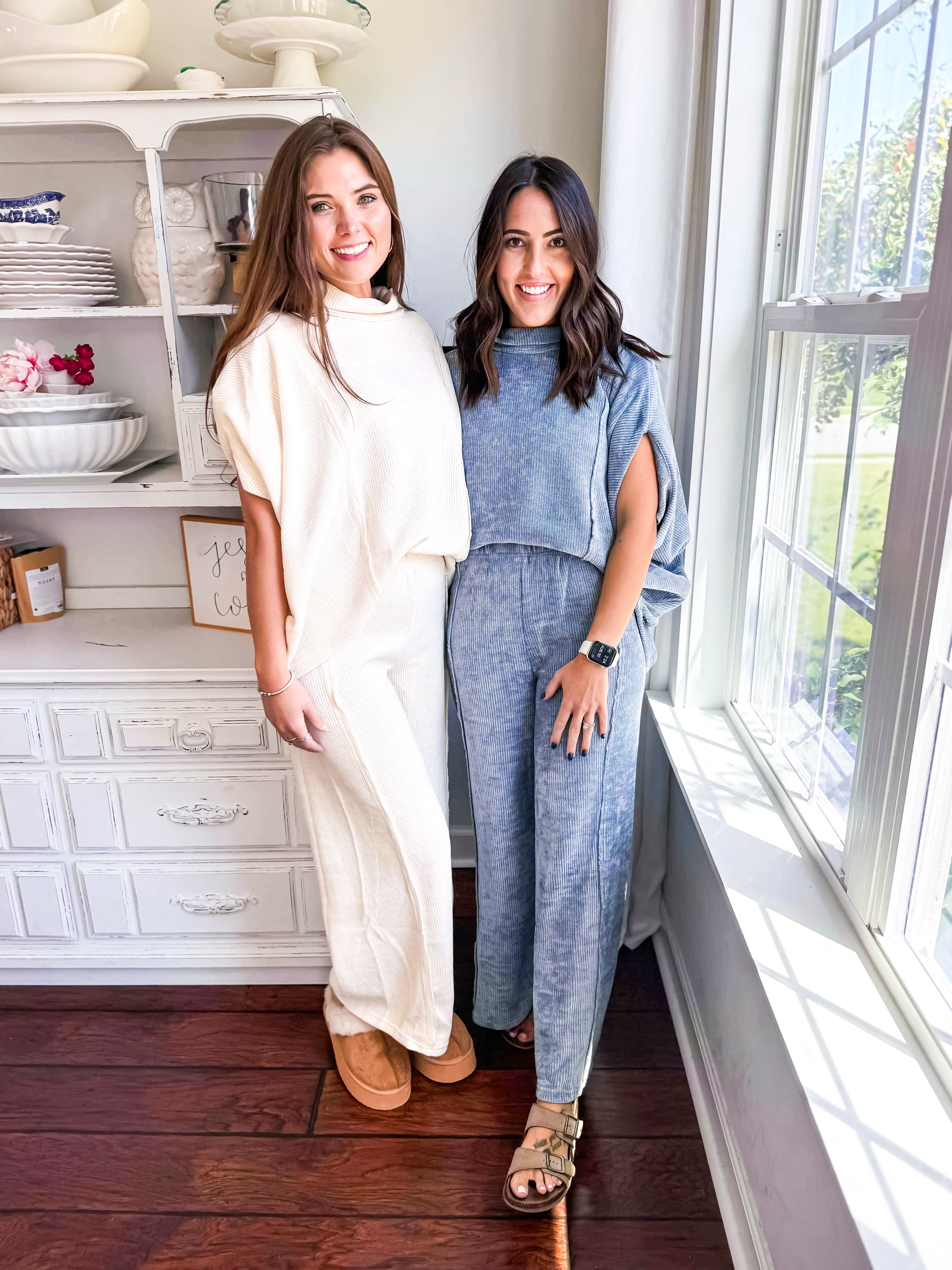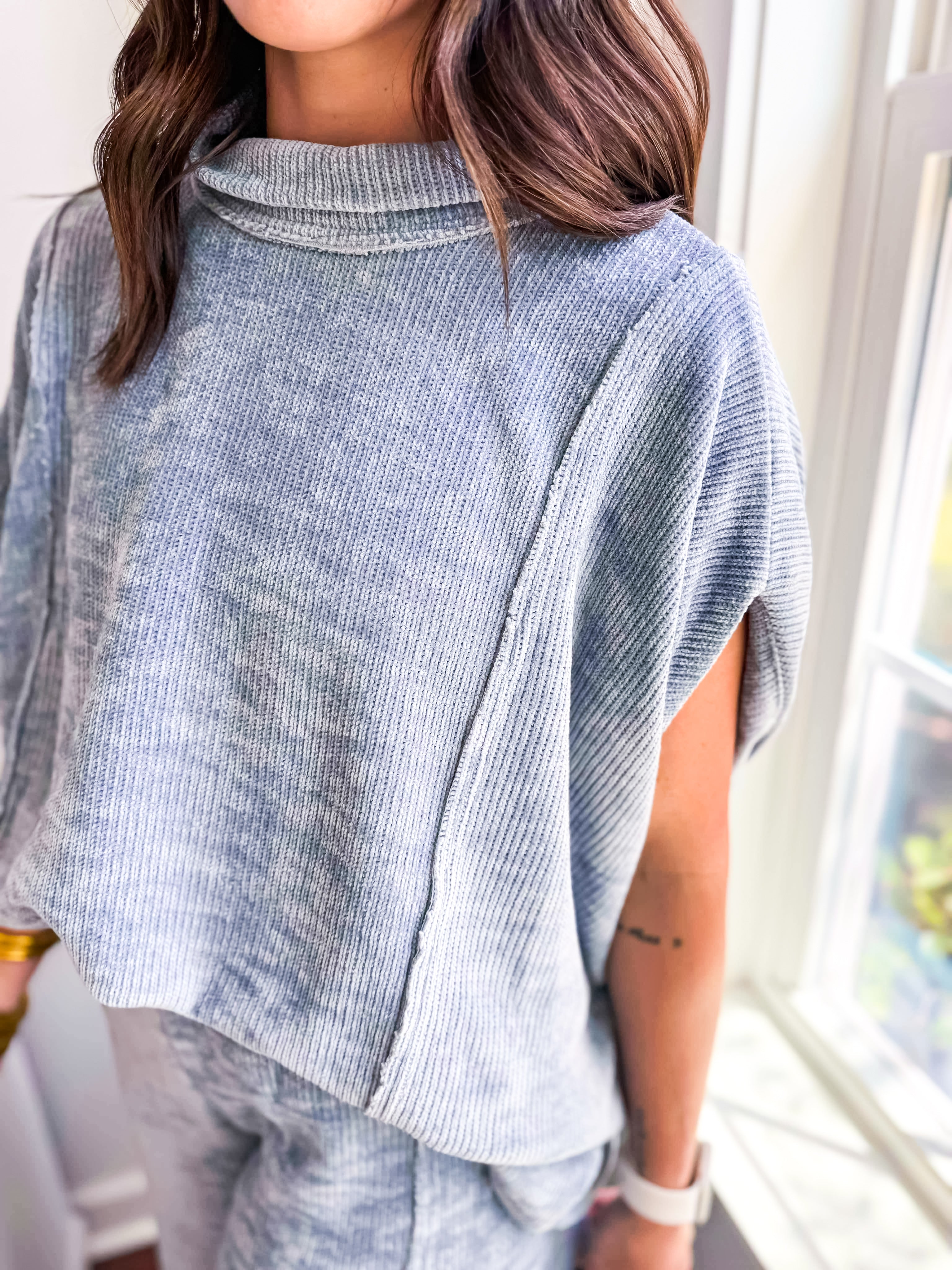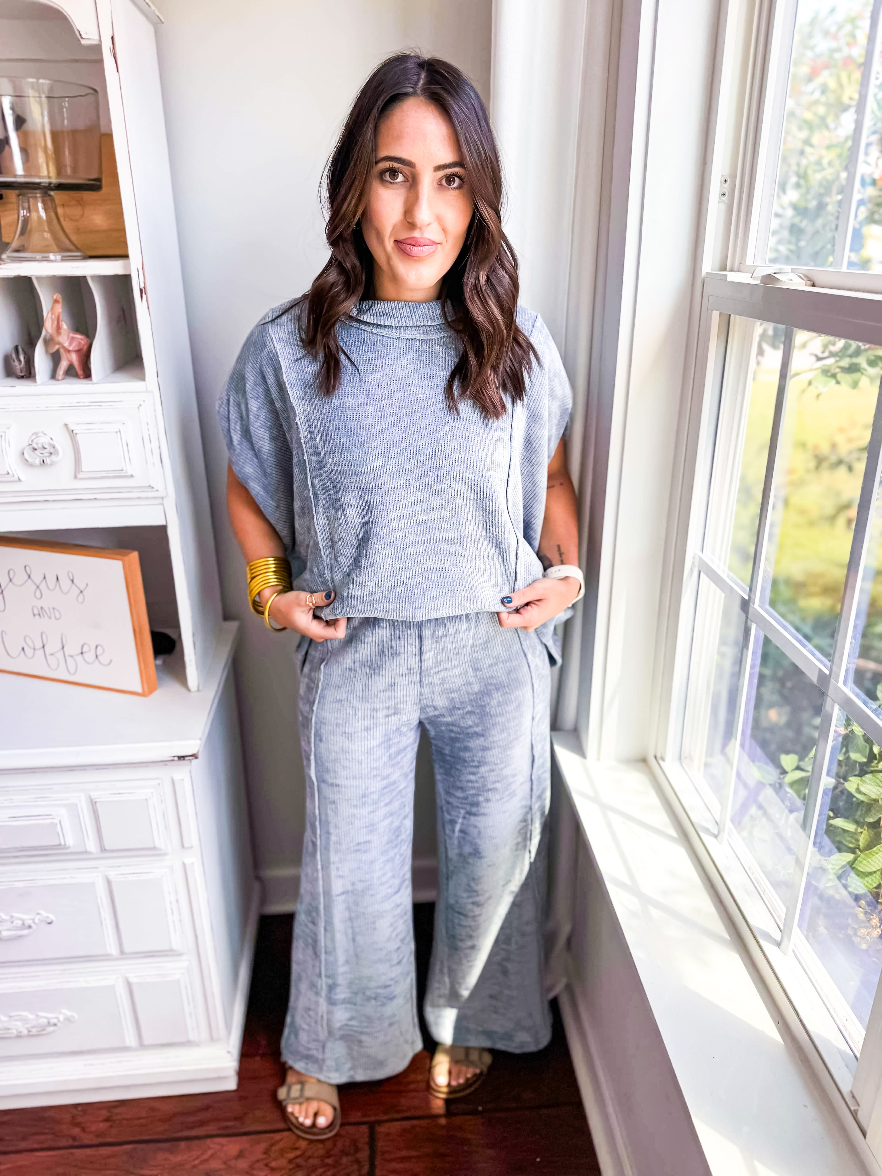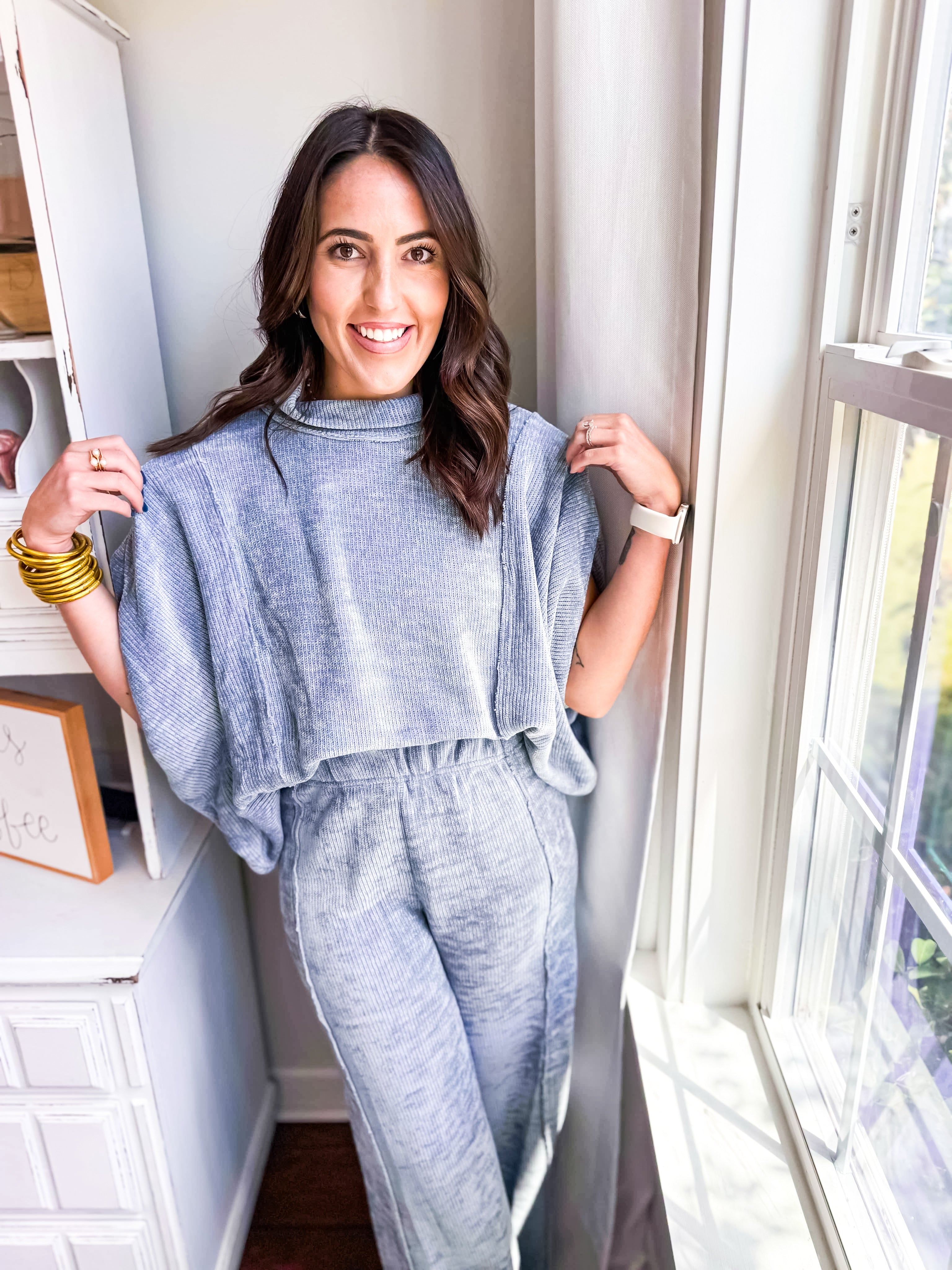 Elevate your style with the Make It Right Set, crafted from ultra-soft chenille in a muted denim blue / grey hue. The top features a chic cowl neck with a poncho-inspired silhouette, adding a touch of effortless elegance to your look. Paired with matching pants that boast a slightly cropped length and unique out seam details, this set offers versatility like no other. Whether you wear them together for a coordinated ensemble or mix and match for endless outfit options, the Make It Right Set is your new go-to for comfort and style.