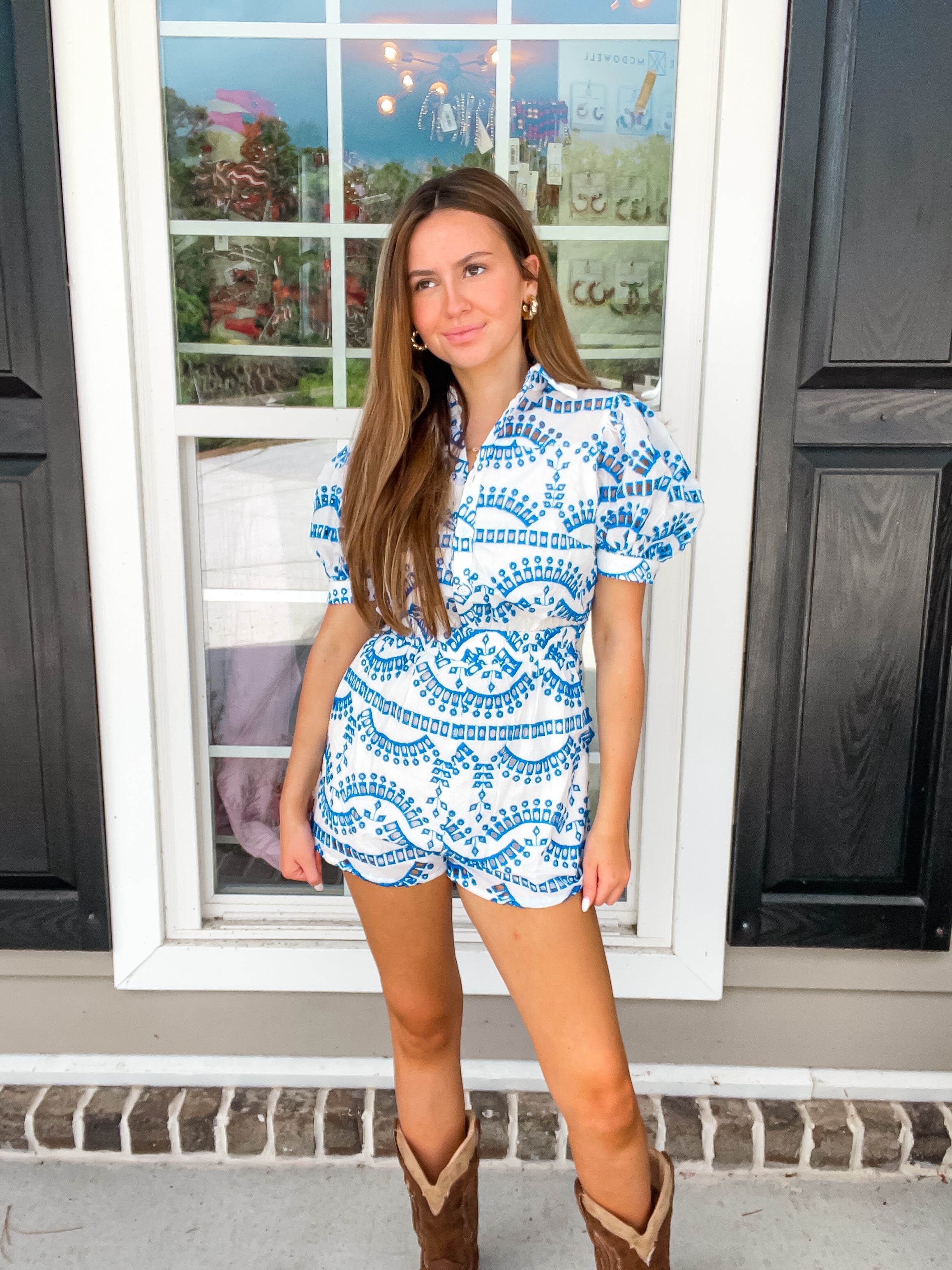 Eyelet Lace Puff Sleeve Romper 100% COTTON Spring/Summer BLUE/WHITE
