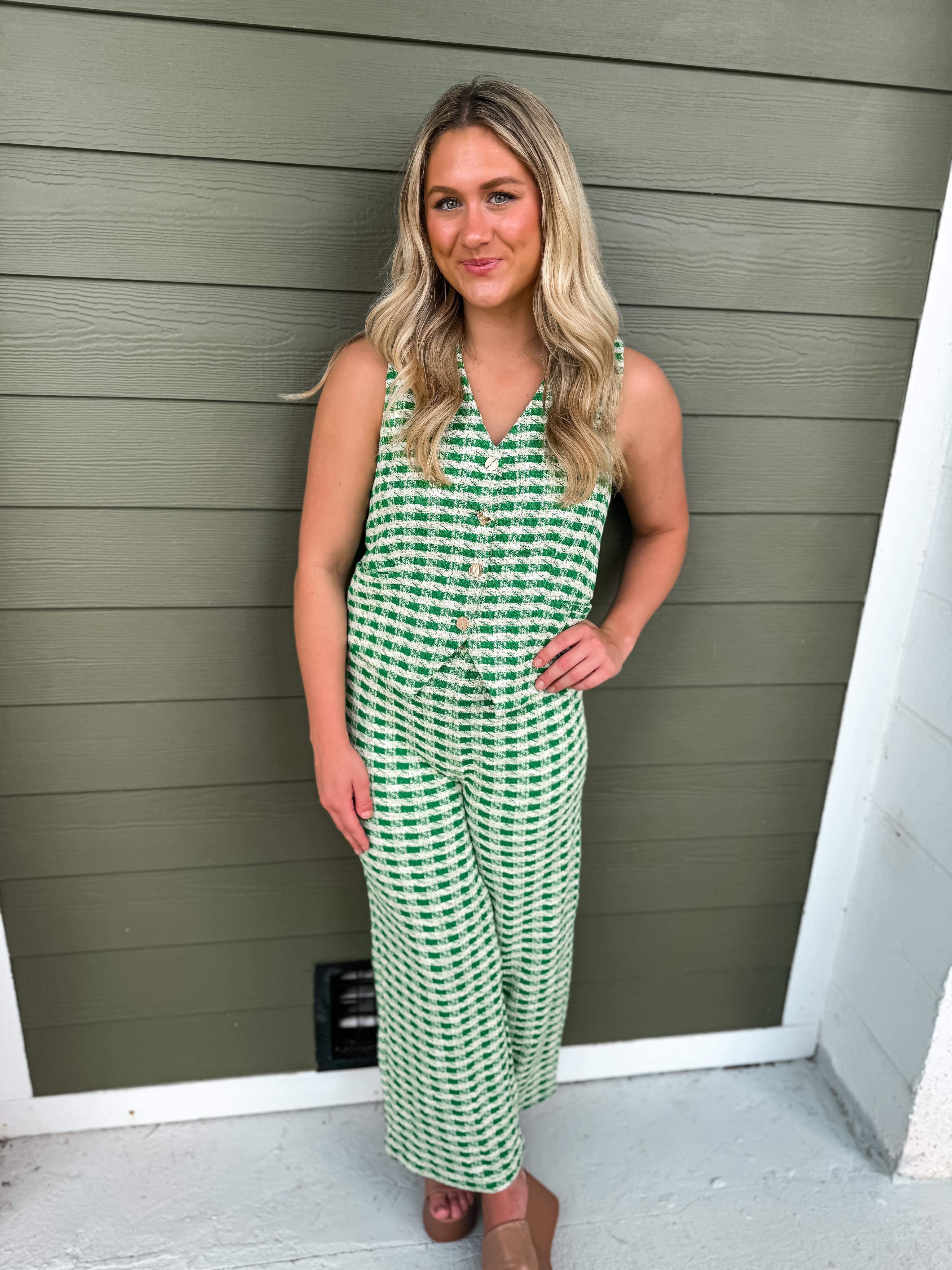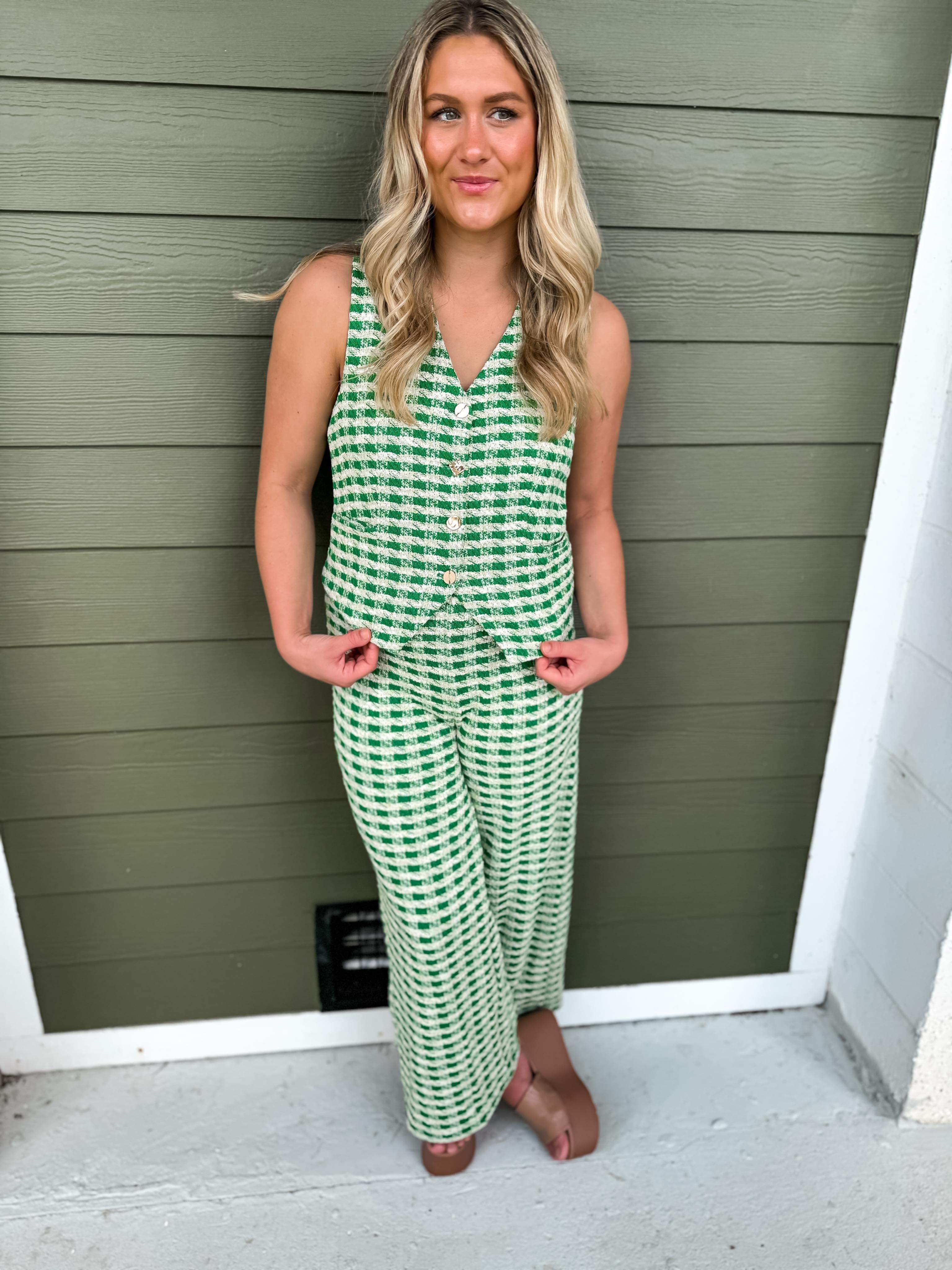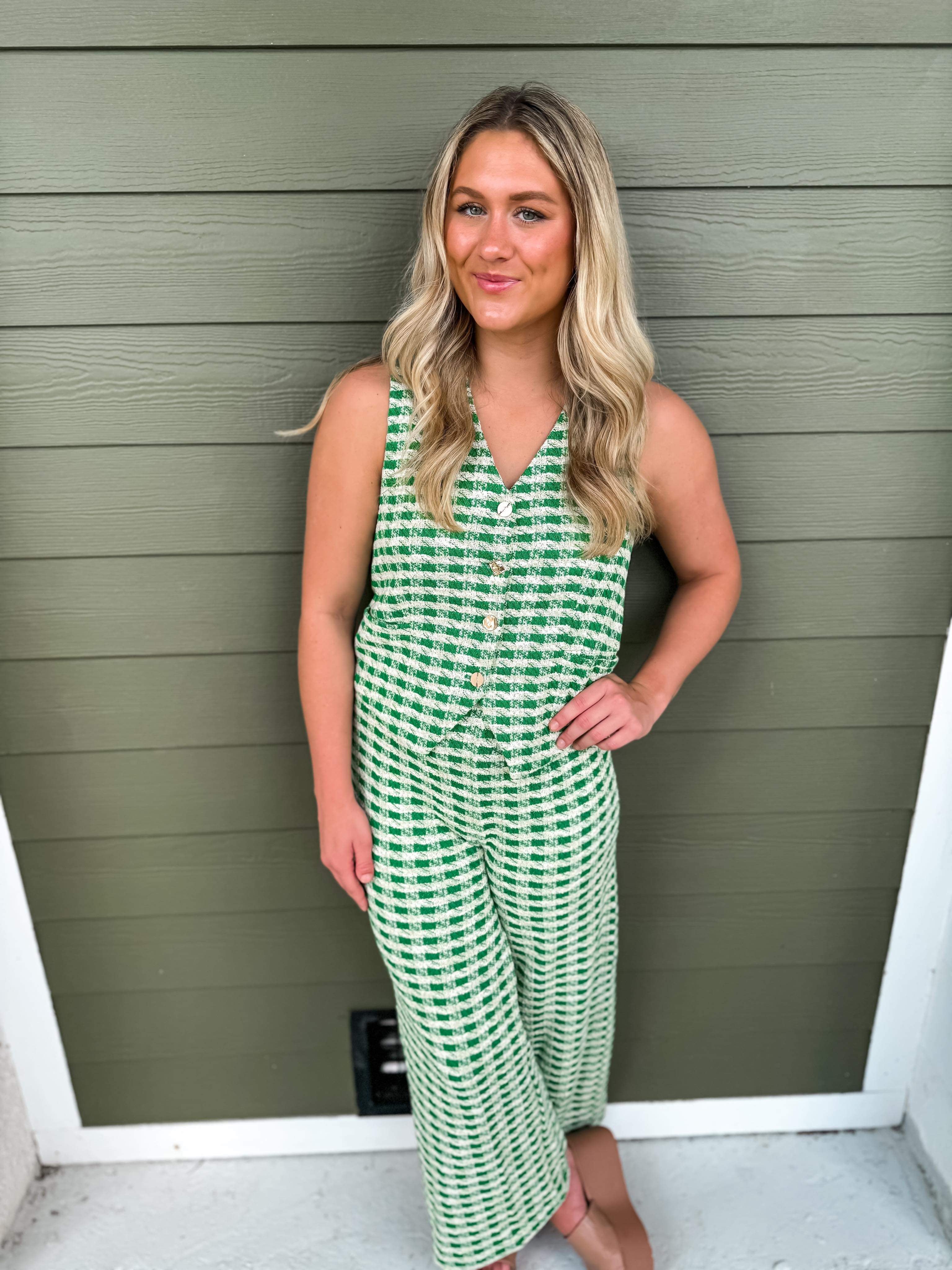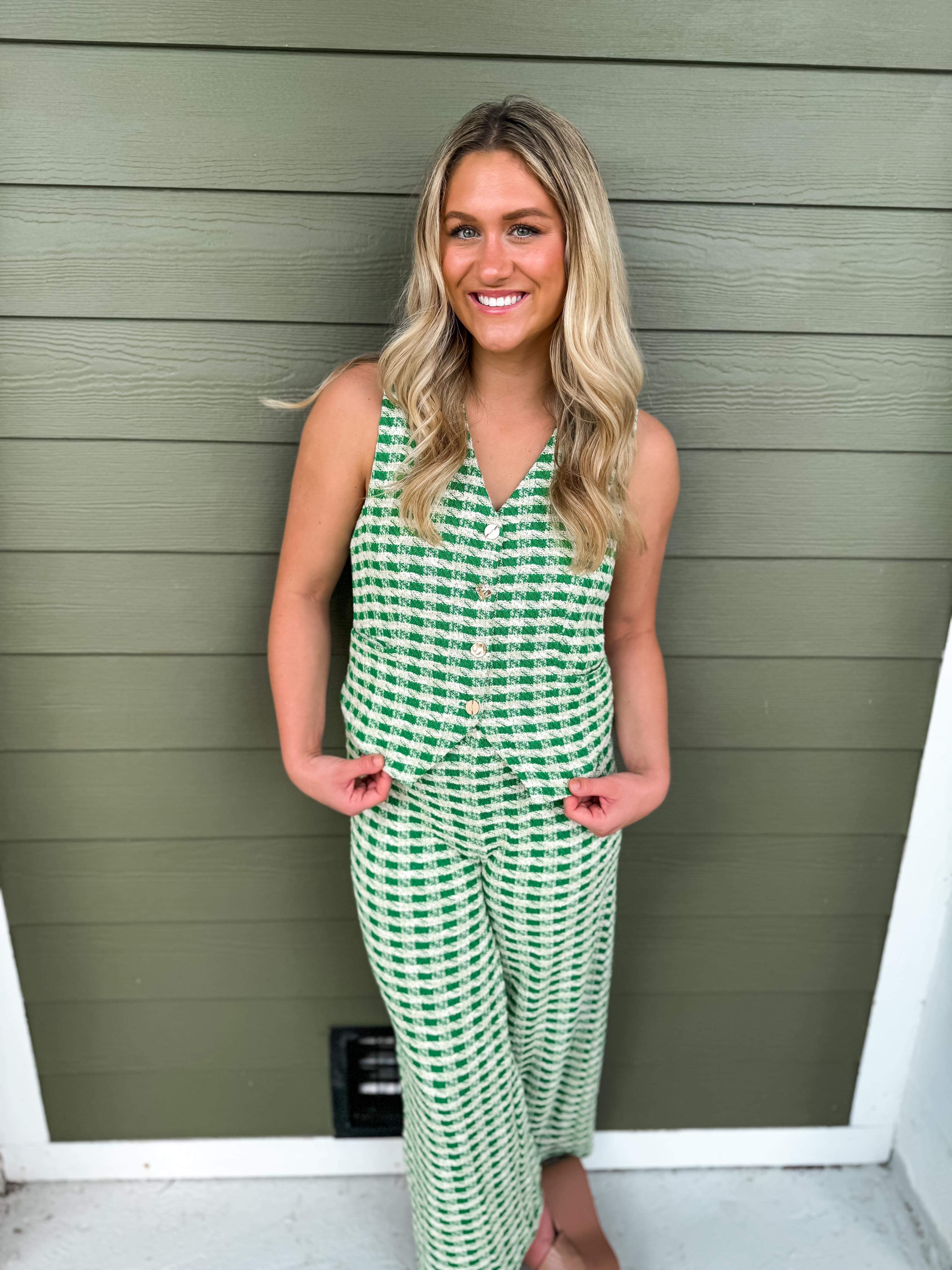 Tweed v-neck cropped sleeveless vest featuring gold metallic thread. Multi button detail. Lined. Knit. Non-sheer. Lightweight.