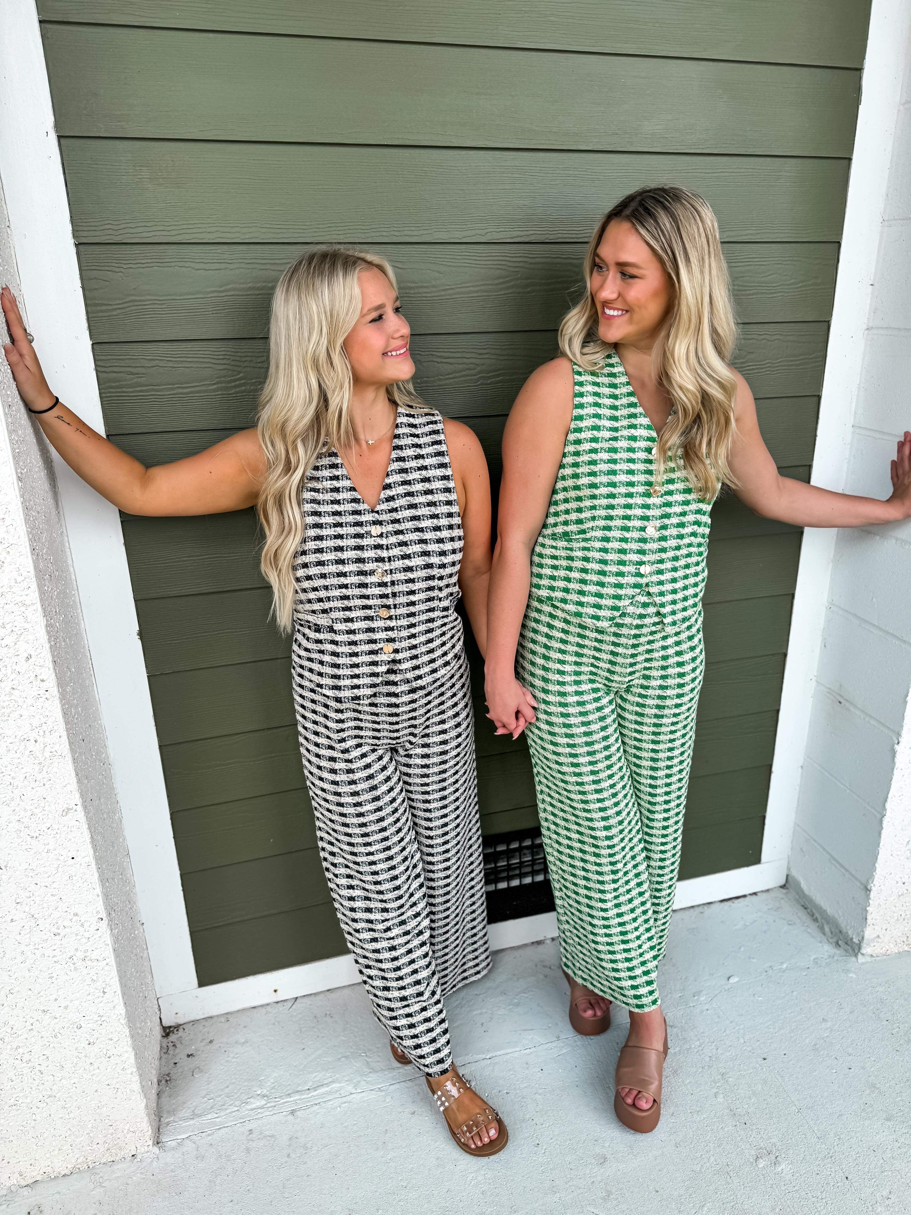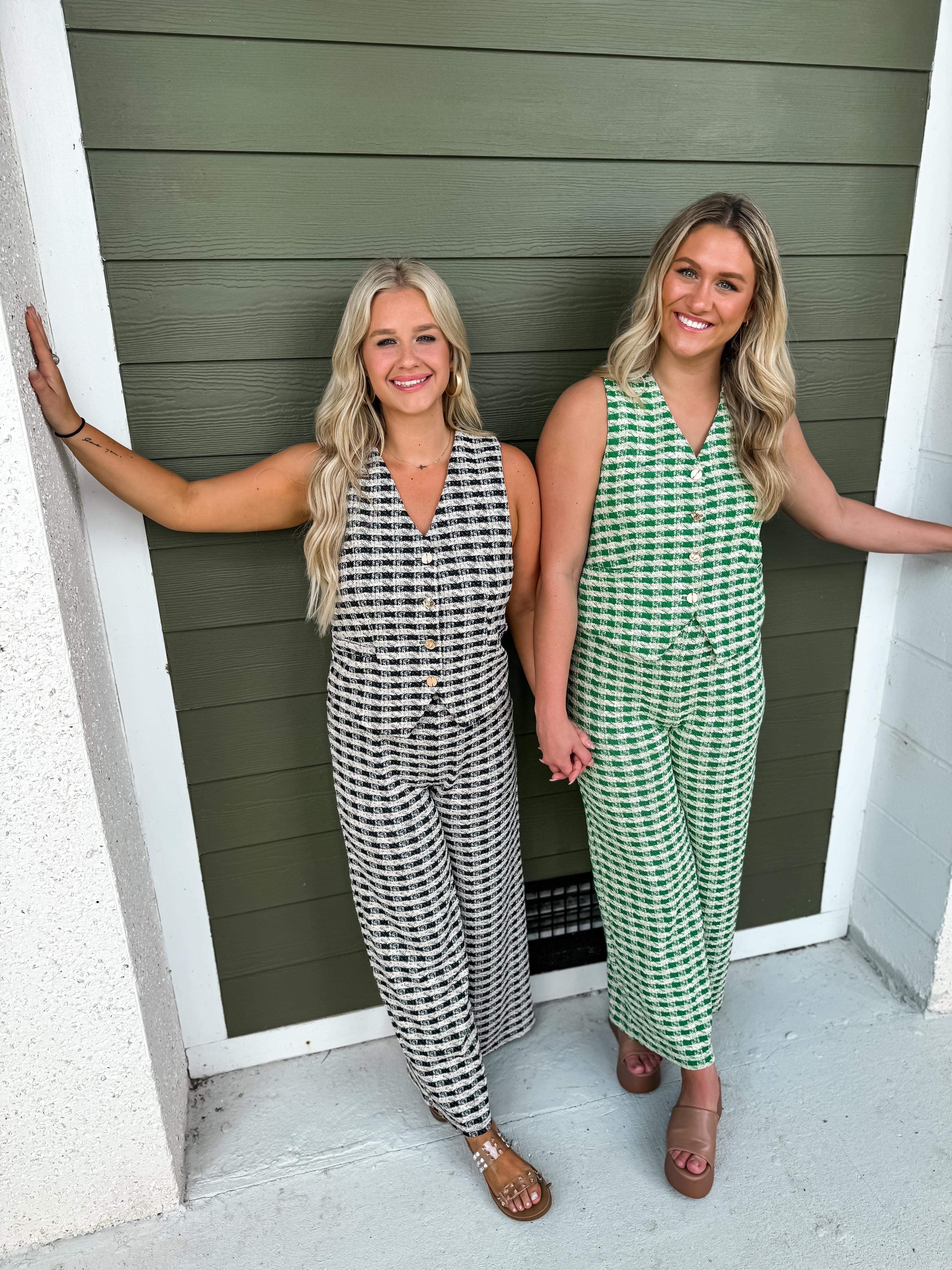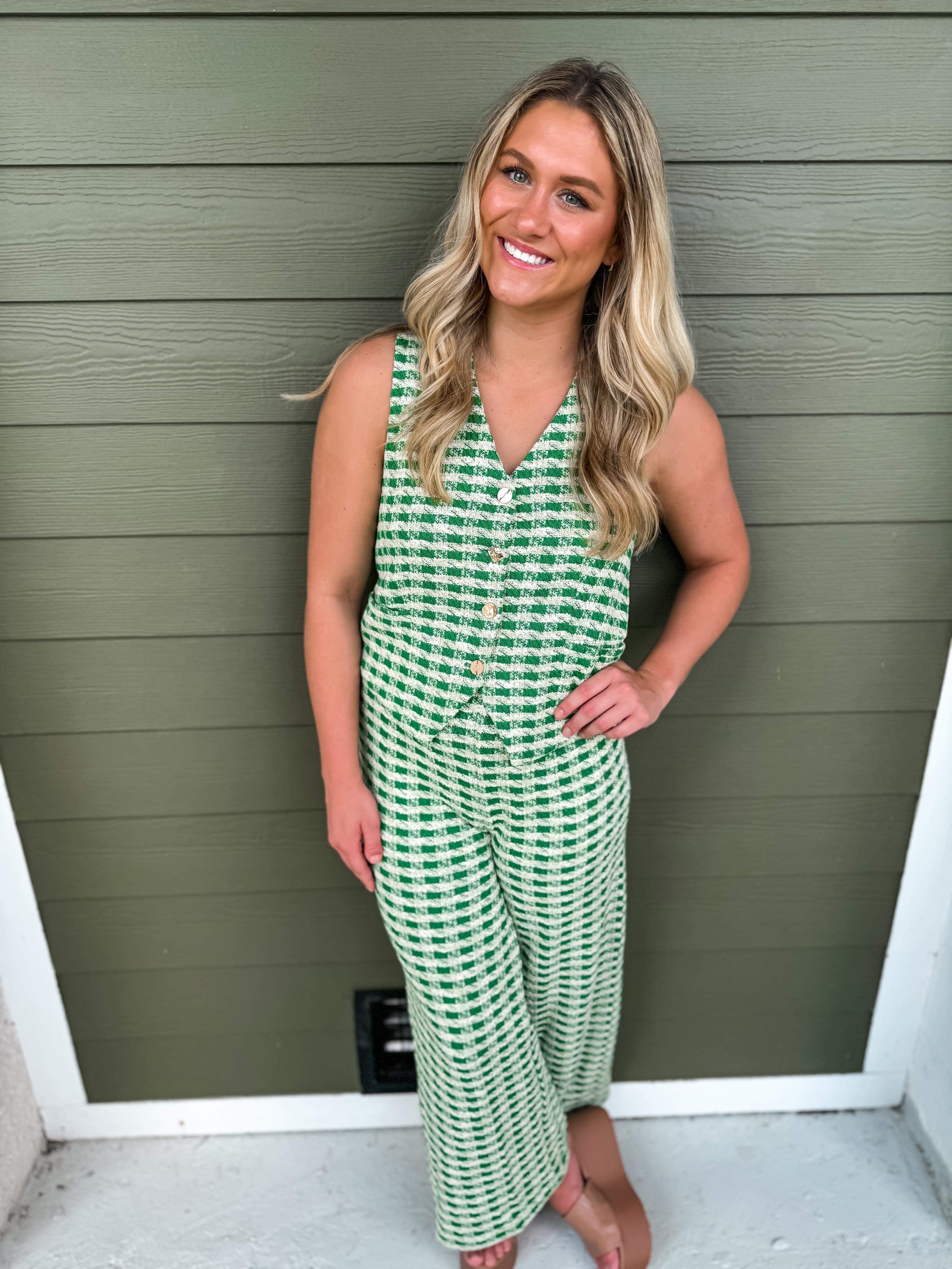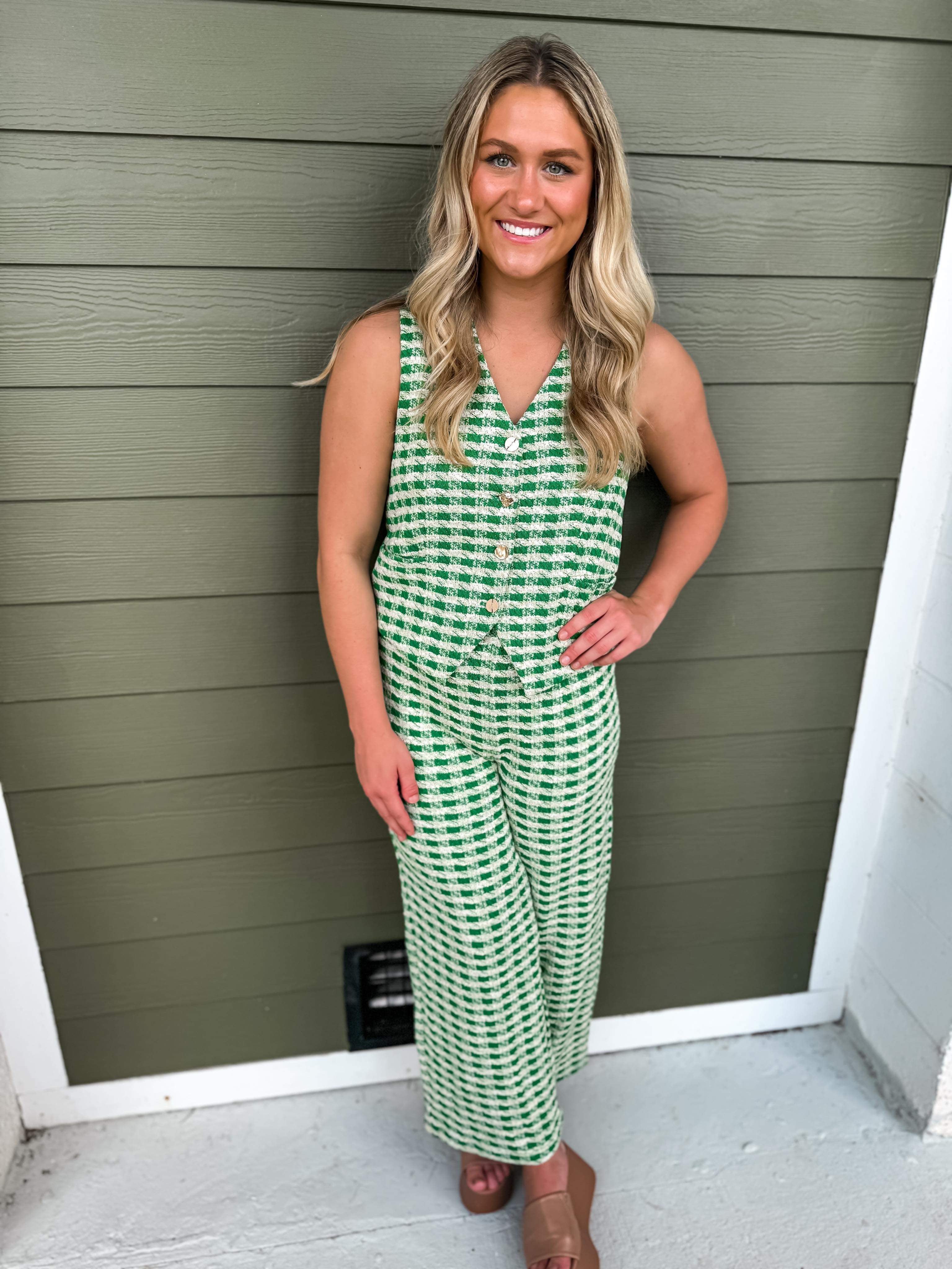 Tweed v-neck cropped sleeveless vest featuring gold metallic thread. Multi button detail. Lined. Knit. Non-sheer. Lightweight.