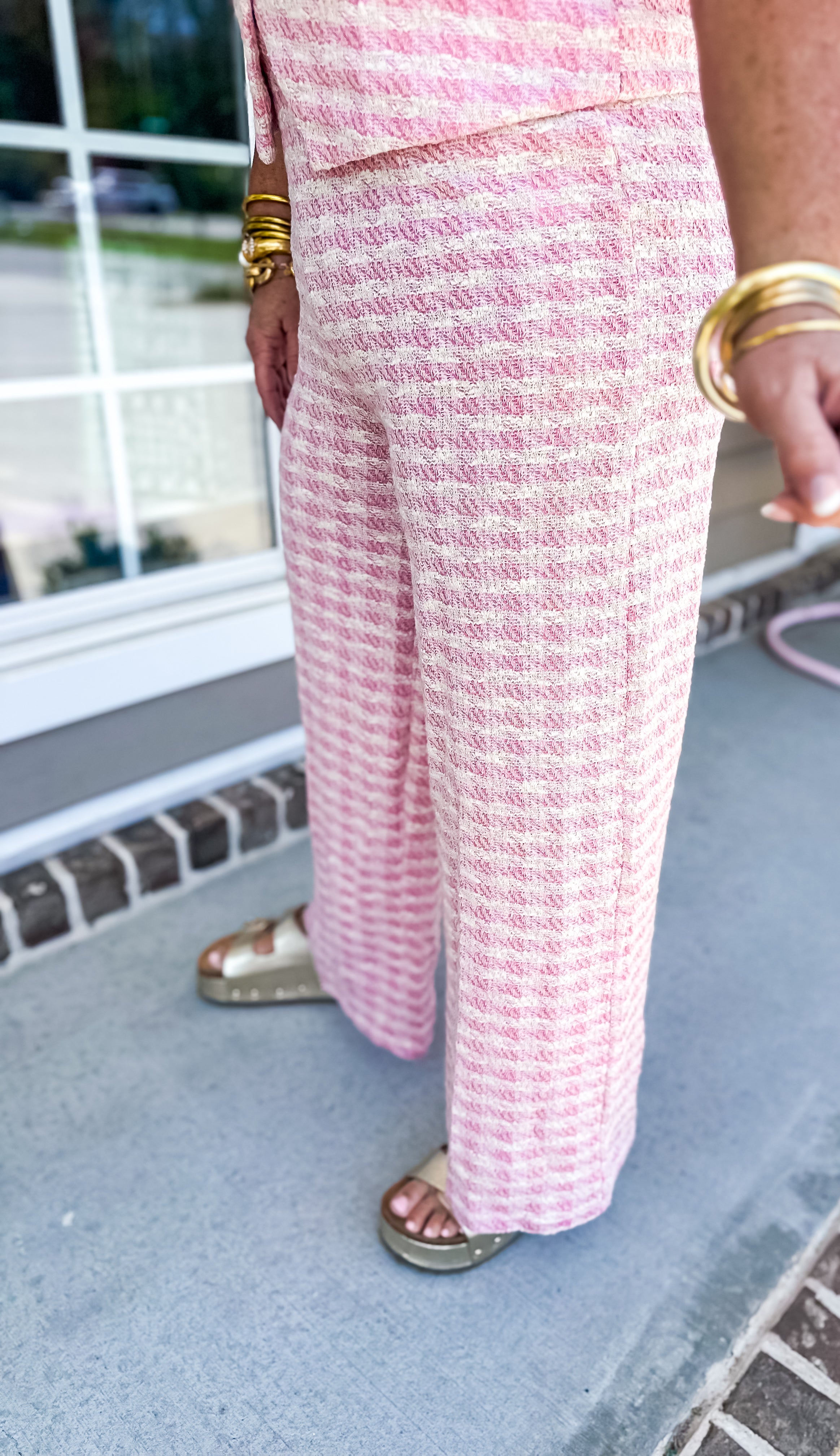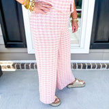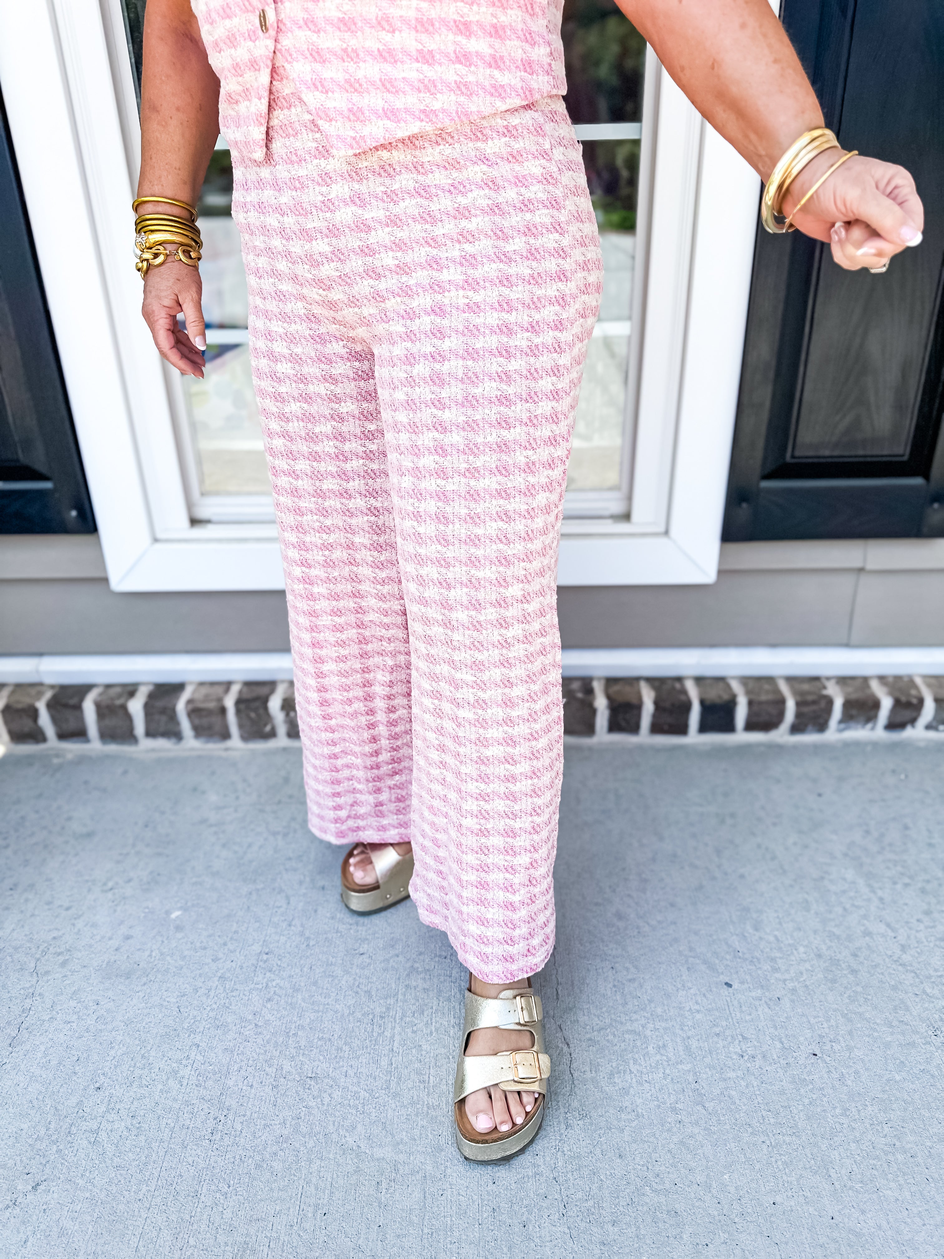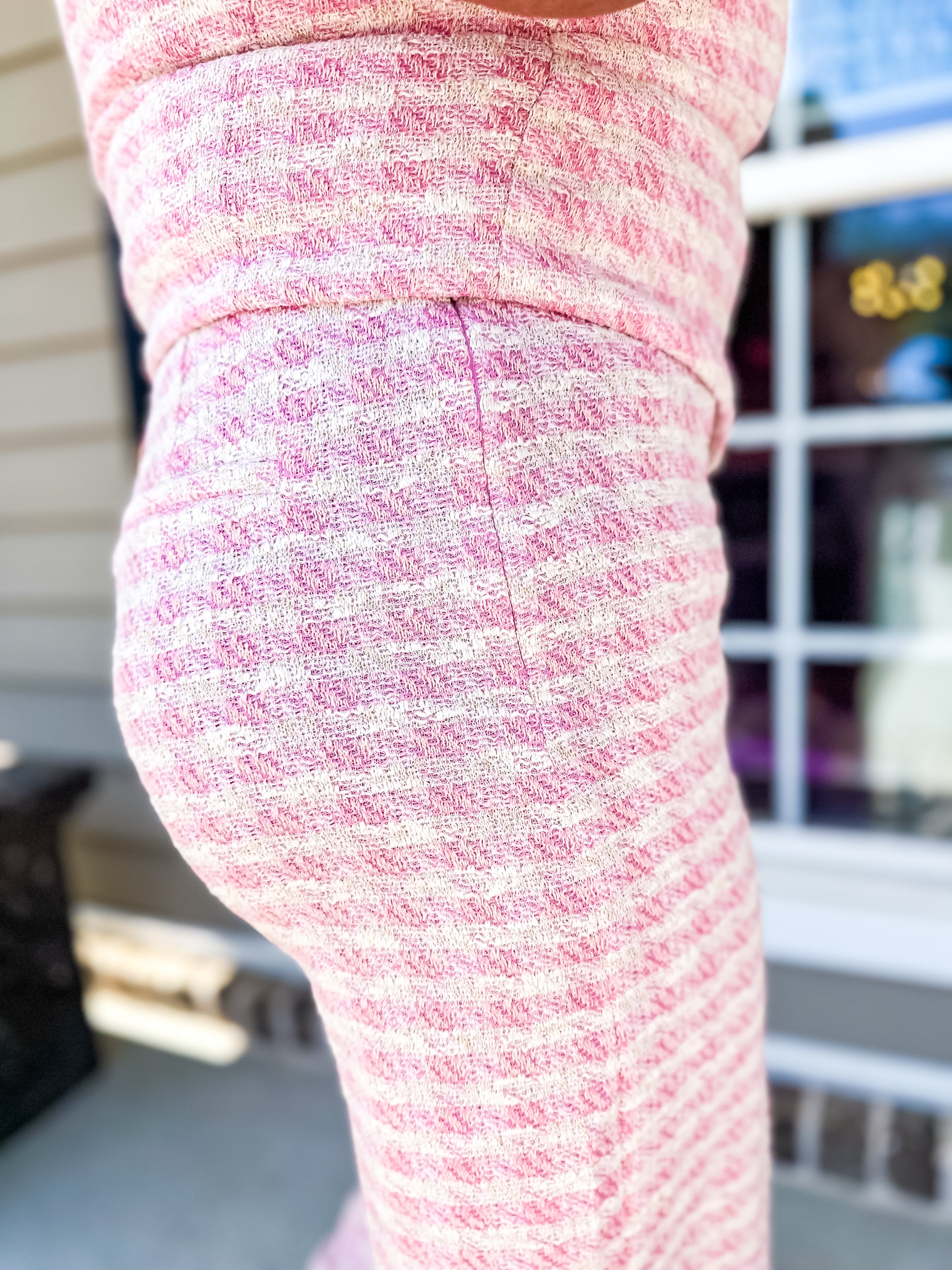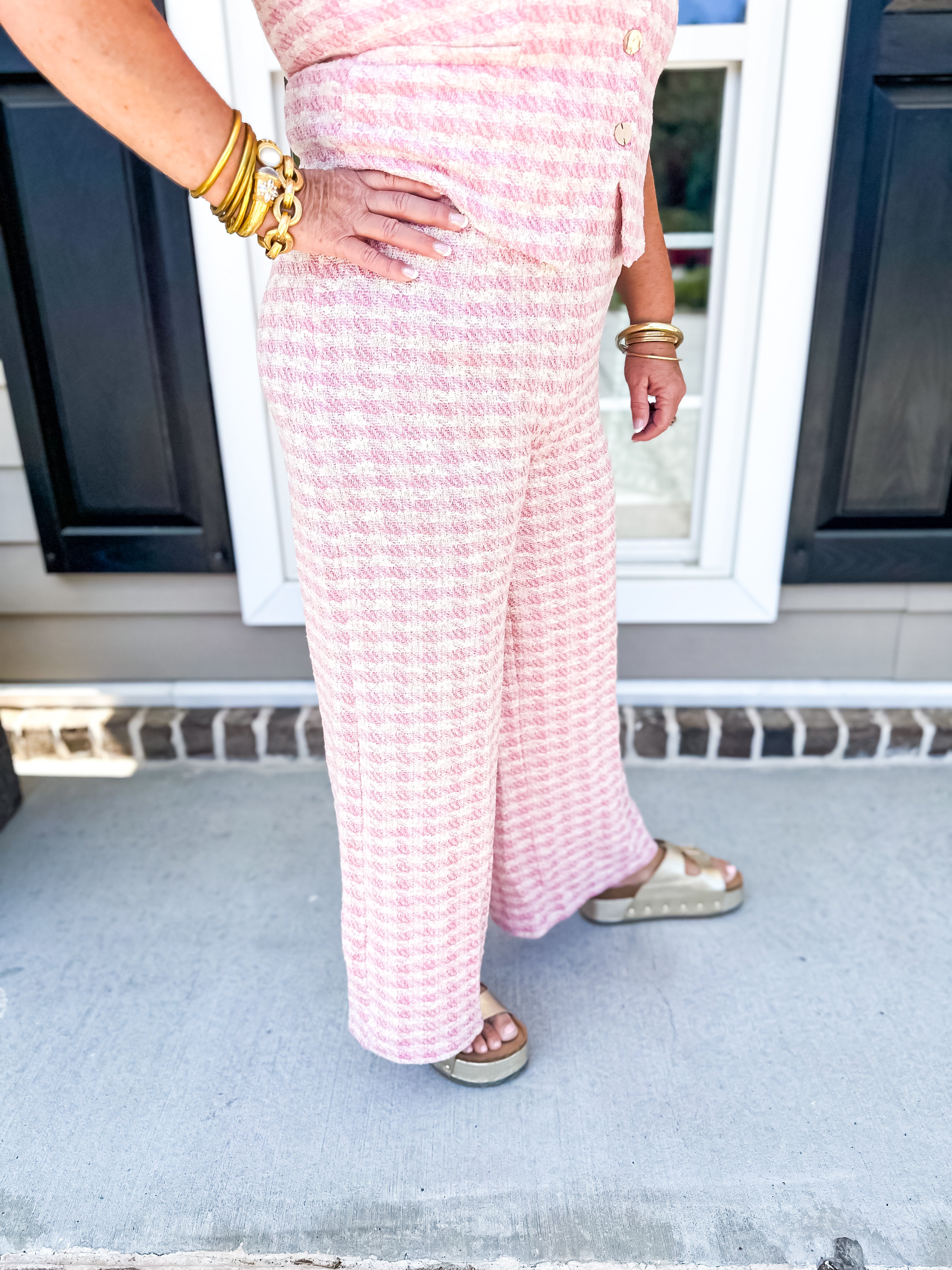 Tweed high waisted wide leg pants featuring gold metallic thread. Zipper closure at side. Elastic waistband. Unlined. Knit. Non-sheer. Lightweight.