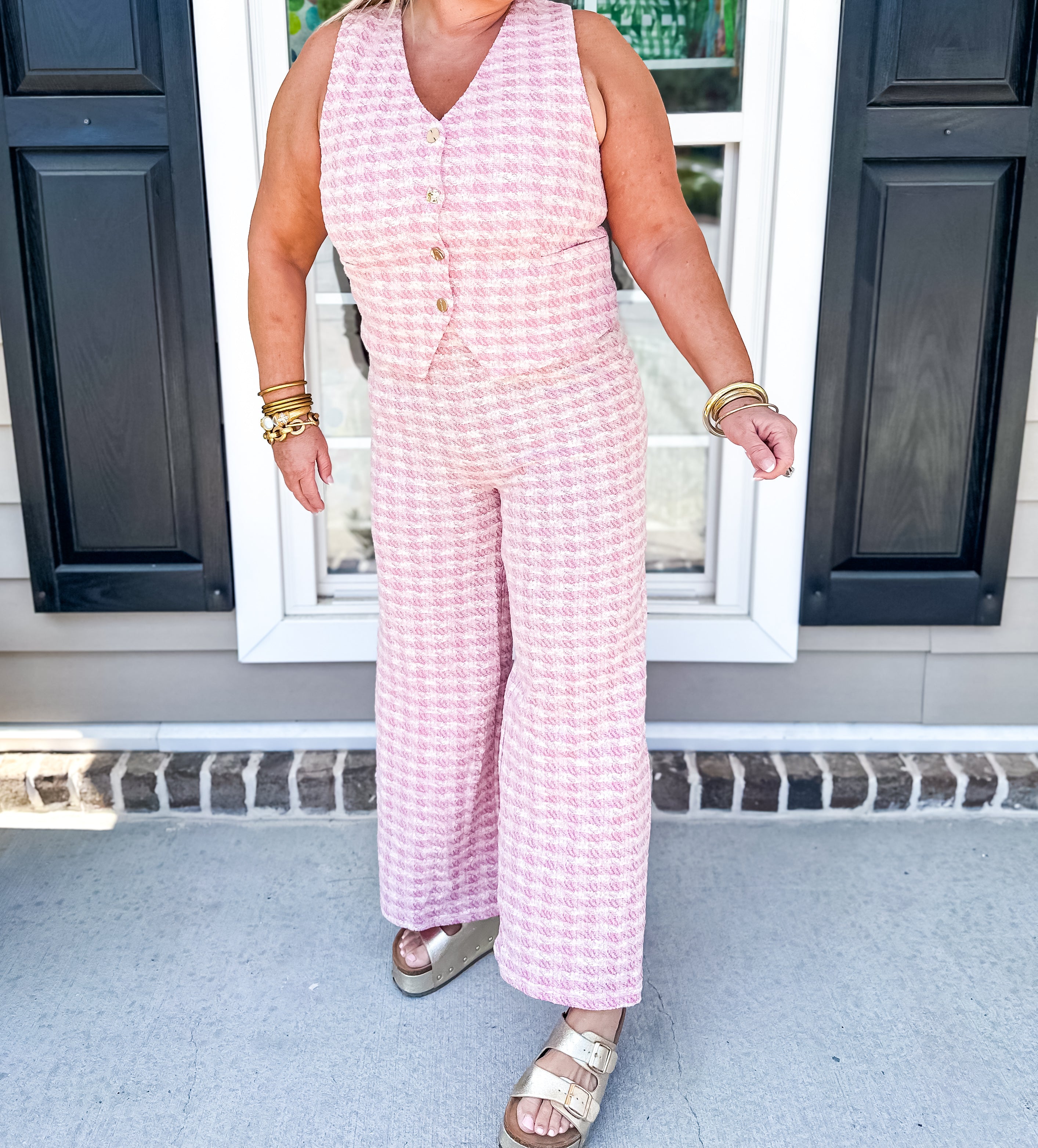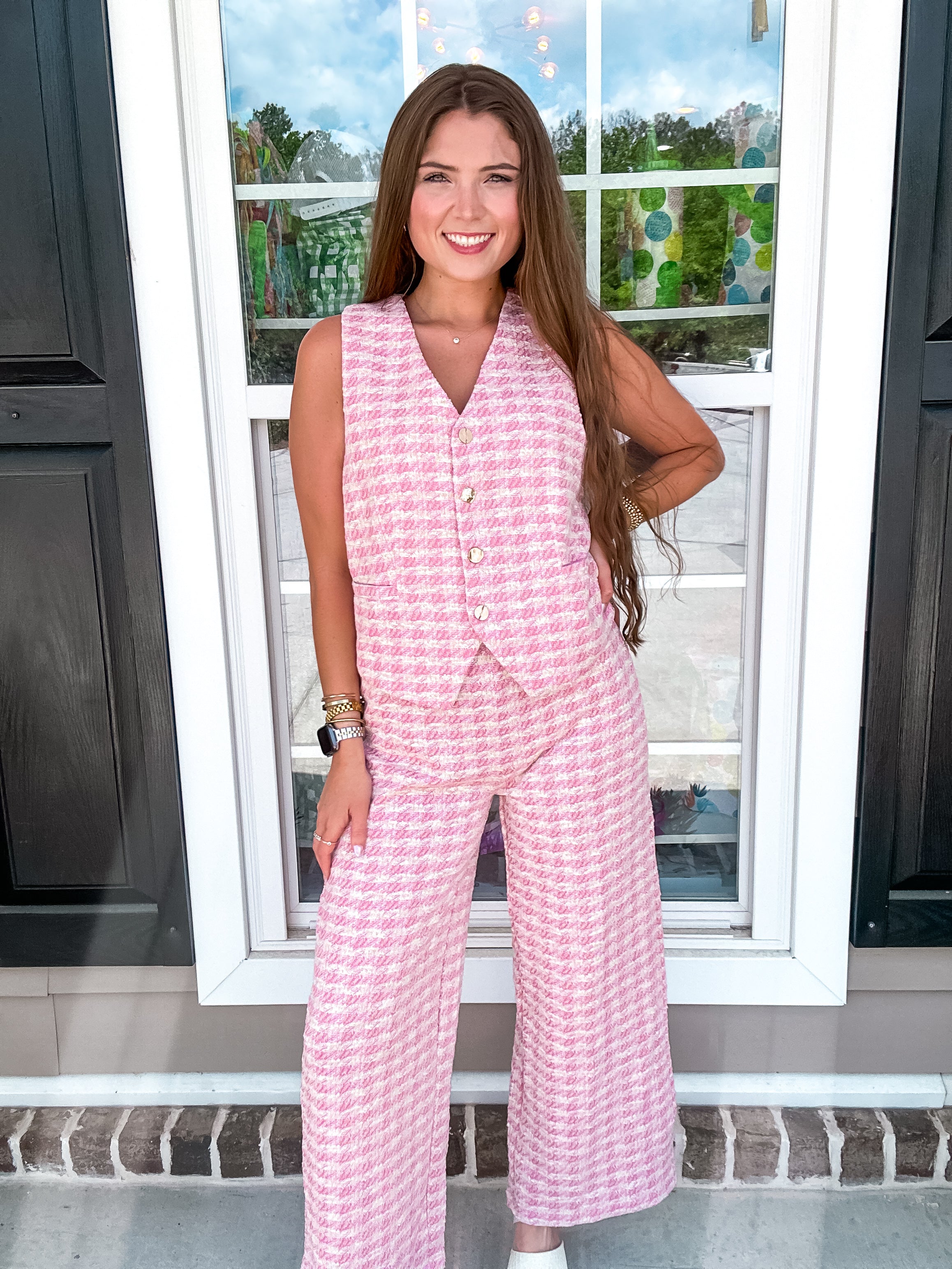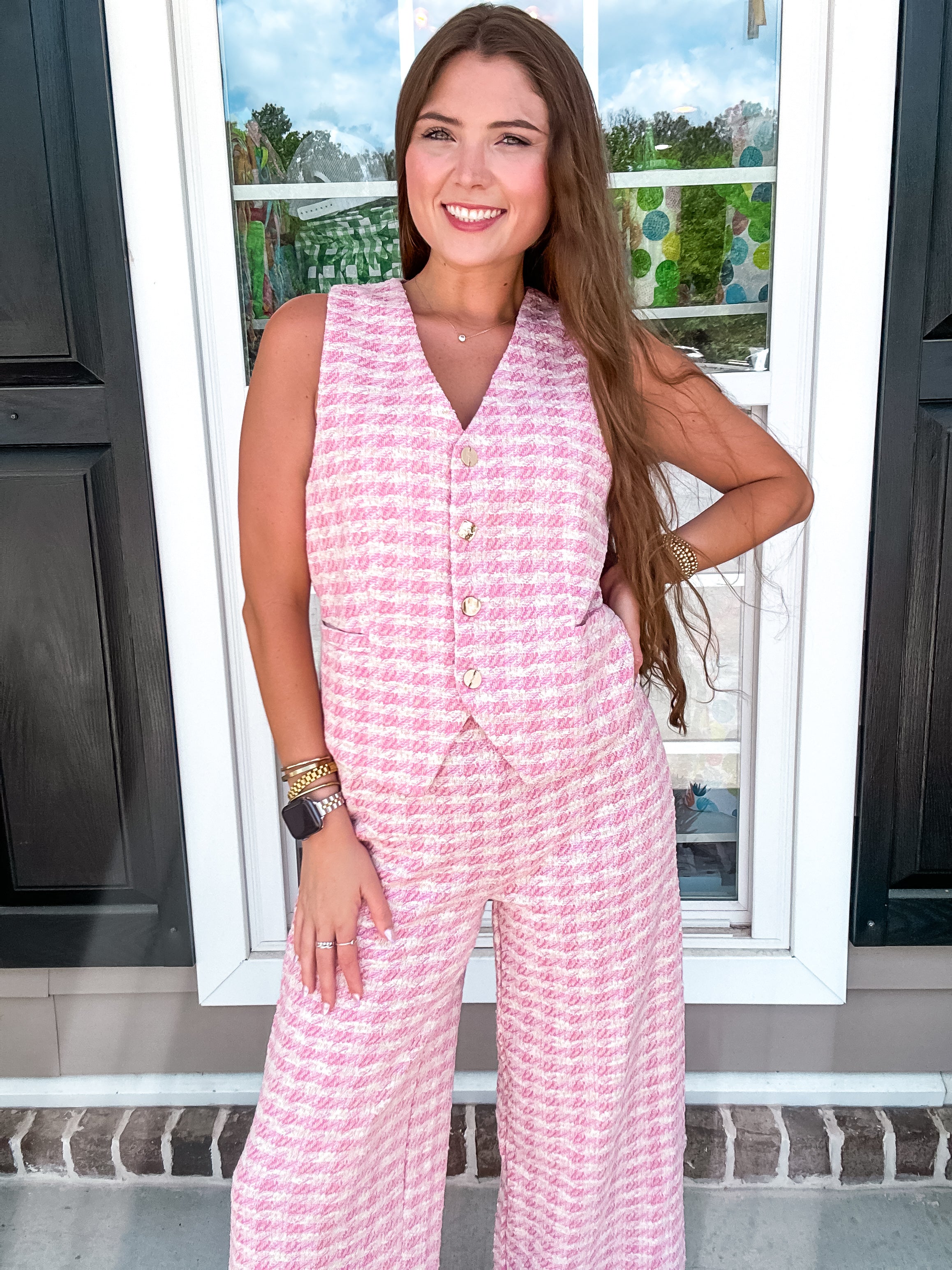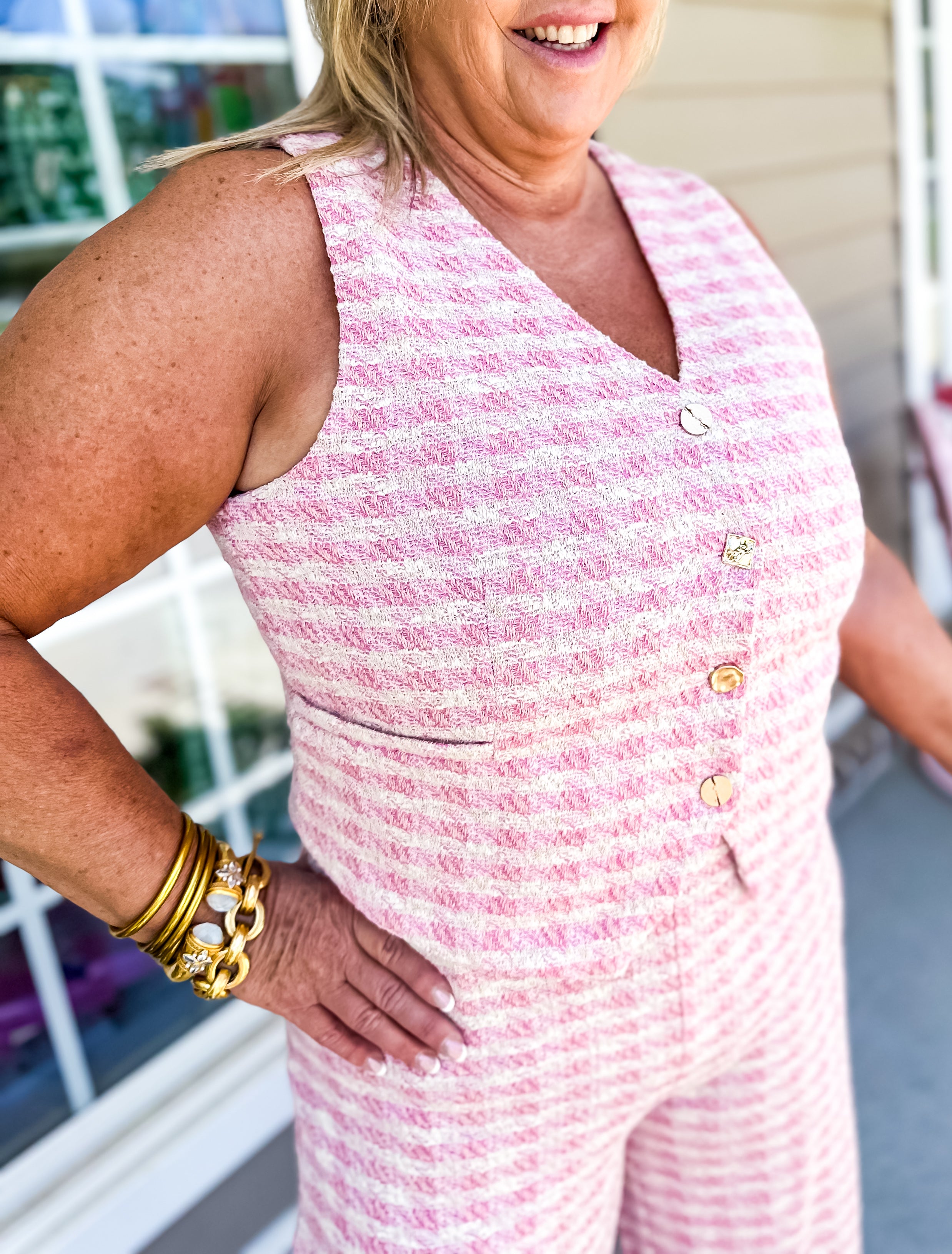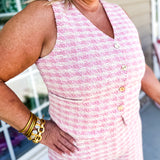 Tweed v-neck cropped sleeveless vest featuring gold metallic thread. Multi button detail. Lined. Knit. Non-sheer. Lightweight.
