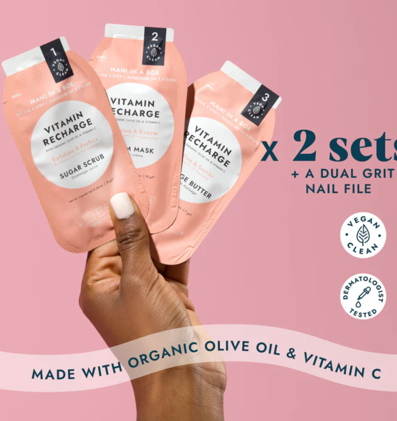 Make every self-care moment count with Mani Moments, our newest manicure kit. Mani Moments comes complete with 2 sets of Vitamin Recharge Mani in a Box 3 Step and a dual grit Zebra Nail File, so you have everything you need to give yourself a cleansing, hydrating mani right at home.
