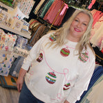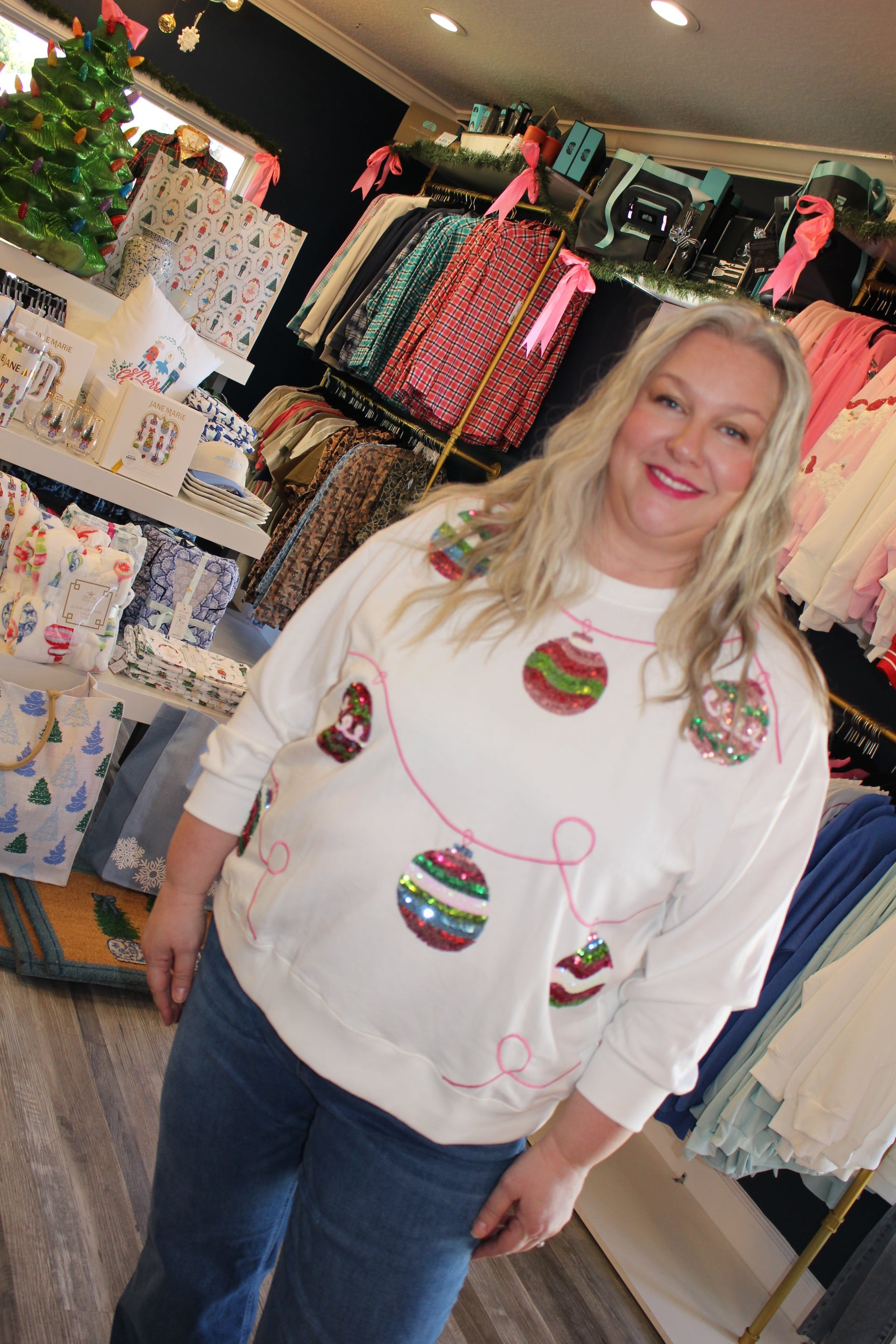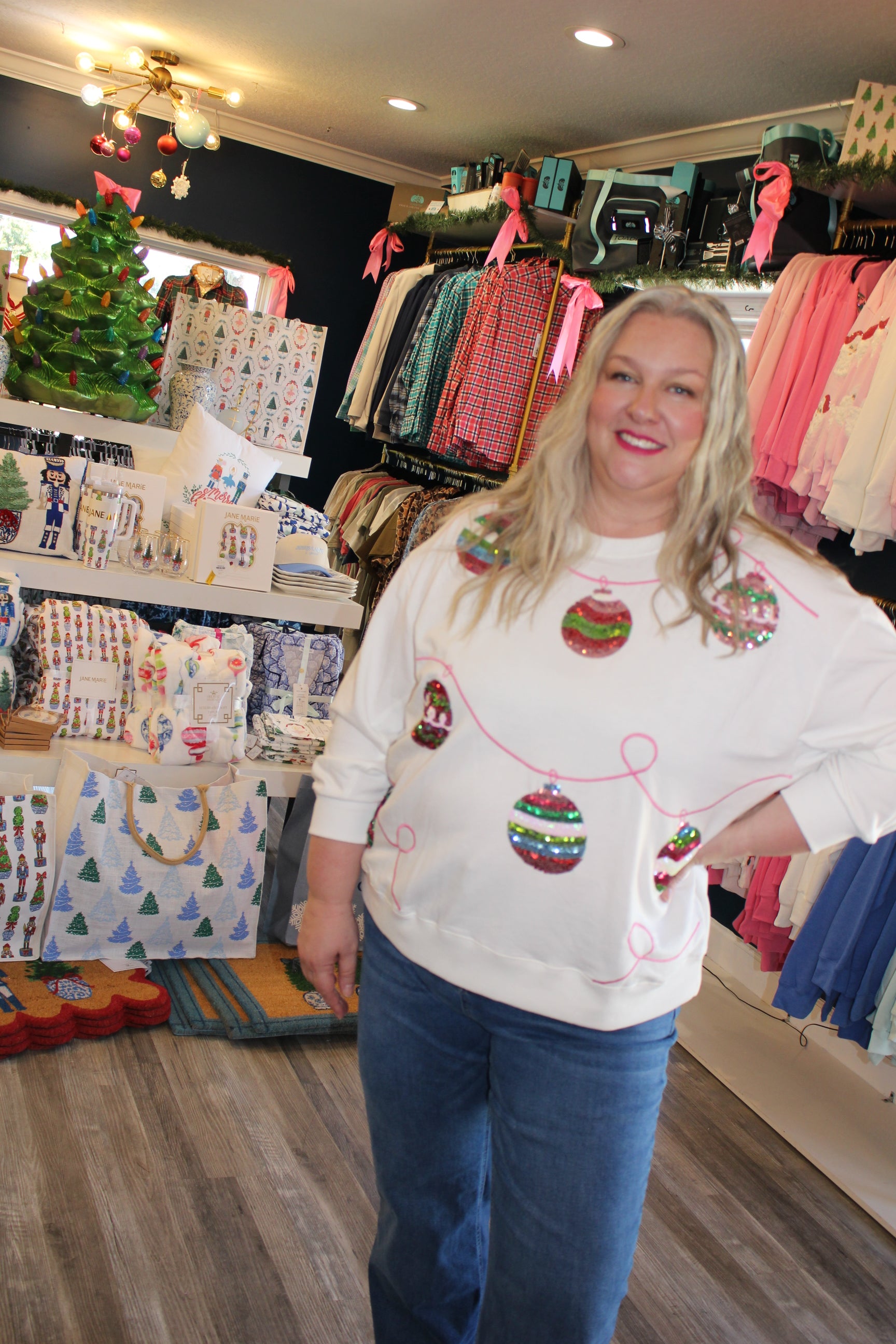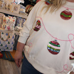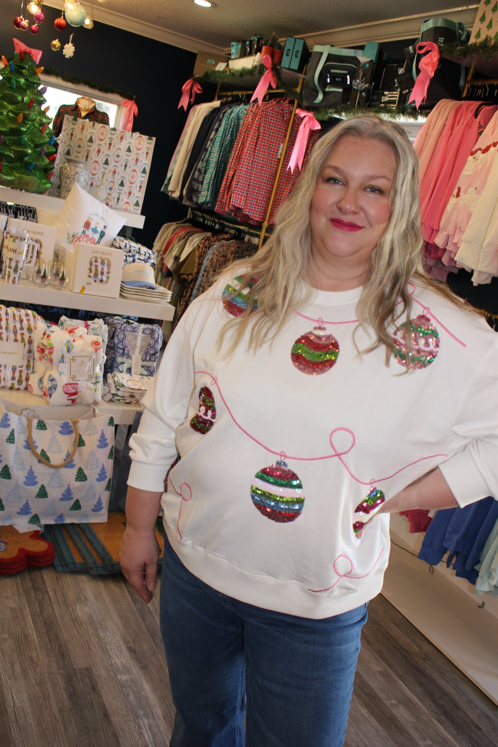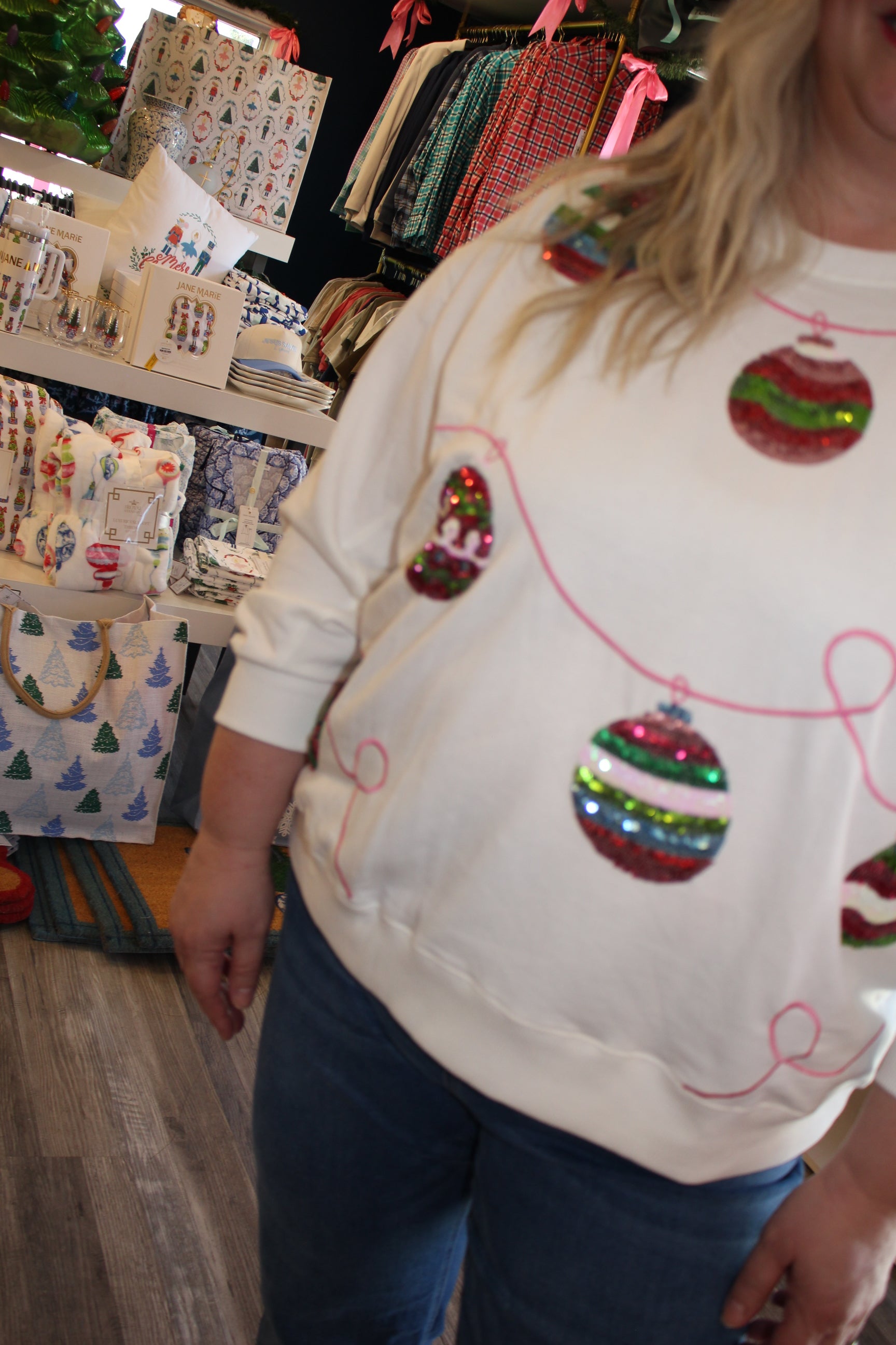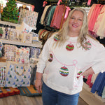 Get in the Holly Jolly spirit with teh cutest sweatshirt. We are loving the ornaments and how bright and fun this sweatshirt is. Relaxed Fit.